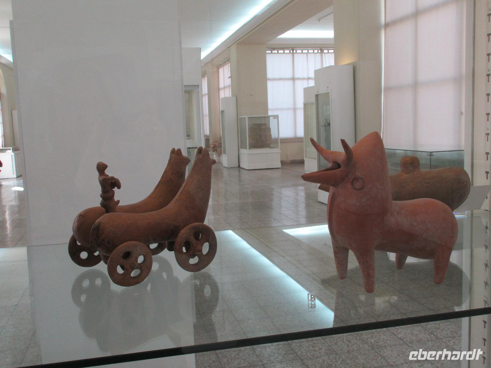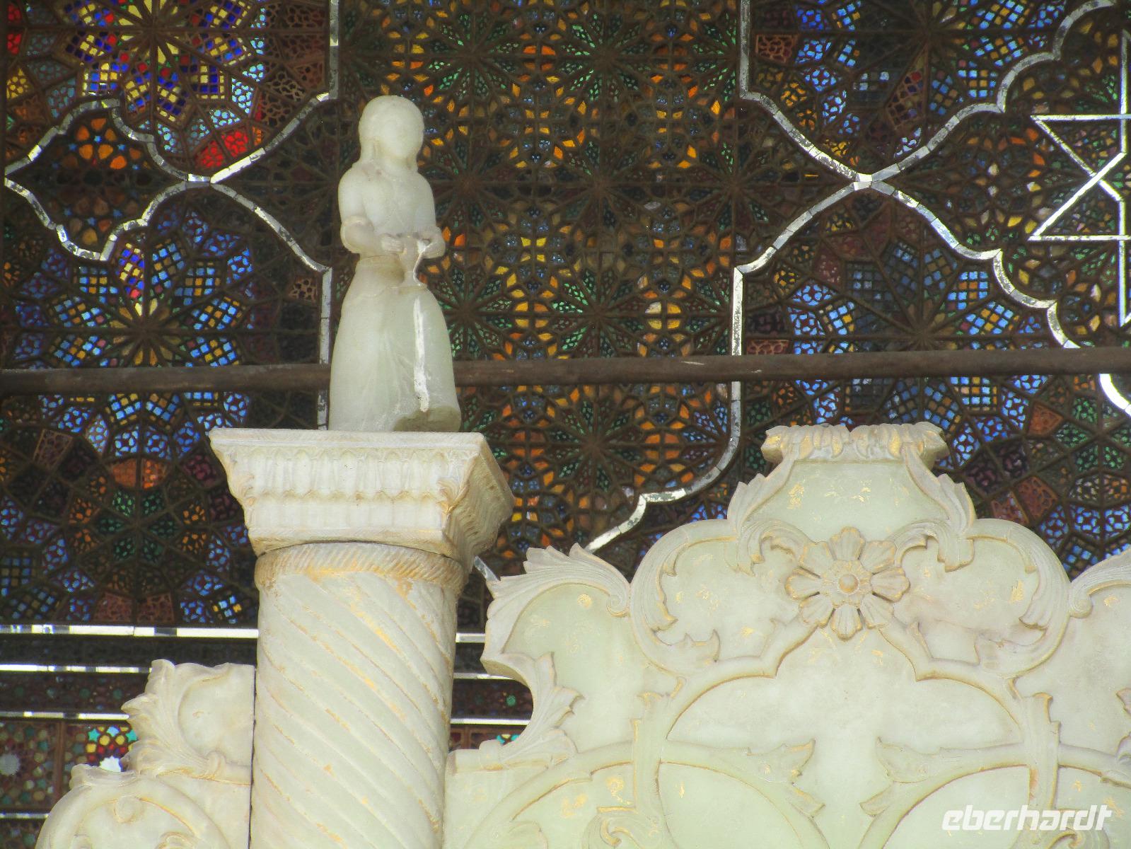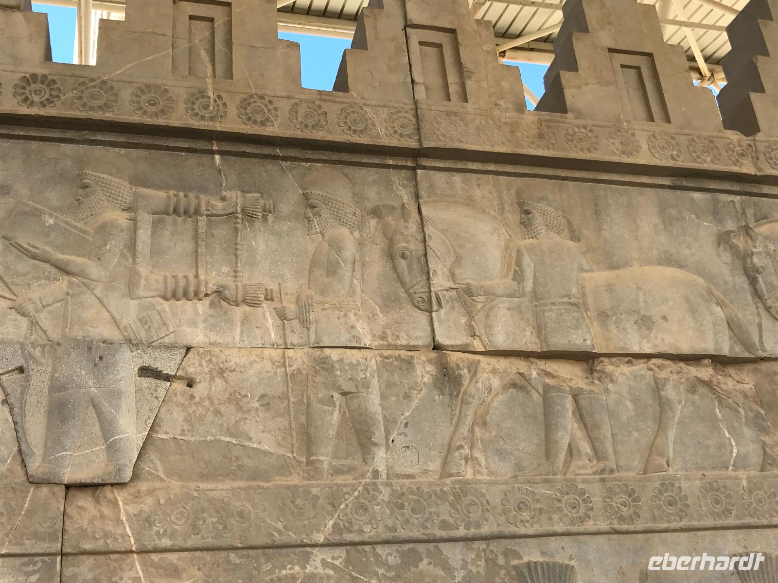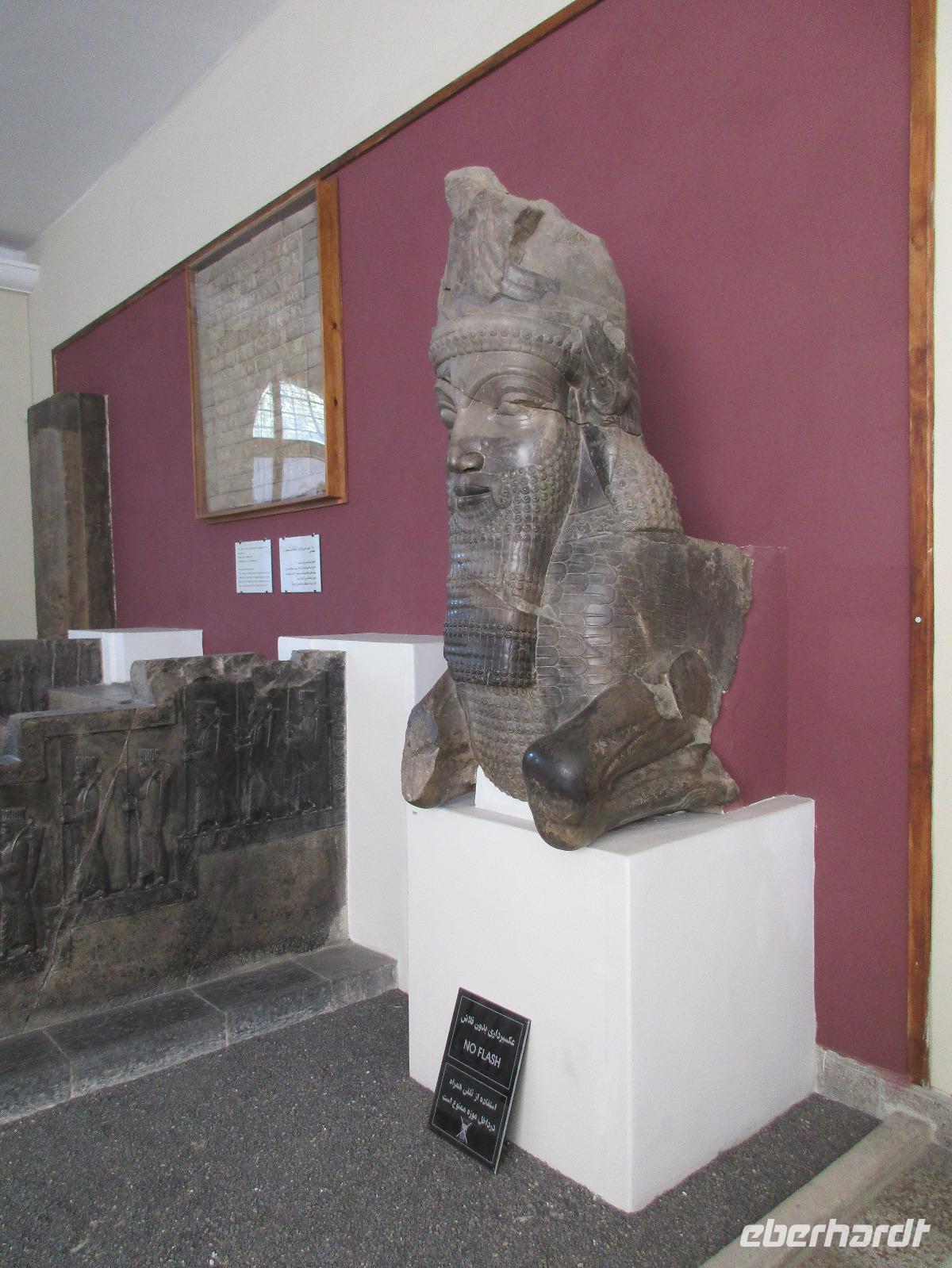 Unsere Anreise stand glücklicherweise unter einem „entspannten Stern". Schon in Leipzig kamen alle pünktlich und gut gelaunt an, der Check-In verlief reibungslos und die Brötchen vor der Sicherheitskontrolle schmeckten auch lecker. Der Abflug verzögerte sich um ein paar Minuten, aber wir landeten schon nach 2,5 Stunden Flugzeit und somit immer noch pünktlich. Auch das Weiterfluggate war schnell gefunden sowie die 3 Gäste, die aus München und Berlin nach Istanbul gereist waren. Wir bestiegen unser Flugzeug nach Teheran - der Flieger war fast ausgebucht - und nachdem wie auch schon auf dem ersten Flug nochmals eine warme Mahlzeit gereicht wurde, fielen bei einigen die Augen zu. Schließlich war es auch nach mitteleuropäischer Zeit schon mitten in der Nacht - nach Istanbul hatten wir die Uhren um eine Stunde nach vorn gestellt, nach Teheran eine weitere halbe Stunde. Die Einreise, also die Kontrolle der bereits in Deutschland durch Eberhardt TRAVEL besorgten Visa, erfolgte zügig und auch die Koffer waren schnell da. Wir begrüßten unseren Reiseleiter Mohammad und er orderte den Bus, sodass wir ca. 4.15 Uhr im Bus saßen und kurz nach 5 Uhr an unserem schönen Howeyzeh Hotel ankamen. Einige machten die Augen zu, aber bereits 7.30 Uhr erfolgte der Weckruf und man konnte sich am Frühstücksbuffet stärken. 9 Uhr fuhren wir dann Richtung Iranischem Nationalmuseum. Mohammad erklärte die Exponate sehr ausführlich und manch einem wurde etwas mulmig bei dem Gedanken, dass dies erst das erste von drei Museen heute sein wird. Zugegeben mit dem wenigen Schlaf und der Anreise noch in den Knochen waren es viele zu verarbeitende Informationen für den ersten Besichtigungstag, aber ich wüsste nicht, was wir hätten weg lassen sollen. Nach dem Nationalmuseum entschieden wir uns für den Besuch des Golestan Palastes. Ein beeindruckender Bau, mit wenig dekorativem Bürogebäude aus neuerer Zeit im Hintergrund. Der vorherige Fußweg vom Bus zum „Blumengarten", wie Golestan übersetzt heißt, verlangte uns auch einiges an Konzentration und Mut ab - der Straßenverkehr, der sich teilweise auch auf den Fußweg ausweitet, ist doch manchmal etwas beängstigend. Wie sagte der örtliche Reiseleiter zu mir: „Wenn du wie in Deutschland über die Straße gehen willst, wirst du sie NIE überqueren.". Nach den Besichtigungen im und am prächtigen Golestan Palast legten wir dort unsere Mittagspause ein - es gab riesige Portionen Salat oder Eis oder leckere Kuchen, aber vor allem wach machenden Kaffee ;-). Im Anschluss ging es per Bus weiter zur Nationalbank und nach mehreren Kontrollen und Wartezeiten in das sogenannte Juwelenmuseum. Ein unfassbarer Schatz an filigran gearbeiteten, fantasievollen Edelsteinen von teils unfassbarer Größe. Die Ausstellung selbst hat uns fasziniert und mit ihrem Ausmaß fast überfordert. Auch die Geräuschkulisse machte es uns ein wenig schwer. Dennoch wird keiner aus der Gruppe diesen Programmpunkt vermissen wollen. Auf dem Weg ins Hotel wechselte ich schnell noch für alle Euro in Landeswährung und machte sie somit mit 50 € Einsatz glatt zu Millionären. Das Abendessen nahmen wir in einem Restaurant ein, das wir vom Hotel zu Fuß erreichten. Es gab verschiedene Suppen zur Wahl, wir wissen bis heute nicht was alles in der Überraschungssuppe enthalten war, aber sie schmeckte ;-). Als Hauptgang wurden Lamm und Huhn Kebab sowie gebratener Fisch mit Reis und Fladenbrot serviert und der Nachtisch fehlte natürlich auch nicht. Ziemlich müde, aber gespannt auf die nächsten Tage fielen wir in unsere bequemen Betten.