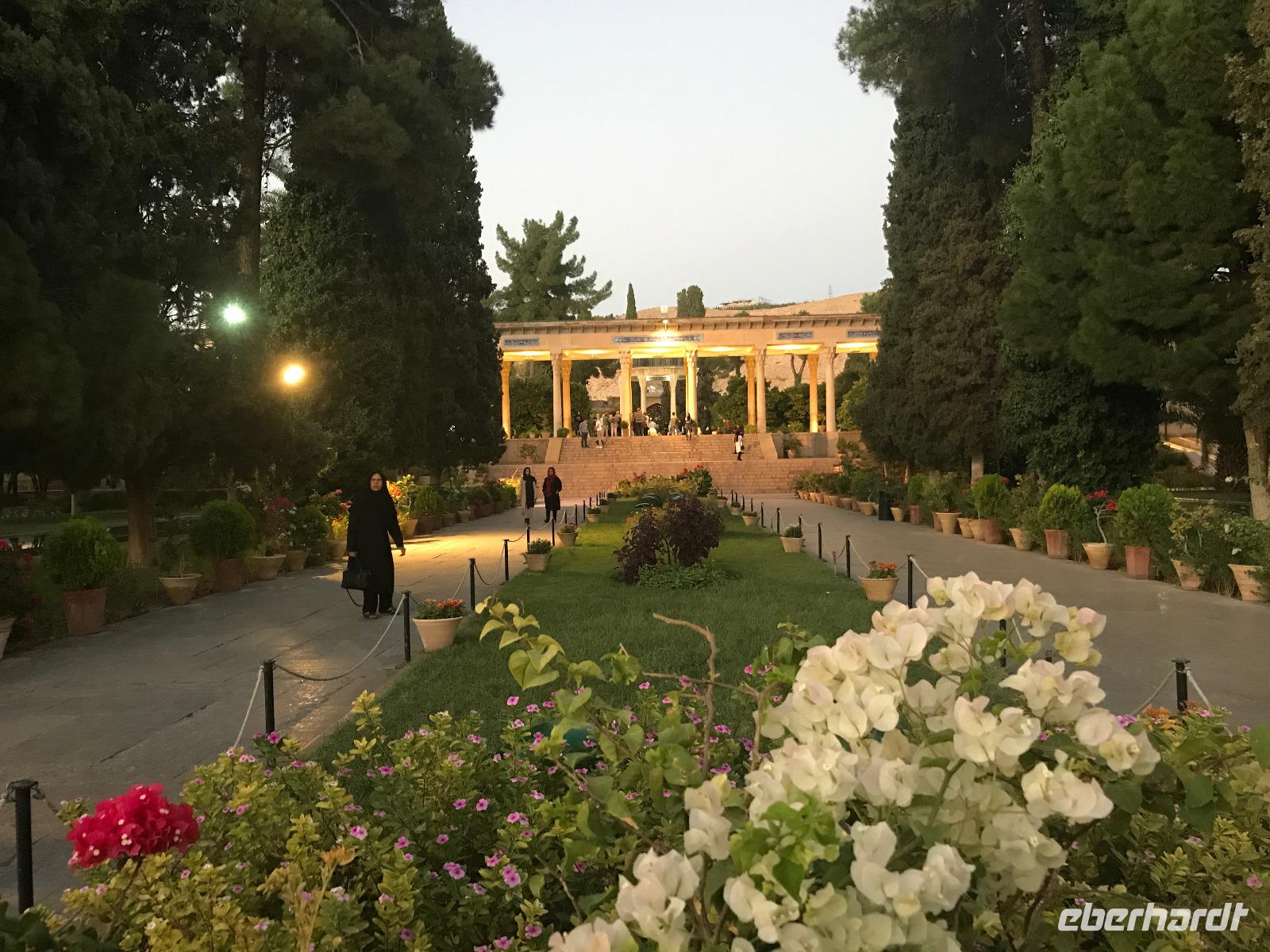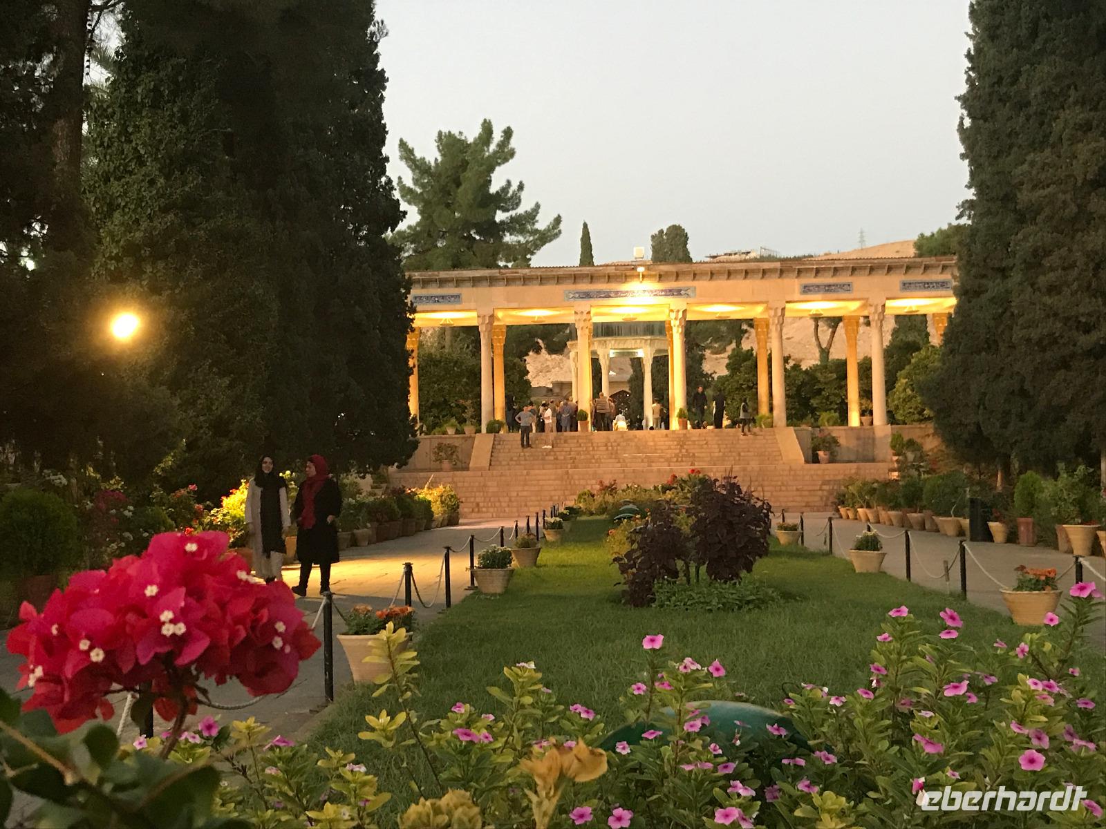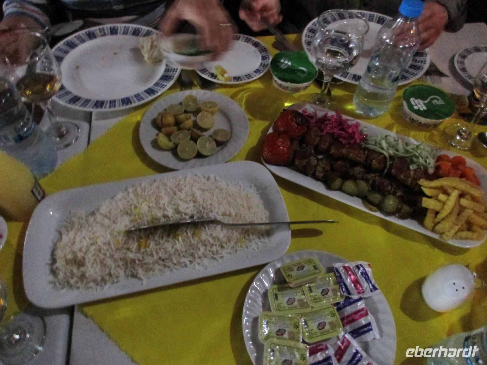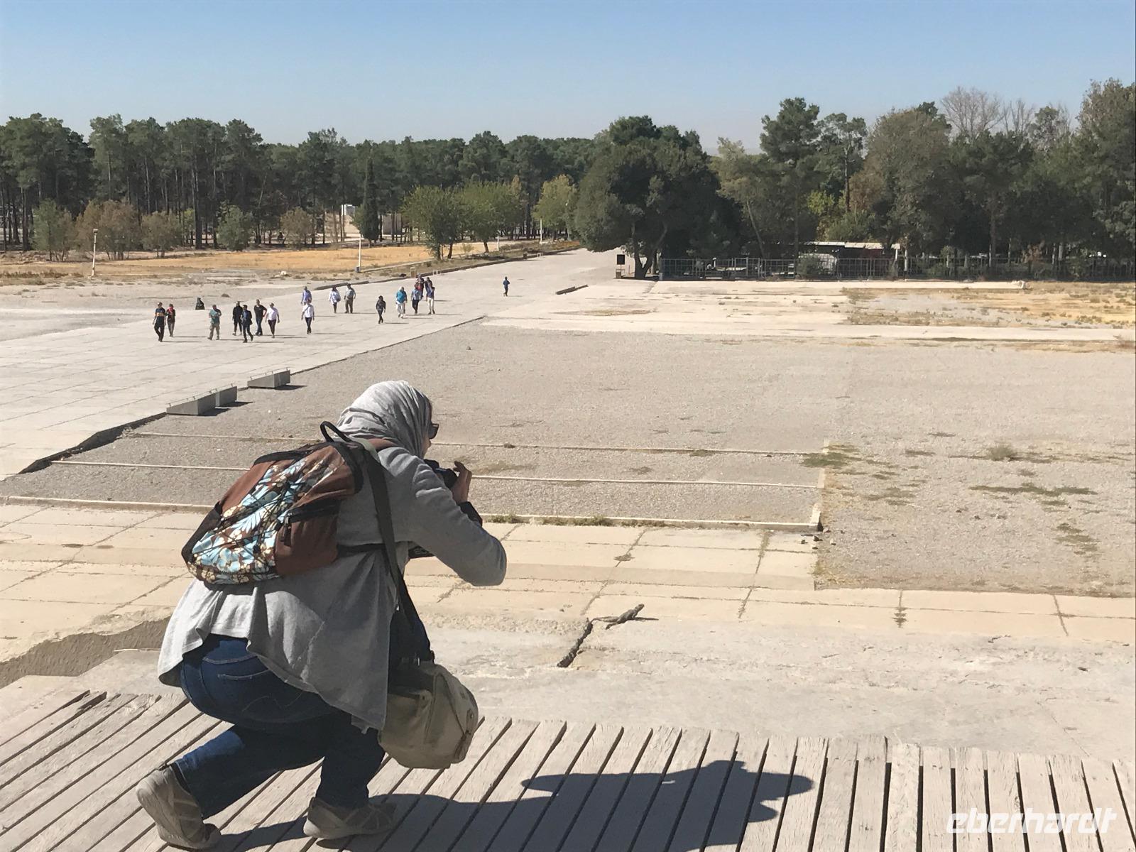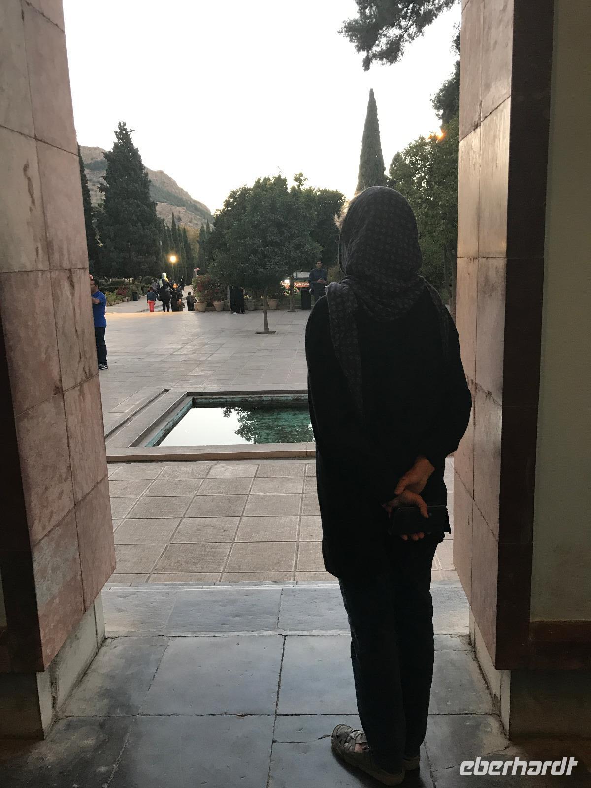 Hier in der Wüste spürte man neben der extrem niedrigen Luftfeuchtigkeit auch hier am deutlichsten die Stellung der Frau im Iran. Ich erhielt die Pässe der Reisegruppe nicht von den männlichen Mitarbeitern an der Rezeption zurück - diese wurden nur Mohammad ausgehändigt. Heute hatten wir eine lange Strecke vor uns, daher fuhren wir bereits früh ab. Der erste Besichtigungs-Stopp erfolgte in Abarkuh - hier kann man ein ehemaliges Kühlhaus betreten. Die Bewohner lagerten hier früher Eis, das sie aufgrund der ausgeklügelten Bauweise bis in den heißen Sommer hinein nutzen konnten. Weiter ging es nach Pasargadae - dieser beeindruckende Ort, an dem vor mehr als 2550 Jahren die Perser über die Meder siegten, beherbergt heute die Überreste einer Residenzstadt, dessen Begründer hier auch sein Grabstätte hat - Kyrus der Große. Im Anschluss an die Besichtigung stärkten wir uns mit einem Picknick - zum Glück fanden wir ein schattiges Plätzchen, das in diesem Gelände rar ist. Mohammad hatte Fladenbrot und Käse (eine Art Frischkäse und eine Art Schafskäse) sowie diverse Soßen und Gemüse besorgt. Die iranische Agentur und Eberhardt TRAVEL luden die Gäste darauf ein. Die Fahrt führte uns durch trockene Steppen und fruchtbare Täler vorbei an beeindruckenden Bergketten. Die erste Besichtigung in Shiraz führte uns zum Schrein von Shah Cheragh - wir Frauen mussten Tücher (als Art Chador) umhängen. Wir erhielten eine Führung in Englisch - der Herr unserer Reisegruppe machte für uns eine exzellente Übersetzung. Stärker als bisher schauten uns vor allem die Mädchen und Frauen hier neugierig an, fotografierten (sich mit) uns und sprachen uns auch an. Im Anschluss führte unser Weg zum Mausoleum von Saadi - eine tolle Stimmung in der Dämmerung. Mohammad trug für uns ein Gedicht in Deutsch und in Persisch vor. Zum Abschluss des Tages zeigte unser Chauffeur beim millimetergenauen Einparken vorm Hotel nochmal sein Können. Als einziger stand am Abend unser Tisch auf der Terrasse für das Abendessen bereit - wie Könige durften wir exklusiv draußen speisen. Wir genossen den Abend und unterhielten uns noch eine Weile, bevor wir müde ins Bett fielen.