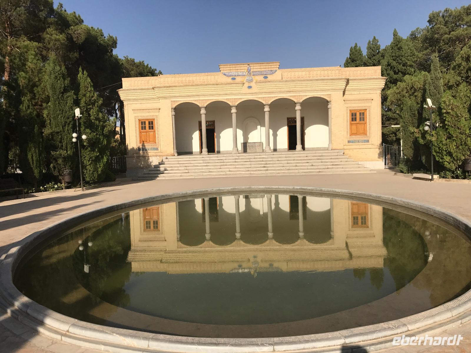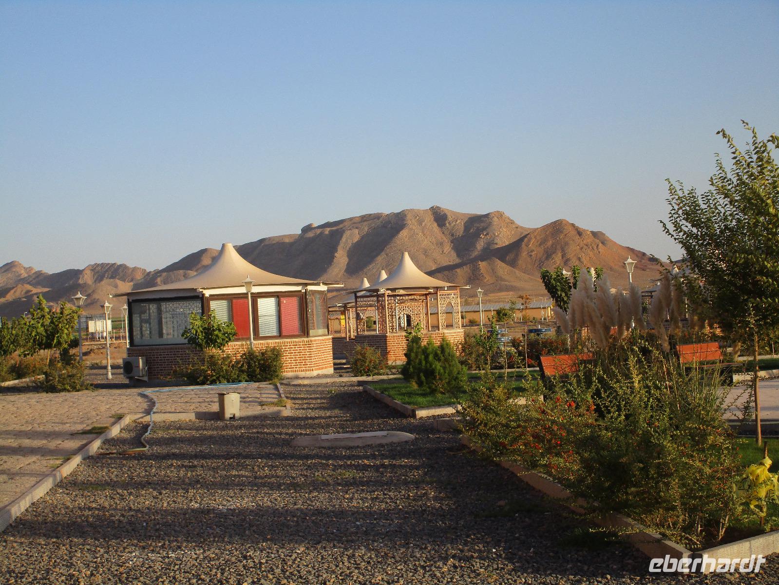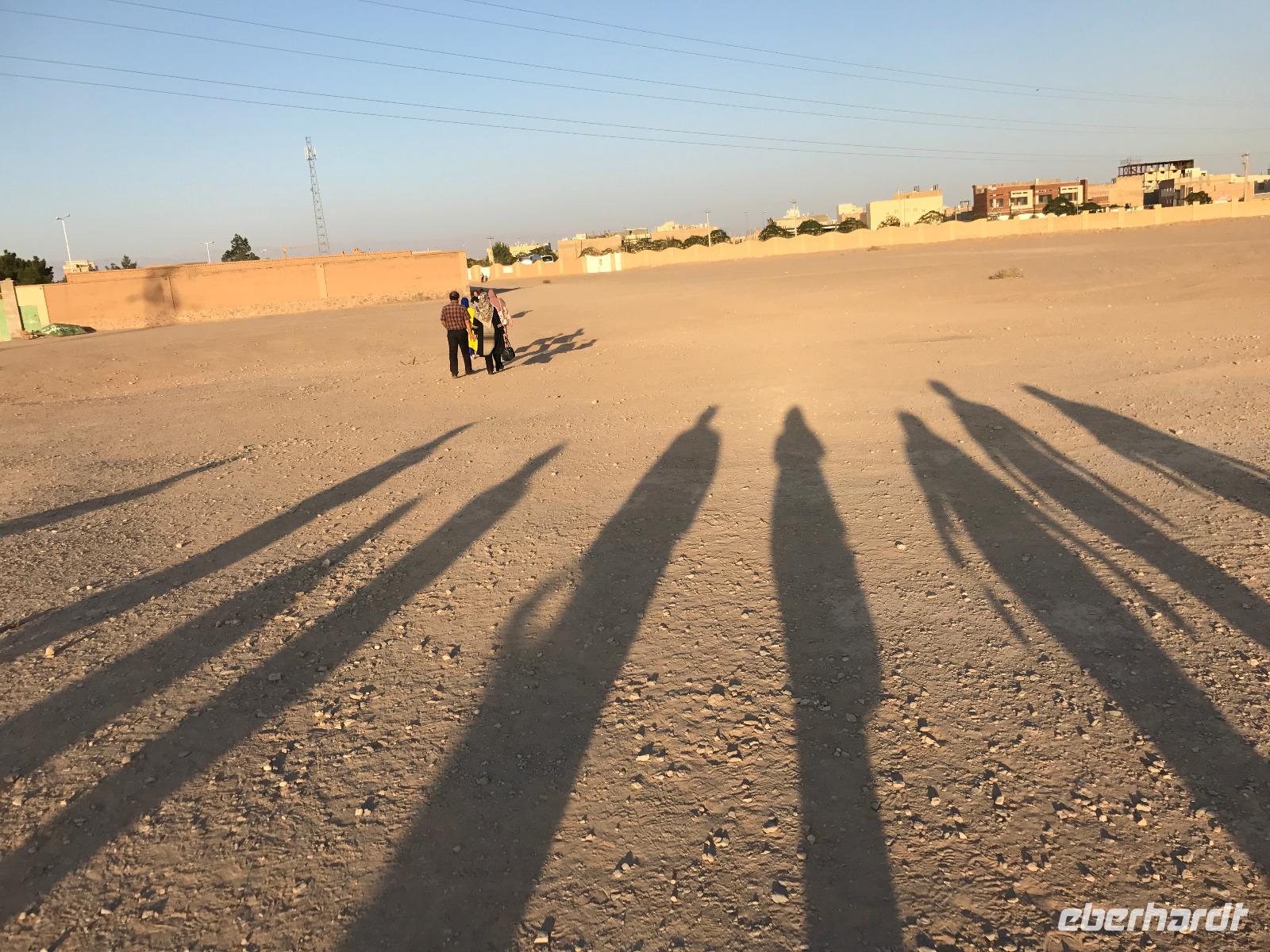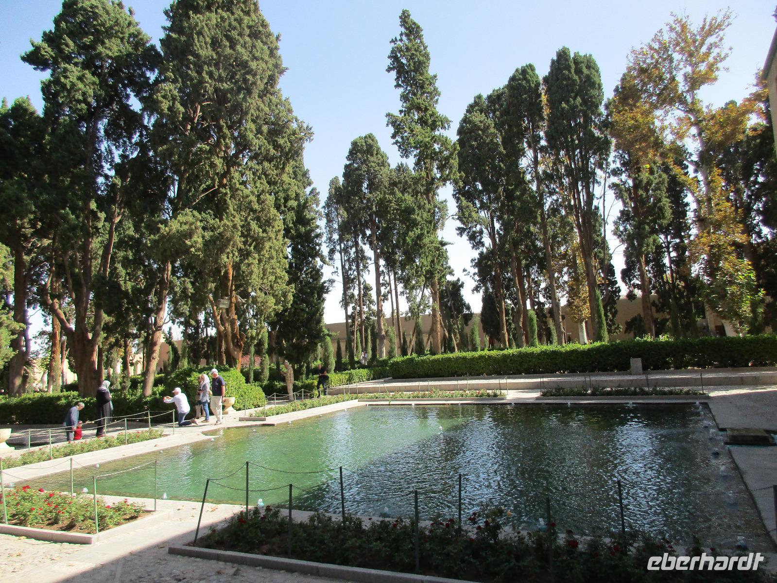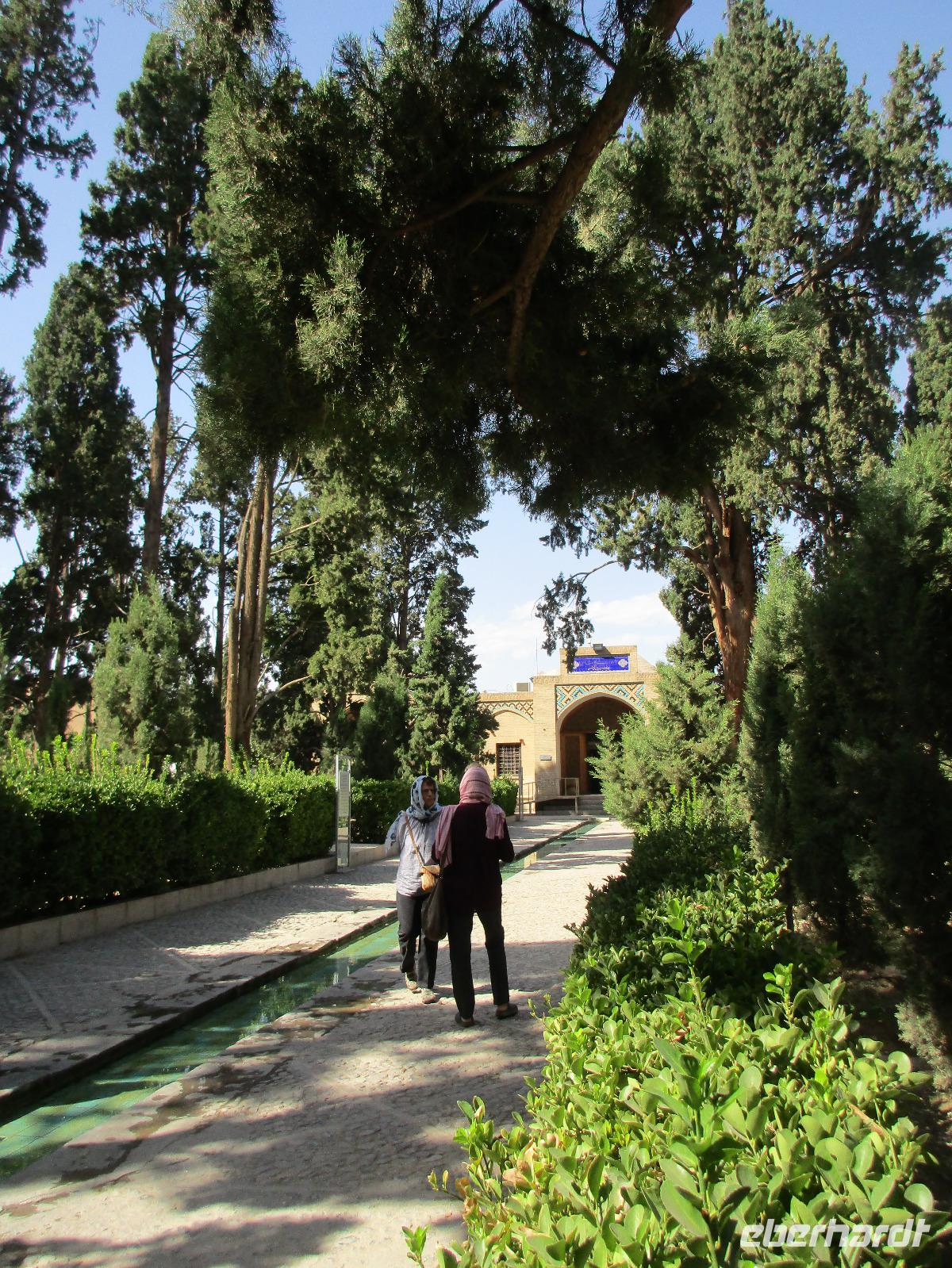 Hier in der Wüste spürte man neben der extrem niedrigen Luftfeuchtigkeit auch hier am deutlichsten die Stellung der Frau im Iran. Ich erhielt die Pässe der Reisegruppe nicht von den männlichen Mitarbeitern an der Rezeption zurück - diese wurden nur Mohammad ausgehändigt. Heute hatten wir eine lange Strecke vor uns, daher fuhren wir bereits früh ab. Der erste Besichtigungs-Stopp erfolgte in Abarkuh - hier kann man ein ehemaliges Kühlhaus betreten. Die Bewohner lagerten hier früher Eis, das sie aufgrund der ausgeklügelten Bauweise bis in den heißen Sommer hinein nutzen konnten. Weiter ging es nach Pasargadae - dieser beeindruckende Ort, an dem vor mehr als 2550 Jahren die Perser über die Meder siegten, beherbergt heute die Überreste einer Residenzstadt, dessen Begründer hier auch sein Grabstätte hat - Kyrus der Große. Im Anschluss an die Besichtigung stärkten wir uns mit einem Picknick - zum Glück fanden wir ein schattiges Plätzchen, das in diesem Gelände rar ist. Mohammad hatte Fladenbrot und Käse (eine Art Frischkäse und eine Art Schafskäse) sowie diverse Soßen und Gemüse besorgt. Die iranische Agentur und Eberhardt TRAVEL luden die Gäste darauf ein. Die Fahrt führte uns durch trockene Steppen und fruchtbare Täler vorbei an beeindruckenden Bergketten. Die erste Besichtigung in Shiraz führte uns zum Schrein von Shah Cheragh - wir Frauen mussten Tücher (als Art Chador) umhängen. Wir erhielten eine Führung in Englisch - der Herr unserer Reisegruppe machte für uns eine exzellente Übersetzung. Stärker als bisher schauten uns vor allem die Mädchen und Frauen hier neugierig an, fotografierten (sich mit) uns und sprachen uns auch an. Im Anschluss führte unser Weg zum Mausoleum von Saadi - eine tolle Stimmung in der Dämmerung. Mohammad trug für uns ein Gedicht in Deutsch und in Persisch vor. Zum Abschluss des Tages zeigte unser Chauffeur beim millimetergenauen Einparken vorm Hotel nochmal sein Können. Als einziger stand am Abend unser Tisch auf der Terrasse für das Abendessen bereit - wie Könige durften wir exklusiv draußen speisen. Wir genossen den Abend und unterhielten uns noch eine Weile, bevor wir müde ins Bett fielen.