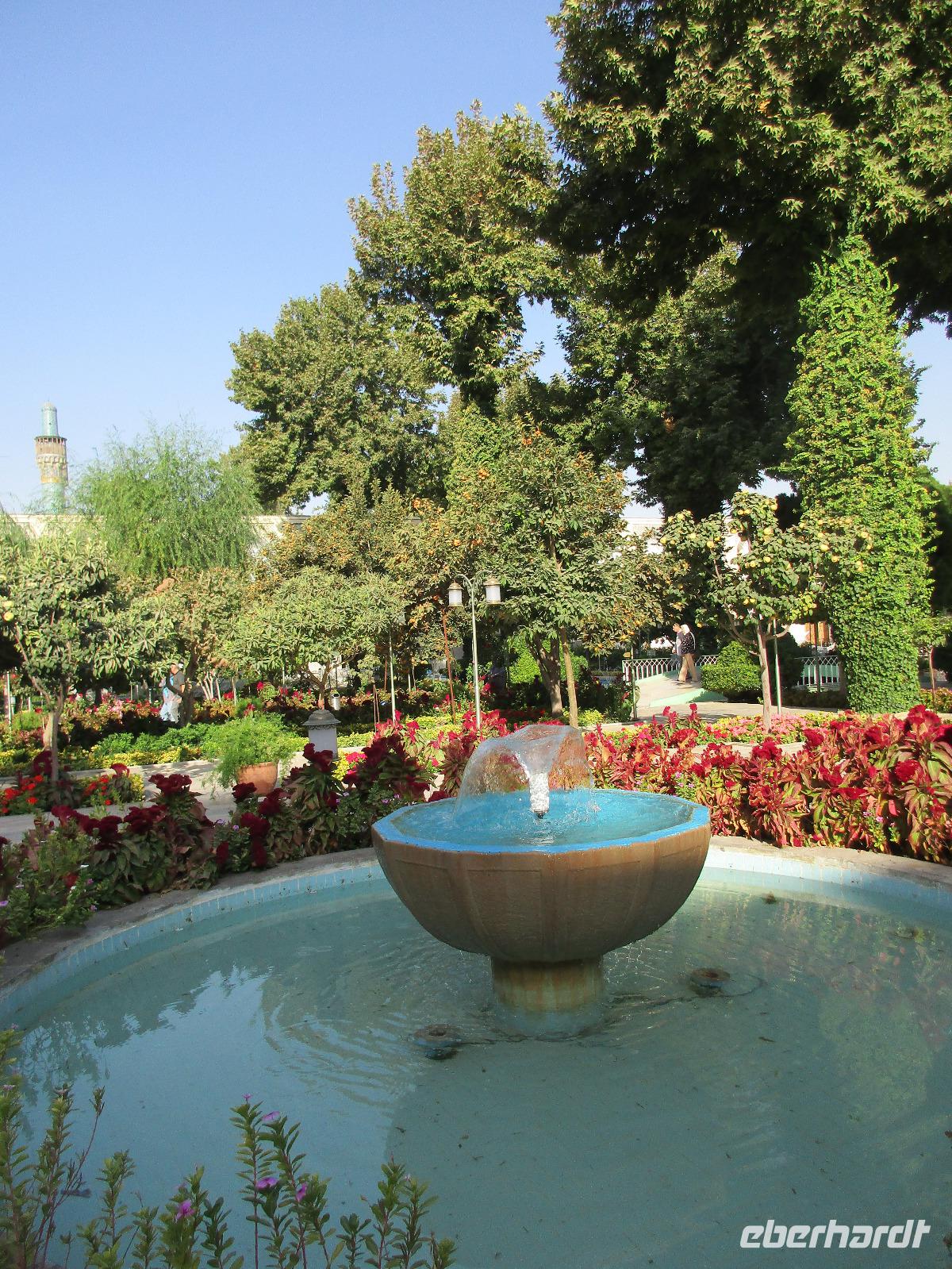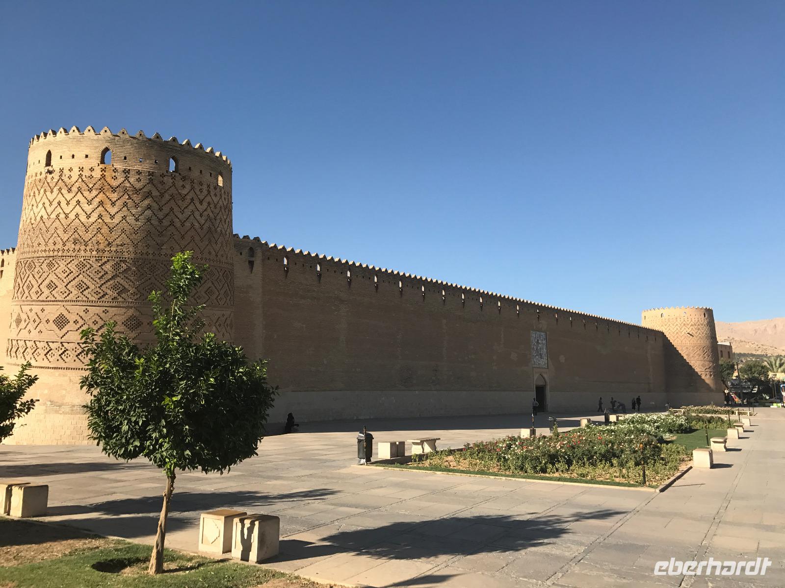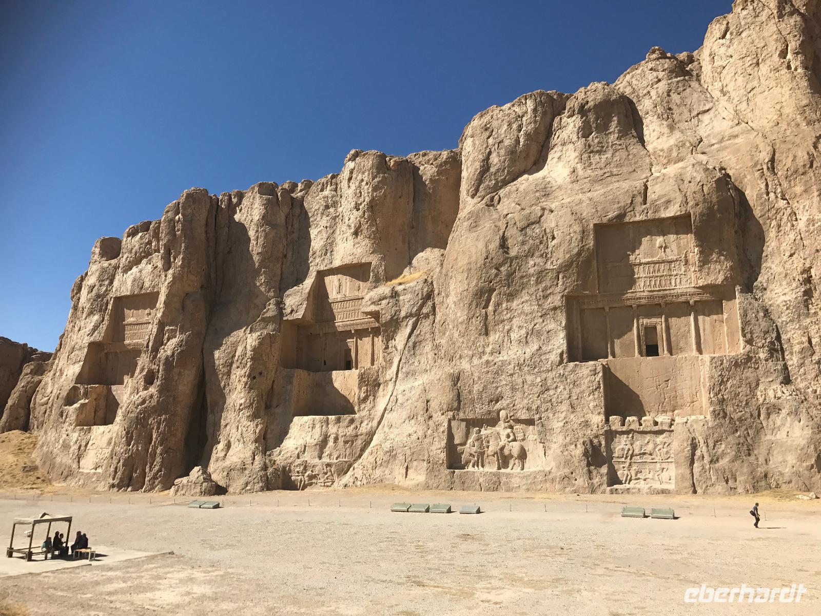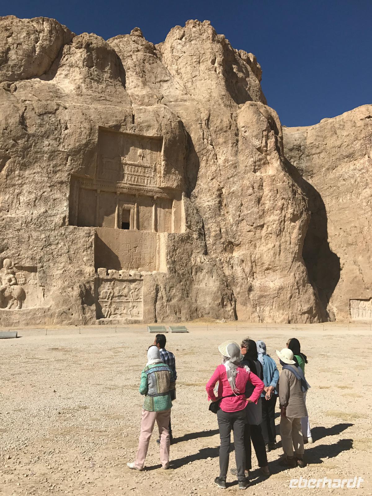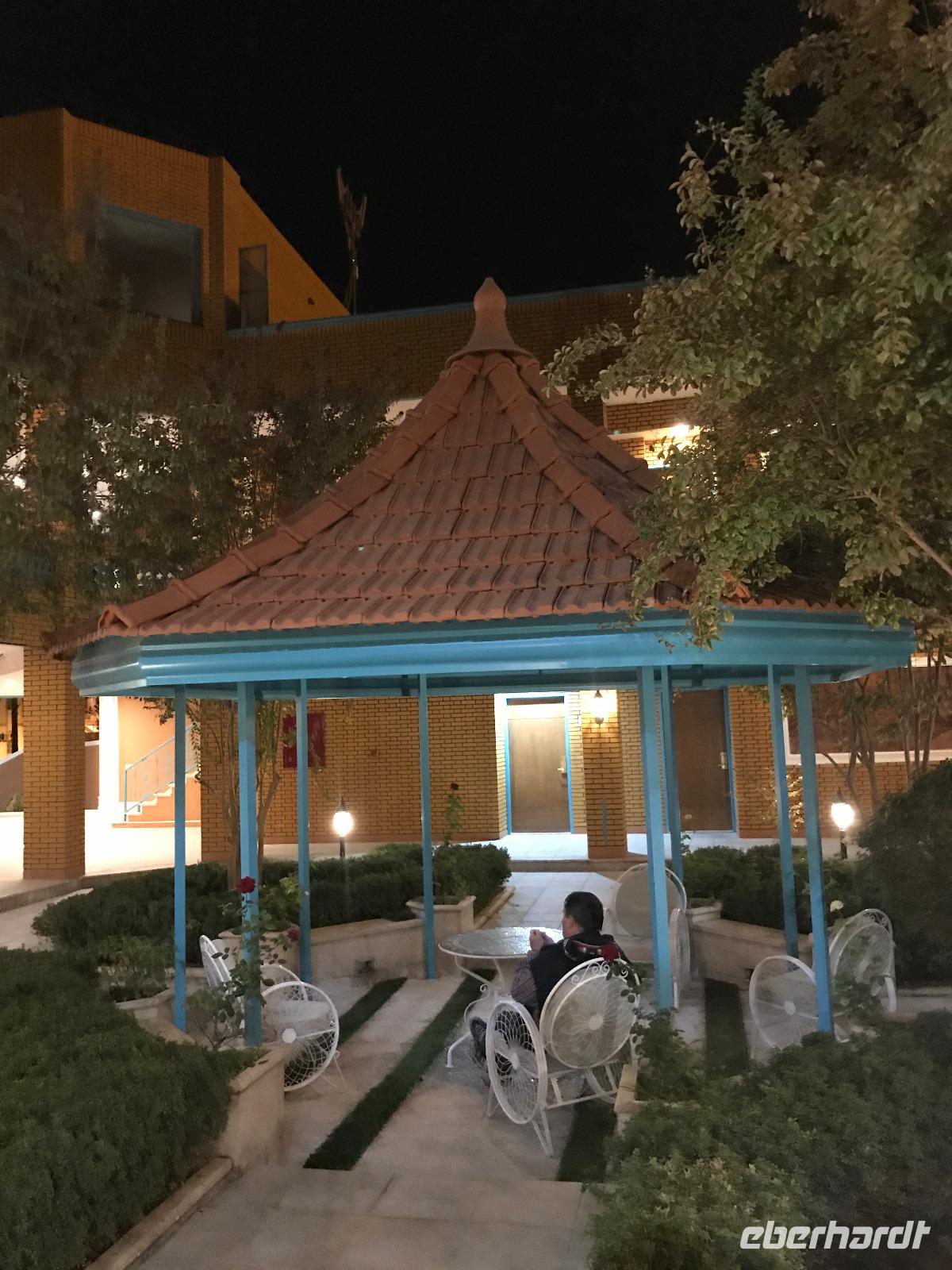 Hier in der Wüste spürte man neben der extrem niedrigen Luftfeuchtigkeit auch hier am deutlichsten die Stellung der Frau im Iran. Ich erhielt die Pässe der Reisegruppe nicht von den männlichen Mitarbeitern an der Rezeption zurück - diese wurden nur Mohammad ausgehändigt. Heute hatten wir eine lange Strecke vor uns, daher fuhren wir bereits früh ab. Der erste Besichtigungs-Stopp erfolgte in Abarkuh - hier kann man ein ehemaliges Kühlhaus betreten. Die Bewohner lagerten hier früher Eis, das sie aufgrund der ausgeklügelten Bauweise bis in den heißen Sommer hinein nutzen konnten. Weiter ging es nach Pasargadae - dieser beeindruckende Ort, an dem vor mehr als 2550 Jahren die Perser über die Meder siegten, beherbergt heute die Überreste einer Residenzstadt, dessen Begründer hier auch sein Grabstätte hat - Kyrus der Große. Im Anschluss an die Besichtigung stärkten wir uns mit einem Picknick - zum Glück fanden wir ein schattiges Plätzchen, das in diesem Gelände rar ist. Mohammad hatte Fladenbrot und Käse (eine Art Frischkäse und eine Art Schafskäse) sowie diverse Soßen und Gemüse besorgt. Die iranische Agentur und Eberhardt TRAVEL luden die Gäste darauf ein. Die Fahrt führte uns durch trockene Steppen und fruchtbare Täler vorbei an beeindruckenden Bergketten. Die erste Besichtigung in Shiraz führte uns zum Schrein von Shah Cheragh - wir Frauen mussten Tücher (als Art Chador) umhängen. Wir erhielten eine Führung in Englisch - der Herr unserer Reisegruppe machte für uns eine exzellente Übersetzung. Stärker als bisher schauten uns vor allem die Mädchen und Frauen hier neugierig an, fotografierten (sich mit) uns und sprachen uns auch an. Im Anschluss führte unser Weg zum Mausoleum von Saadi - eine tolle Stimmung in der Dämmerung. Mohammad trug für uns ein Gedicht in Deutsch und in Persisch vor. Zum Abschluss des Tages zeigte unser Chauffeur beim millimetergenauen Einparken vorm Hotel nochmal sein Können. Als einziger stand am Abend unser Tisch auf der Terrasse für das Abendessen bereit - wie Könige durften wir exklusiv draußen speisen. Wir genossen den Abend und unterhielten uns noch eine Weile, bevor wir müde ins Bett fielen.