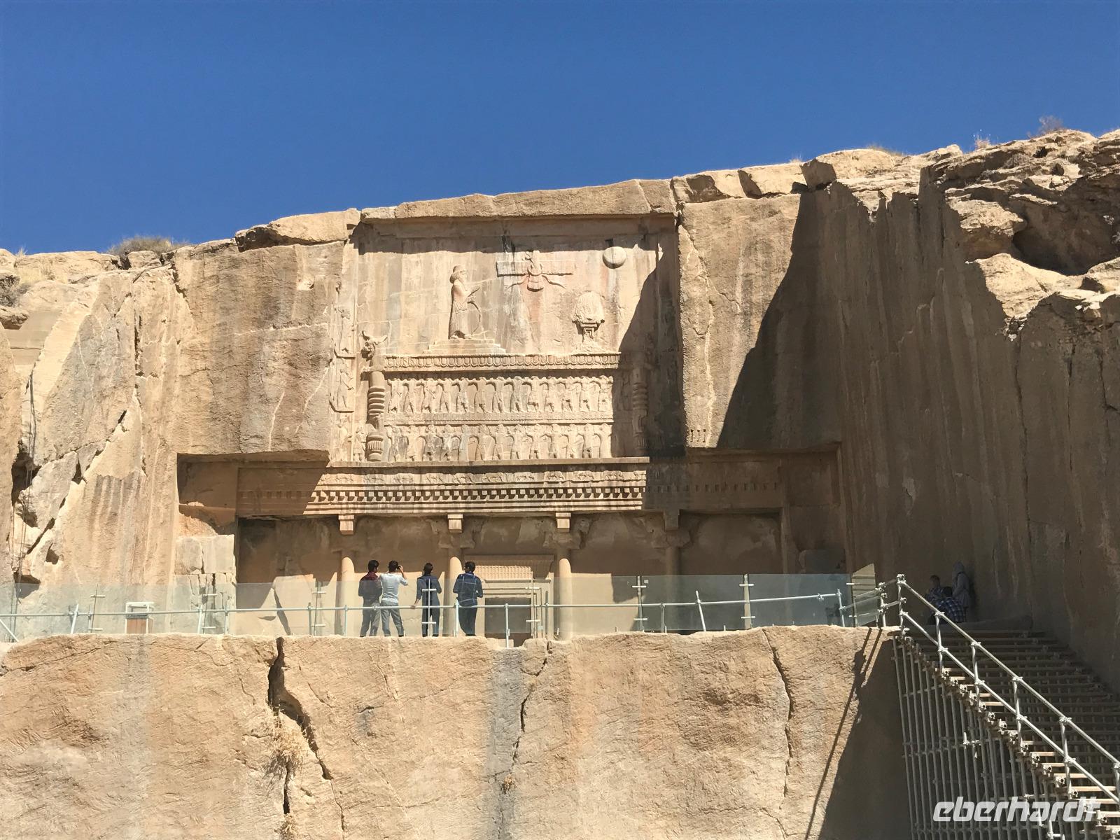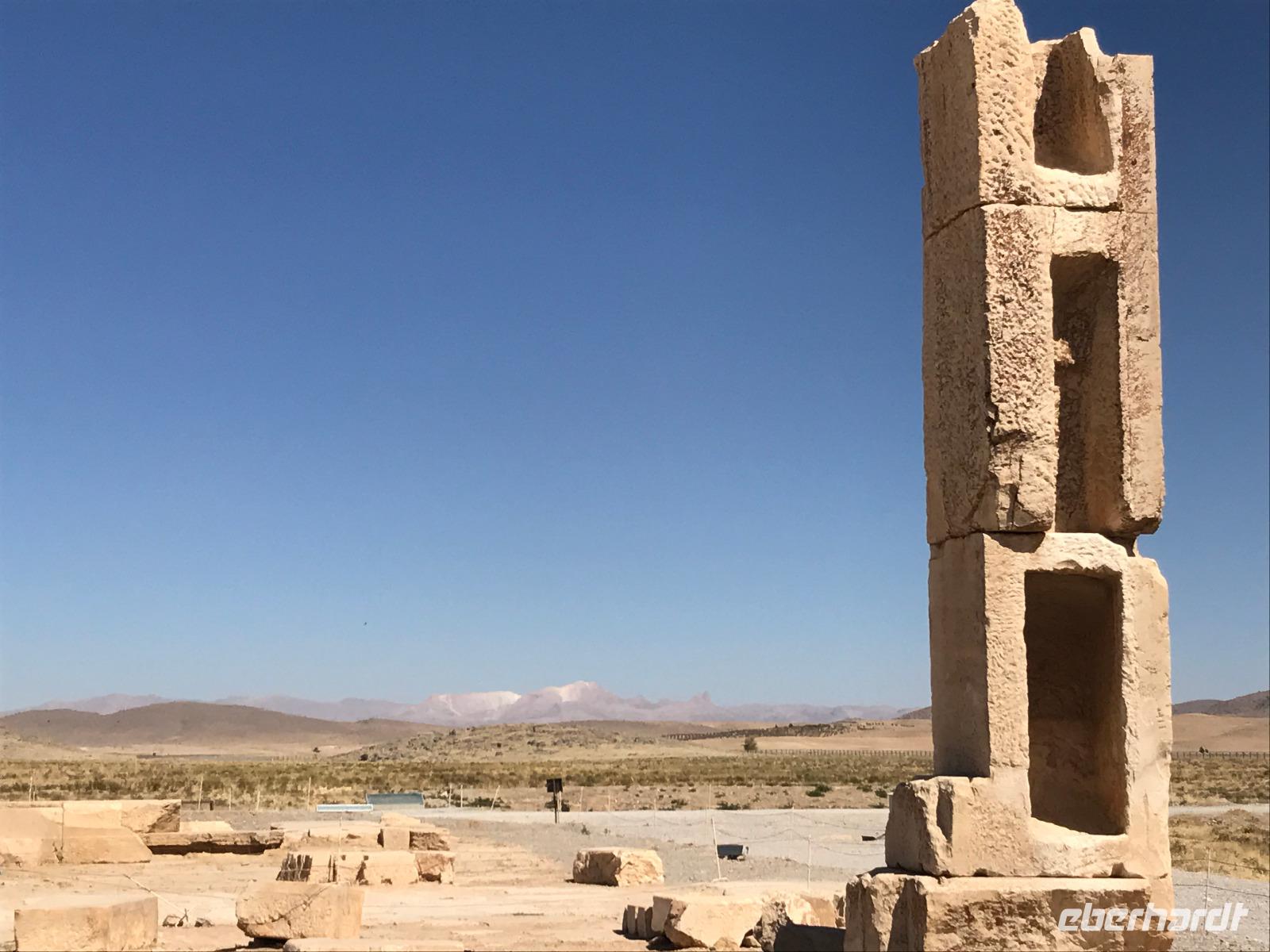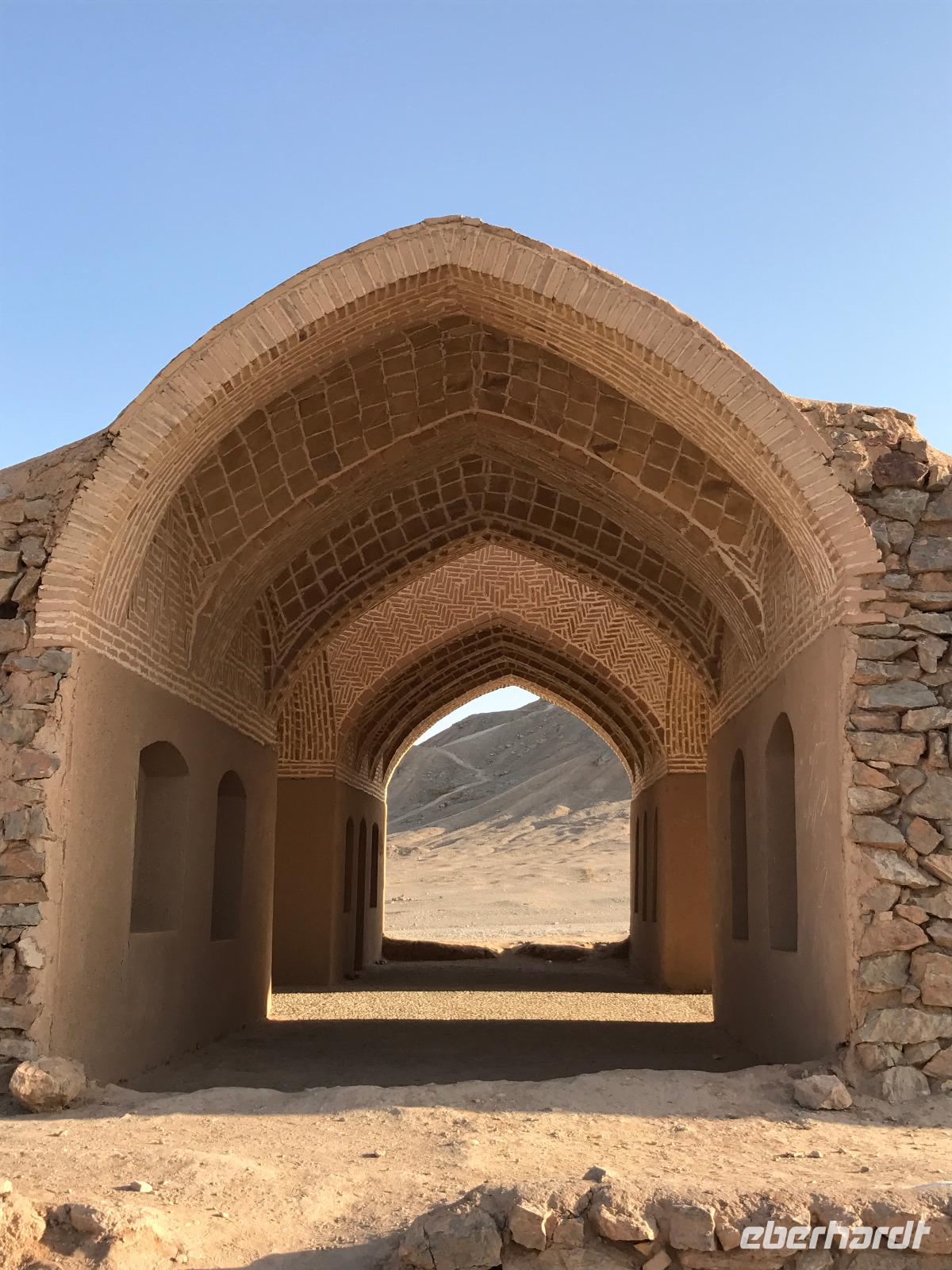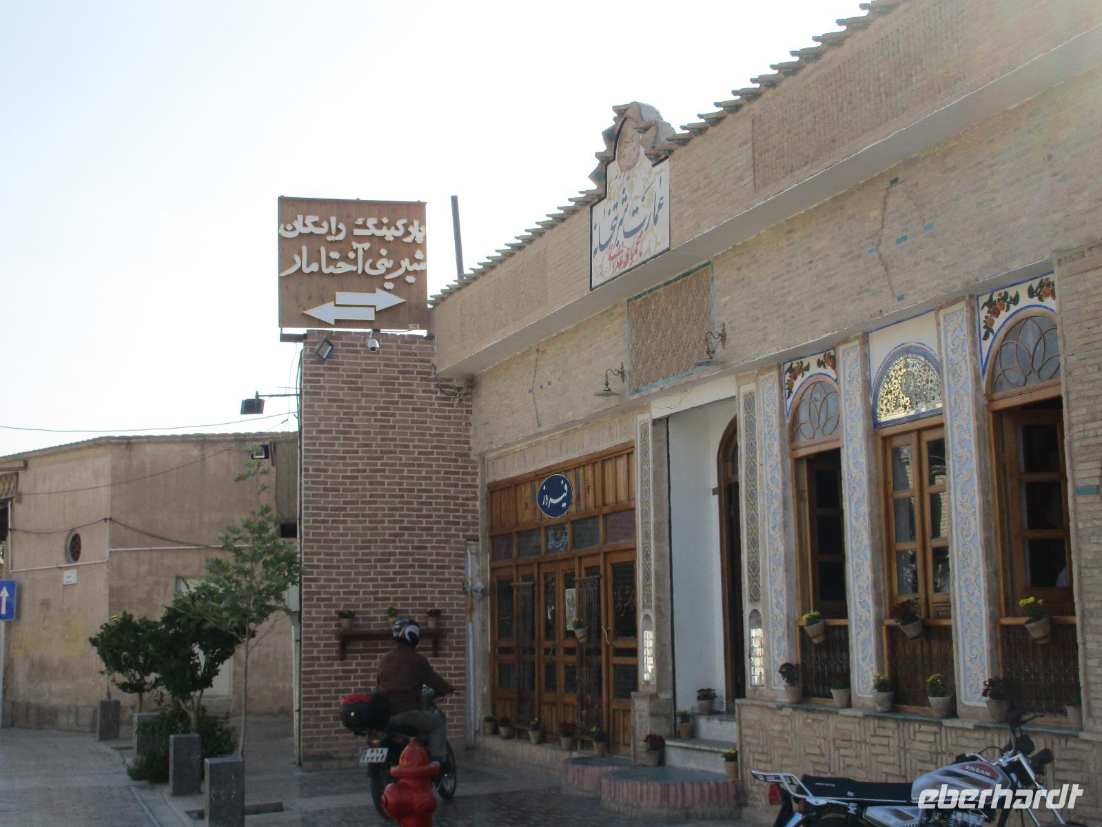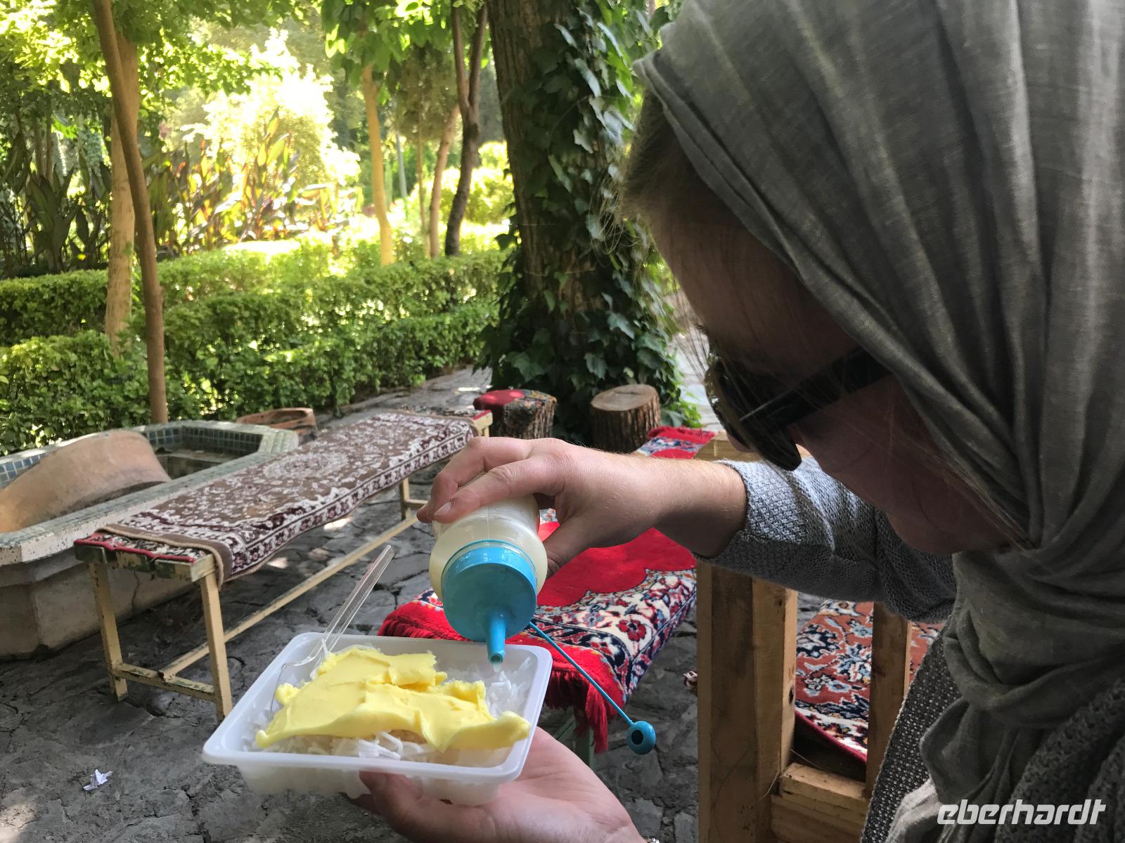 Hier in der Wüste spürte man neben der extrem niedrigen Luftfeuchtigkeit auch hier am deutlichsten die Stellung der Frau im Iran. Ich erhielt die Pässe der Reisegruppe nicht von den männlichen Mitarbeitern an der Rezeption zurück - diese wurden nur Mohammad ausgehändigt. Heute hatten wir eine lange Strecke vor uns, daher fuhren wir bereits früh ab. Der erste Besichtigungs-Stopp erfolgte in Abarkuh - hier kann man ein ehemaliges Kühlhaus betreten. Die Bewohner lagerten hier früher Eis, das sie aufgrund der ausgeklügelten Bauweise bis in den heißen Sommer hinein nutzen konnten. Weiter ging es nach Pasargadae - dieser beeindruckende Ort, an dem vor mehr als 2550 Jahren die Perser über die Meder siegten, beherbergt heute die Überreste einer Residenzstadt, dessen Begründer hier auch sein Grabstätte hat - Kyrus der Große. Im Anschluss an die Besichtigung stärkten wir uns mit einem Picknick - zum Glück fanden wir ein schattiges Plätzchen, das in diesem Gelände rar ist. Mohammad hatte Fladenbrot und Käse (eine Art Frischkäse und eine Art Schafskäse) sowie diverse Soßen und Gemüse besorgt. Die iranische Agentur und Eberhardt TRAVEL luden die Gäste darauf ein. Die Fahrt führte uns durch trockene Steppen und fruchtbare Täler vorbei an beeindruckenden Bergketten. Die erste Besichtigung in Shiraz führte uns zum Schrein von Shah Cheragh - wir Frauen mussten Tücher (als Art Chador) umhängen. Wir erhielten eine Führung in Englisch - der Herr unserer Reisegruppe machte für uns eine exzellente Übersetzung. Stärker als bisher schauten uns vor allem die Mädchen und Frauen hier neugierig an, fotografierten (sich mit) uns und sprachen uns auch an. Im Anschluss führte unser Weg zum Mausoleum von Saadi - eine tolle Stimmung in der Dämmerung. Mohammad trug für uns ein Gedicht in Deutsch und in Persisch vor. Zum Abschluss des Tages zeigte unser Chauffeur beim millimetergenauen Einparken vorm Hotel nochmal sein Können. Als einziger stand am Abend unser Tisch auf der Terrasse für das Abendessen bereit - wie Könige durften wir exklusiv draußen speisen. Wir genossen den Abend und unterhielten uns noch eine Weile, bevor wir müde ins Bett fielen.