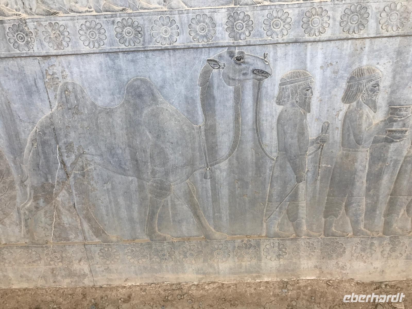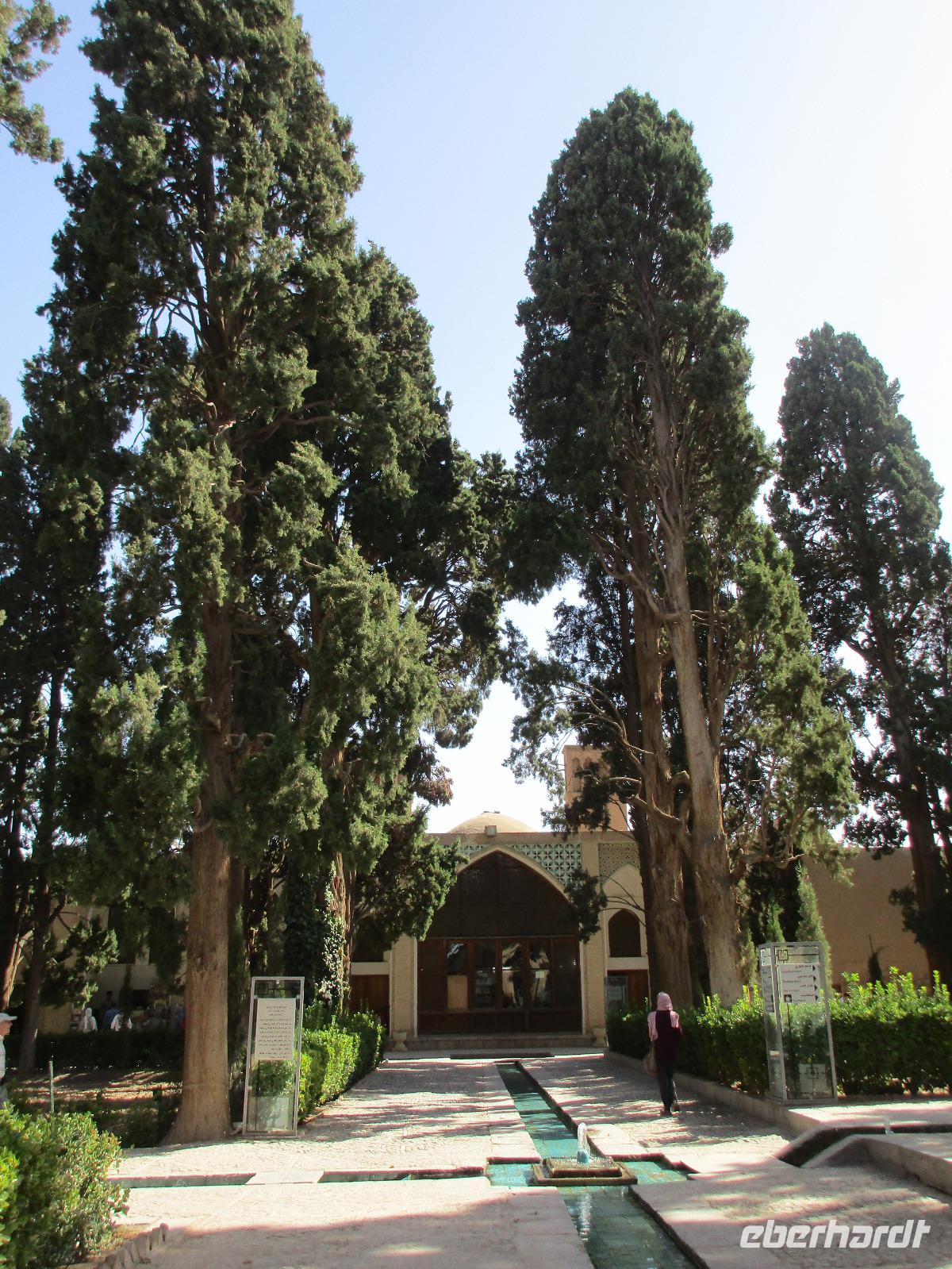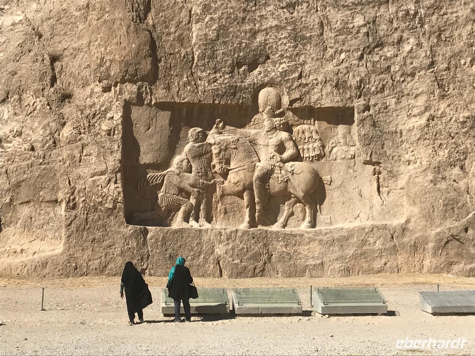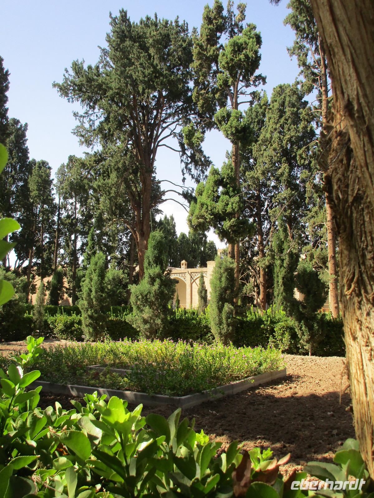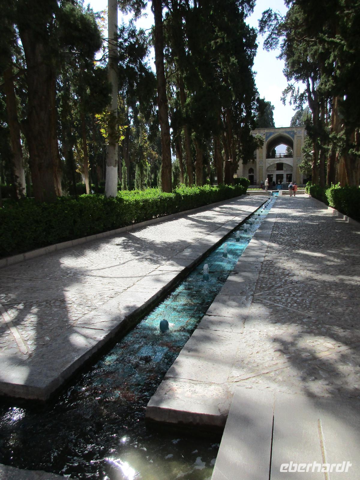 Hier in der Wüste spürte man neben der extrem niedrigen Luftfeuchtigkeit auch hier am deutlichsten die Stellung der Frau im Iran. Ich erhielt die Pässe der Reisegruppe nicht von den männlichen Mitarbeitern an der Rezeption zurück - diese wurden nur Mohammad ausgehändigt. Heute hatten wir eine lange Strecke vor uns, daher fuhren wir bereits früh ab. Der erste Besichtigungs-Stopp erfolgte in Abarkuh - hier kann man ein ehemaliges Kühlhaus betreten. Die Bewohner lagerten hier früher Eis, das sie aufgrund der ausgeklügelten Bauweise bis in den heißen Sommer hinein nutzen konnten. Weiter ging es nach Pasargadae - dieser beeindruckende Ort, an dem vor mehr als 2550 Jahren die Perser über die Meder siegten, beherbergt heute die Überreste einer Residenzstadt, dessen Begründer hier auch sein Grabstätte hat - Kyrus der Große. Im Anschluss an die Besichtigung stärkten wir uns mit einem Picknick - zum Glück fanden wir ein schattiges Plätzchen, das in diesem Gelände rar ist. Mohammad hatte Fladenbrot und Käse (eine Art Frischkäse und eine Art Schafskäse) sowie diverse Soßen und Gemüse besorgt. Die iranische Agentur und Eberhardt TRAVEL luden die Gäste darauf ein. Die Fahrt führte uns durch trockene Steppen und fruchtbare Täler vorbei an beeindruckenden Bergketten. Die erste Besichtigung in Shiraz führte uns zum Schrein von Shah Cheragh - wir Frauen mussten Tücher (als Art Chador) umhängen. Wir erhielten eine Führung in Englisch - der Herr unserer Reisegruppe machte für uns eine exzellente Übersetzung. Stärker als bisher schauten uns vor allem die Mädchen und Frauen hier neugierig an, fotografierten (sich mit) uns und sprachen uns auch an. Im Anschluss führte unser Weg zum Mausoleum von Saadi - eine tolle Stimmung in der Dämmerung. Mohammad trug für uns ein Gedicht in Deutsch und in Persisch vor. Zum Abschluss des Tages zeigte unser Chauffeur beim millimetergenauen Einparken vorm Hotel nochmal sein Können. Als einziger stand am Abend unser Tisch auf der Terrasse für das Abendessen bereit - wie Könige durften wir exklusiv draußen speisen. Wir genossen den Abend und unterhielten uns noch eine Weile, bevor wir müde ins Bett fielen.