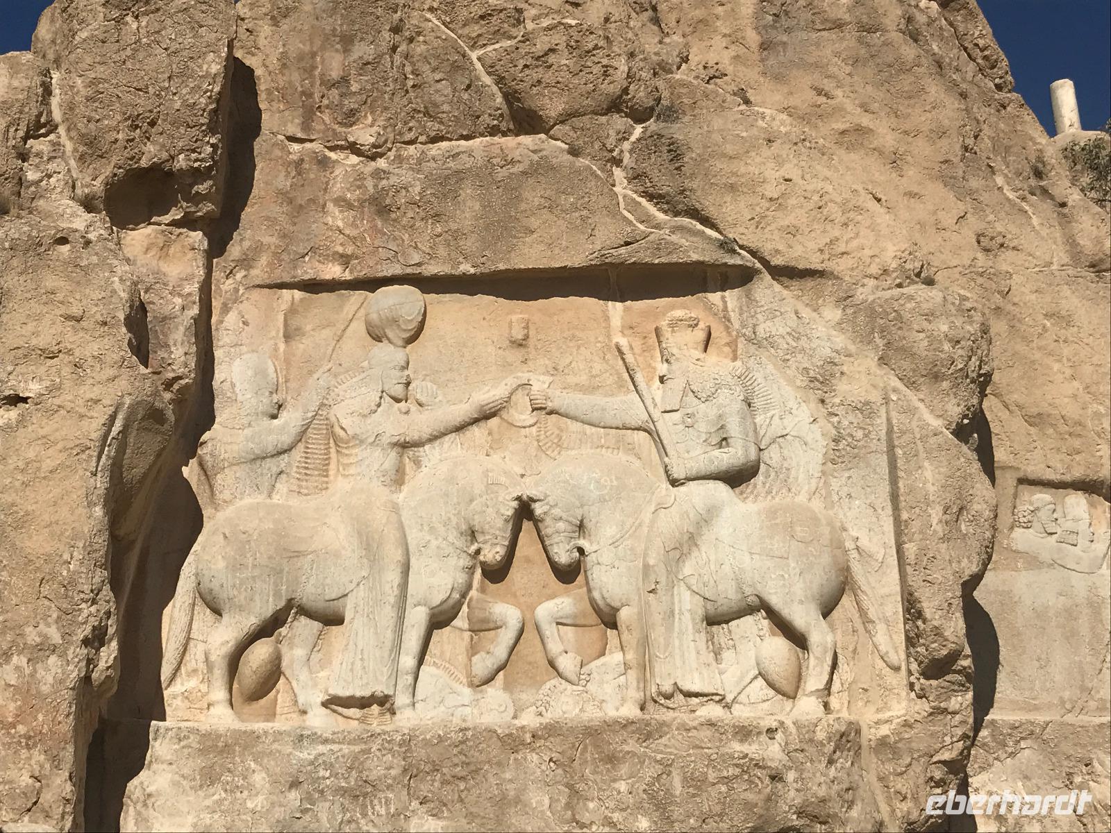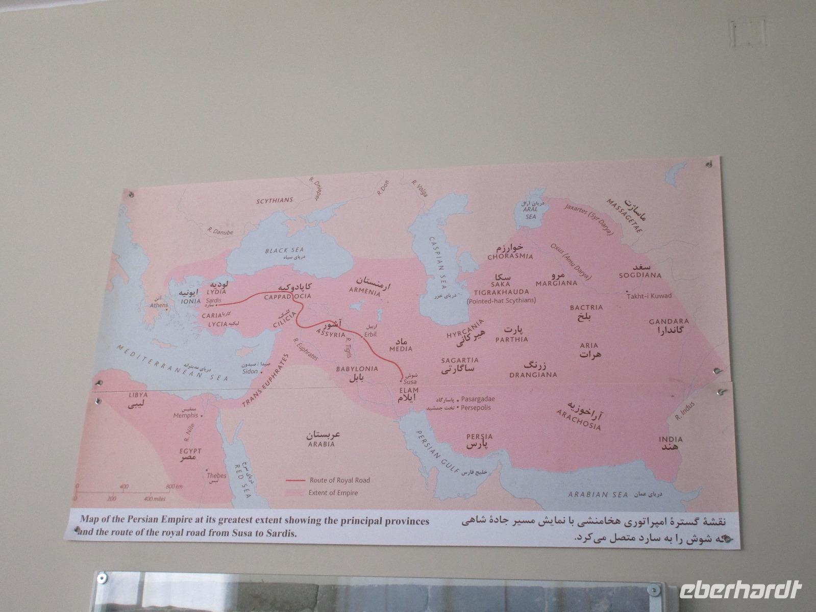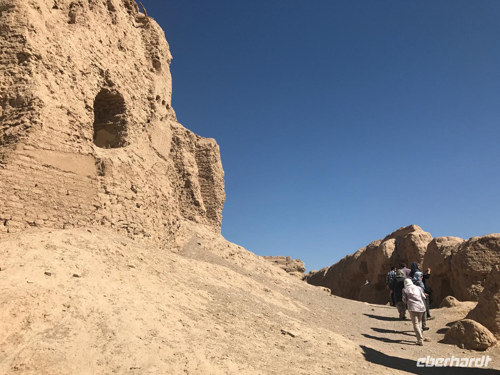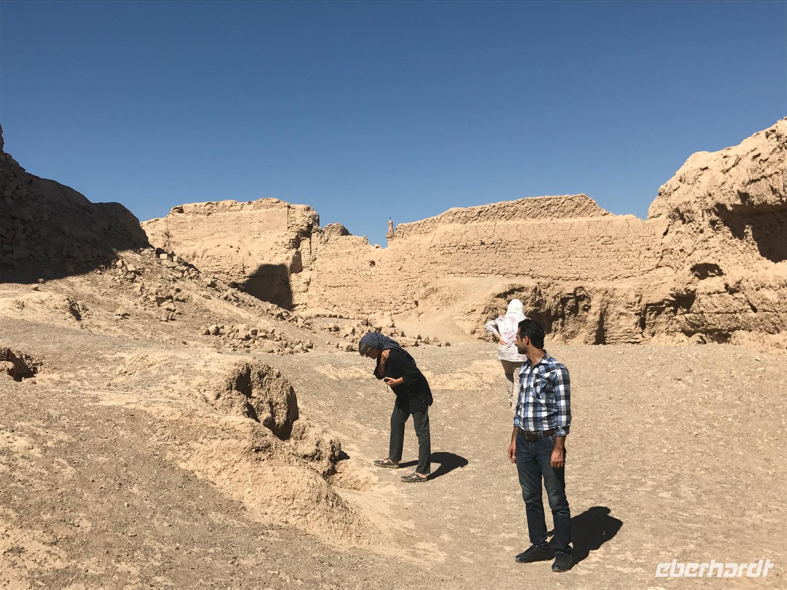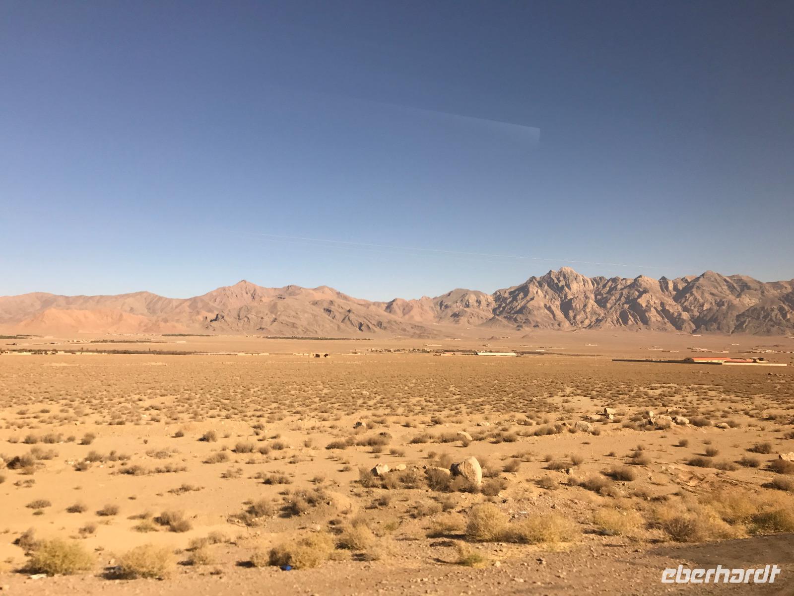 Hier in der Wüste spürte man neben der extrem niedrigen Luftfeuchtigkeit auch hier am deutlichsten die Stellung der Frau im Iran. Ich erhielt die Pässe der Reisegruppe nicht von den männlichen Mitarbeitern an der Rezeption zurück - diese wurden nur Mohammad ausgehändigt. Heute hatten wir eine lange Strecke vor uns, daher fuhren wir bereits früh ab. Der erste Besichtigungs-Stopp erfolgte in Abarkuh - hier kann man ein ehemaliges Kühlhaus betreten. Die Bewohner lagerten hier früher Eis, das sie aufgrund der ausgeklügelten Bauweise bis in den heißen Sommer hinein nutzen konnten. Weiter ging es nach Pasargadae - dieser beeindruckende Ort, an dem vor mehr als 2550 Jahren die Perser über die Meder siegten, beherbergt heute die Überreste einer Residenzstadt, dessen Begründer hier auch sein Grabstätte hat - Kyrus der Große. Im Anschluss an die Besichtigung stärkten wir uns mit einem Picknick - zum Glück fanden wir ein schattiges Plätzchen, das in diesem Gelände rar ist. Mohammad hatte Fladenbrot und Käse (eine Art Frischkäse und eine Art Schafskäse) sowie diverse Soßen und Gemüse besorgt. Die iranische Agentur und Eberhardt TRAVEL luden die Gäste darauf ein. Die Fahrt führte uns durch trockene Steppen und fruchtbare Täler vorbei an beeindruckenden Bergketten. Die erste Besichtigung in Shiraz führte uns zum Schrein von Shah Cheragh - wir Frauen mussten Tücher (als Art Chador) umhängen. Wir erhielten eine Führung in Englisch - der Herr unserer Reisegruppe machte für uns eine exzellente Übersetzung. Stärker als bisher schauten uns vor allem die Mädchen und Frauen hier neugierig an, fotografierten (sich mit) uns und sprachen uns auch an. Im Anschluss führte unser Weg zum Mausoleum von Saadi - eine tolle Stimmung in der Dämmerung. Mohammad trug für uns ein Gedicht in Deutsch und in Persisch vor. Zum Abschluss des Tages zeigte unser Chauffeur beim millimetergenauen Einparken vorm Hotel nochmal sein Können. Als einziger stand am Abend unser Tisch auf der Terrasse für das Abendessen bereit - wie Könige durften wir exklusiv draußen speisen. Wir genossen den Abend und unterhielten uns noch eine Weile, bevor wir müde ins Bett fielen.