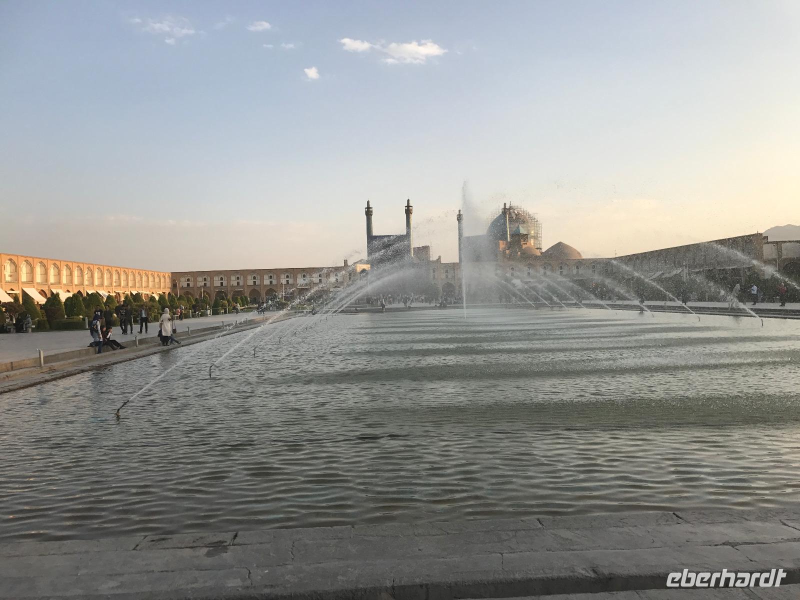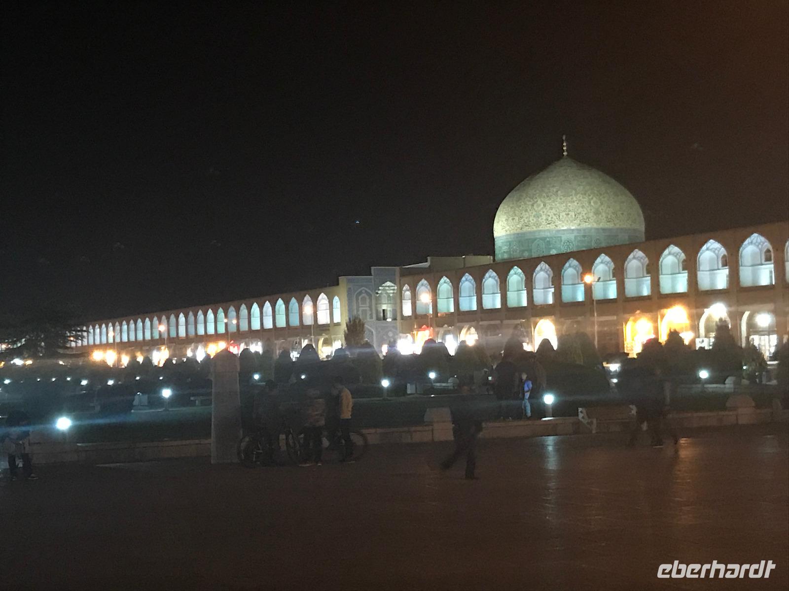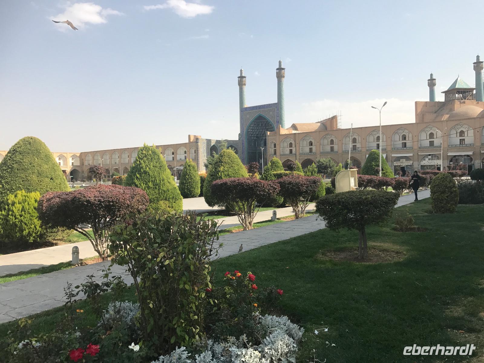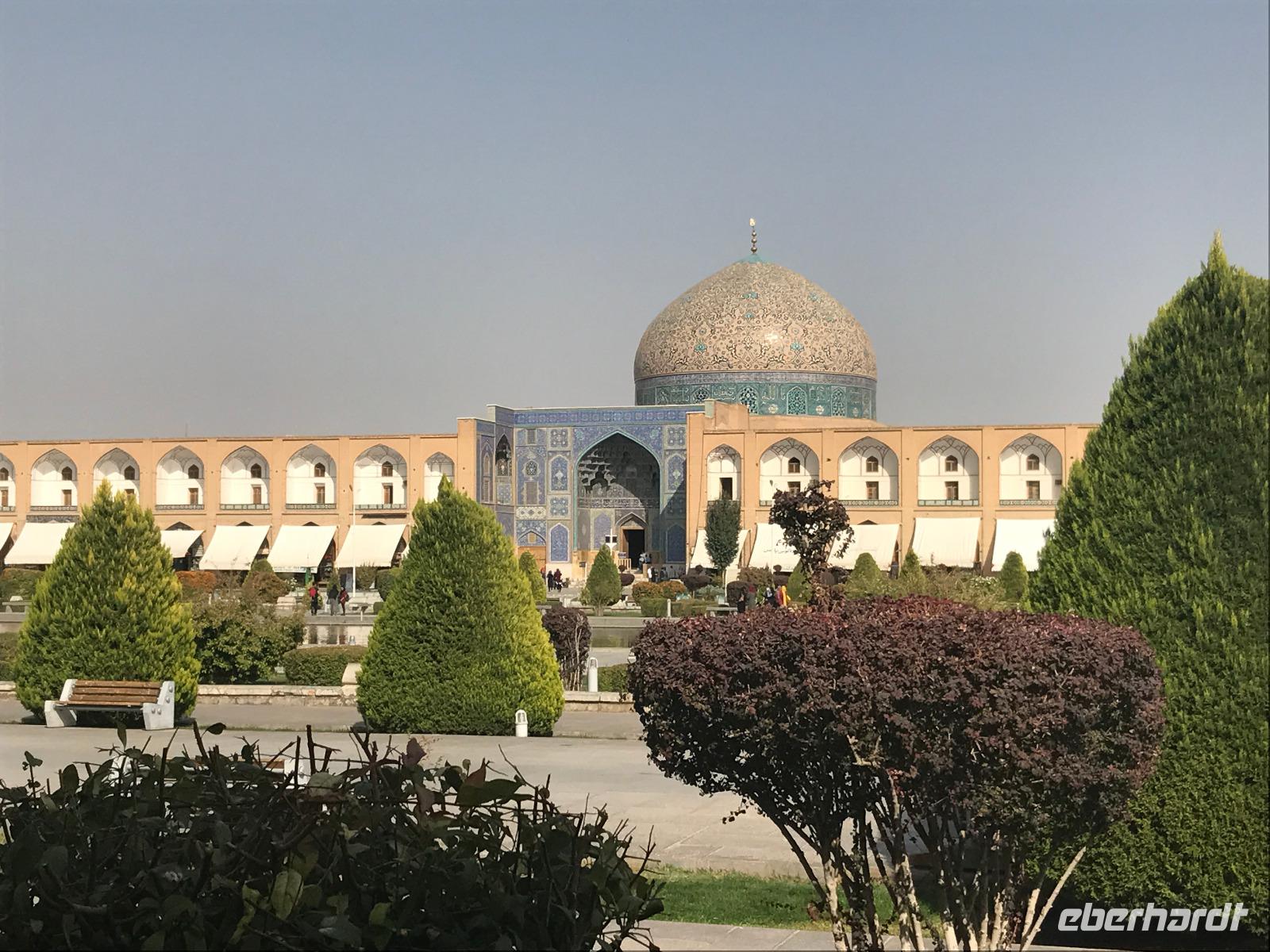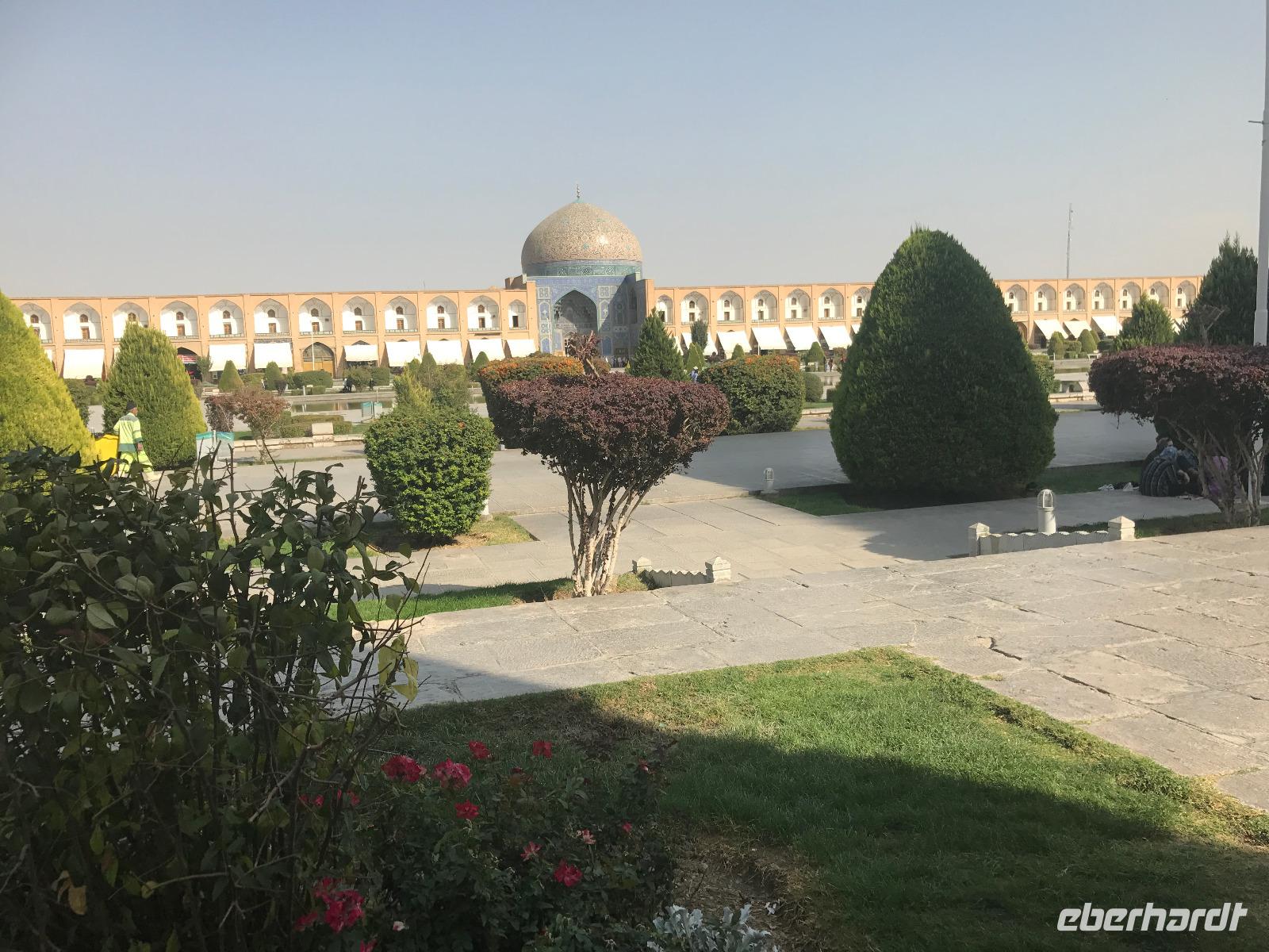 „Die Hälfte der Welt" stand heute auf unserem Programm - am Ende des Tages hätten wir glatt behauptet, sie wäre die ganze - so viel hatten wir an diesem Tag gesehen und an Informationen bekommen. Aber nun von Anfang an. Nach einem sehr leckeren Frühstück und einer kurzen Busfahrt starteten wir unsere Besichtigungen im Dscholfa-Viertel, dem Armenierviertel. Die 1663 vollendete Vank-Kirche beeindruckte uns mit Farbenreichtum und wunderbaren Gemälden zur Christianisierung Armeniens im Inneren. Im Museum neben der Kathedrale bestaunten wir zwar Schätze wie ein bemaltes Haar und die kleinste Bibel der Welt, aber wir erfuhren auch erschreckende Details zum Völkermord an den Armeniern durch das Osmanische Reich. Im Anschluss fuhren wir in die Nähe des Basars, durch den wir Zugang zur Jame-Moschee hatten. Diese wird gerade teilweise renoviert, aber dies tat der Erhabenheit, die diese Moschee ausstrahlt, keinen Abbruch. Mohammad erläuterte uns neben den Besonderheiten der 4 Eingangstore, auch Iwan genannt, die Geschichte dieses beeindruckenden Monuments. Danach besuchten wir den Palast der 40 Säulen, Chehel-Sotun-Palast, mit einem wunderbaren Garten, eine Oase. Dort verkosteten wir dann auch frisch gepressten Granatapfelsaft, frisch gepressten Möhrensaft und Faloudeh - eine typische persische Süßspeise, dazu traditionelles Eis. Frisch gestärkt begaben wir uns nun zu Fuß zum Imamplatz. Nach einer kurzen Vorführung der Miniaturmalerei erfolgte die erste Besichtigung in der aus dem 17. Jahrhundert stammenden Imam-Moschee. Das Hauptportal beeindruckt mit fast 27 Metern Höhe und wird noch überragt von den zwei 42 Meter hohen Minaretten. Im Osten des Imam-Platzes, nach dem chinesischen Tiananmen-Platz der größte Platz der Welt, findet man die Lotfullah-Moschee, auch als Frauenmoschee bekannt - hier hatten auch die Damen des königlichen Gefolges Zutritt. Gegenüber ist der Ali-Qapu-Palast, übersetzt „Hohe Pforte", von dessen Terrasse der König das Polo-Spiel auf dem Platz verfolgt haben soll. Polo konnten wir heute nicht beobachten, aber das Leben auf dem Platz und die wunderbare Aussicht haben die 40 Stufen Aufstieg gelohnt. Noch ein Stockwerk höher findet man einen Musikraum, der mit formschönen Aussparungen in den Wänden eine besondere Akustik ermöglicht und heute noch für musikalische Veranstaltungen genutzt wird. Da alle durch den ereignis- und informationsreichen Tag müde waren, gestaltete sich der Bummel über den Basar ganz kurz und wir gingen zum Hotel zurück. Am Abend fuhren wir noch einmal zum Imam-Platz, der am Ende des Tages noch einmal eine ganz andere Atmosphäre versprüht, und aßen in einem Restaurant im Basar zu Abend. Auf dem Rückweg wurden noch kleine Schätze als Andenken erstanden und wieder fielen alle mit wunderbaren Eindrücken ins Bett.