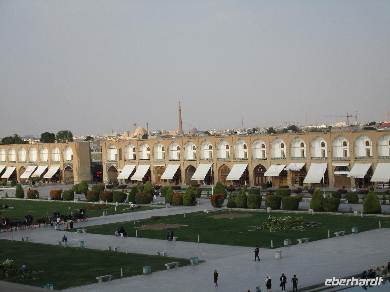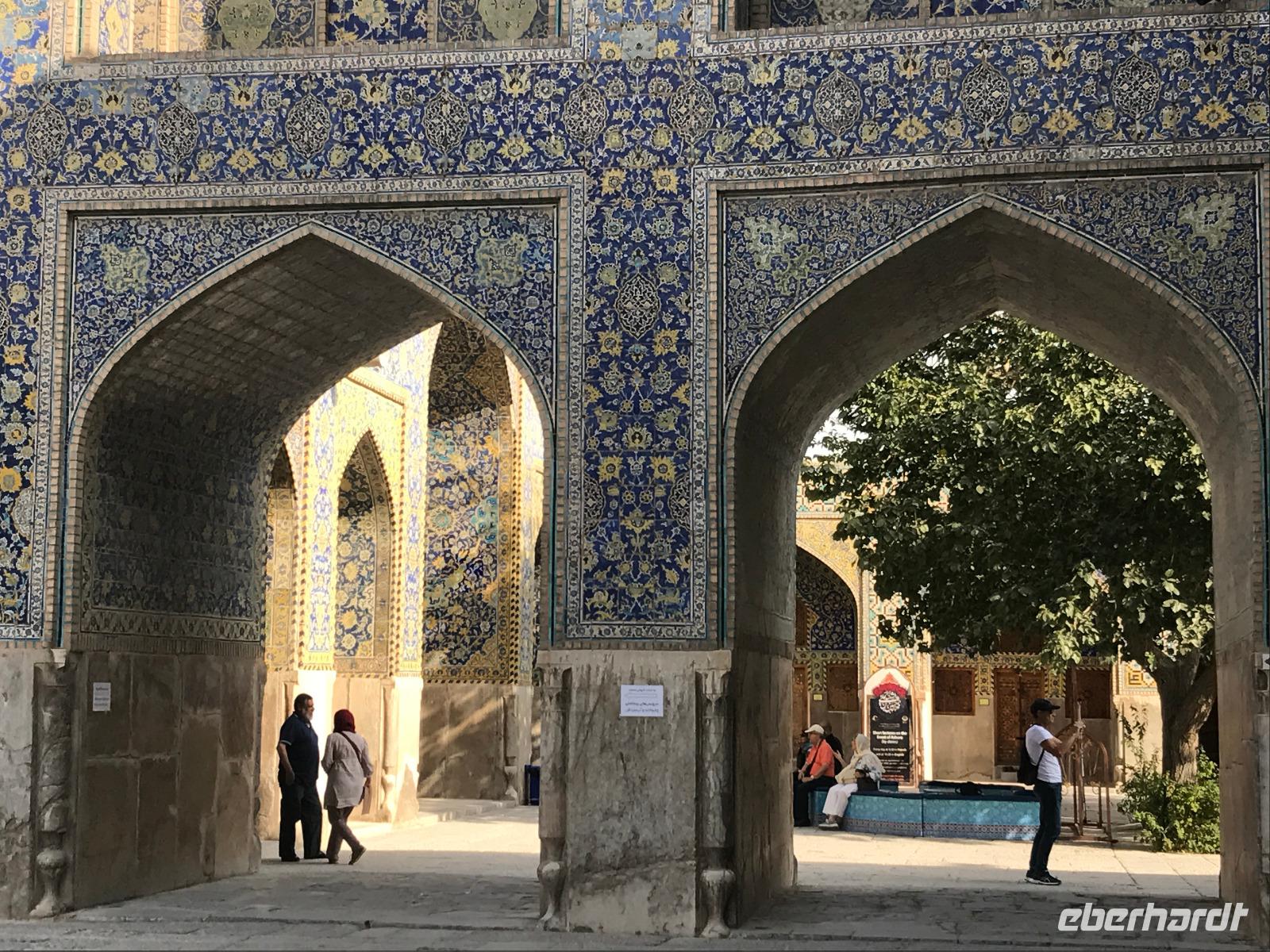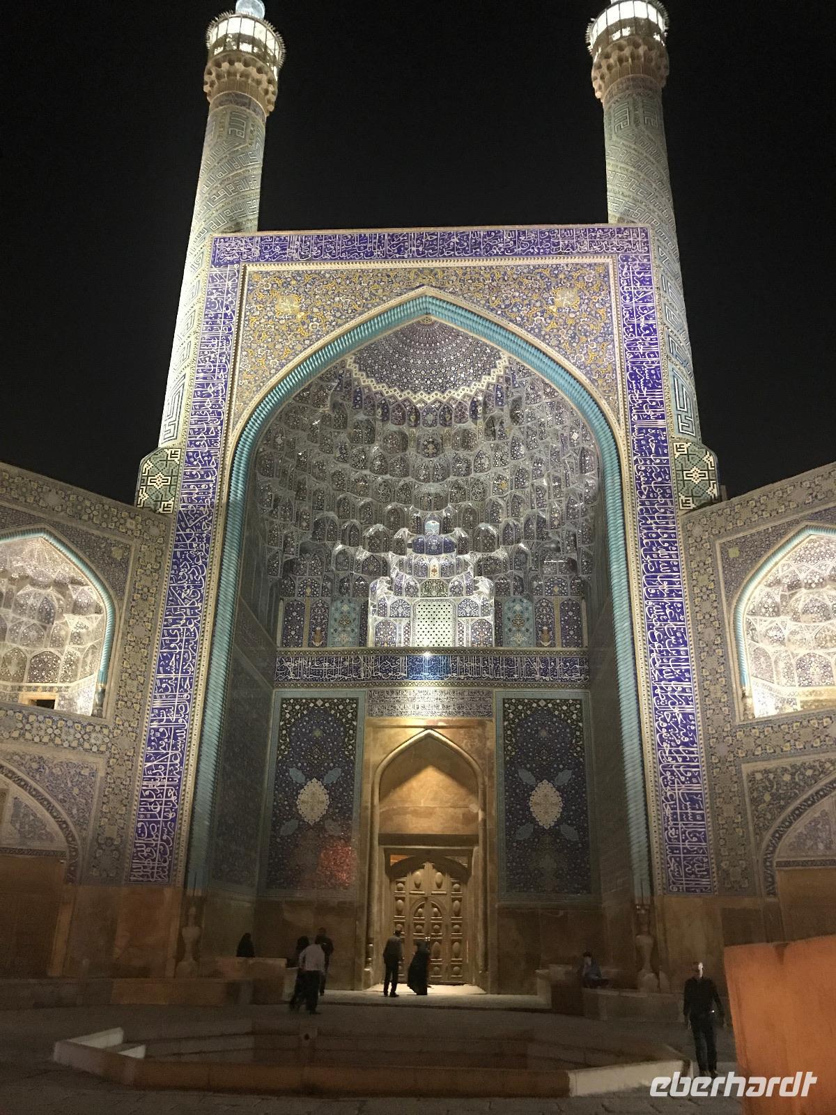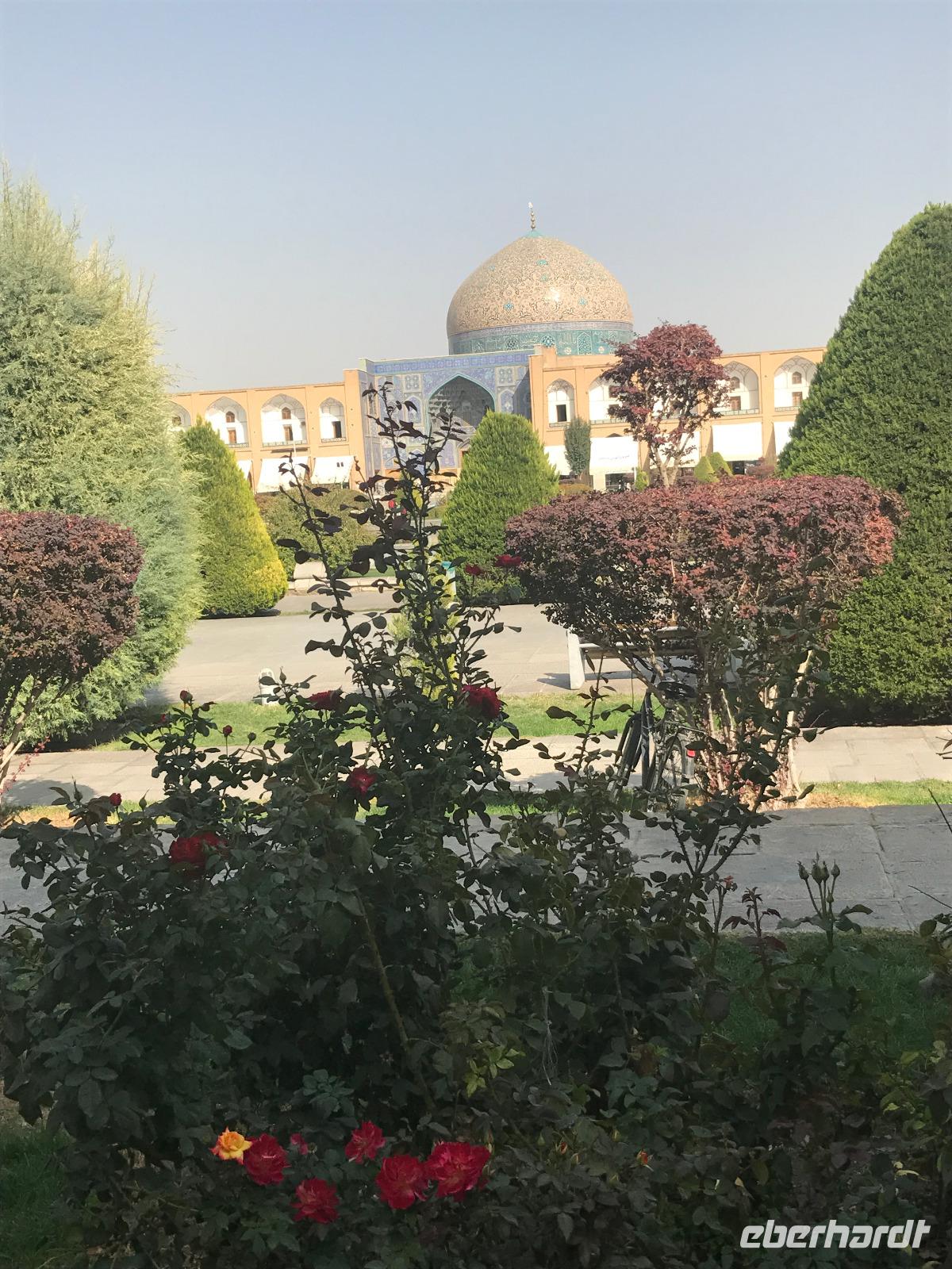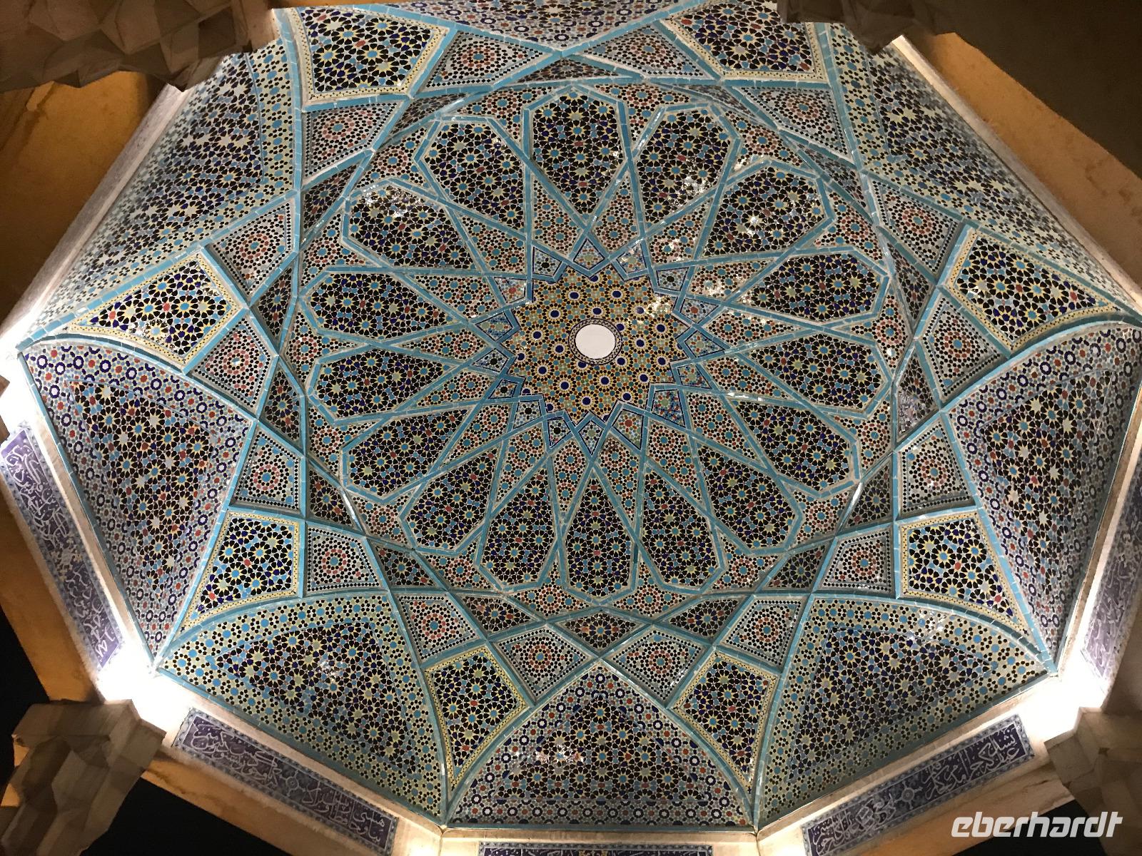„Die Hälfte der Welt" stand heute auf unserem Programm - am Ende des Tages hätten wir glatt behauptet, sie wäre die ganze - so viel hatten wir an diesem Tag gesehen und an Informationen bekommen. Aber nun von Anfang an. Nach einem sehr leckeren Frühstück und einer kurzen Busfahrt starteten wir unsere Besichtigungen im Dscholfa-Viertel, dem Armenierviertel. Die 1663 vollendete Vank-Kirche beeindruckte uns mit Farbenreichtum und wunderbaren Gemälden zur Christianisierung Armeniens im Inneren. Im Museum neben der Kathedrale bestaunten wir zwar Schätze wie ein bemaltes Haar und die kleinste Bibel der Welt, aber wir erfuhren auch erschreckende Details zum Völkermord an den Armeniern durch das Osmanische Reich. Im Anschluss fuhren wir in die Nähe des Basars, durch den wir Zugang zur Jame-Moschee hatten. Diese wird gerade teilweise renoviert, aber dies tat der Erhabenheit, die diese Moschee ausstrahlt, keinen Abbruch. Mohammad erläuterte uns neben den Besonderheiten der 4 Eingangstore, auch Iwan genannt, die Geschichte dieses beeindruckenden Monuments. Danach besuchten wir den Palast der 40 Säulen, Chehel-Sotun-Palast, mit einem wunderbaren Garten, eine Oase. Dort verkosteten wir dann auch frisch gepressten Granatapfelsaft, frisch gepressten Möhrensaft und Faloudeh - eine typische persische Süßspeise, dazu traditionelles Eis. Frisch gestärkt begaben wir uns nun zu Fuß zum Imamplatz. Nach einer kurzen Vorführung der Miniaturmalerei erfolgte die erste Besichtigung in der aus dem 17. Jahrhundert stammenden Imam-Moschee. Das Hauptportal beeindruckt mit fast 27 Metern Höhe und wird noch überragt von den zwei 42 Meter hohen Minaretten. Im Osten des Imam-Platzes, nach dem chinesischen Tiananmen-Platz der größte Platz der Welt, findet man die Lotfullah-Moschee, auch als Frauenmoschee bekannt - hier hatten auch die Damen des königlichen Gefolges Zutritt. Gegenüber ist der Ali-Qapu-Palast, übersetzt „Hohe Pforte", von dessen Terrasse der König das Polo-Spiel auf dem Platz verfolgt haben soll. Polo konnten wir heute nicht beobachten, aber das Leben auf dem Platz und die wunderbare Aussicht haben die 40 Stufen Aufstieg gelohnt. Noch ein Stockwerk höher findet man einen Musikraum, der mit formschönen Aussparungen in den Wänden eine besondere Akustik ermöglicht und heute noch für musikalische Veranstaltungen genutzt wird. Da alle durch den ereignis- und informationsreichen Tag müde waren, gestaltete sich der Bummel über den Basar ganz kurz und wir gingen zum Hotel zurück. Am Abend fuhren wir noch einmal zum Imam-Platz, der am Ende des Tages noch einmal eine ganz andere Atmosphäre versprüht, und aßen in einem Restaurant im Basar zu Abend. Auf dem Rückweg wurden noch kleine Schätze als Andenken erstanden und wieder fielen alle mit wunderbaren Eindrücken ins Bett.