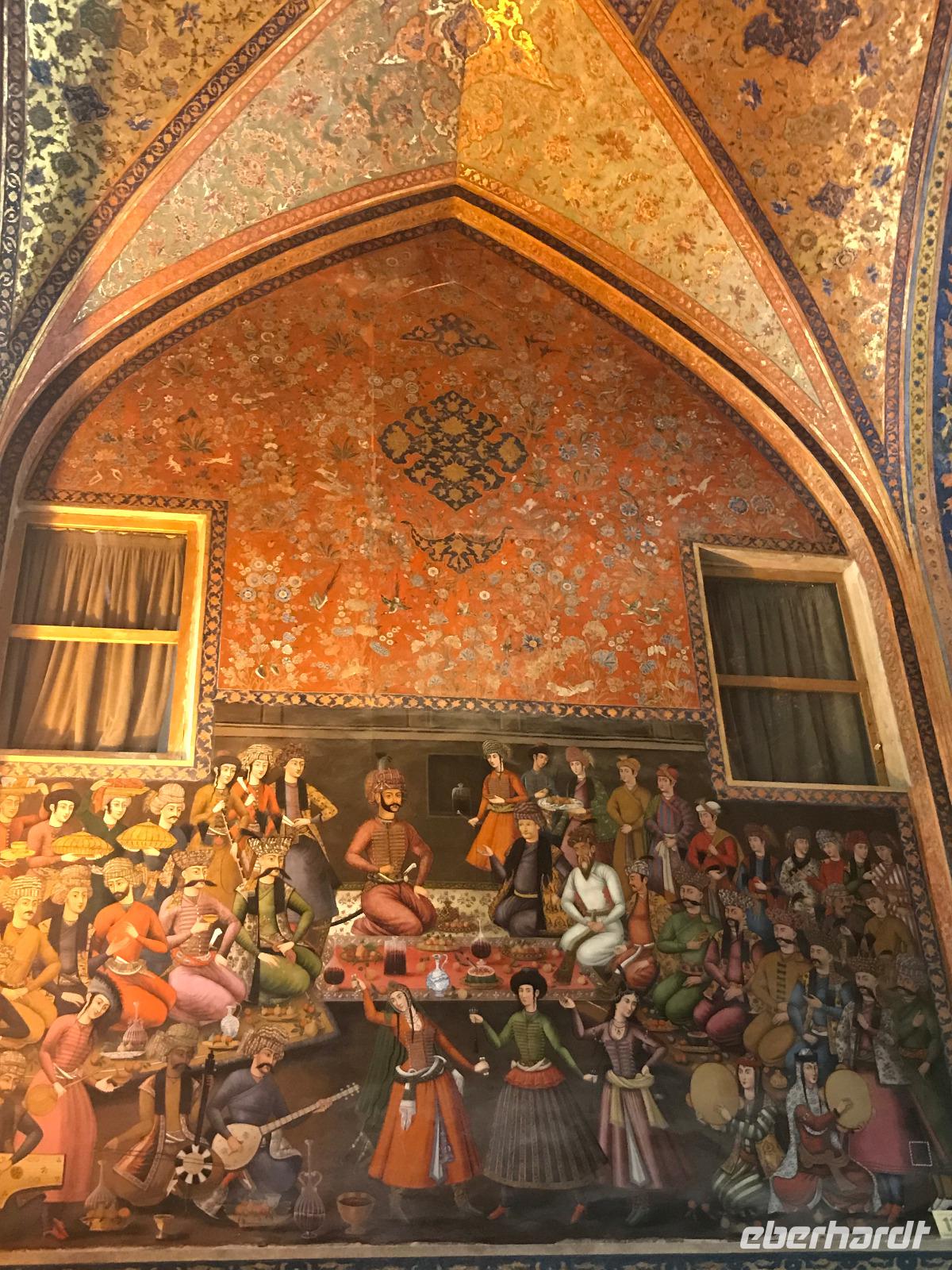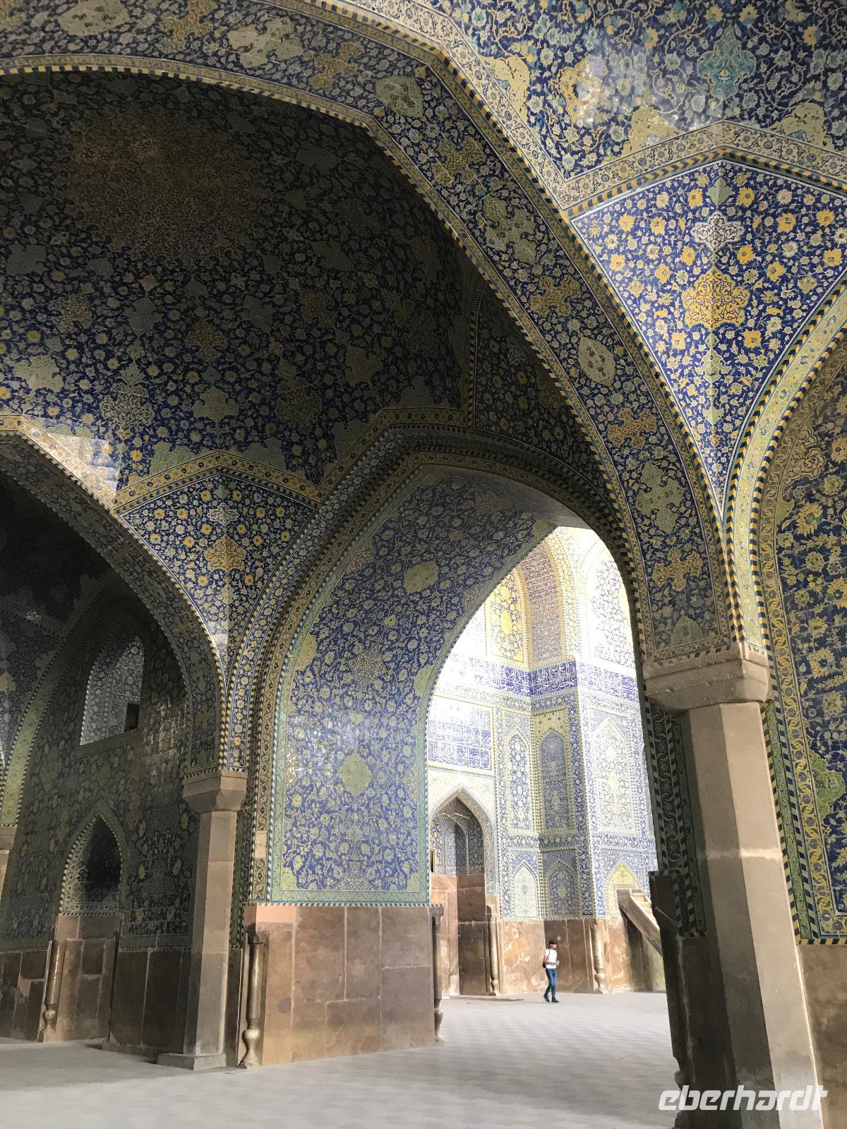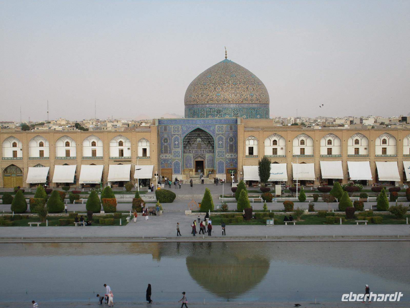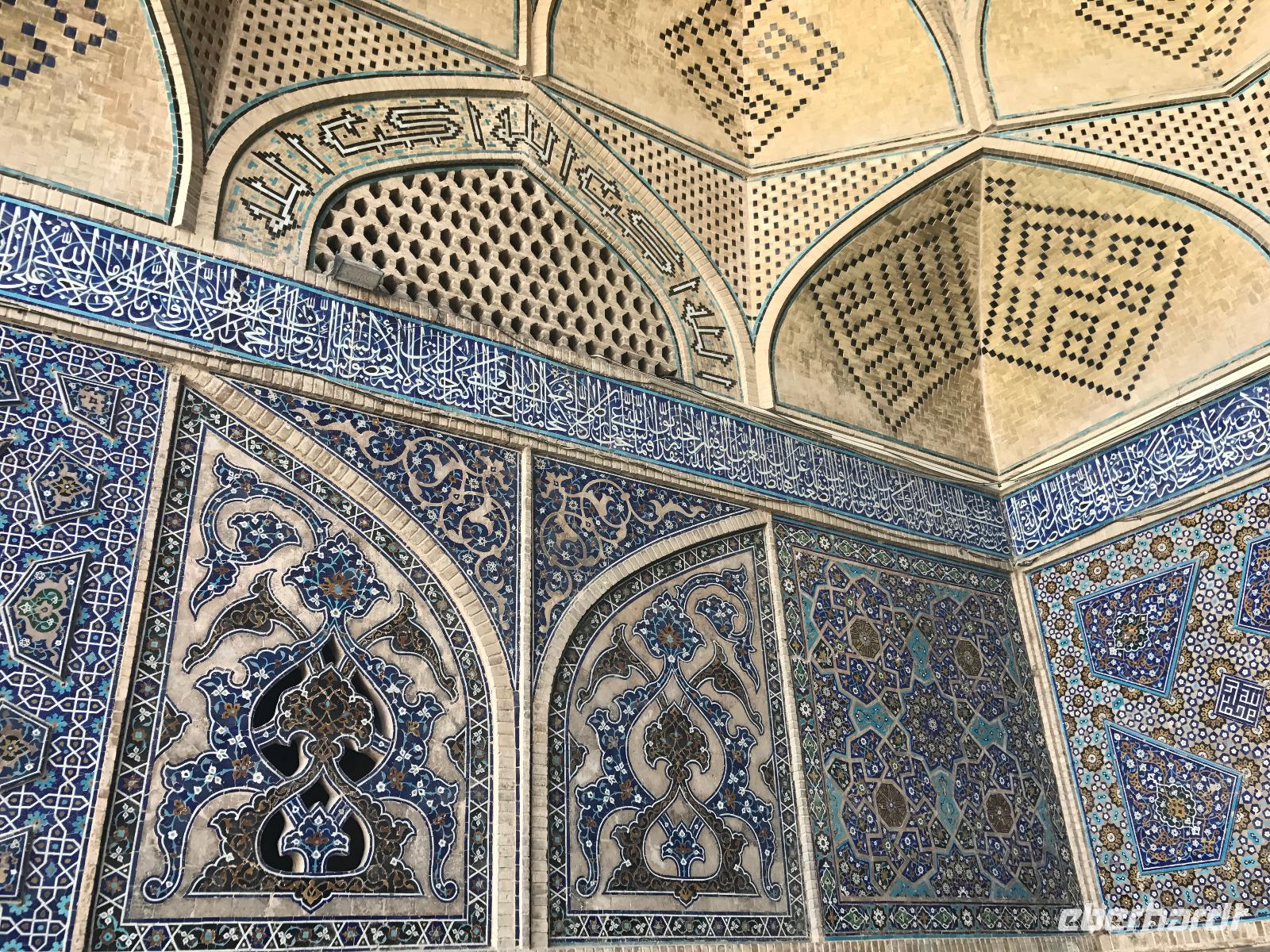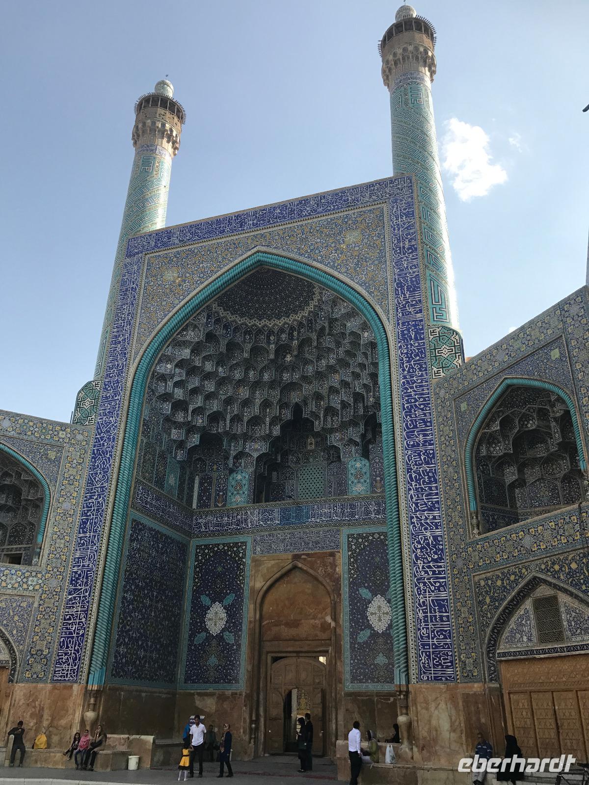 „Die Hälfte der Welt" stand heute auf unserem Programm - am Ende des Tages hätten wir glatt behauptet, sie wäre die ganze - so viel hatten wir an diesem Tag gesehen und an Informationen bekommen. Aber nun von Anfang an. Nach einem sehr leckeren Frühstück und einer kurzen Busfahrt starteten wir unsere Besichtigungen im Dscholfa-Viertel, dem Armenierviertel. Die 1663 vollendete Vank-Kirche beeindruckte uns mit Farbenreichtum und wunderbaren Gemälden zur Christianisierung Armeniens im Inneren. Im Museum neben der Kathedrale bestaunten wir zwar Schätze wie ein bemaltes Haar und die kleinste Bibel der Welt, aber wir erfuhren auch erschreckende Details zum Völkermord an den Armeniern durch das Osmanische Reich. Im Anschluss fuhren wir in die Nähe des Basars, durch den wir Zugang zur Jame-Moschee hatten. Diese wird gerade teilweise renoviert, aber dies tat der Erhabenheit, die diese Moschee ausstrahlt, keinen Abbruch. Mohammad erläuterte uns neben den Besonderheiten der 4 Eingangstore, auch Iwan genannt, die Geschichte dieses beeindruckenden Monuments. Danach besuchten wir den Palast der 40 Säulen, Chehel-Sotun-Palast, mit einem wunderbaren Garten, eine Oase. Dort verkosteten wir dann auch frisch gepressten Granatapfelsaft, frisch gepressten Möhrensaft und Faloudeh - eine typische persische Süßspeise, dazu traditionelles Eis. Frisch gestärkt begaben wir uns nun zu Fuß zum Imamplatz. Nach einer kurzen Vorführung der Miniaturmalerei erfolgte die erste Besichtigung in der aus dem 17. Jahrhundert stammenden Imam-Moschee. Das Hauptportal beeindruckt mit fast 27 Metern Höhe und wird noch überragt von den zwei 42 Meter hohen Minaretten. Im Osten des Imam-Platzes, nach dem chinesischen Tiananmen-Platz der größte Platz der Welt, findet man die Lotfullah-Moschee, auch als Frauenmoschee bekannt - hier hatten auch die Damen des königlichen Gefolges Zutritt. Gegenüber ist der Ali-Qapu-Palast, übersetzt „Hohe Pforte", von dessen Terrasse der König das Polo-Spiel auf dem Platz verfolgt haben soll. Polo konnten wir heute nicht beobachten, aber das Leben auf dem Platz und die wunderbare Aussicht haben die 40 Stufen Aufstieg gelohnt. Noch ein Stockwerk höher findet man einen Musikraum, der mit formschönen Aussparungen in den Wänden eine besondere Akustik ermöglicht und heute noch für musikalische Veranstaltungen genutzt wird. Da alle durch den ereignis- und informationsreichen Tag müde waren, gestaltete sich der Bummel über den Basar ganz kurz und wir gingen zum Hotel zurück. Am Abend fuhren wir noch einmal zum Imam-Platz, der am Ende des Tages noch einmal eine ganz andere Atmosphäre versprüht, und aßen in einem Restaurant im Basar zu Abend. Auf dem Rückweg wurden noch kleine Schätze als Andenken erstanden und wieder fielen alle mit wunderbaren Eindrücken ins Bett.