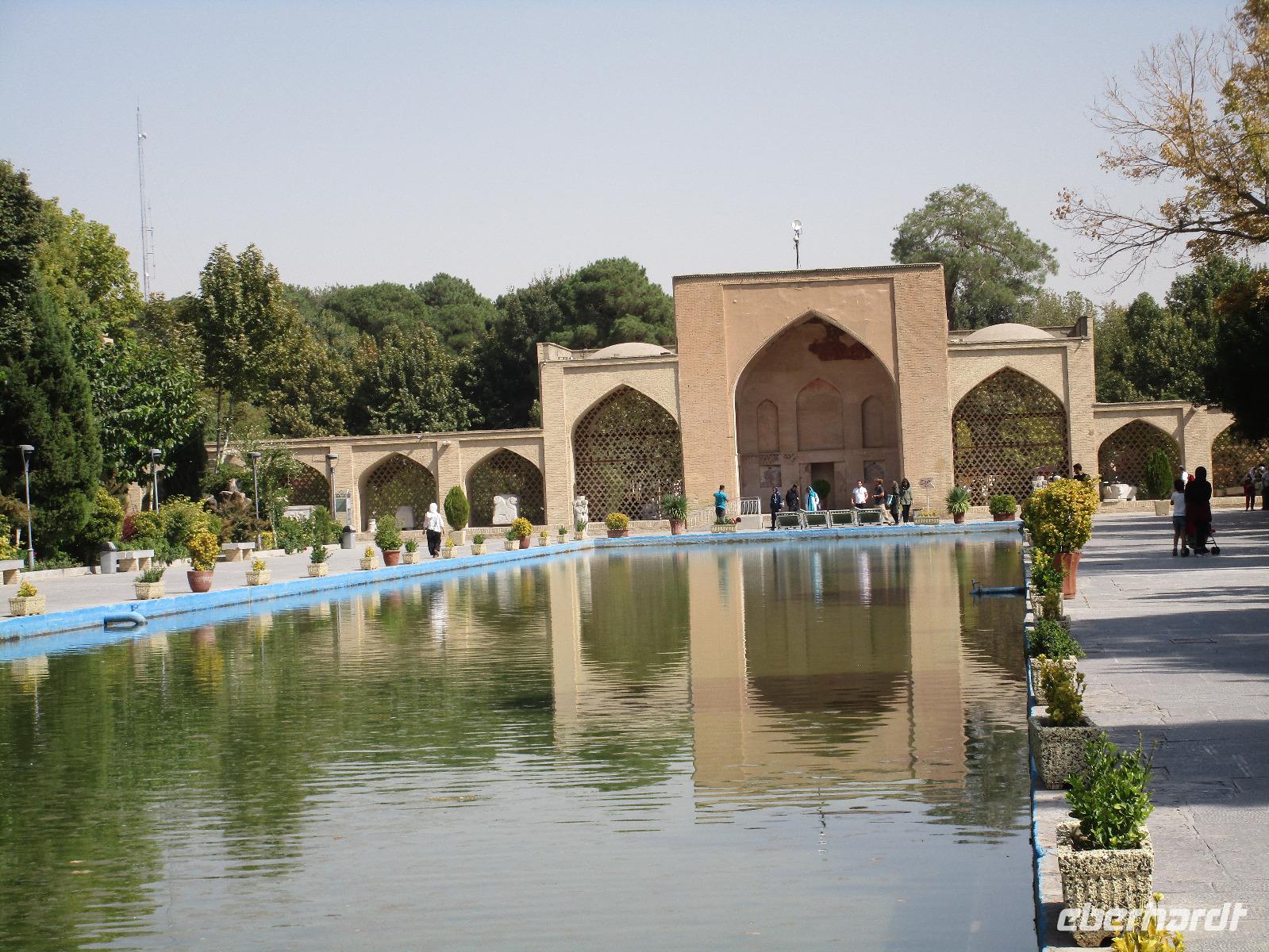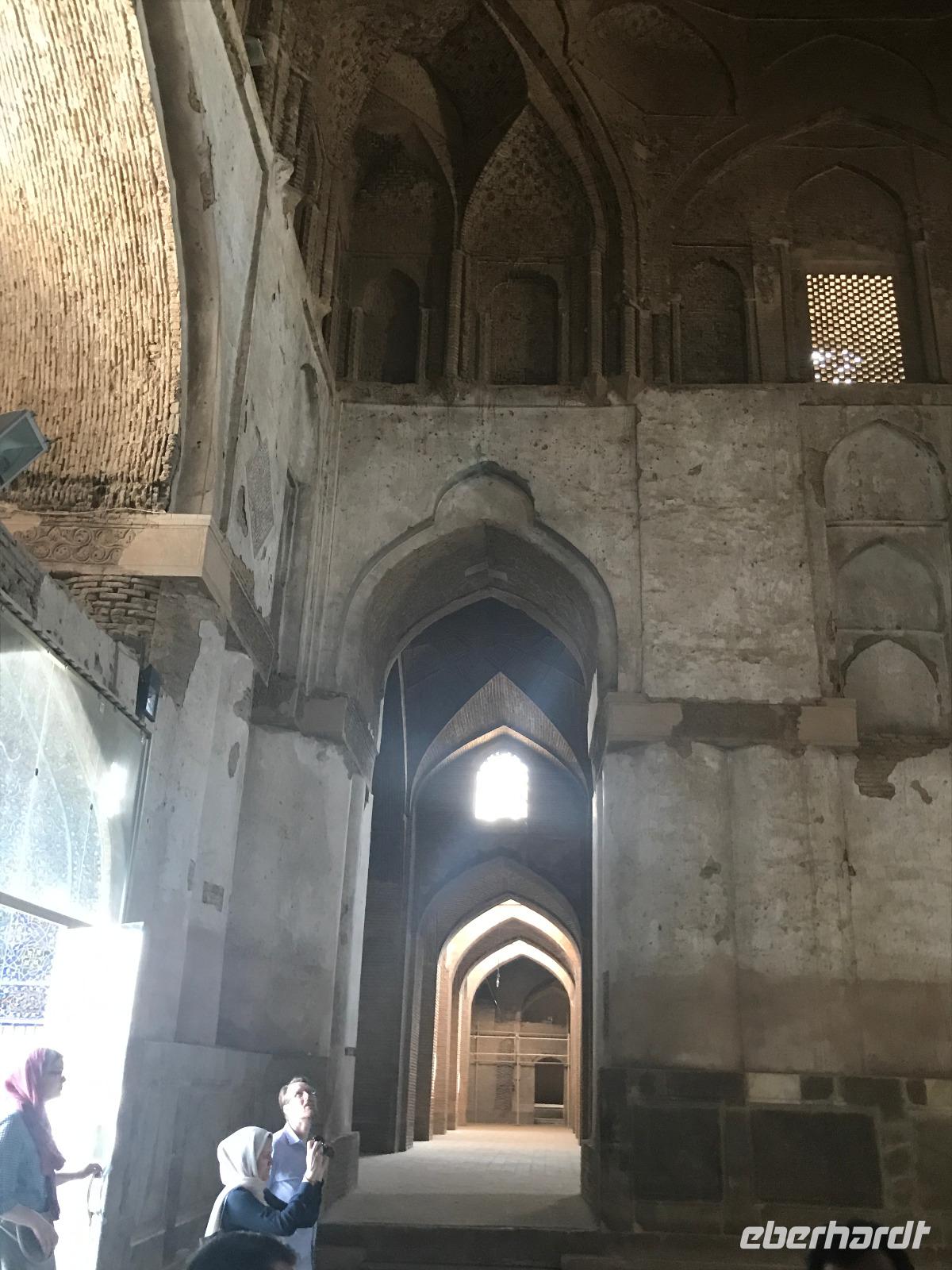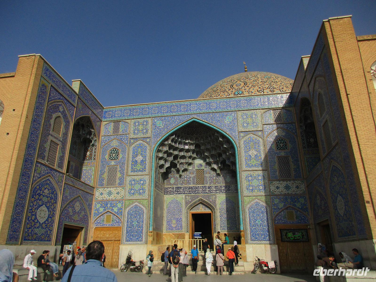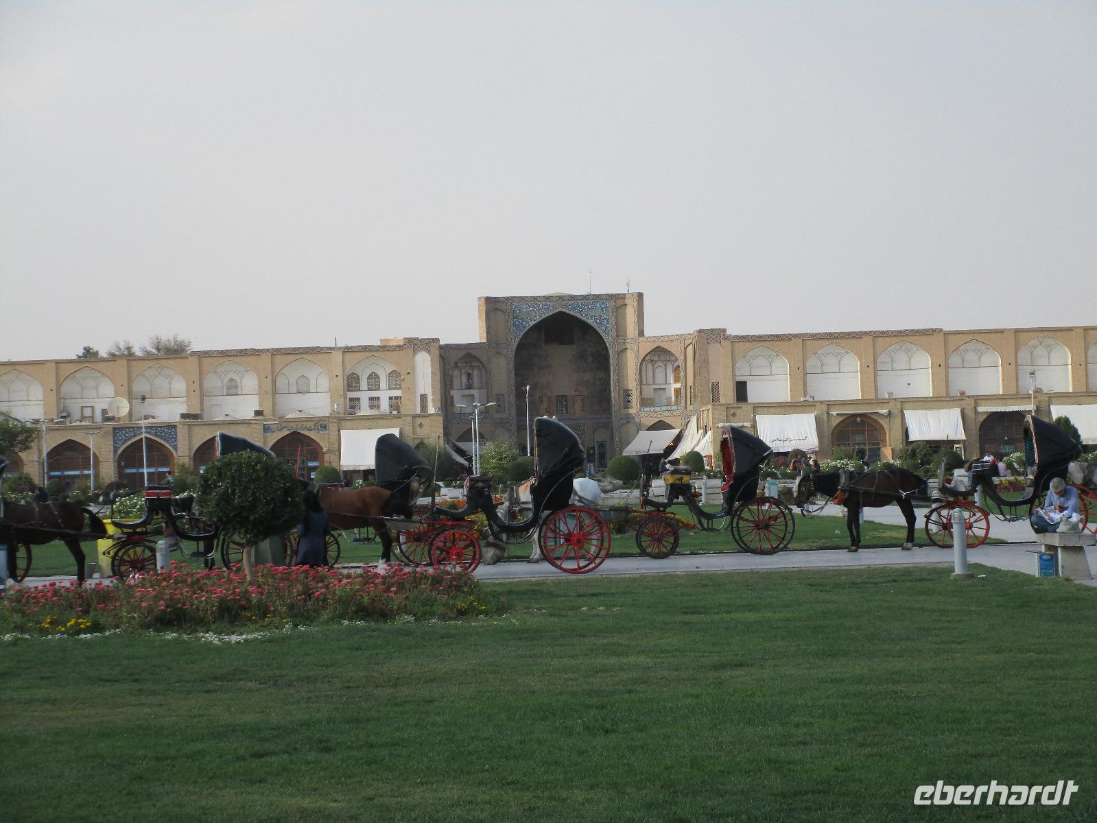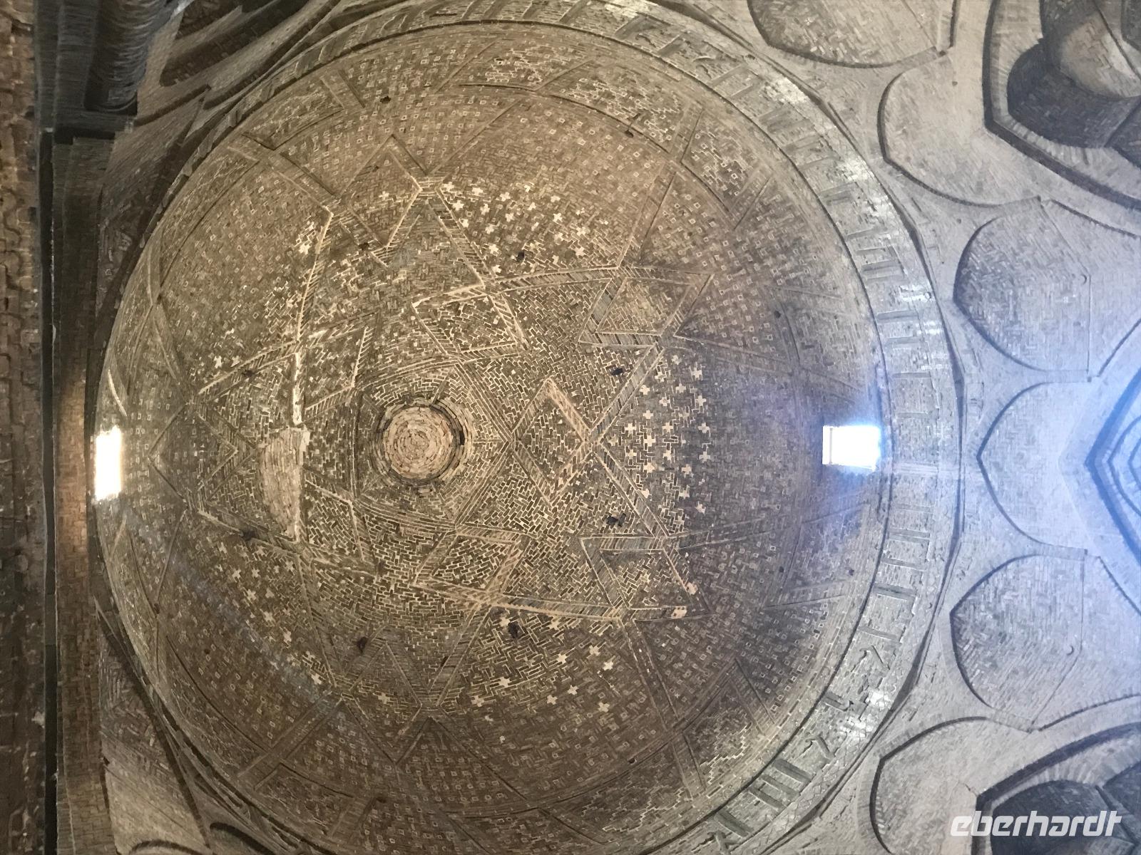 „Die Hälfte der Welt" stand heute auf unserem Programm - am Ende des Tages hätten wir glatt behauptet, sie wäre die ganze - so viel hatten wir an diesem Tag gesehen und an Informationen bekommen. Aber nun von Anfang an. Nach einem sehr leckeren Frühstück und einer kurzen Busfahrt starteten wir unsere Besichtigungen im Dscholfa-Viertel, dem Armenierviertel. Die 1663 vollendete Vank-Kirche beeindruckte uns mit Farbenreichtum und wunderbaren Gemälden zur Christianisierung Armeniens im Inneren. Im Museum neben der Kathedrale bestaunten wir zwar Schätze wie ein bemaltes Haar und die kleinste Bibel der Welt, aber wir erfuhren auch erschreckende Details zum Völkermord an den Armeniern durch das Osmanische Reich. Im Anschluss fuhren wir in die Nähe des Basars, durch den wir Zugang zur Jame-Moschee hatten. Diese wird gerade teilweise renoviert, aber dies tat der Erhabenheit, die diese Moschee ausstrahlt, keinen Abbruch. Mohammad erläuterte uns neben den Besonderheiten der 4 Eingangstore, auch Iwan genannt, die Geschichte dieses beeindruckenden Monuments. Danach besuchten wir den Palast der 40 Säulen, Chehel-Sotun-Palast, mit einem wunderbaren Garten, eine Oase. Dort verkosteten wir dann auch frisch gepressten Granatapfelsaft, frisch gepressten Möhrensaft und Faloudeh - eine typische persische Süßspeise, dazu traditionelles Eis. Frisch gestärkt begaben wir uns nun zu Fuß zum Imamplatz. Nach einer kurzen Vorführung der Miniaturmalerei erfolgte die erste Besichtigung in der aus dem 17. Jahrhundert stammenden Imam-Moschee. Das Hauptportal beeindruckt mit fast 27 Metern Höhe und wird noch überragt von den zwei 42 Meter hohen Minaretten. Im Osten des Imam-Platzes, nach dem chinesischen Tiananmen-Platz der größte Platz der Welt, findet man die Lotfullah-Moschee, auch als Frauenmoschee bekannt - hier hatten auch die Damen des königlichen Gefolges Zutritt. Gegenüber ist der Ali-Qapu-Palast, übersetzt „Hohe Pforte", von dessen Terrasse der König das Polo-Spiel auf dem Platz verfolgt haben soll. Polo konnten wir heute nicht beobachten, aber das Leben auf dem Platz und die wunderbare Aussicht haben die 40 Stufen Aufstieg gelohnt. Noch ein Stockwerk höher findet man einen Musikraum, der mit formschönen Aussparungen in den Wänden eine besondere Akustik ermöglicht und heute noch für musikalische Veranstaltungen genutzt wird. Da alle durch den ereignis- und informationsreichen Tag müde waren, gestaltete sich der Bummel über den Basar ganz kurz und wir gingen zum Hotel zurück. Am Abend fuhren wir noch einmal zum Imam-Platz, der am Ende des Tages noch einmal eine ganz andere Atmosphäre versprüht, und aßen in einem Restaurant im Basar zu Abend. Auf dem Rückweg wurden noch kleine Schätze als Andenken erstanden und wieder fielen alle mit wunderbaren Eindrücken ins Bett.