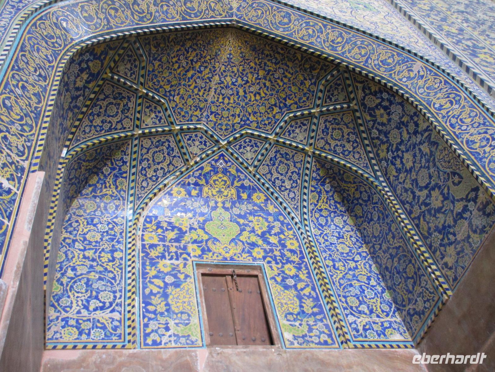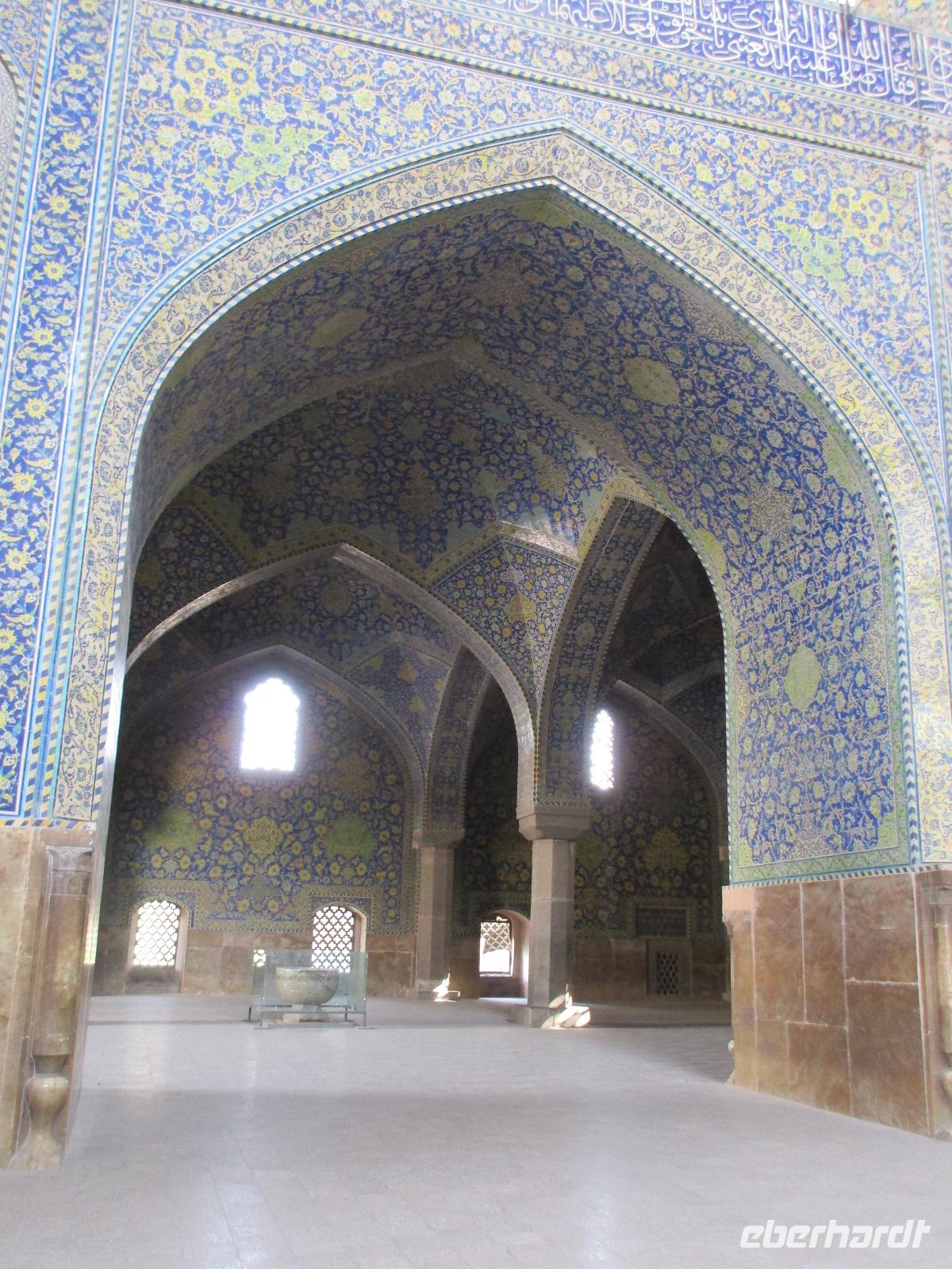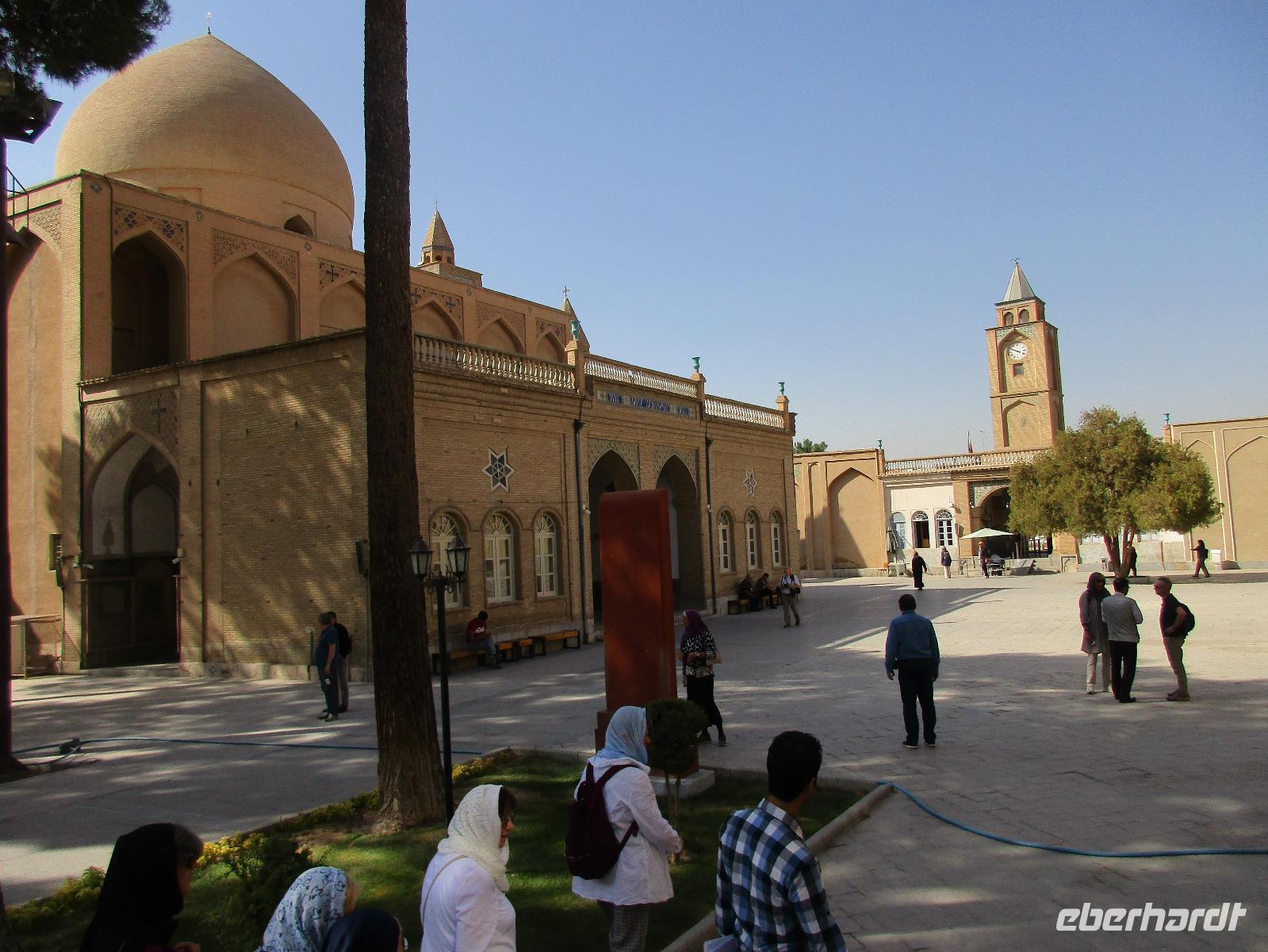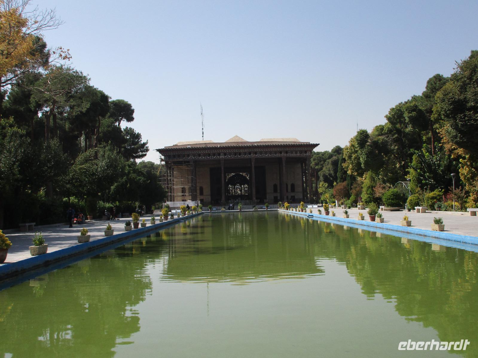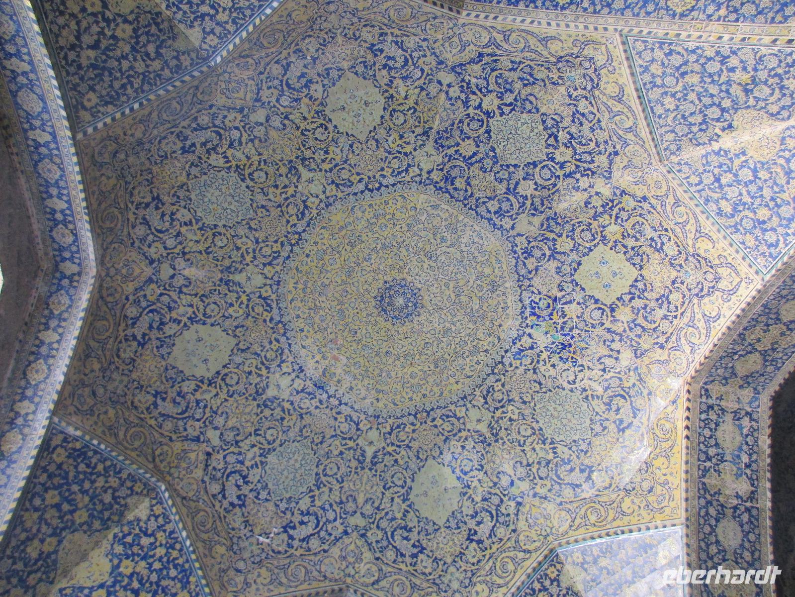 „Die Hälfte der Welt" stand heute auf unserem Programm - am Ende des Tages hätten wir glatt behauptet, sie wäre die ganze - so viel hatten wir an diesem Tag gesehen und an Informationen bekommen. Aber nun von Anfang an. Nach einem sehr leckeren Frühstück und einer kurzen Busfahrt starteten wir unsere Besichtigungen im Dscholfa-Viertel, dem Armenierviertel. Die 1663 vollendete Vank-Kirche beeindruckte uns mit Farbenreichtum und wunderbaren Gemälden zur Christianisierung Armeniens im Inneren. Im Museum neben der Kathedrale bestaunten wir zwar Schätze wie ein bemaltes Haar und die kleinste Bibel der Welt, aber wir erfuhren auch erschreckende Details zum Völkermord an den Armeniern durch das Osmanische Reich. Im Anschluss fuhren wir in die Nähe des Basars, durch den wir Zugang zur Jame-Moschee hatten. Diese wird gerade teilweise renoviert, aber dies tat der Erhabenheit, die diese Moschee ausstrahlt, keinen Abbruch. Mohammad erläuterte uns neben den Besonderheiten der 4 Eingangstore, auch Iwan genannt, die Geschichte dieses beeindruckenden Monuments. Danach besuchten wir den Palast der 40 Säulen, Chehel-Sotun-Palast, mit einem wunderbaren Garten, eine Oase. Dort verkosteten wir dann auch frisch gepressten Granatapfelsaft, frisch gepressten Möhrensaft und Faloudeh - eine typische persische Süßspeise, dazu traditionelles Eis. Frisch gestärkt begaben wir uns nun zu Fuß zum Imamplatz. Nach einer kurzen Vorführung der Miniaturmalerei erfolgte die erste Besichtigung in der aus dem 17. Jahrhundert stammenden Imam-Moschee. Das Hauptportal beeindruckt mit fast 27 Metern Höhe und wird noch überragt von den zwei 42 Meter hohen Minaretten. Im Osten des Imam-Platzes, nach dem chinesischen Tiananmen-Platz der größte Platz der Welt, findet man die Lotfullah-Moschee, auch als Frauenmoschee bekannt - hier hatten auch die Damen des königlichen Gefolges Zutritt. Gegenüber ist der Ali-Qapu-Palast, übersetzt „Hohe Pforte", von dessen Terrasse der König das Polo-Spiel auf dem Platz verfolgt haben soll. Polo konnten wir heute nicht beobachten, aber das Leben auf dem Platz und die wunderbare Aussicht haben die 40 Stufen Aufstieg gelohnt. Noch ein Stockwerk höher findet man einen Musikraum, der mit formschönen Aussparungen in den Wänden eine besondere Akustik ermöglicht und heute noch für musikalische Veranstaltungen genutzt wird. Da alle durch den ereignis- und informationsreichen Tag müde waren, gestaltete sich der Bummel über den Basar ganz kurz und wir gingen zum Hotel zurück. Am Abend fuhren wir noch einmal zum Imam-Platz, der am Ende des Tages noch einmal eine ganz andere Atmosphäre versprüht, und aßen in einem Restaurant im Basar zu Abend. Auf dem Rückweg wurden noch kleine Schätze als Andenken erstanden und wieder fielen alle mit wunderbaren Eindrücken ins Bett.