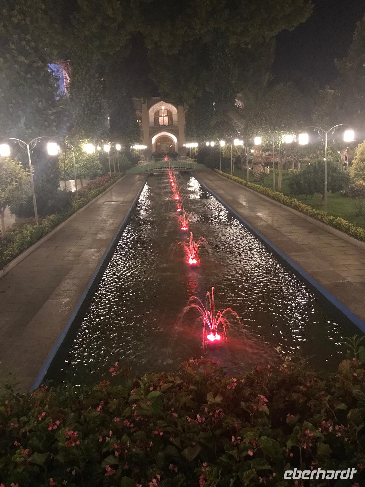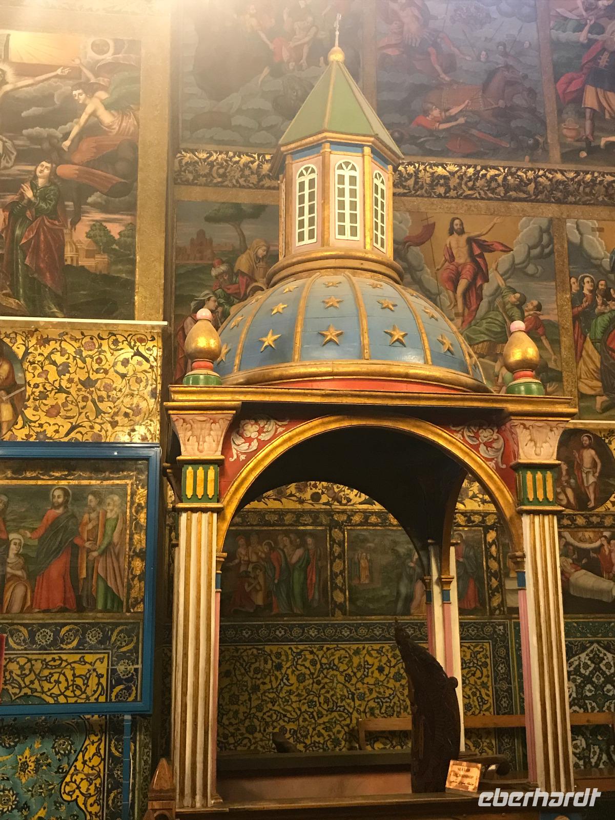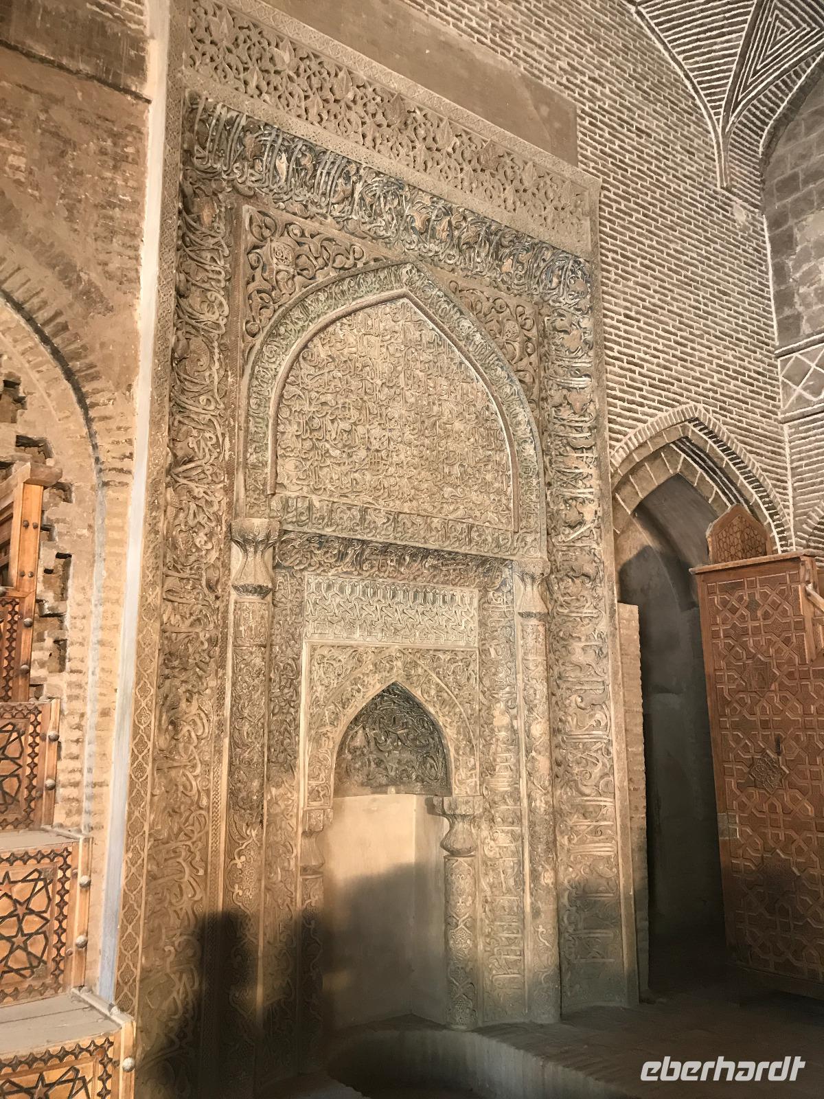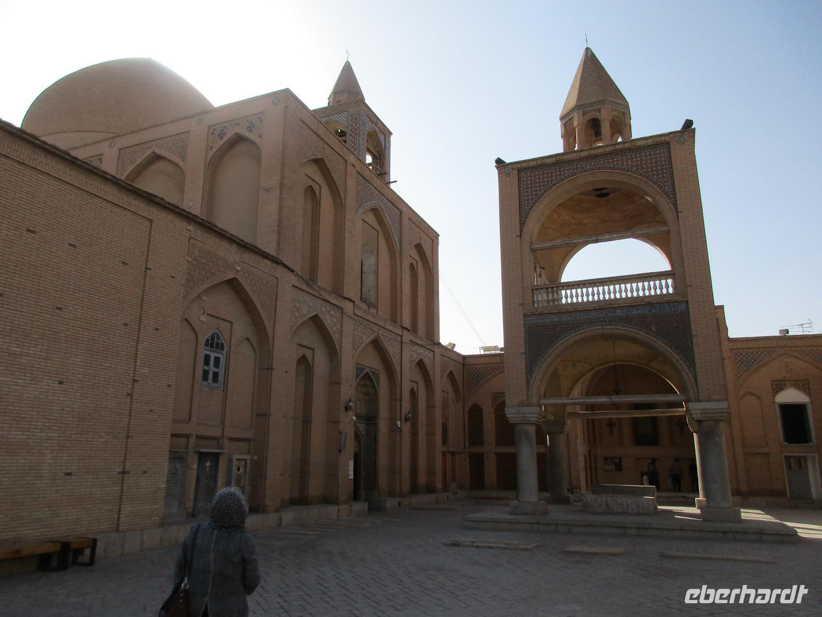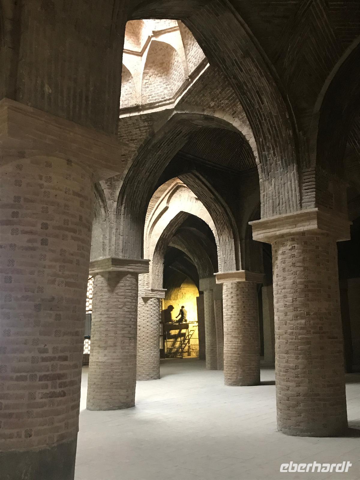 „Die Hälfte der Welt" stand heute auf unserem Programm - am Ende des Tages hätten wir glatt behauptet, sie wäre die ganze - so viel hatten wir an diesem Tag gesehen und an Informationen bekommen. Aber nun von Anfang an. Nach einem sehr leckeren Frühstück und einer kurzen Busfahrt starteten wir unsere Besichtigungen im Dscholfa-Viertel, dem Armenierviertel. Die 1663 vollendete Vank-Kirche beeindruckte uns mit Farbenreichtum und wunderbaren Gemälden zur Christianisierung Armeniens im Inneren. Im Museum neben der Kathedrale bestaunten wir zwar Schätze wie ein bemaltes Haar und die kleinste Bibel der Welt, aber wir erfuhren auch erschreckende Details zum Völkermord an den Armeniern durch das Osmanische Reich. Im Anschluss fuhren wir in die Nähe des Basars, durch den wir Zugang zur Jame-Moschee hatten. Diese wird gerade teilweise renoviert, aber dies tat der Erhabenheit, die diese Moschee ausstrahlt, keinen Abbruch. Mohammad erläuterte uns neben den Besonderheiten der 4 Eingangstore, auch Iwan genannt, die Geschichte dieses beeindruckenden Monuments. Danach besuchten wir den Palast der 40 Säulen, Chehel-Sotun-Palast, mit einem wunderbaren Garten, eine Oase. Dort verkosteten wir dann auch frisch gepressten Granatapfelsaft, frisch gepressten Möhrensaft und Faloudeh - eine typische persische Süßspeise, dazu traditionelles Eis. Frisch gestärkt begaben wir uns nun zu Fuß zum Imamplatz. Nach einer kurzen Vorführung der Miniaturmalerei erfolgte die erste Besichtigung in der aus dem 17. Jahrhundert stammenden Imam-Moschee. Das Hauptportal beeindruckt mit fast 27 Metern Höhe und wird noch überragt von den zwei 42 Meter hohen Minaretten. Im Osten des Imam-Platzes, nach dem chinesischen Tiananmen-Platz der größte Platz der Welt, findet man die Lotfullah-Moschee, auch als Frauenmoschee bekannt - hier hatten auch die Damen des königlichen Gefolges Zutritt. Gegenüber ist der Ali-Qapu-Palast, übersetzt „Hohe Pforte", von dessen Terrasse der König das Polo-Spiel auf dem Platz verfolgt haben soll. Polo konnten wir heute nicht beobachten, aber das Leben auf dem Platz und die wunderbare Aussicht haben die 40 Stufen Aufstieg gelohnt. Noch ein Stockwerk höher findet man einen Musikraum, der mit formschönen Aussparungen in den Wänden eine besondere Akustik ermöglicht und heute noch für musikalische Veranstaltungen genutzt wird. Da alle durch den ereignis- und informationsreichen Tag müde waren, gestaltete sich der Bummel über den Basar ganz kurz und wir gingen zum Hotel zurück. Am Abend fuhren wir noch einmal zum Imam-Platz, der am Ende des Tages noch einmal eine ganz andere Atmosphäre versprüht, und aßen in einem Restaurant im Basar zu Abend. Auf dem Rückweg wurden noch kleine Schätze als Andenken erstanden und wieder fielen alle mit wunderbaren Eindrücken ins Bett.
