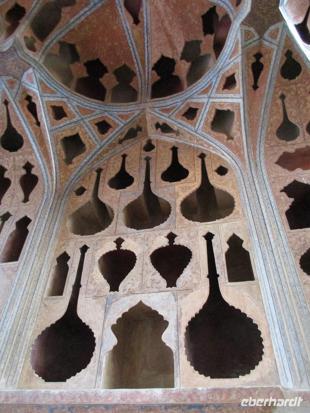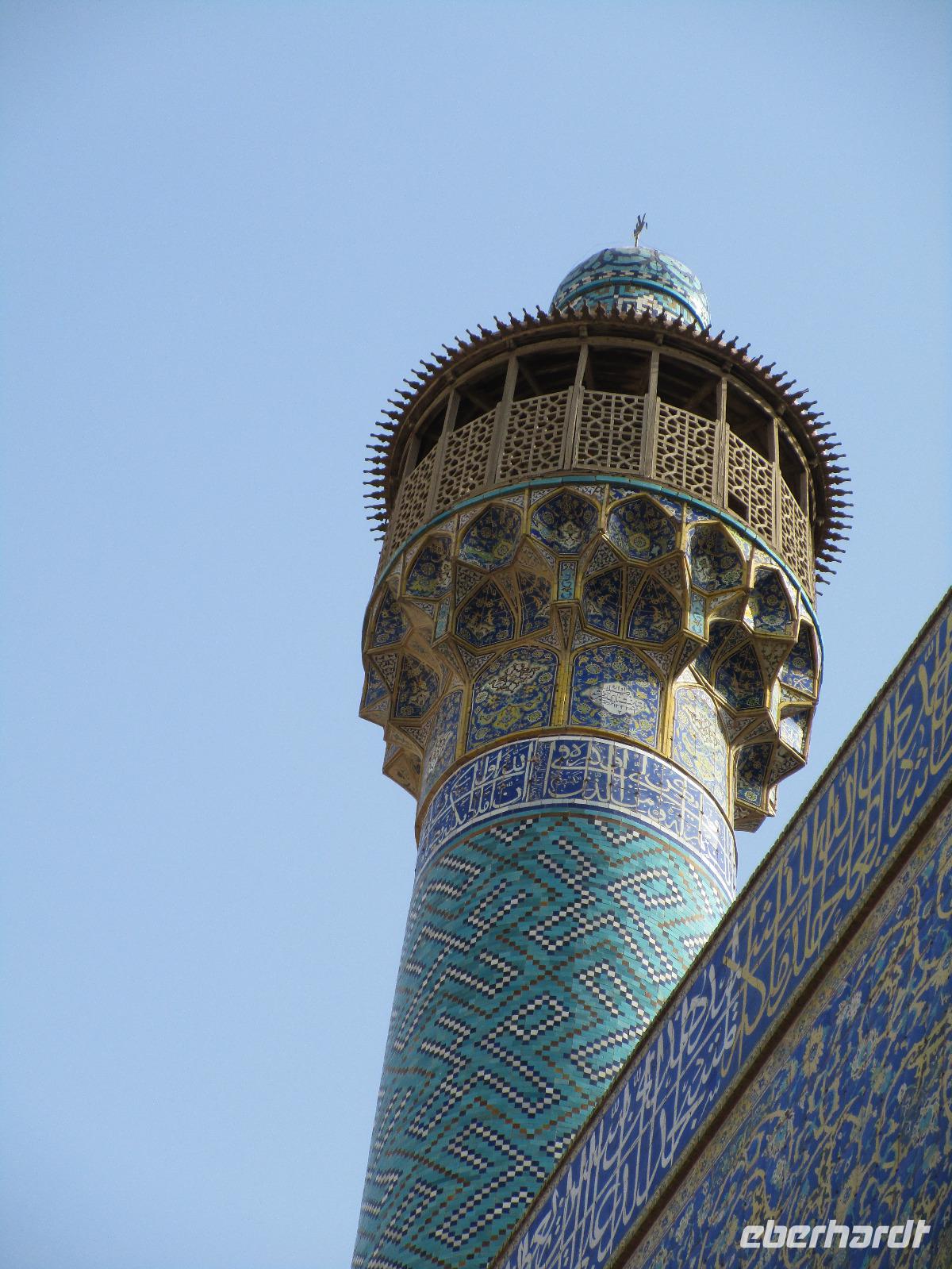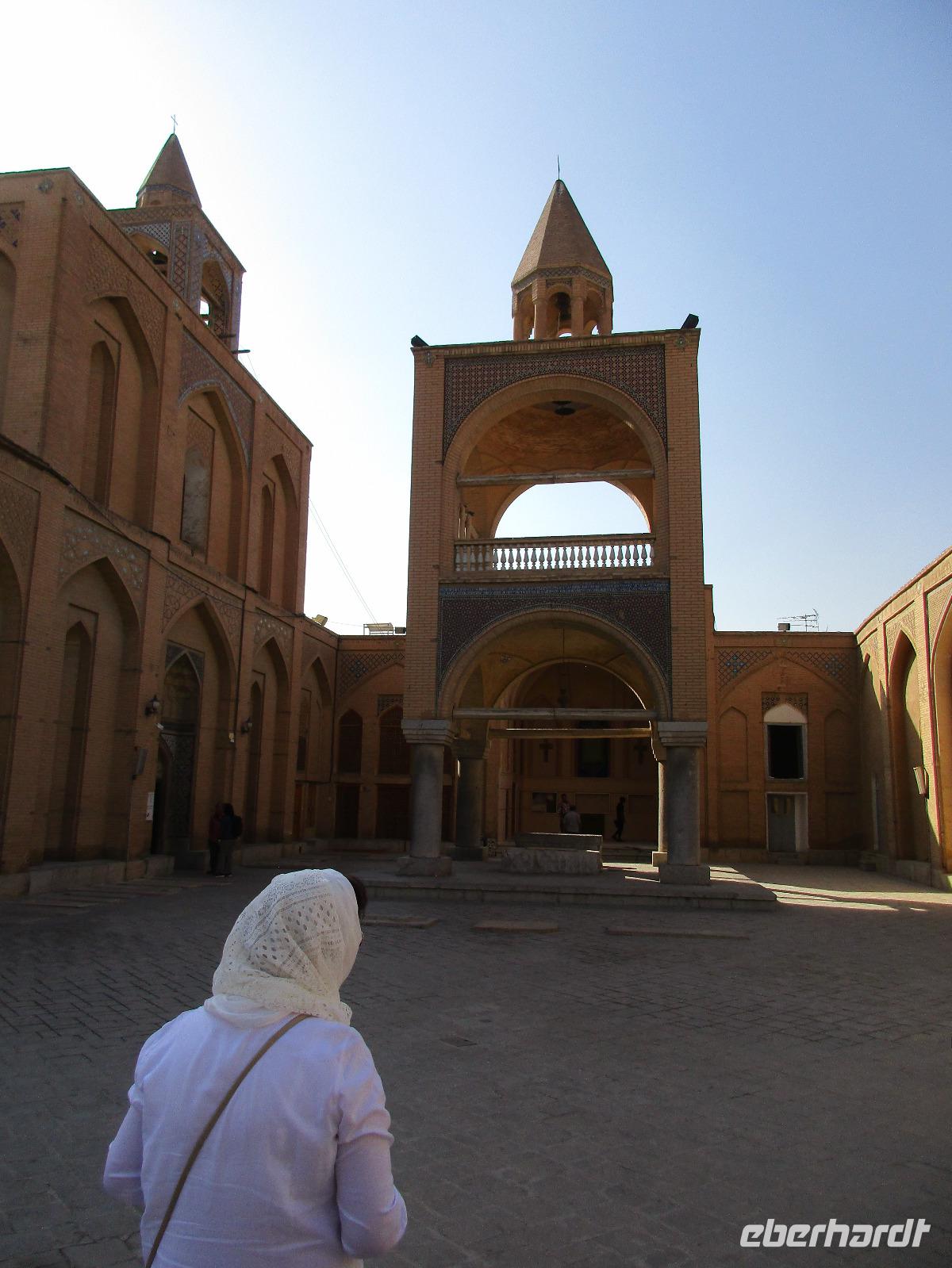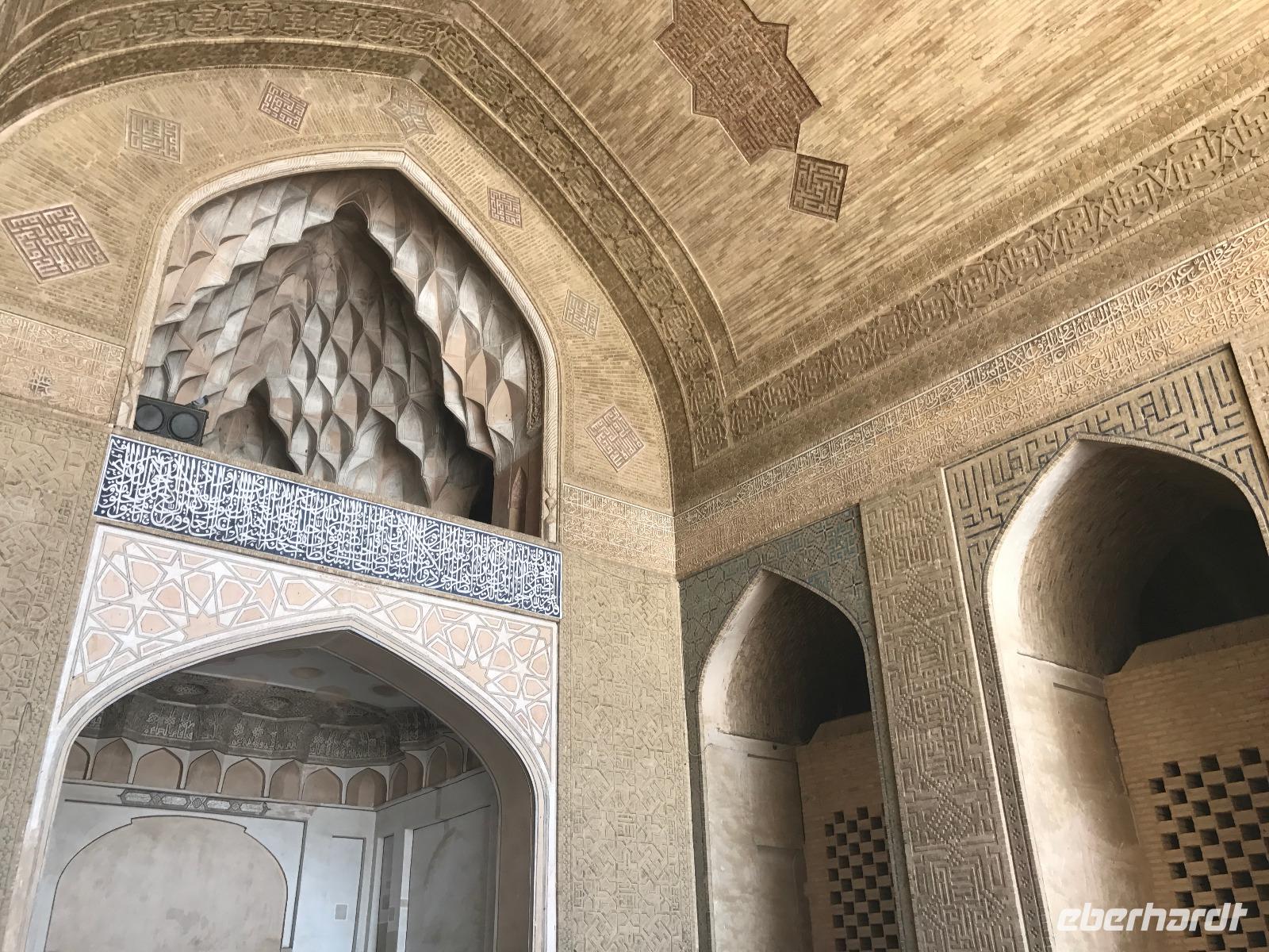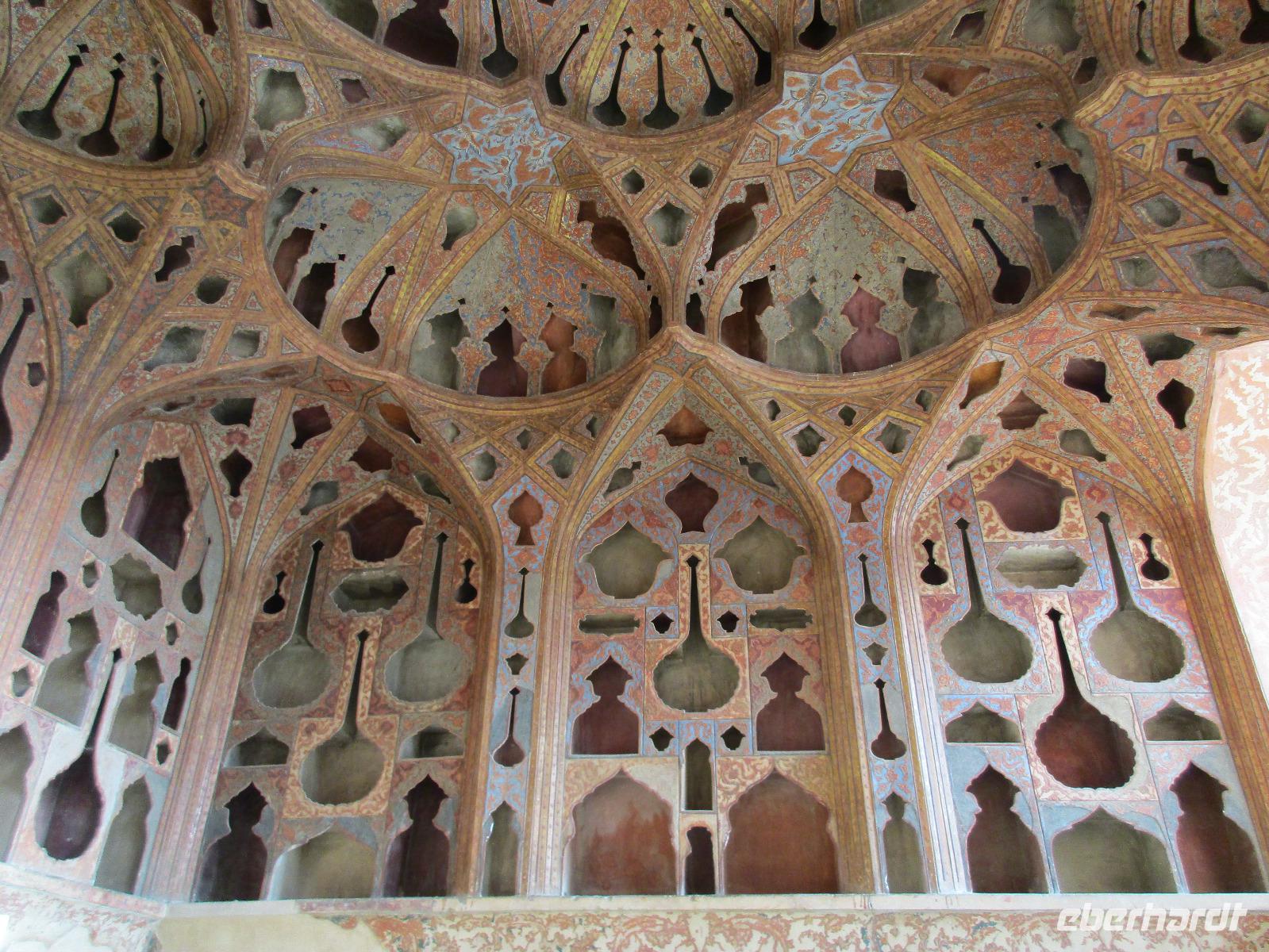 „Die Hälfte der Welt" stand heute auf unserem Programm - am Ende des Tages hätten wir glatt behauptet, sie wäre die ganze - so viel hatten wir an diesem Tag gesehen und an Informationen bekommen. Aber nun von Anfang an. Nach einem sehr leckeren Frühstück und einer kurzen Busfahrt starteten wir unsere Besichtigungen im Dscholfa-Viertel, dem Armenierviertel. Die 1663 vollendete Vank-Kirche beeindruckte uns mit Farbenreichtum und wunderbaren Gemälden zur Christianisierung Armeniens im Inneren. Im Museum neben der Kathedrale bestaunten wir zwar Schätze wie ein bemaltes Haar und die kleinste Bibel der Welt, aber wir erfuhren auch erschreckende Details zum Völkermord an den Armeniern durch das Osmanische Reich. Im Anschluss fuhren wir in die Nähe des Basars, durch den wir Zugang zur Jame-Moschee hatten. Diese wird gerade teilweise renoviert, aber dies tat der Erhabenheit, die diese Moschee ausstrahlt, keinen Abbruch. Mohammad erläuterte uns neben den Besonderheiten der 4 Eingangstore, auch Iwan genannt, die Geschichte dieses beeindruckenden Monuments. Danach besuchten wir den Palast der 40 Säulen, Chehel-Sotun-Palast, mit einem wunderbaren Garten, eine Oase. Dort verkosteten wir dann auch frisch gepressten Granatapfelsaft, frisch gepressten Möhrensaft und Faloudeh - eine typische persische Süßspeise, dazu traditionelles Eis. Frisch gestärkt begaben wir uns nun zu Fuß zum Imamplatz. Nach einer kurzen Vorführung der Miniaturmalerei erfolgte die erste Besichtigung in der aus dem 17. Jahrhundert stammenden Imam-Moschee. Das Hauptportal beeindruckt mit fast 27 Metern Höhe und wird noch überragt von den zwei 42 Meter hohen Minaretten. Im Osten des Imam-Platzes, nach dem chinesischen Tiananmen-Platz der größte Platz der Welt, findet man die Lotfullah-Moschee, auch als Frauenmoschee bekannt - hier hatten auch die Damen des königlichen Gefolges Zutritt. Gegenüber ist der Ali-Qapu-Palast, übersetzt „Hohe Pforte", von dessen Terrasse der König das Polo-Spiel auf dem Platz verfolgt haben soll. Polo konnten wir heute nicht beobachten, aber das Leben auf dem Platz und die wunderbare Aussicht haben die 40 Stufen Aufstieg gelohnt. Noch ein Stockwerk höher findet man einen Musikraum, der mit formschönen Aussparungen in den Wänden eine besondere Akustik ermöglicht und heute noch für musikalische Veranstaltungen genutzt wird. Da alle durch den ereignis- und informationsreichen Tag müde waren, gestaltete sich der Bummel über den Basar ganz kurz und wir gingen zum Hotel zurück. Am Abend fuhren wir noch einmal zum Imam-Platz, der am Ende des Tages noch einmal eine ganz andere Atmosphäre versprüht, und aßen in einem Restaurant im Basar zu Abend. Auf dem Rückweg wurden noch kleine Schätze als Andenken erstanden und wieder fielen alle mit wunderbaren Eindrücken ins Bett.