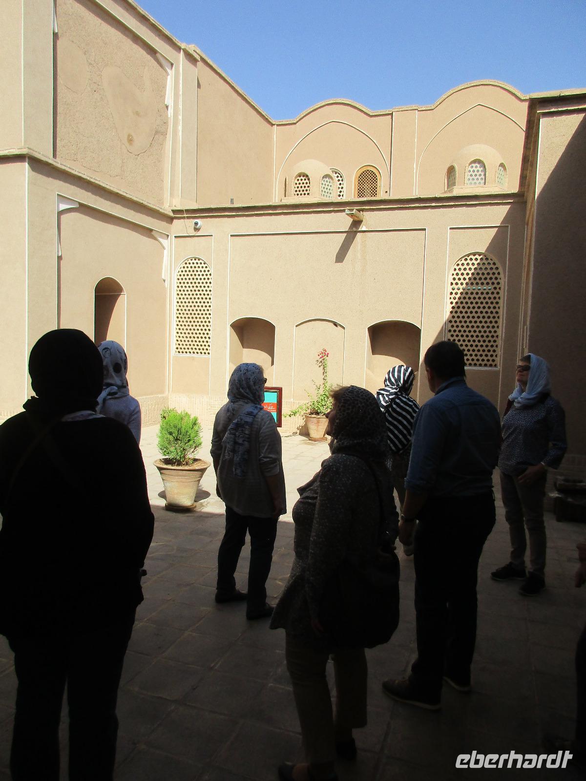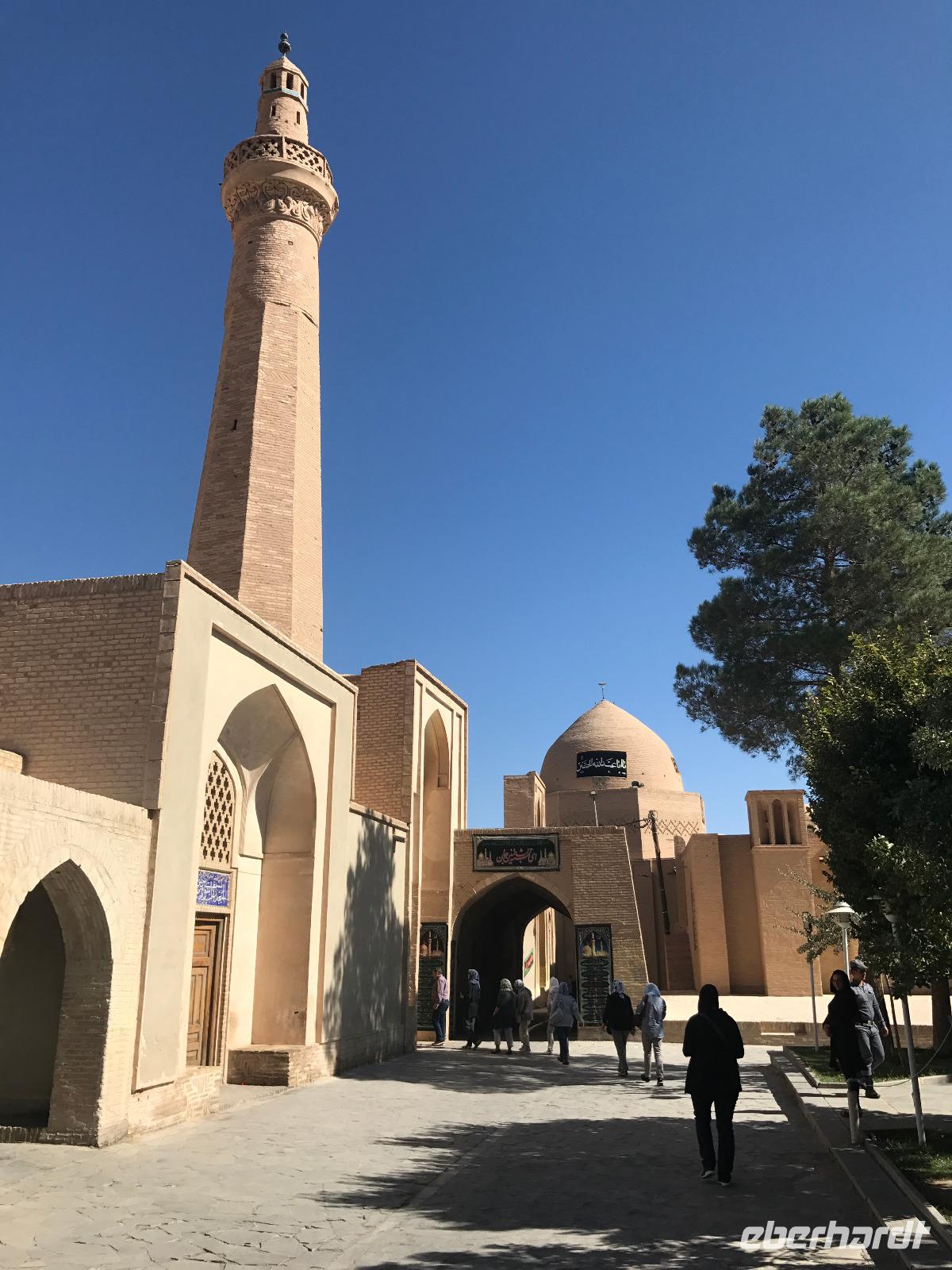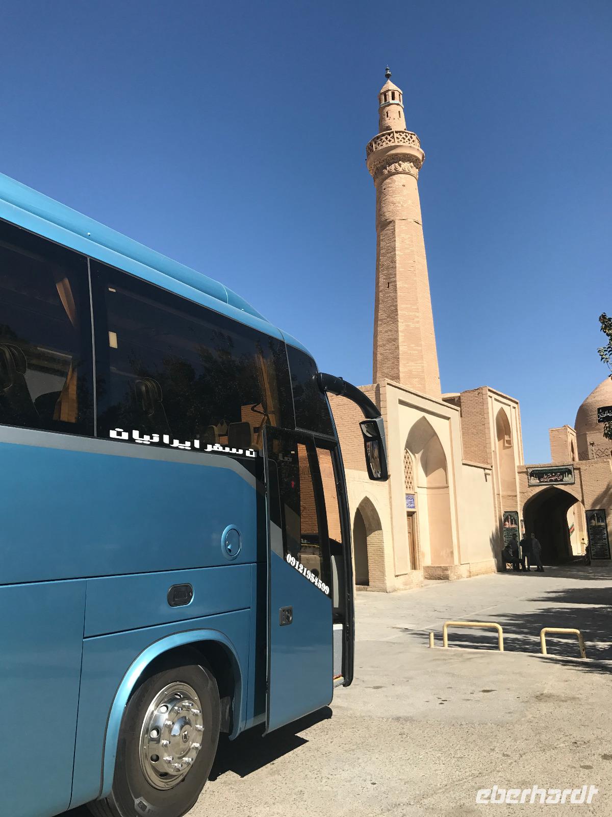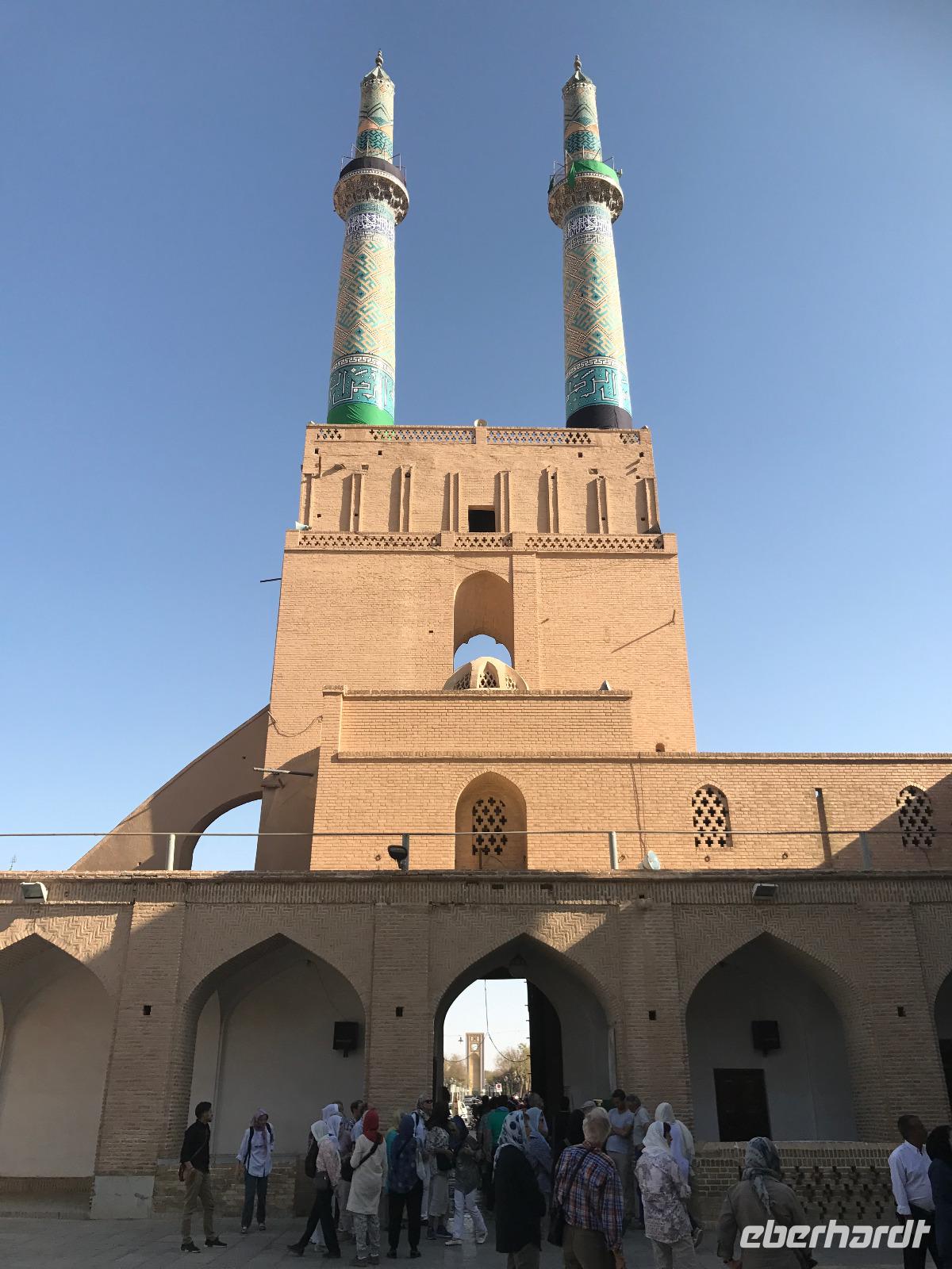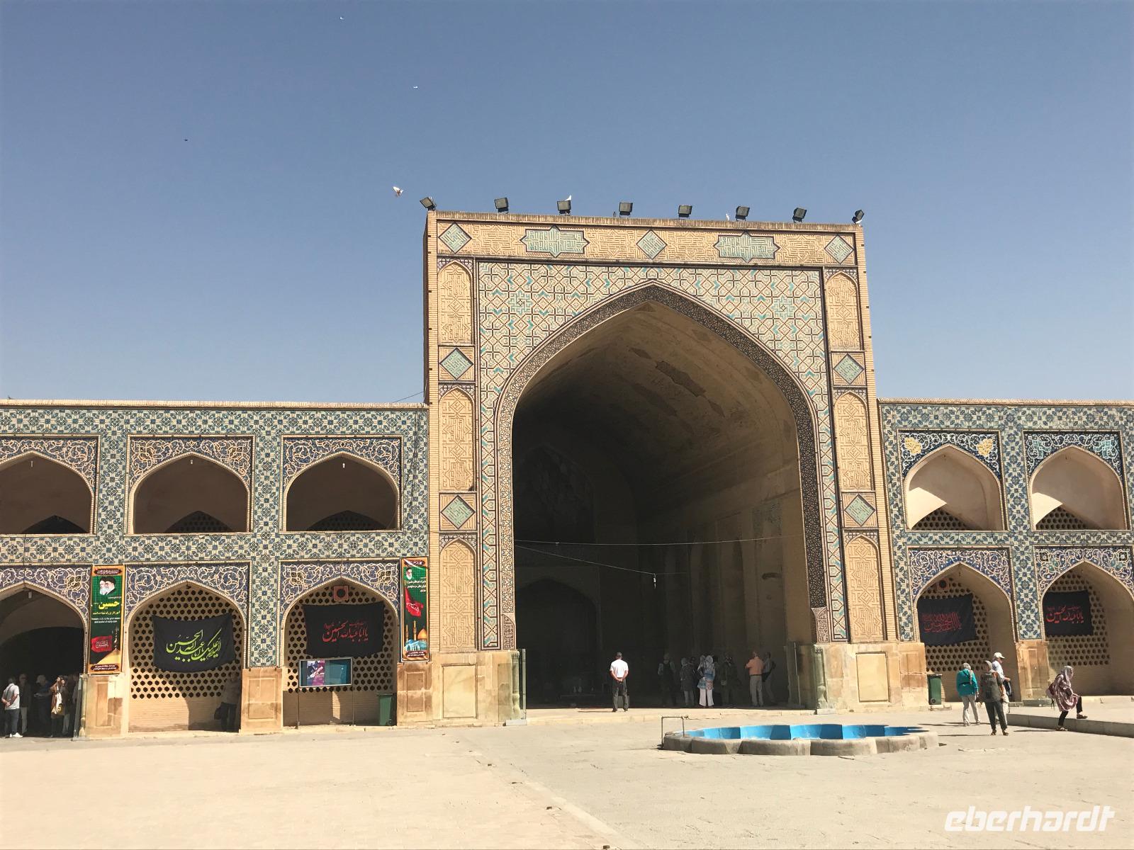 Heute ging es zeitig los, aber wie sagte Mohammad immer so schön „Wir müssen uns beeilen, aber wir gehen langsam". Das Frühstück war wieder sehr lecker und nachdem alle Zimmer kontrolliert wurden, erhielten wir vor der Abreise auch unsere Pässe zurück. Die Fahrt führte uns durch die trockenen Hochebenen nach Nain - die alte Teppichstadt ist wunderbar idyllisch und die bereits im 10. Jahrhundert gebaute Jame Moschee bezauberte uns mit ihren Details. Typisch für die Gegend sind Kühlhäuser mit Windfängen und natürlich Zisternen - auf dem Weg zur ehemaligen Stadtbefestigung erhalten wir davon einen Eindruck. Die Lehmziegel-Burganlage Narin Qaleh ist noch in ihren Grundrissen gut erkennbar - und das obwohl sie schon 800 Jahre alt ist. Zurück am Bus überraschten uns die beiden Mohammads mit einem Picknick - es gab Tee oder Kaffee, allerlei typische Süßigkeiten wie Gaz aus Isfahan und Obst. Bevor wir abfuhren, sahen wir noch iranische Jungen, die eingewiesen von der Polizei auf ihren Mopeds oder Fahrrädern wahrscheinlich eine Art Verkehrserziehung bekamen. Auf der Weiterfahrt nach Yazd sahen wir neben Stahlwerken und Keramikfabriken auch die Hügelketten, unter denen man die Qanate findet - unterirdische Wasserkanäle, die das Wasser aus den Bergen durch das natürliche Gefälle bis in die Orte befördert und somit das Leben in dieser wasserarmen Landschaft ermöglicht. Unterwegs erzählte uns Mohammad allerlei Legenden und Geschichten und stimmte uns auf die Gemeinde der Zarathustrier ein. Mit 3500 findet man eine der größten Gemeinden dieser Religion in Yazd. Zuerst besuchten wir in Yazd aber den Chaqmaq Platz - dort finden zum Ashura, dem schiitischen Trauerfest, Passionsspiele statt - dabei wird mit einem sogenannten Nakhl-Holzgerüst der Schrein Imam Hoseyns nachgestellt. Wir stiegen am Uhrturm aus und legten einen kleinen Spaziergang zur Jame Moschee ein - diese beeindruckt schon von Weitem mit dem riesigen detaillierten im 14. Jahrhundert fertig gestellten Eingangstor. Die zwei Minarette sind aus dem 16. Jahrhundert. Die Besichtigung erfolgte diesmal barfuß - man muss in der Moschee die Schuhe ausziehen. In dieser Moschee herrscht eine lockerere Atmosphäre als in den bisher besichtigten - aber sie ist auch wieder auf ihre Art besonders. Weiter führte die Fahrt zum Feuertempel - dem Heiligtum der Zarathustrier. Das ewige Feuer konnte man durch eine Scheibe sehen (erahnen ;-)), die anderen Räume waren schon geschlossen, da am Donnerstag Nachmittag schon Wochenende ist. Der letzte Programmpunkt heute sollten die Türme des Schweigens sein - dort bestatteten die Zarathustrier ihre Toten. Seit Ende der 1960er Jahre werden die Türme nicht mehr für die Riten verwendet. Von einem der Türme hatten wir einen wunderbaren Blick auf das Gelände und Yazd, unser heutiger Übernachtungsort. Das Abendessen im Hotel, als Buffet serviert, ließ kaum Wünsche offen. Um das Hotel herrschte reges Treiben an diesem Abend, aber letztendlich fanden doch alle zur Ruhe.