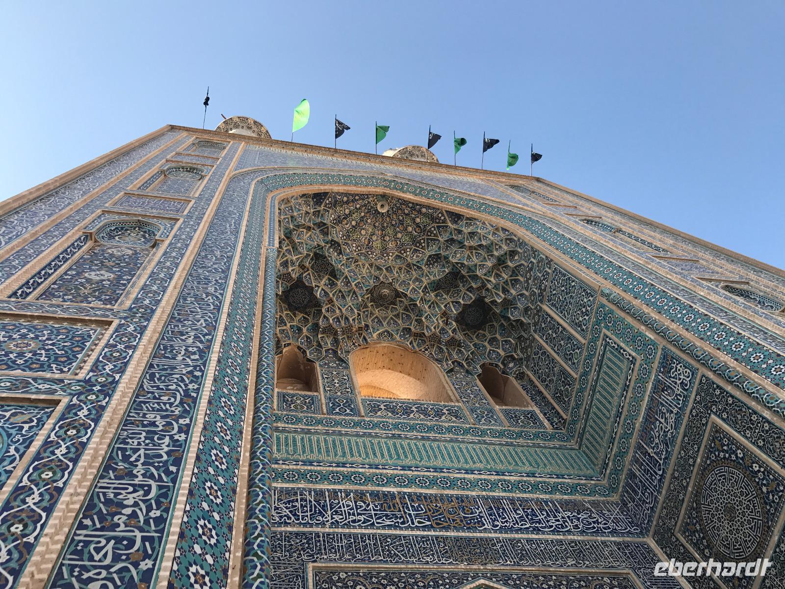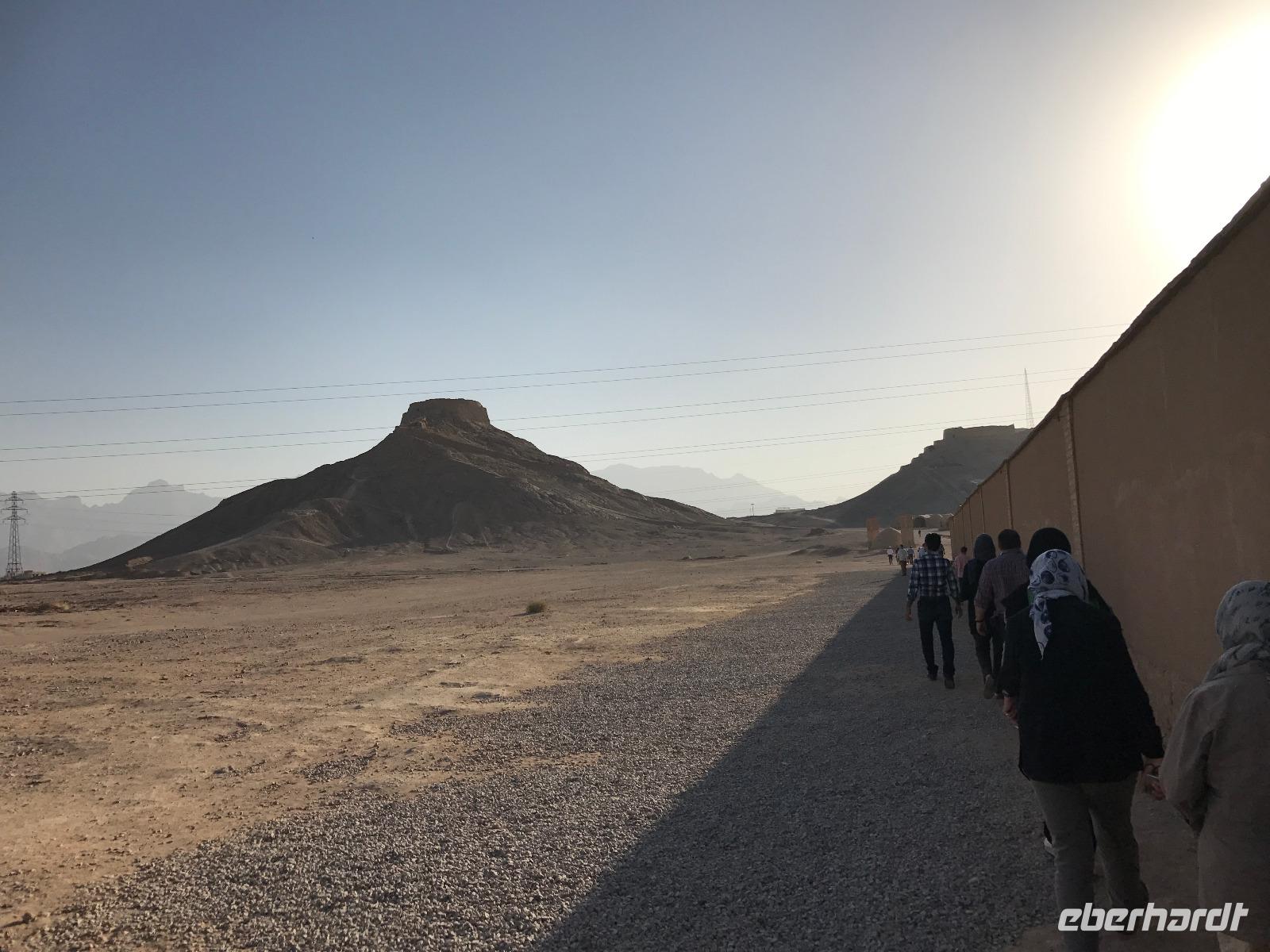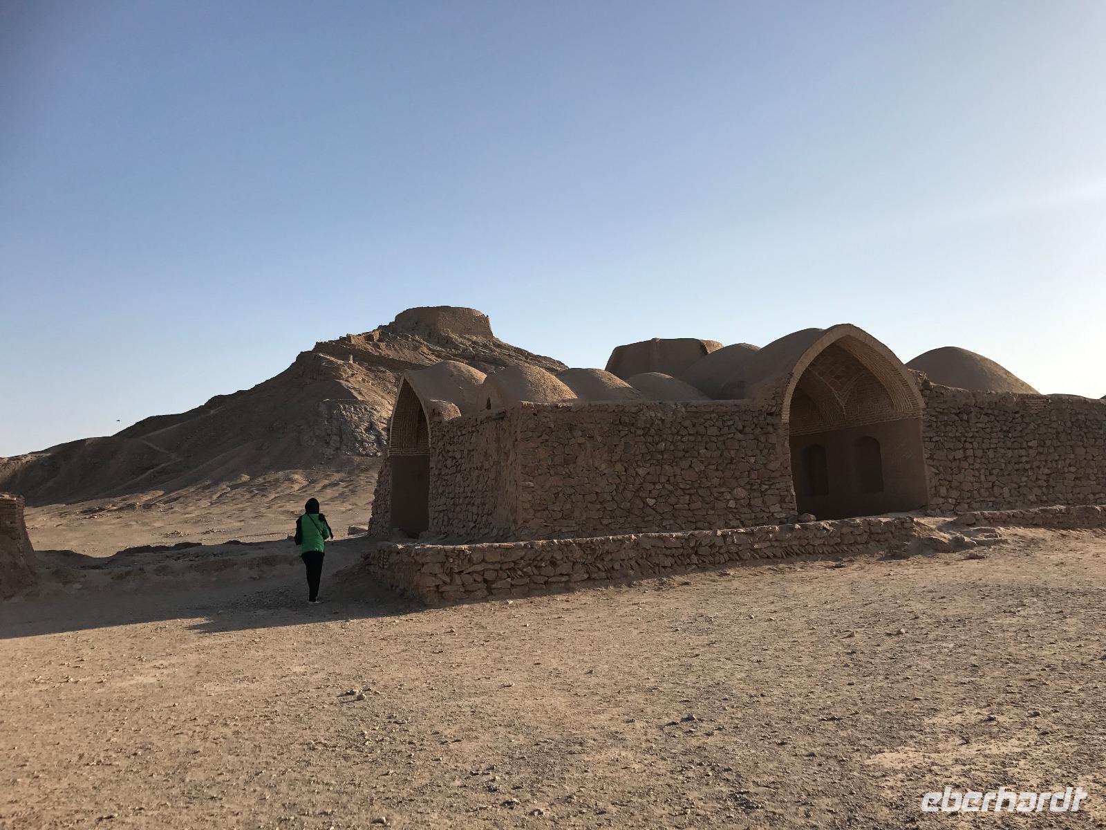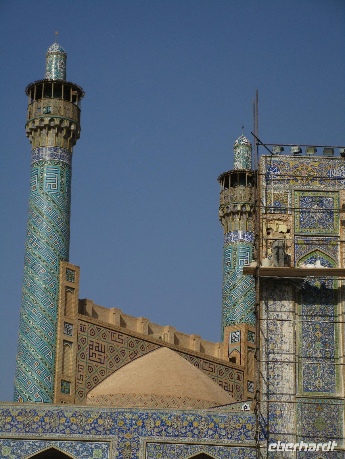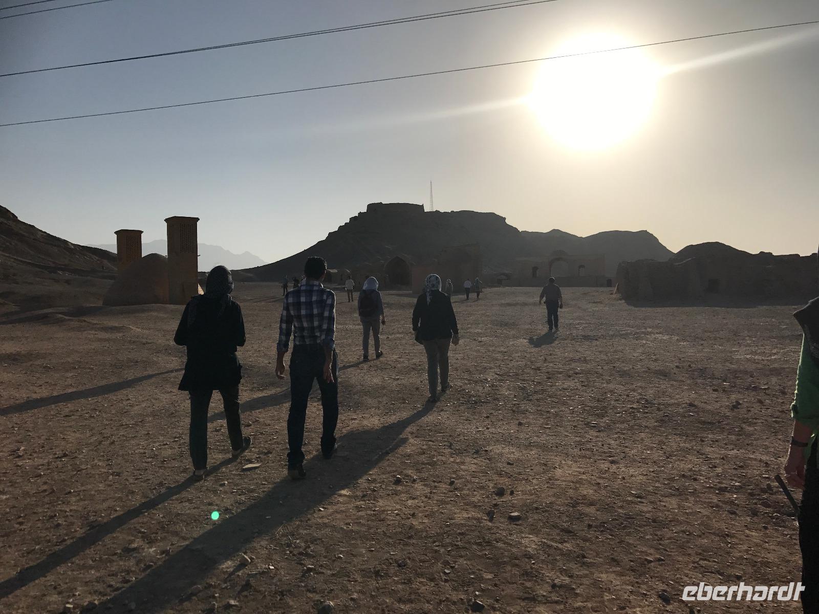 Heute ging es zeitig los, aber wie sagte Mohammad immer so schön „Wir müssen uns beeilen, aber wir gehen langsam". Das Frühstück war wieder sehr lecker und nachdem alle Zimmer kontrolliert wurden, erhielten wir vor der Abreise auch unsere Pässe zurück. Die Fahrt führte uns durch die trockenen Hochebenen nach Nain - die alte Teppichstadt ist wunderbar idyllisch und die bereits im 10. Jahrhundert gebaute Jame Moschee bezauberte uns mit ihren Details. Typisch für die Gegend sind Kühlhäuser mit Windfängen und natürlich Zisternen - auf dem Weg zur ehemaligen Stadtbefestigung erhalten wir davon einen Eindruck. Die Lehmziegel-Burganlage Narin Qaleh ist noch in ihren Grundrissen gut erkennbar - und das obwohl sie schon 800 Jahre alt ist. Zurück am Bus überraschten uns die beiden Mohammads mit einem Picknick - es gab Tee oder Kaffee, allerlei typische Süßigkeiten wie Gaz aus Isfahan und Obst. Bevor wir abfuhren, sahen wir noch iranische Jungen, die eingewiesen von der Polizei auf ihren Mopeds oder Fahrrädern wahrscheinlich eine Art Verkehrserziehung bekamen. Auf der Weiterfahrt nach Yazd sahen wir neben Stahlwerken und Keramikfabriken auch die Hügelketten, unter denen man die Qanate findet - unterirdische Wasserkanäle, die das Wasser aus den Bergen durch das natürliche Gefälle bis in die Orte befördert und somit das Leben in dieser wasserarmen Landschaft ermöglicht. Unterwegs erzählte uns Mohammad allerlei Legenden und Geschichten und stimmte uns auf die Gemeinde der Zarathustrier ein. Mit 3500 findet man eine der größten Gemeinden dieser Religion in Yazd. Zuerst besuchten wir in Yazd aber den Chaqmaq Platz - dort finden zum Ashura, dem schiitischen Trauerfest, Passionsspiele statt - dabei wird mit einem sogenannten Nakhl-Holzgerüst der Schrein Imam Hoseyns nachgestellt. Wir stiegen am Uhrturm aus und legten einen kleinen Spaziergang zur Jame Moschee ein - diese beeindruckt schon von Weitem mit dem riesigen detaillierten im 14. Jahrhundert fertig gestellten Eingangstor. Die zwei Minarette sind aus dem 16. Jahrhundert. Die Besichtigung erfolgte diesmal barfuß - man muss in der Moschee die Schuhe ausziehen. In dieser Moschee herrscht eine lockerere Atmosphäre als in den bisher besichtigten - aber sie ist auch wieder auf ihre Art besonders. Weiter führte die Fahrt zum Feuertempel - dem Heiligtum der Zarathustrier. Das ewige Feuer konnte man durch eine Scheibe sehen (erahnen ;-)), die anderen Räume waren schon geschlossen, da am Donnerstag Nachmittag schon Wochenende ist. Der letzte Programmpunkt heute sollten die Türme des Schweigens sein - dort bestatteten die Zarathustrier ihre Toten. Seit Ende der 1960er Jahre werden die Türme nicht mehr für die Riten verwendet. Von einem der Türme hatten wir einen wunderbaren Blick auf das Gelände und Yazd, unser heutiger Übernachtungsort. Das Abendessen im Hotel, als Buffet serviert, ließ kaum Wünsche offen. Um das Hotel herrschte reges Treiben an diesem Abend, aber letztendlich fanden doch alle zur Ruhe.