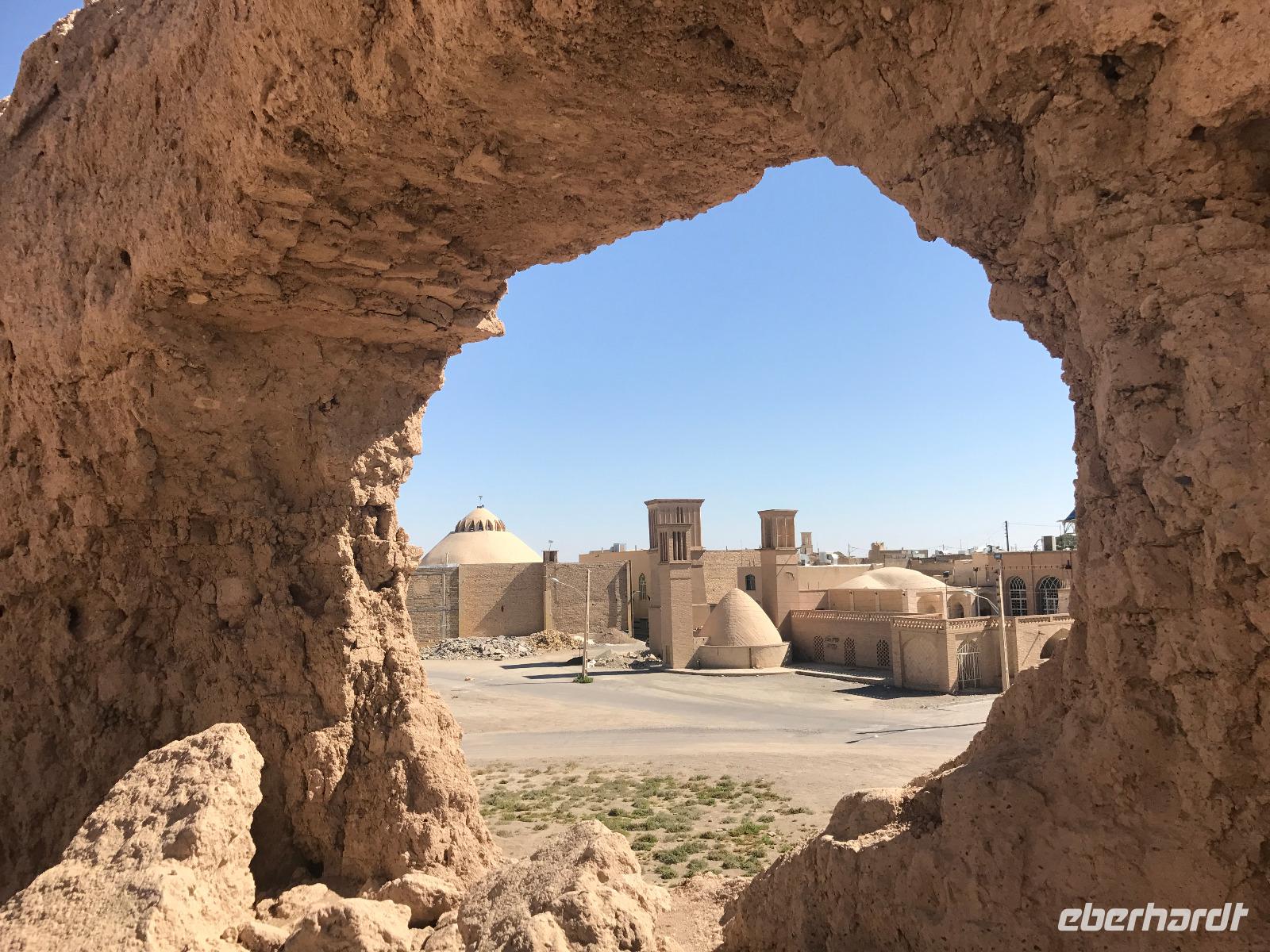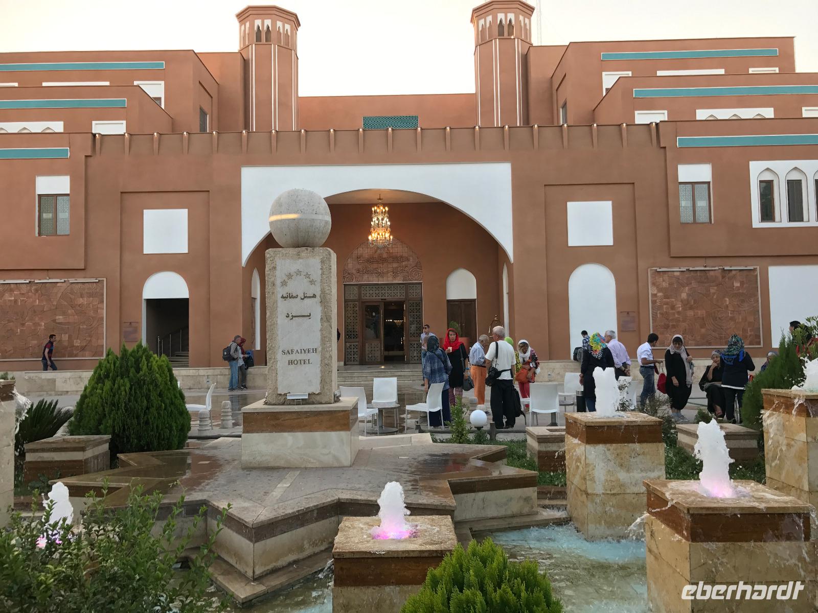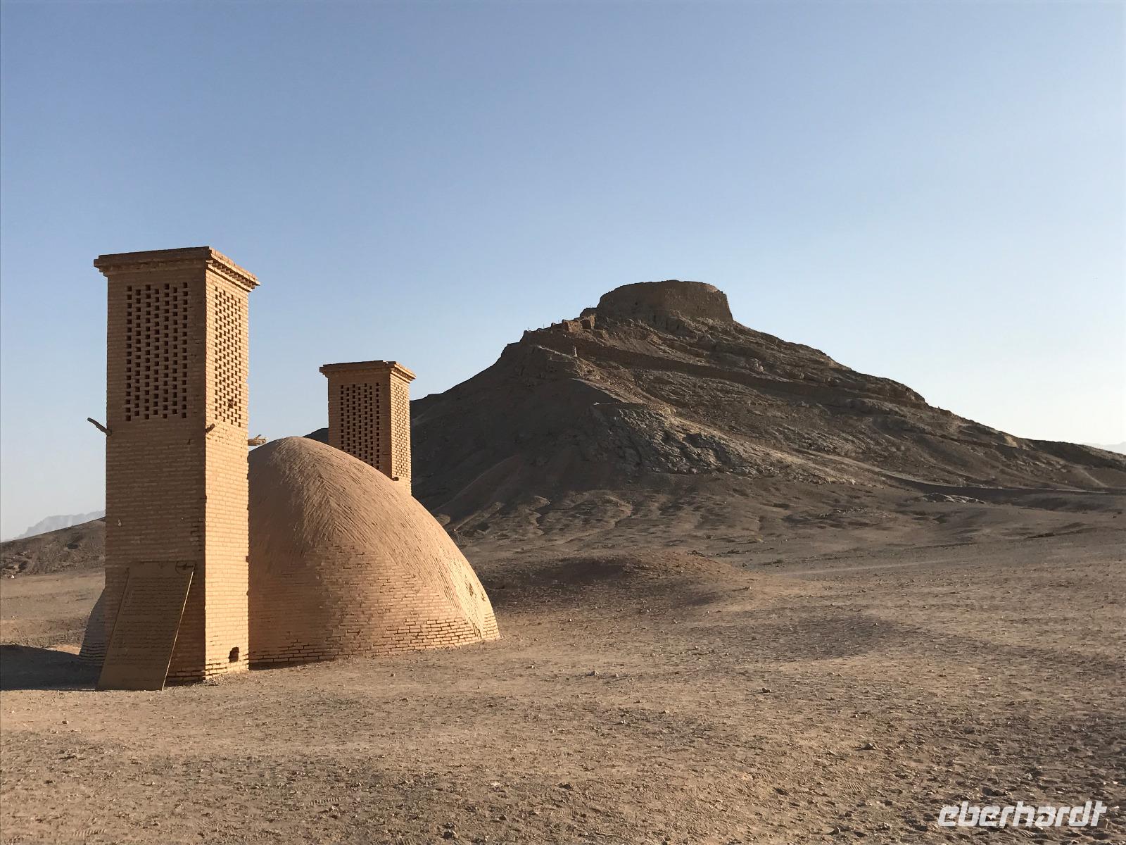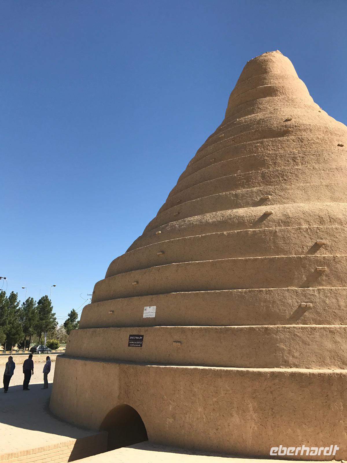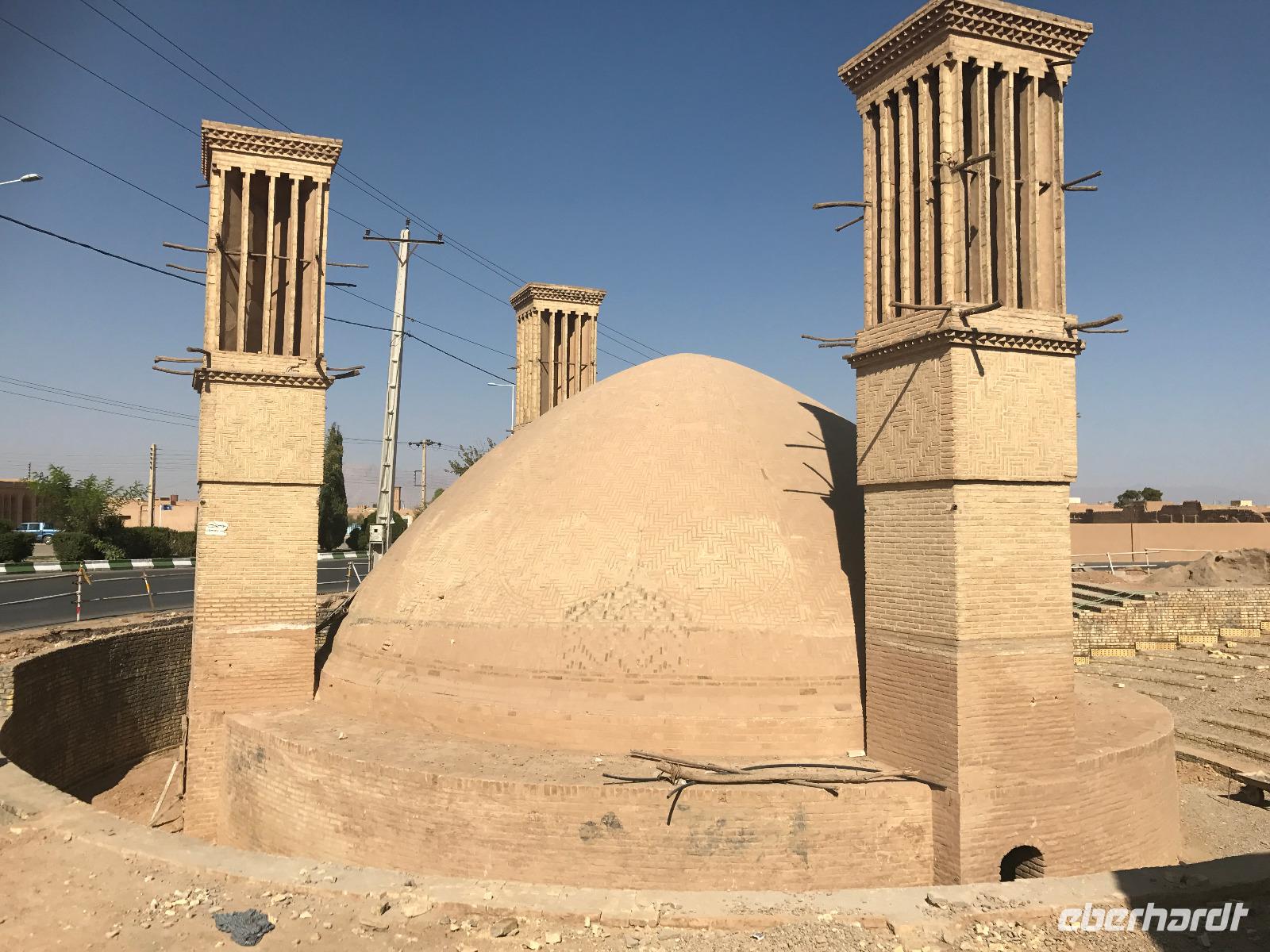 Heute ging es zeitig los, aber wie sagte Mohammad immer so schön „Wir müssen uns beeilen, aber wir gehen langsam". Das Frühstück war wieder sehr lecker und nachdem alle Zimmer kontrolliert wurden, erhielten wir vor der Abreise auch unsere Pässe zurück. Die Fahrt führte uns durch die trockenen Hochebenen nach Nain - die alte Teppichstadt ist wunderbar idyllisch und die bereits im 10. Jahrhundert gebaute Jame Moschee bezauberte uns mit ihren Details. Typisch für die Gegend sind Kühlhäuser mit Windfängen und natürlich Zisternen - auf dem Weg zur ehemaligen Stadtbefestigung erhalten wir davon einen Eindruck. Die Lehmziegel-Burganlage Narin Qaleh ist noch in ihren Grundrissen gut erkennbar - und das obwohl sie schon 800 Jahre alt ist. Zurück am Bus überraschten uns die beiden Mohammads mit einem Picknick - es gab Tee oder Kaffee, allerlei typische Süßigkeiten wie Gaz aus Isfahan und Obst. Bevor wir abfuhren, sahen wir noch iranische Jungen, die eingewiesen von der Polizei auf ihren Mopeds oder Fahrrädern wahrscheinlich eine Art Verkehrserziehung bekamen. Auf der Weiterfahrt nach Yazd sahen wir neben Stahlwerken und Keramikfabriken auch die Hügelketten, unter denen man die Qanate findet - unterirdische Wasserkanäle, die das Wasser aus den Bergen durch das natürliche Gefälle bis in die Orte befördert und somit das Leben in dieser wasserarmen Landschaft ermöglicht. Unterwegs erzählte uns Mohammad allerlei Legenden und Geschichten und stimmte uns auf die Gemeinde der Zarathustrier ein. Mit 3500 findet man eine der größten Gemeinden dieser Religion in Yazd. Zuerst besuchten wir in Yazd aber den Chaqmaq Platz - dort finden zum Ashura, dem schiitischen Trauerfest, Passionsspiele statt - dabei wird mit einem sogenannten Nakhl-Holzgerüst der Schrein Imam Hoseyns nachgestellt. Wir stiegen am Uhrturm aus und legten einen kleinen Spaziergang zur Jame Moschee ein - diese beeindruckt schon von Weitem mit dem riesigen detaillierten im 14. Jahrhundert fertig gestellten Eingangstor. Die zwei Minarette sind aus dem 16. Jahrhundert. Die Besichtigung erfolgte diesmal barfuß - man muss in der Moschee die Schuhe ausziehen. In dieser Moschee herrscht eine lockerere Atmosphäre als in den bisher besichtigten - aber sie ist auch wieder auf ihre Art besonders. Weiter führte die Fahrt zum Feuertempel - dem Heiligtum der Zarathustrier. Das ewige Feuer konnte man durch eine Scheibe sehen (erahnen ;-)), die anderen Räume waren schon geschlossen, da am Donnerstag Nachmittag schon Wochenende ist. Der letzte Programmpunkt heute sollten die Türme des Schweigens sein - dort bestatteten die Zarathustrier ihre Toten. Seit Ende der 1960er Jahre werden die Türme nicht mehr für die Riten verwendet. Von einem der Türme hatten wir einen wunderbaren Blick auf das Gelände und Yazd, unser heutiger Übernachtungsort. Das Abendessen im Hotel, als Buffet serviert, ließ kaum Wünsche offen. Um das Hotel herrschte reges Treiben an diesem Abend, aber letztendlich fanden doch alle zur Ruhe.
