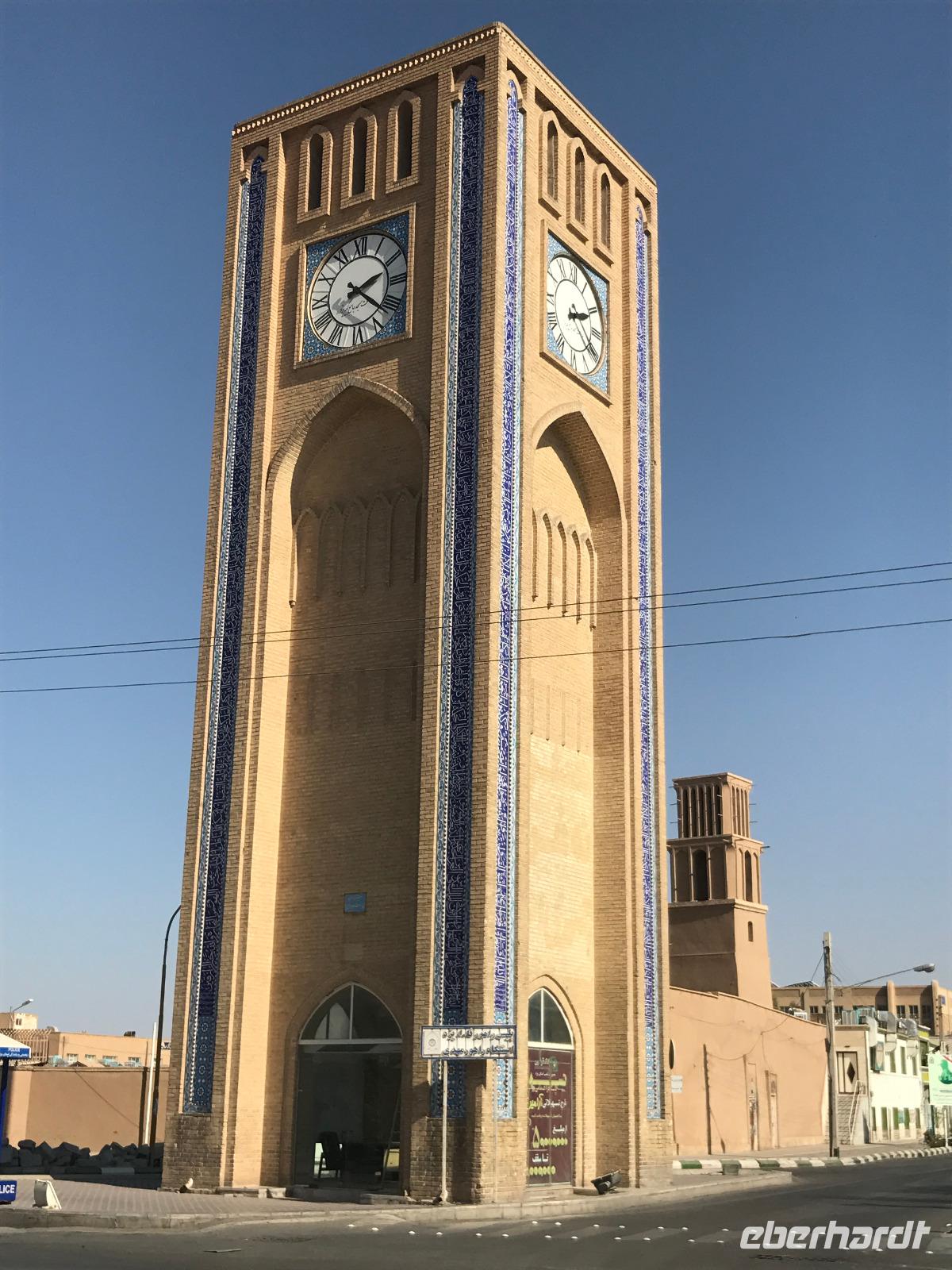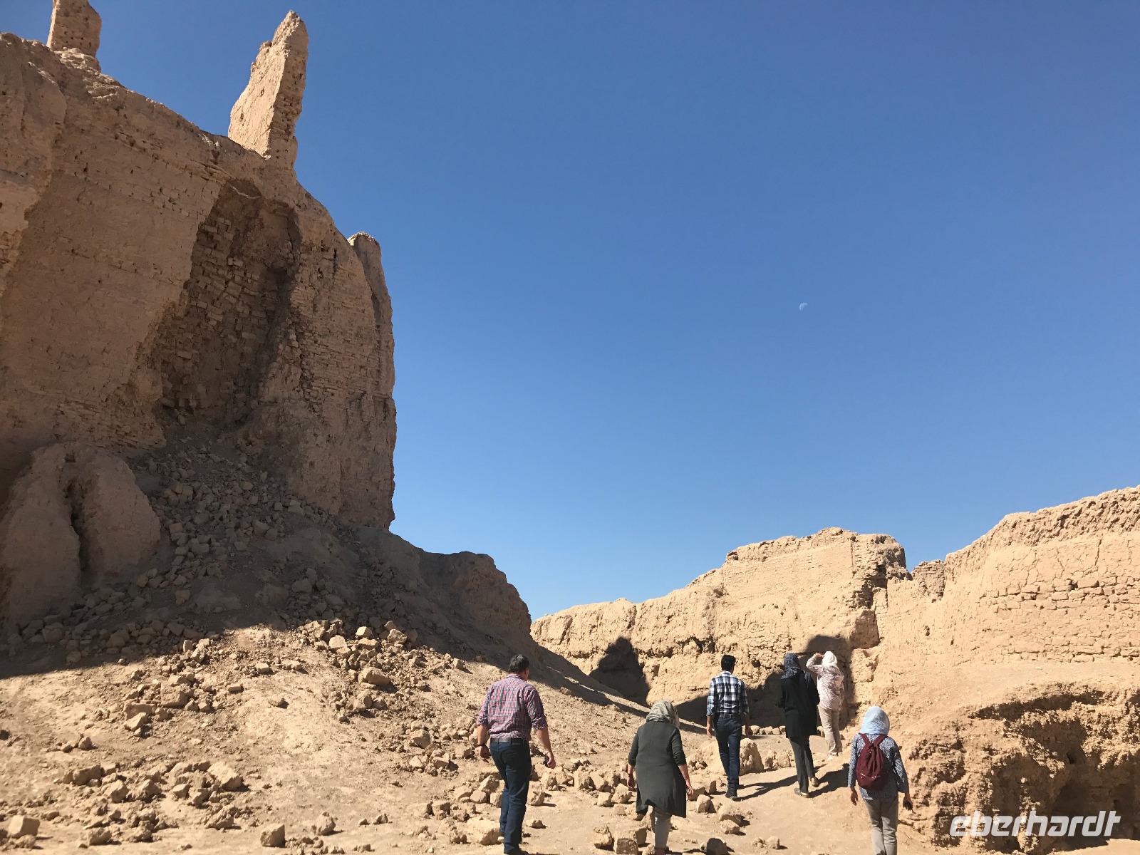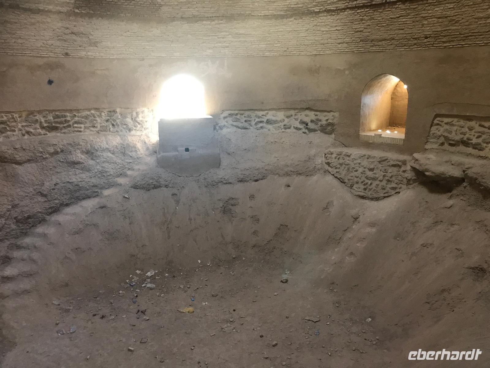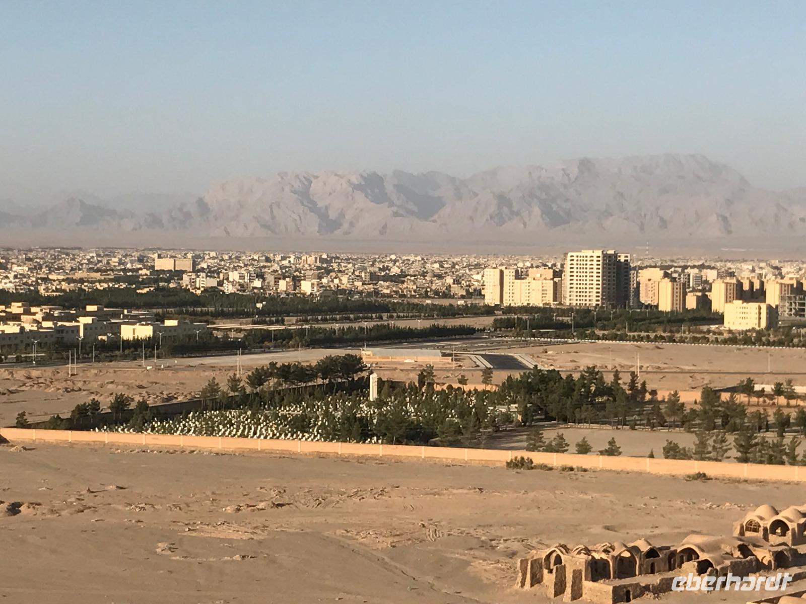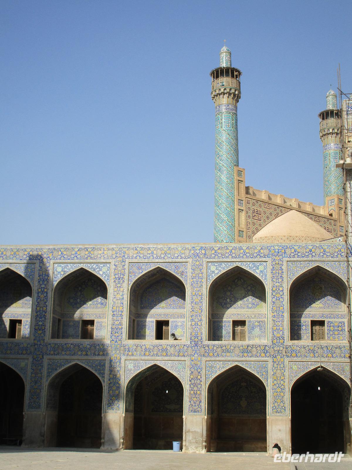 Heute ging es zeitig los, aber wie sagte Mohammad immer so schön „Wir müssen uns beeilen, aber wir gehen langsam". Das Frühstück war wieder sehr lecker und nachdem alle Zimmer kontrolliert wurden, erhielten wir vor der Abreise auch unsere Pässe zurück. Die Fahrt führte uns durch die trockenen Hochebenen nach Nain - die alte Teppichstadt ist wunderbar idyllisch und die bereits im 10. Jahrhundert gebaute Jame Moschee bezauberte uns mit ihren Details. Typisch für die Gegend sind Kühlhäuser mit Windfängen und natürlich Zisternen - auf dem Weg zur ehemaligen Stadtbefestigung erhalten wir davon einen Eindruck. Die Lehmziegel-Burganlage Narin Qaleh ist noch in ihren Grundrissen gut erkennbar - und das obwohl sie schon 800 Jahre alt ist. Zurück am Bus überraschten uns die beiden Mohammads mit einem Picknick - es gab Tee oder Kaffee, allerlei typische Süßigkeiten wie Gaz aus Isfahan und Obst. Bevor wir abfuhren, sahen wir noch iranische Jungen, die eingewiesen von der Polizei auf ihren Mopeds oder Fahrrädern wahrscheinlich eine Art Verkehrserziehung bekamen. Auf der Weiterfahrt nach Yazd sahen wir neben Stahlwerken und Keramikfabriken auch die Hügelketten, unter denen man die Qanate findet - unterirdische Wasserkanäle, die das Wasser aus den Bergen durch das natürliche Gefälle bis in die Orte befördert und somit das Leben in dieser wasserarmen Landschaft ermöglicht. Unterwegs erzählte uns Mohammad allerlei Legenden und Geschichten und stimmte uns auf die Gemeinde der Zarathustrier ein. Mit 3500 findet man eine der größten Gemeinden dieser Religion in Yazd. Zuerst besuchten wir in Yazd aber den Chaqmaq Platz - dort finden zum Ashura, dem schiitischen Trauerfest, Passionsspiele statt - dabei wird mit einem sogenannten Nakhl-Holzgerüst der Schrein Imam Hoseyns nachgestellt. Wir stiegen am Uhrturm aus und legten einen kleinen Spaziergang zur Jame Moschee ein - diese beeindruckt schon von Weitem mit dem riesigen detaillierten im 14. Jahrhundert fertig gestellten Eingangstor. Die zwei Minarette sind aus dem 16. Jahrhundert. Die Besichtigung erfolgte diesmal barfuß - man muss in der Moschee die Schuhe ausziehen. In dieser Moschee herrscht eine lockerere Atmosphäre als in den bisher besichtigten - aber sie ist auch wieder auf ihre Art besonders. Weiter führte die Fahrt zum Feuertempel - dem Heiligtum der Zarathustrier. Das ewige Feuer konnte man durch eine Scheibe sehen (erahnen ;-)), die anderen Räume waren schon geschlossen, da am Donnerstag Nachmittag schon Wochenende ist. Der letzte Programmpunkt heute sollten die Türme des Schweigens sein - dort bestatteten die Zarathustrier ihre Toten. Seit Ende der 1960er Jahre werden die Türme nicht mehr für die Riten verwendet. Von einem der Türme hatten wir einen wunderbaren Blick auf das Gelände und Yazd, unser heutiger Übernachtungsort. Das Abendessen im Hotel, als Buffet serviert, ließ kaum Wünsche offen. Um das Hotel herrschte reges Treiben an diesem Abend, aber letztendlich fanden doch alle zur Ruhe.