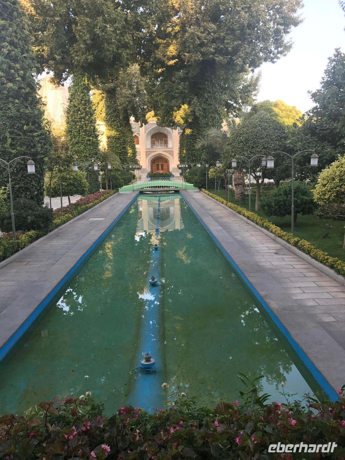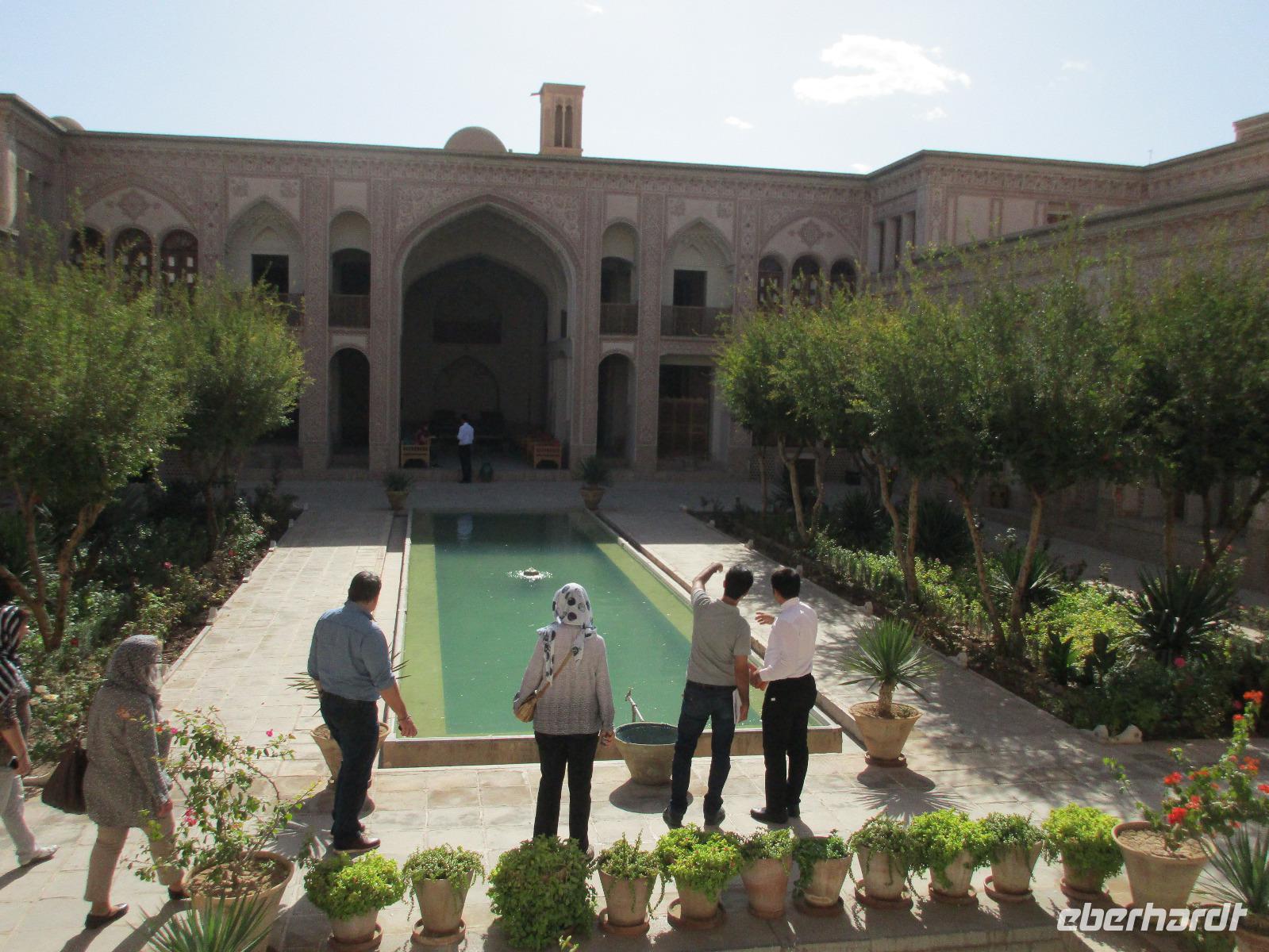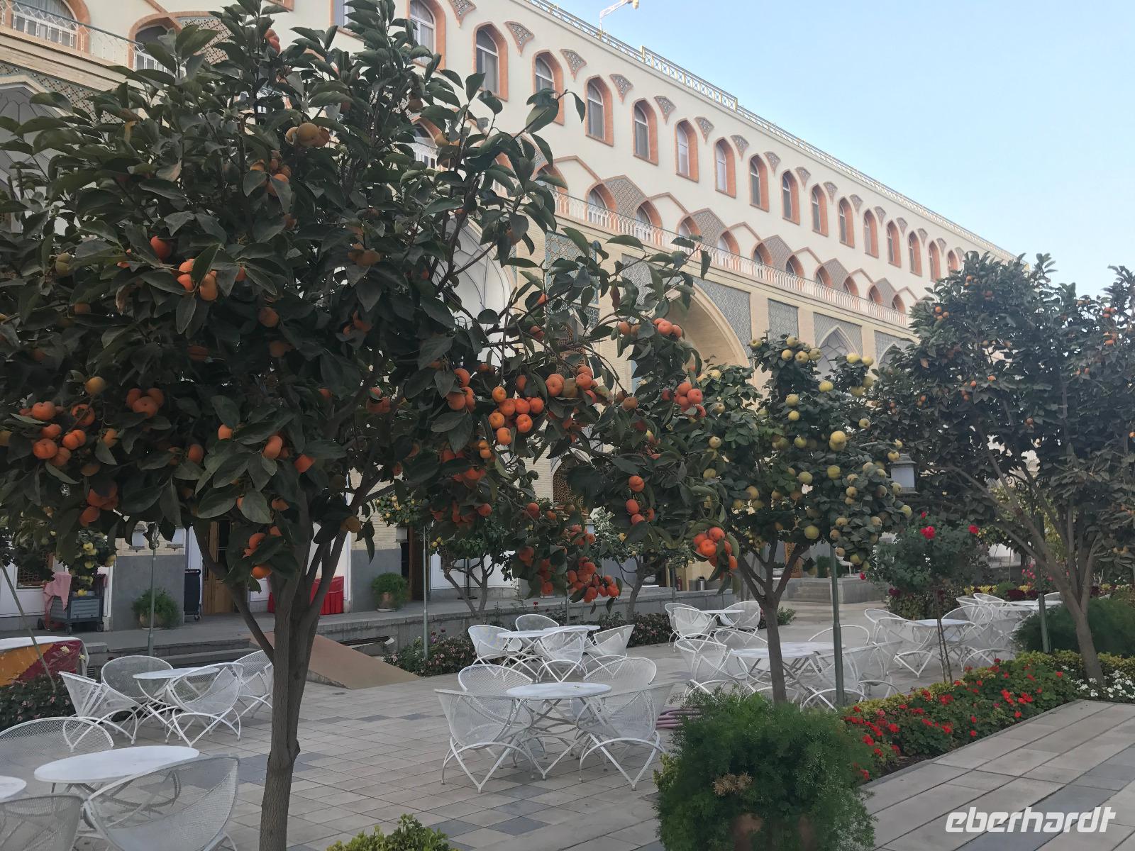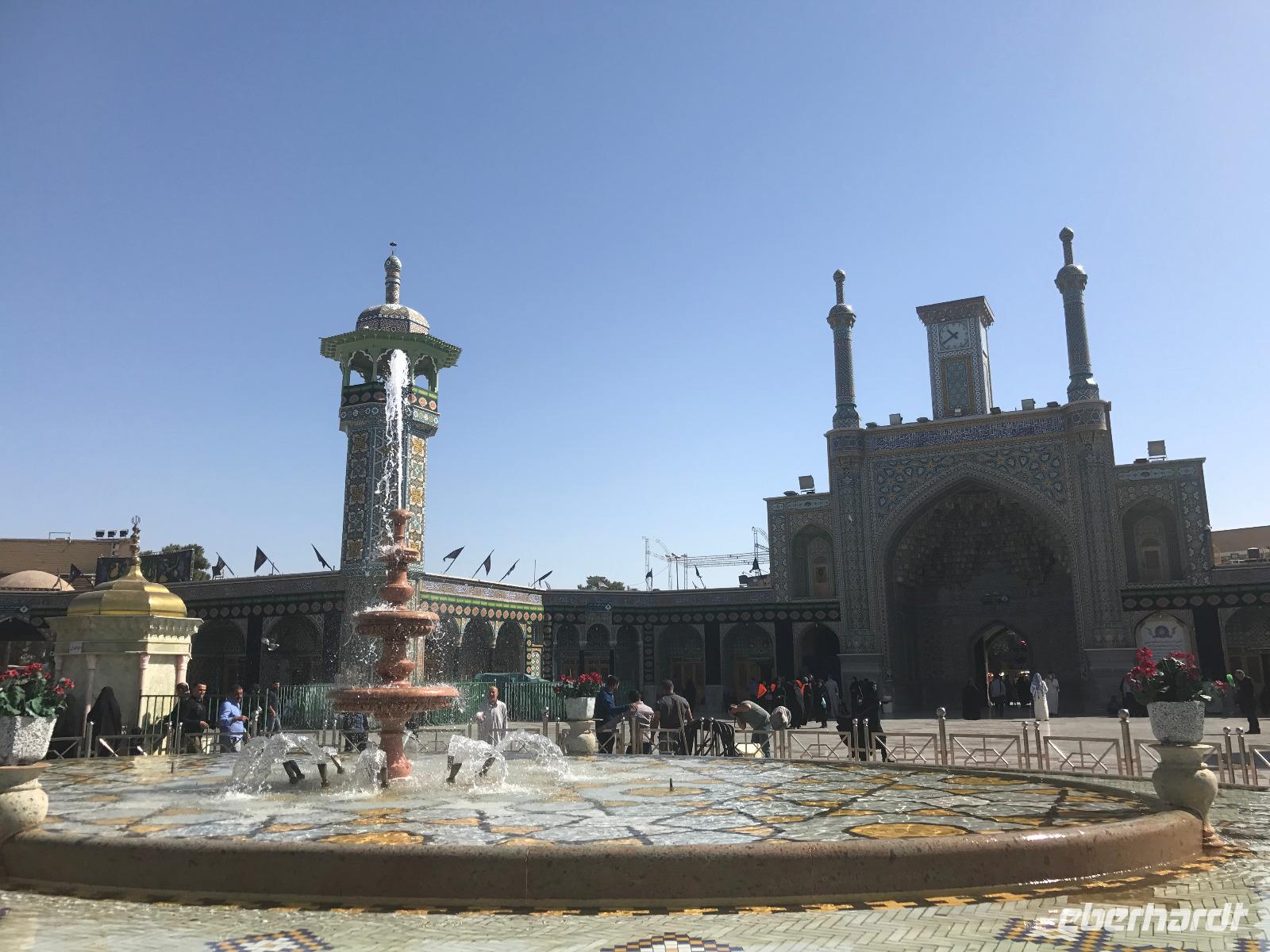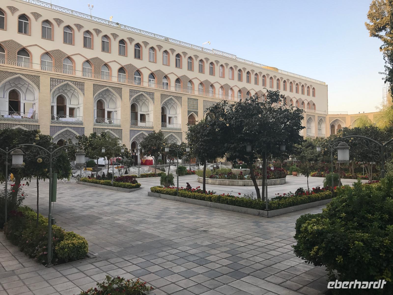 Ausgeschlafen starteten wir mit einem leckeren Frühstück im Bauch unseren heutigen Tag - hier fiel uns das erste Mal die Möhrenmarmelade auf, die uns die ganze Reise begleiten würde. Vorbei am Khomeini Mausoleum fuhren wir Richtung Qom. Das berühmte Heiligtum von Fatemeh Masumeh, gewidmet der Schwester des achten Imam Ali Rezas, erreichten wir nach 5 Minuten vom Parkplatz mit einem iranischen Linienbus, der allerdings nur für uns zur Grabmoschee fuhr. Das Grabmahl wurde dort errichtet, wo Fatemeh - Angehörige der Prophetenfamilie - mit nur 28 Jahren verstorben sein soll. Seitdem wird die Moschee ständig weiterentwickelt und erstrahlt in einer unglaublichen Pracht. Sowohl für Gläubige als auch Besucher ist der Eintritt frei. Wir hinterließen aber gern eine Spende. Vor dem Besuch mussten sich alle Frauen mit einem Chador, einem Umhang, der alles außer dem Gesicht verbirgt, verhüllen. Nach der Besichtigung erlebten wir einen Moment, der noch mehrfach auf dieser Reise folgen sollte, ein Reisegast wurde von einer Iranerin angesprochen und gefragt, woher sie komme und was sie im Iran mache. Die Gastfreundlichkeit ist mit Abstand die größte, die ich und sicher auch einige Reisegäste auf bisherigen Reisen erlebt haben. Zurück in unserem komfortablen Reisebus verkosteten wir typische Süßigkeiten mit Sesam, Nüssen, Honig und Safran - zum Beispiel Sohan. Die Fahrt ging weiter nach Kashan. Im berühmten Fin-Garten genossen wir die Atmosphäre, die ein wenig durch Baulärm „untermalt" wurde, aber natürlich müssen Instandhaltungsarbeiten in dem jahrhundertealten Anwesen durchgeführt werden. Weiter an erstaunlich vielen Neubauten und Bauten im Aufbau erreichten wir die Altstadt von Kashan. Dort verschafften wir uns im Sarayeameriha Hotel einen Eindruck der reichen Kaufmannshäuser. Nach einer Kaffeepause mit Kuchen und leckeren Getränken - mutige probierten ein geheimnisvolles traditionelles Getränk mit Chia Samen, Rosenblättern und anderen Zutaten - führte uns die Fahrt weiter nach Isfahan. Eine kurze Pause erfolgte an einer umgebauten Karawanserei. In Isfahan zeigte sich, wie auch schon in Teheran, dass es leider in der Infrastruktur noch einiges zu tun gibt, um die Lage in den Städten für die vielen Fahrzeuge zu verbessern. Wir hatten viel Stau - zum auch sonst üblichen Stau gibt es wohl dienstags Straßensperrungen, um die Anwohner vom Lärm und den Abgasen zu entlasten. Dennoch kämpfte sich unser Chauffeur Mohammad, ein wahrer Künstler auf den Straßen, bis zur sogenannten 33-er Brücke, Si-o-se Pol, durch und wir spazierten durch die Abendstimmung über die Brücke des ausgetrockneten Flusses Zayandehrud. Auch an der Khaju-Brücke legten wir einen Fotostopp ein, in dieser heißen Gegend spielt sich hier vor allem abends das Leben der Bewohner ab. Als wir unser Hotel erreichten, staunten wir nicht schlecht - wir wussten, dass wir das älteste Hotel der Welt, eine ehemalige Karawanserei, erleben, aber der Garten im Innenhof des Hotels glich einer Einladung in eine Welt aus 1.001 Nacht. Das Abendessen im Hotel-Restaurant war sehr reichhaltig und enthielt typische iranische Speisen wie Fleisch in einer Soße aus Walnüssen und Granatapfel und auch diverse Kebabs. Müde und zufrieden schliefen wir an dem Abend ein.