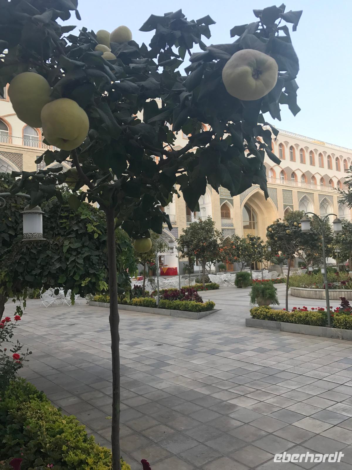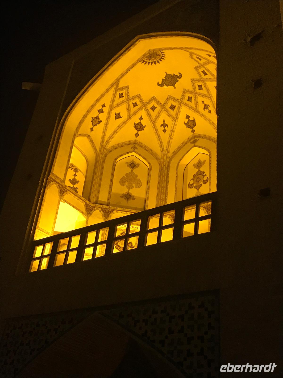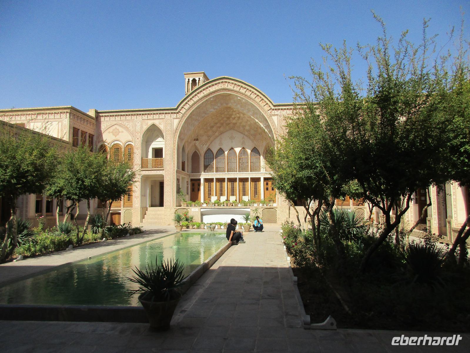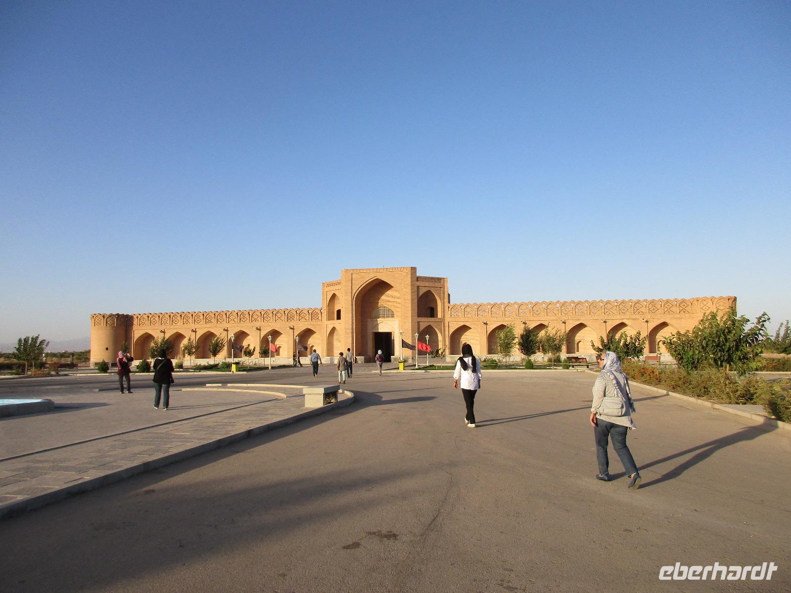 Ausgeschlafen starteten wir mit einem leckeren Frühstück im Bauch unseren heutigen Tag - hier fiel uns das erste Mal die Möhrenmarmelade auf, die uns die ganze Reise begleiten würde. Vorbei am Khomeini Mausoleum fuhren wir Richtung Qom. Das berühmte Heiligtum von Fatemeh Masumeh, gewidmet der Schwester des achten Imam Ali Rezas, erreichten wir nach 5 Minuten vom Parkplatz mit einem iranischen Linienbus, der allerdings nur für uns zur Grabmoschee fuhr. Das Grabmahl wurde dort errichtet, wo Fatemeh - Angehörige der Prophetenfamilie - mit nur 28 Jahren verstorben sein soll. Seitdem wird die Moschee ständig weiterentwickelt und erstrahlt in einer unglaublichen Pracht. Sowohl für Gläubige als auch Besucher ist der Eintritt frei. Wir hinterließen aber gern eine Spende. Vor dem Besuch mussten sich alle Frauen mit einem Chador, einem Umhang, der alles außer dem Gesicht verbirgt, verhüllen. Nach der Besichtigung erlebten wir einen Moment, der noch mehrfach auf dieser Reise folgen sollte, ein Reisegast wurde von einer Iranerin angesprochen und gefragt, woher sie komme und was sie im Iran mache. Die Gastfreundlichkeit ist mit Abstand die größte, die ich und sicher auch einige Reisegäste auf bisherigen Reisen erlebt haben. Zurück in unserem komfortablen Reisebus verkosteten wir typische Süßigkeiten mit Sesam, Nüssen, Honig und Safran - zum Beispiel Sohan. Die Fahrt ging weiter nach Kashan. Im berühmten Fin-Garten genossen wir die Atmosphäre, die ein wenig durch Baulärm „untermalt" wurde, aber natürlich müssen Instandhaltungsarbeiten in dem jahrhundertealten Anwesen durchgeführt werden. Weiter an erstaunlich vielen Neubauten und Bauten im Aufbau erreichten wir die Altstadt von Kashan. Dort verschafften wir uns im Sarayeameriha Hotel einen Eindruck der reichen Kaufmannshäuser. Nach einer Kaffeepause mit Kuchen und leckeren Getränken - mutige probierten ein geheimnisvolles traditionelles Getränk mit Chia Samen, Rosenblättern und anderen Zutaten - führte uns die Fahrt weiter nach Isfahan. Eine kurze Pause erfolgte an einer umgebauten Karawanserei. In Isfahan zeigte sich, wie auch schon in Teheran, dass es leider in der Infrastruktur noch einiges zu tun gibt, um die Lage in den Städten für die vielen Fahrzeuge zu verbessern. Wir hatten viel Stau - zum auch sonst üblichen Stau gibt es wohl dienstags Straßensperrungen, um die Anwohner vom Lärm und den Abgasen zu entlasten. Dennoch kämpfte sich unser Chauffeur Mohammad, ein wahrer Künstler auf den Straßen, bis zur sogenannten 33-er Brücke, Si-o-se Pol, durch und wir spazierten durch die Abendstimmung über die Brücke des ausgetrockneten Flusses Zayandehrud. Auch an der Khaju-Brücke legten wir einen Fotostopp ein, in dieser heißen Gegend spielt sich hier vor allem abends das Leben der Bewohner ab. Als wir unser Hotel erreichten, staunten wir nicht schlecht - wir wussten, dass wir das älteste Hotel der Welt, eine ehemalige Karawanserei, erleben, aber der Garten im Innenhof des Hotels glich einer Einladung in eine Welt aus 1.001 Nacht. Das Abendessen im Hotel-Restaurant war sehr reichhaltig und enthielt typische iranische Speisen wie Fleisch in einer Soße aus Walnüssen und Granatapfel und auch diverse Kebabs. Müde und zufrieden schliefen wir an dem Abend ein.
