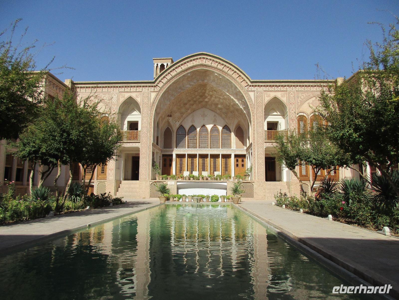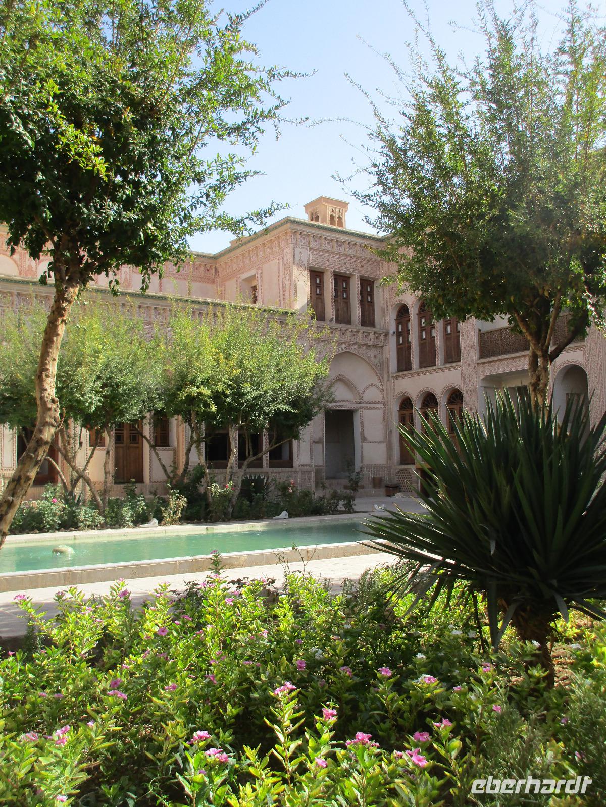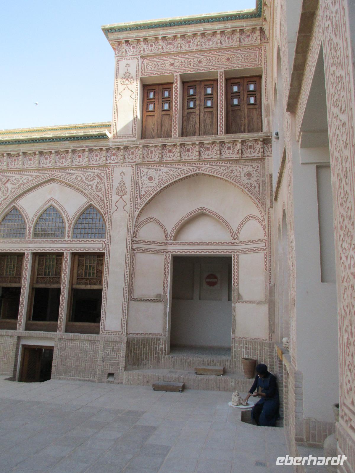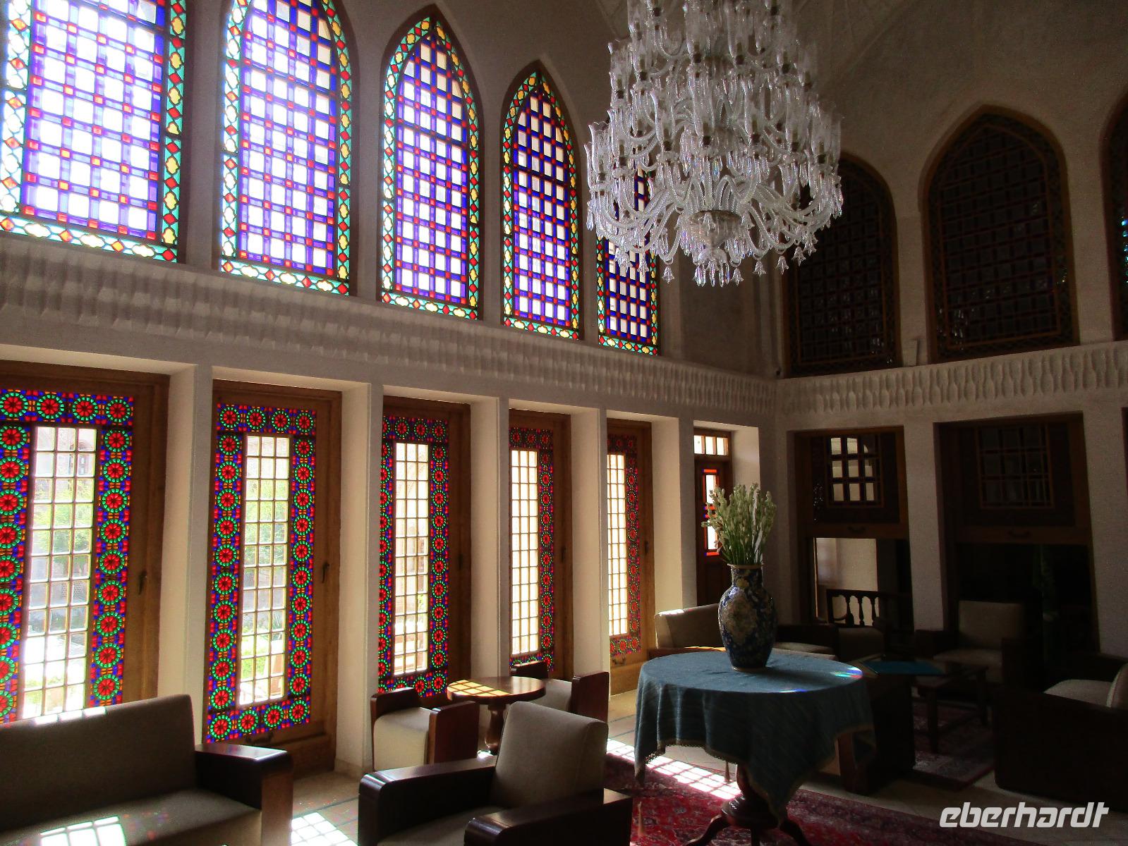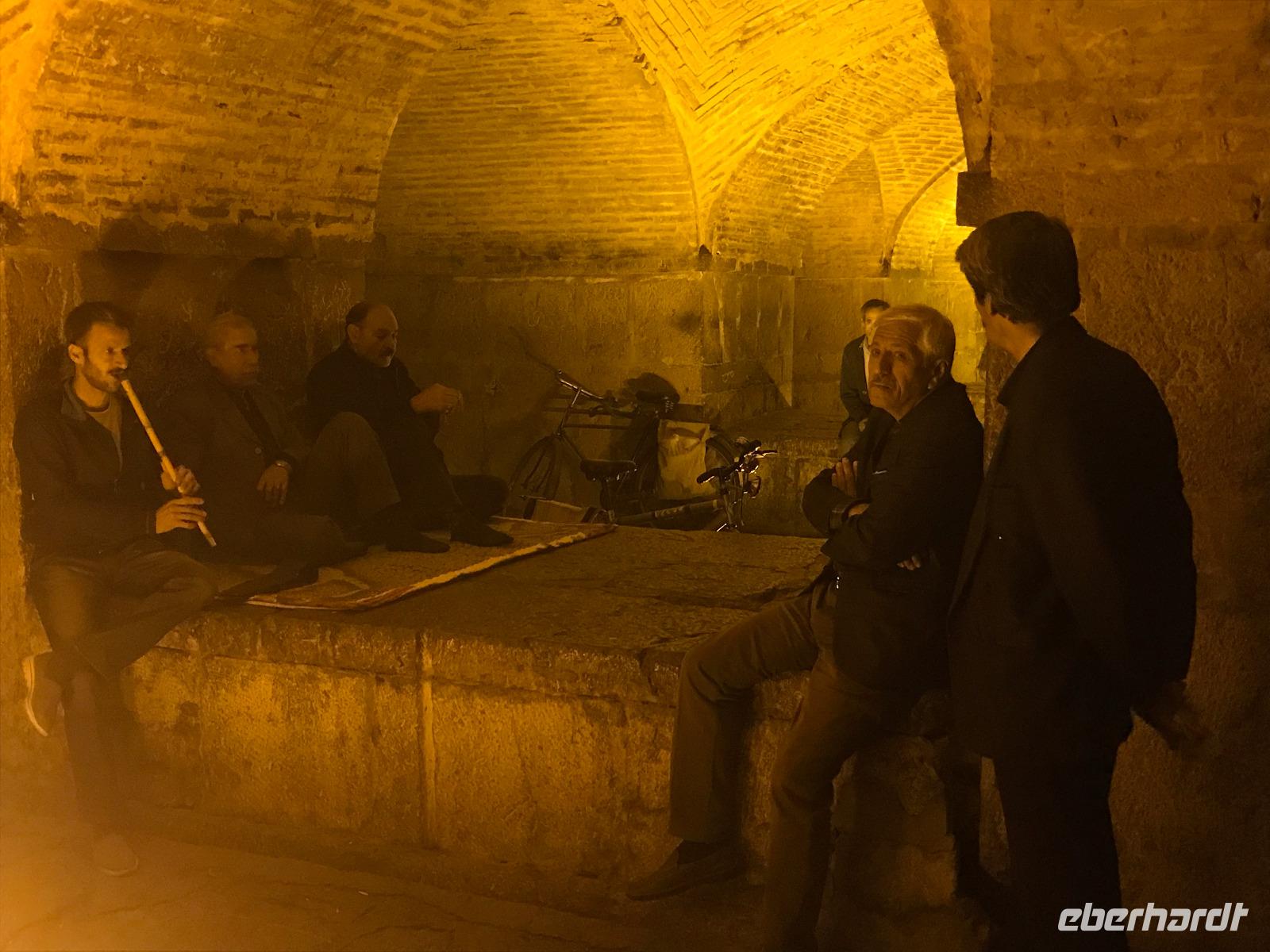 Ausgeschlafen starteten wir mit einem leckeren Frühstück im Bauch unseren heutigen Tag - hier fiel uns das erste Mal die Möhrenmarmelade auf, die uns die ganze Reise begleiten würde. Vorbei am Khomeini Mausoleum fuhren wir Richtung Qom. Das berühmte Heiligtum von Fatemeh Masumeh, gewidmet der Schwester des achten Imam Ali Rezas, erreichten wir nach 5 Minuten vom Parkplatz mit einem iranischen Linienbus, der allerdings nur für uns zur Grabmoschee fuhr. Das Grabmahl wurde dort errichtet, wo Fatemeh - Angehörige der Prophetenfamilie - mit nur 28 Jahren verstorben sein soll. Seitdem wird die Moschee ständig weiterentwickelt und erstrahlt in einer unglaublichen Pracht. Sowohl für Gläubige als auch Besucher ist der Eintritt frei. Wir hinterließen aber gern eine Spende. Vor dem Besuch mussten sich alle Frauen mit einem Chador, einem Umhang, der alles außer dem Gesicht verbirgt, verhüllen. Nach der Besichtigung erlebten wir einen Moment, der noch mehrfach auf dieser Reise folgen sollte, ein Reisegast wurde von einer Iranerin angesprochen und gefragt, woher sie komme und was sie im Iran mache. Die Gastfreundlichkeit ist mit Abstand die größte, die ich und sicher auch einige Reisegäste auf bisherigen Reisen erlebt haben. Zurück in unserem komfortablen Reisebus verkosteten wir typische Süßigkeiten mit Sesam, Nüssen, Honig und Safran - zum Beispiel Sohan. Die Fahrt ging weiter nach Kashan. Im berühmten Fin-Garten genossen wir die Atmosphäre, die ein wenig durch Baulärm „untermalt" wurde, aber natürlich müssen Instandhaltungsarbeiten in dem jahrhundertealten Anwesen durchgeführt werden. Weiter an erstaunlich vielen Neubauten und Bauten im Aufbau erreichten wir die Altstadt von Kashan. Dort verschafften wir uns im Sarayeameriha Hotel einen Eindruck der reichen Kaufmannshäuser. Nach einer Kaffeepause mit Kuchen und leckeren Getränken - mutige probierten ein geheimnisvolles traditionelles Getränk mit Chia Samen, Rosenblättern und anderen Zutaten - führte uns die Fahrt weiter nach Isfahan. Eine kurze Pause erfolgte an einer umgebauten Karawanserei. In Isfahan zeigte sich, wie auch schon in Teheran, dass es leider in der Infrastruktur noch einiges zu tun gibt, um die Lage in den Städten für die vielen Fahrzeuge zu verbessern. Wir hatten viel Stau - zum auch sonst üblichen Stau gibt es wohl dienstags Straßensperrungen, um die Anwohner vom Lärm und den Abgasen zu entlasten. Dennoch kämpfte sich unser Chauffeur Mohammad, ein wahrer Künstler auf den Straßen, bis zur sogenannten 33-er Brücke, Si-o-se Pol, durch und wir spazierten durch die Abendstimmung über die Brücke des ausgetrockneten Flusses Zayandehrud. Auch an der Khaju-Brücke legten wir einen Fotostopp ein, in dieser heißen Gegend spielt sich hier vor allem abends das Leben der Bewohner ab. Als wir unser Hotel erreichten, staunten wir nicht schlecht - wir wussten, dass wir das älteste Hotel der Welt, eine ehemalige Karawanserei, erleben, aber der Garten im Innenhof des Hotels glich einer Einladung in eine Welt aus 1.001 Nacht. Das Abendessen im Hotel-Restaurant war sehr reichhaltig und enthielt typische iranische Speisen wie Fleisch in einer Soße aus Walnüssen und Granatapfel und auch diverse Kebabs. Müde und zufrieden schliefen wir an dem Abend ein.