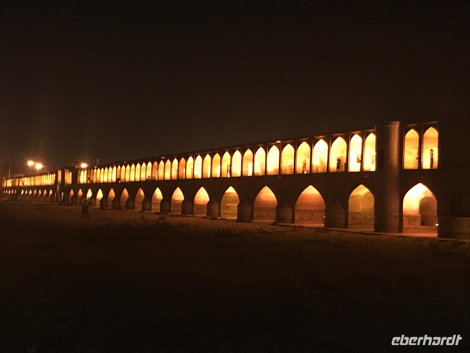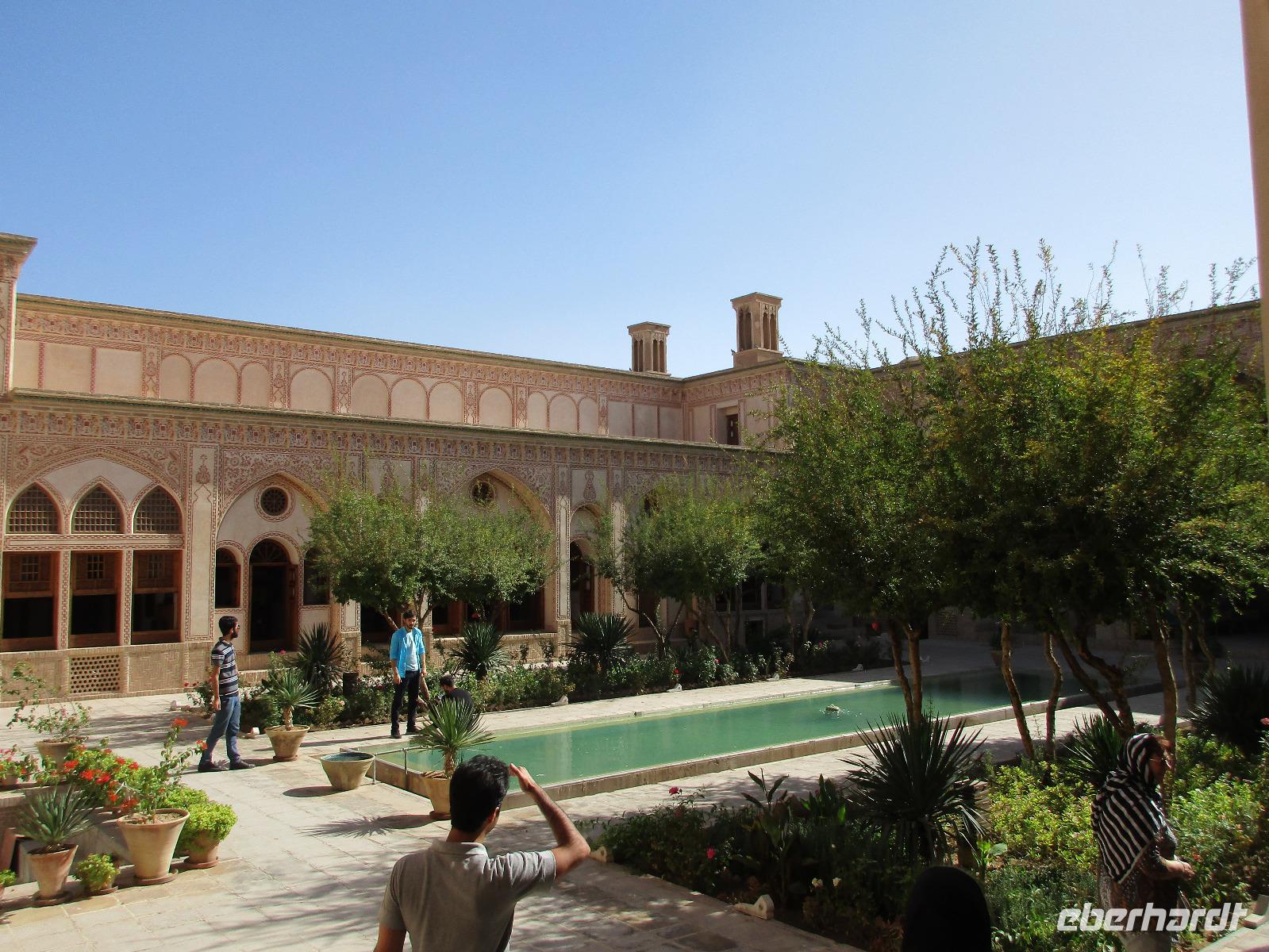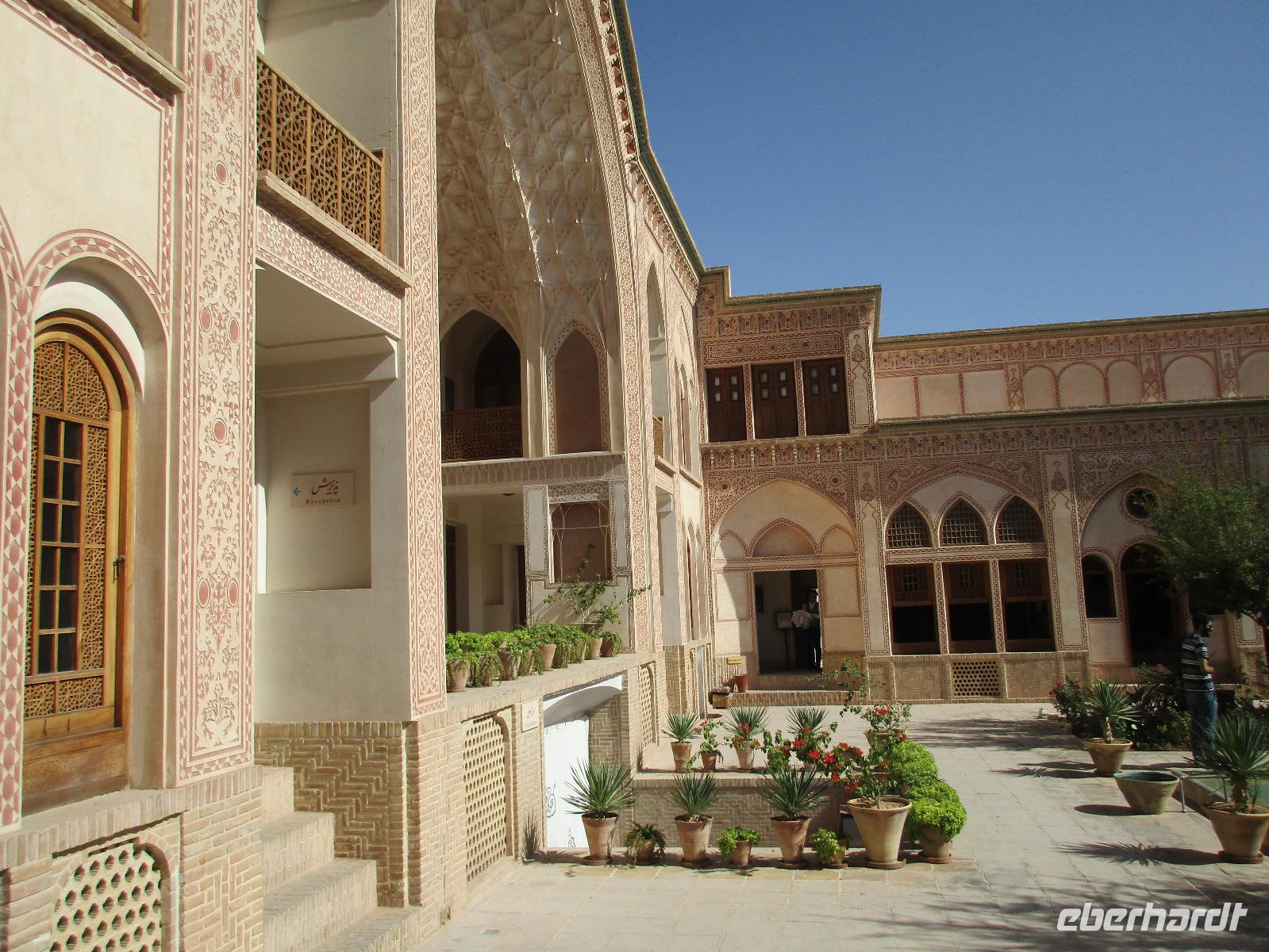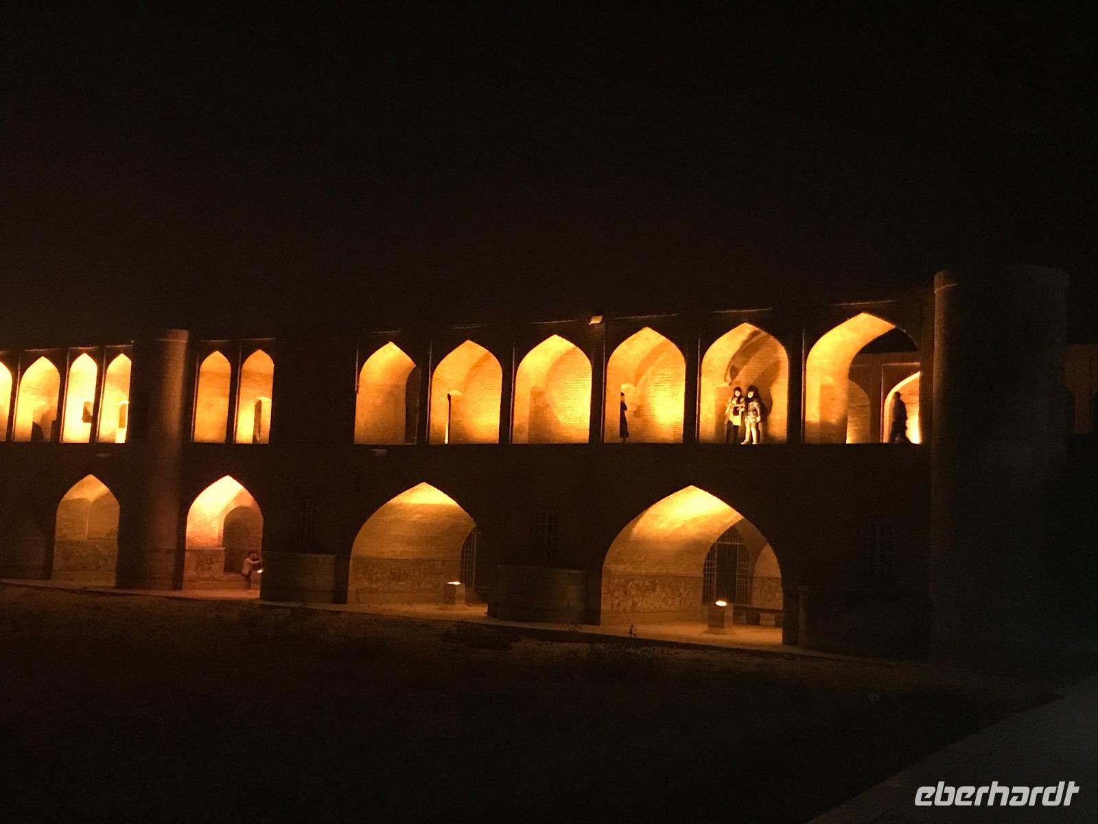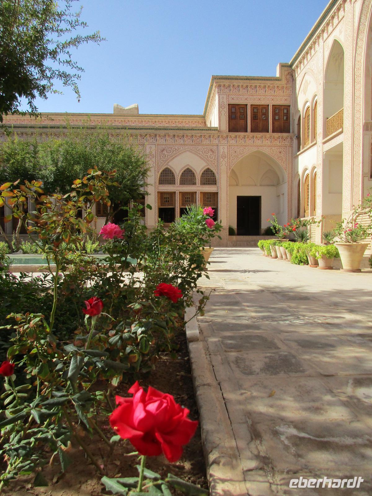 Ausgeschlafen starteten wir mit einem leckeren Frühstück im Bauch unseren heutigen Tag - hier fiel uns das erste Mal die Möhrenmarmelade auf, die uns die ganze Reise begleiten würde. Vorbei am Khomeini Mausoleum fuhren wir Richtung Qom. Das berühmte Heiligtum von Fatemeh Masumeh, gewidmet der Schwester des achten Imam Ali Rezas, erreichten wir nach 5 Minuten vom Parkplatz mit einem iranischen Linienbus, der allerdings nur für uns zur Grabmoschee fuhr. Das Grabmahl wurde dort errichtet, wo Fatemeh - Angehörige der Prophetenfamilie - mit nur 28 Jahren verstorben sein soll. Seitdem wird die Moschee ständig weiterentwickelt und erstrahlt in einer unglaublichen Pracht. Sowohl für Gläubige als auch Besucher ist der Eintritt frei. Wir hinterließen aber gern eine Spende. Vor dem Besuch mussten sich alle Frauen mit einem Chador, einem Umhang, der alles außer dem Gesicht verbirgt, verhüllen. Nach der Besichtigung erlebten wir einen Moment, der noch mehrfach auf dieser Reise folgen sollte, ein Reisegast wurde von einer Iranerin angesprochen und gefragt, woher sie komme und was sie im Iran mache. Die Gastfreundlichkeit ist mit Abstand die größte, die ich und sicher auch einige Reisegäste auf bisherigen Reisen erlebt haben. Zurück in unserem komfortablen Reisebus verkosteten wir typische Süßigkeiten mit Sesam, Nüssen, Honig und Safran - zum Beispiel Sohan. Die Fahrt ging weiter nach Kashan. Im berühmten Fin-Garten genossen wir die Atmosphäre, die ein wenig durch Baulärm „untermalt" wurde, aber natürlich müssen Instandhaltungsarbeiten in dem jahrhundertealten Anwesen durchgeführt werden. Weiter an erstaunlich vielen Neubauten und Bauten im Aufbau erreichten wir die Altstadt von Kashan. Dort verschafften wir uns im Sarayeameriha Hotel einen Eindruck der reichen Kaufmannshäuser. Nach einer Kaffeepause mit Kuchen und leckeren Getränken - mutige probierten ein geheimnisvolles traditionelles Getränk mit Chia Samen, Rosenblättern und anderen Zutaten - führte uns die Fahrt weiter nach Isfahan. Eine kurze Pause erfolgte an einer umgebauten Karawanserei. In Isfahan zeigte sich, wie auch schon in Teheran, dass es leider in der Infrastruktur noch einiges zu tun gibt, um die Lage in den Städten für die vielen Fahrzeuge zu verbessern. Wir hatten viel Stau - zum auch sonst üblichen Stau gibt es wohl dienstags Straßensperrungen, um die Anwohner vom Lärm und den Abgasen zu entlasten. Dennoch kämpfte sich unser Chauffeur Mohammad, ein wahrer Künstler auf den Straßen, bis zur sogenannten 33-er Brücke, Si-o-se Pol, durch und wir spazierten durch die Abendstimmung über die Brücke des ausgetrockneten Flusses Zayandehrud. Auch an der Khaju-Brücke legten wir einen Fotostopp ein, in dieser heißen Gegend spielt sich hier vor allem abends das Leben der Bewohner ab. Als wir unser Hotel erreichten, staunten wir nicht schlecht - wir wussten, dass wir das älteste Hotel der Welt, eine ehemalige Karawanserei, erleben, aber der Garten im Innenhof des Hotels glich einer Einladung in eine Welt aus 1.001 Nacht. Das Abendessen im Hotel-Restaurant war sehr reichhaltig und enthielt typische iranische Speisen wie Fleisch in einer Soße aus Walnüssen und Granatapfel und auch diverse Kebabs. Müde und zufrieden schliefen wir an dem Abend ein.