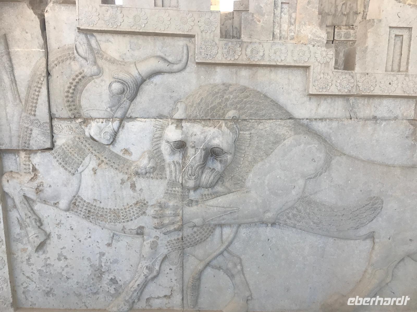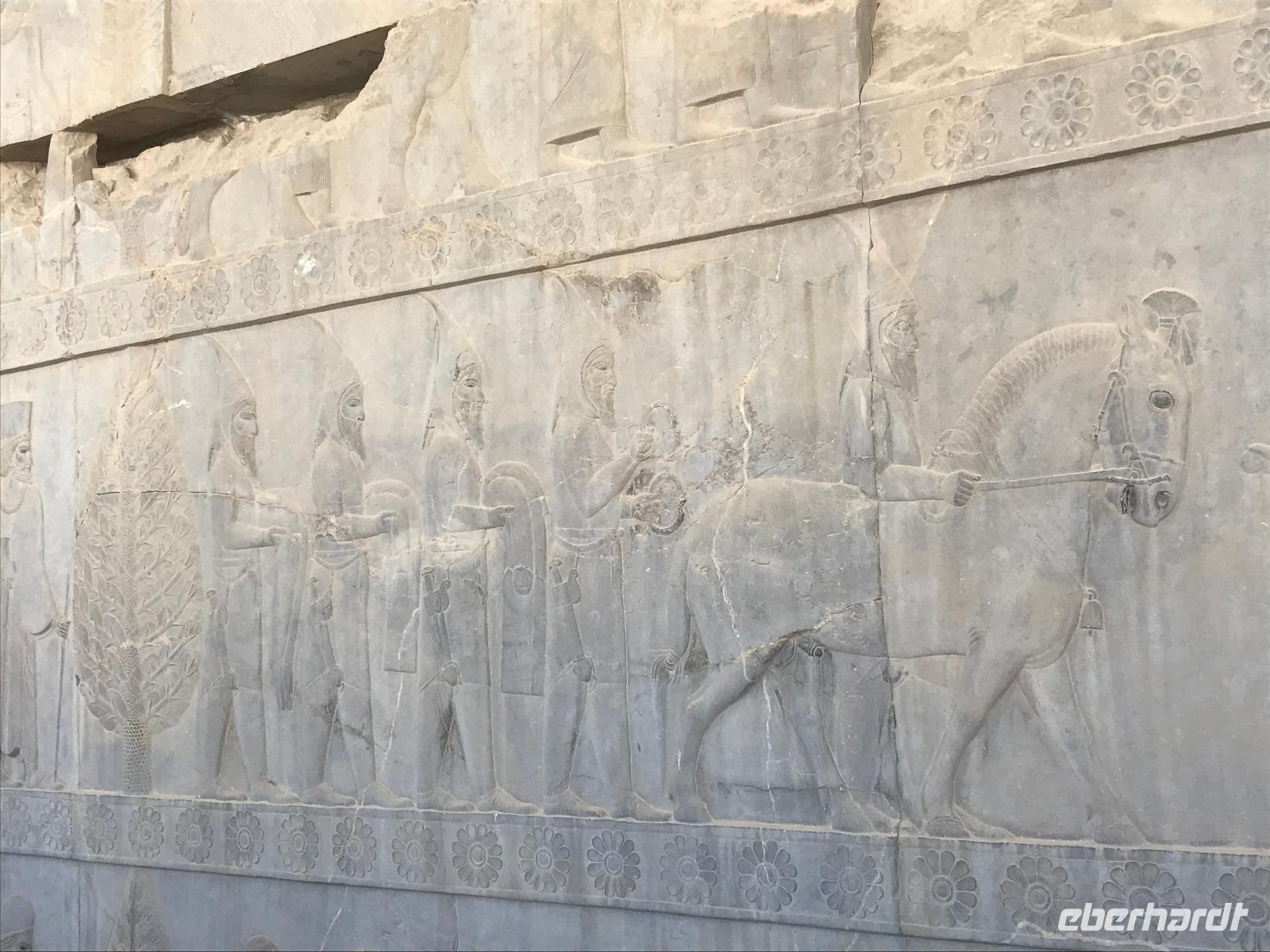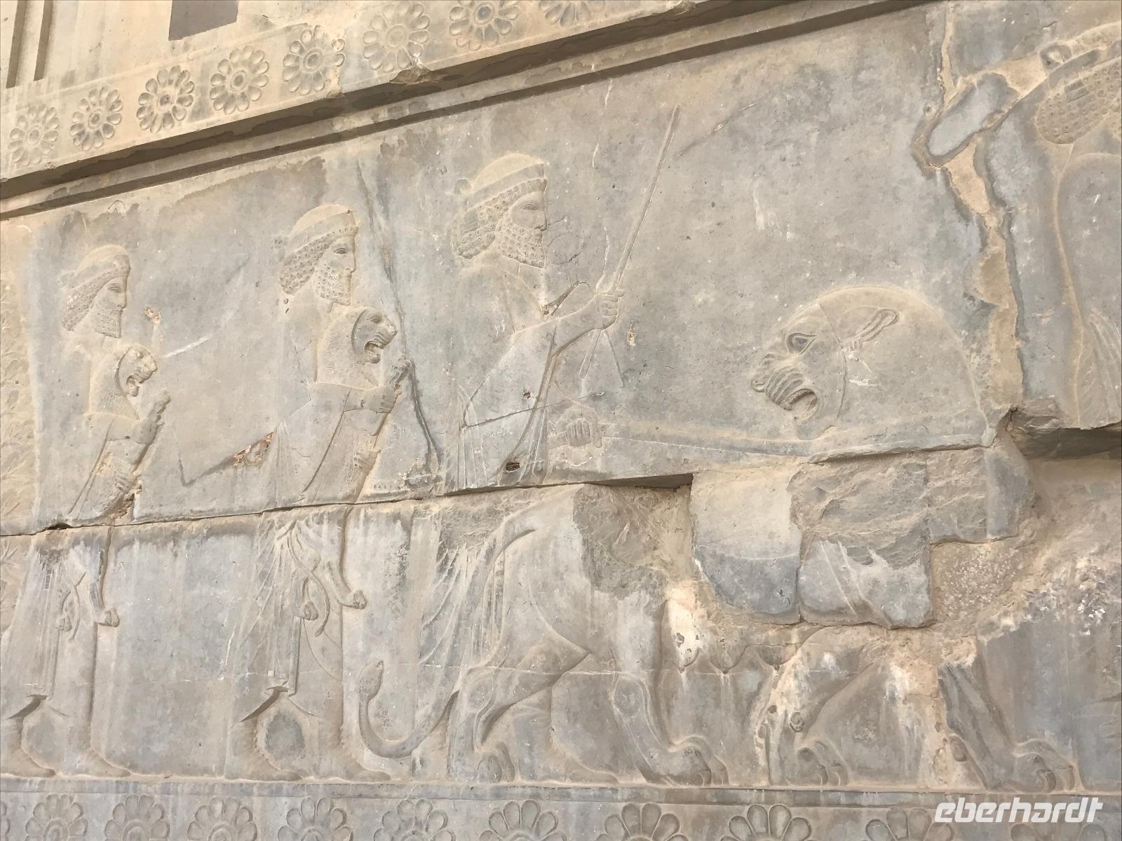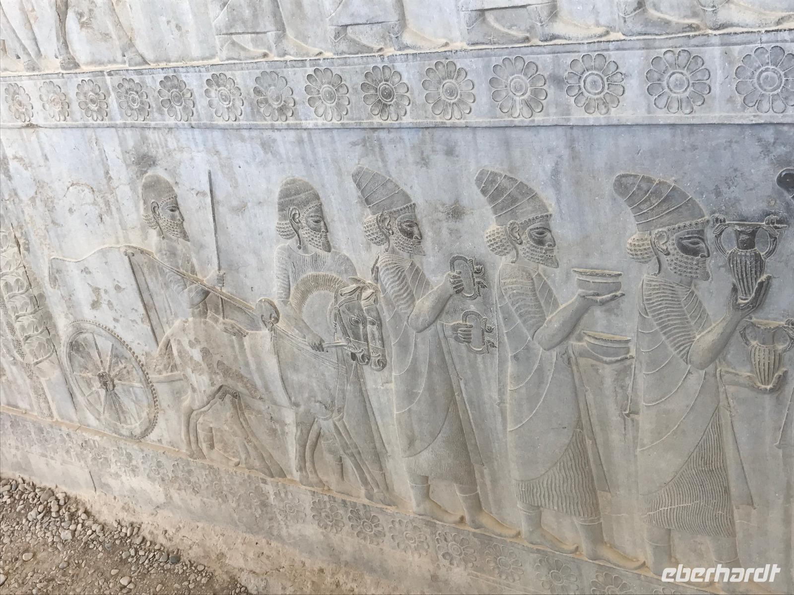 Da der Tag sehr lang werden würde, entscheiden wir gemeinsam eine etwas spätere Abfahrt als an den anderen Tagen. Die Fahrt nach Persepolis - übersetzt „Stadt der Perser" - dauert ca. 45 Minuten. Unterwegs legten wir einen kurzen Pflichtstopp bei der Polizei ein - der Fahrer muss sich regelmäßig mit seinen Lenkzeiten an Polizeistationen unterwegs melden - und Mohammad kaufte für unser letztes Picknick heute Mittag ein. Wir wappneten uns mit Sonnenschutz und Wasser, denn auch in der Ausgrabungsstätte von Persepolis ist Schatten eine Rarität. Rund 1,5 Stunden führte uns Mohammad durch die prachtvolle Anlage - so gut erhalten durch den „Glücksfall", dass Alexander der Große Persepolis nieder brennen wollte, und damit die Erhaltung der mehr als 2500 Jahre alten Reliefs in einem unglaublichen Zustand ermöglichte. Die Details kann man gar nicht so detailliert besprechen - dies würde in diesem Bericht den Rahmen sprengen - aber das Gefühl, das man in einem solchen historischen Gelände erhält, ist ergreifend. Auch das Gelände zur Feierlichkeit von 2.500 Jahren Persisches Reich ist von der Terrasse von Persepolis zu sehen. Wir nutzten die Picknickplätze in der Nähe des Eingangs, um uns für das weitere Programm zu stärken. Auf dem Weg zurück nach Shiraz besichtigten wir die Nekropole der Achämeniden - Naqsh-e Rostam, die Felsgräber sind denen in Persepolis gleich. Man geht davon aus, dass hier die Felsgräber von Xerxes I., Darius I., Artaxerxes I. und Darius II. (Herrscher, die im 6. bis 5. Jahrhundert v.Chr. lebten) zu finden sind. Mohammad spielte typische Musik auf dem Weg zurück nach Shiraz. Im Basar wurden wir dann Zeugen des von Mohammad beschriebenen Klischees, die Shirazis würden gern und viel schlafen. Tatsächlich schnarchten manche noch weit nach 16 Uhr an ihren Ständen im Basar. Wir kauften als Mitbringsel süße Granatäpfel, Pistazien, Süßigkeiten, Schmuck, Taschen, Safran und noch einiges mehr. Den Abschluss der Besichtigung bildete das Hafis Mausoleum - zum Sonnenuntergang findet man hier eine schöne Atmosphäre. Für das letzte Abendessen trafen wir uns in der Lobby und unternahmen einen kurzen Spaziergang zum Haft Khan, bestes Restaurant der Stadt. Die Portionen waren reichlich, geschmacklich war es wunderbar, aber die Zeit saß uns etwas im Nacken, da wir uns ja noch abreisefertig machen mussten. 23 Uhr fuhren wir zum Flughafen, wo wir 3 Stunden vor Abflug ankamen. Zuerst verabschiedeten wir uns von unserem Chauffeur. An der ersten Sicherheitskontrolle mussten wir nun Abschied von unserem lieben Mohammad nehmen - wir sind alle sehr dankbar für die wunderbare Zeit, die er uns beschert hat und wünschen ihm von Herzen nur das Beste! Die lange Schlange am Check-In machte uns klar, dass es gut war, so früh am Flughafen zu sein. Denn die nächste Schlange zur Ausreise folgte prompt. Noch eine weitere Passkontrolle und Sicherheitskontrolle später saßen wir zum Abflug nach Istanbul bereit. Fast pünktlich erfolgte der Abflug 2.35 Uhr und auch die Ankunft in Istanbul, aber wir fuhren ewig bis die Maschine zum Stehen kam. An der Pass- und Sicherheitskontrolle fanden wir eine so eine lange Schlange vor, dass wir, vor allem unsere Münchnerin, um unsere Anschlussflüge bangten. Zum Glück ist alles gut gegangen und wir sind pünktlich in Deutschland gelandet. Auch ein verspäteter Koffer wurde noch am gleichen Tag gefunden und verspätet zugestellt.