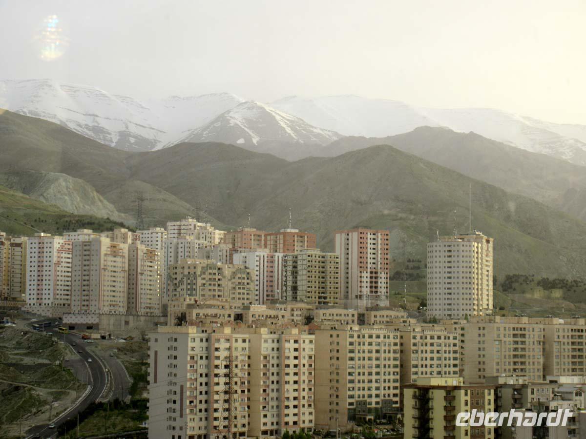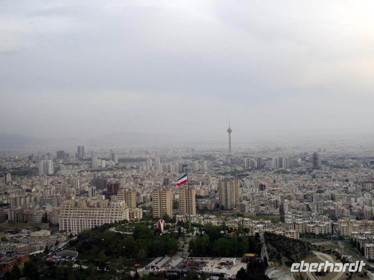 Durch die Zeitverschiebung bedingt, landen wir 4.20 Uhr morgens in der iranischen Hauptstadt. Die Kontrollen auf dem Flughafen gehen zügig von statten, und hinter der Zollschranke nimmt uns schon unser Reiseleiter David in Empfang. Mit unseren Chauffeur Akbar geht es in einem VIP-Bus in Richtung Stadt. Es ist mitten in der Nacht, aber Teheran schläft nicht. Mit mehr als 14 Millionen Einwohnern ist auch jetzt auf der Straße noch recht viel Verkehr. Kurz nach 6 Uhr treffen wir in unsrem noblen 5 Sterne Hotel ein. Die Stadt liegt uns zu Füßen. Aber ach, die Zimmer sind nicht bezugsfertig. In dem Hotel werden auch Staatsgäste untergebracht. Bis gestern war der Präsident Südafrikas dort zu Gast. Aber seine Regierungsdelegation hatte sich noch nicht bequemt, die Zimmer zu räumen. Nach einem Kaffee und einem Frühstück machten wir eine Art Katzenwäsche auf den Toiletten der Lobby und entschieden, dass es wohl am besten sei, mit dem Programm zu beginnen und die Zimmer am Abend zu beziehen. Ich verspreche den Gästen als kleinen Ausgleich, Ihnen auf der Reise ein Mittagessen zu spendieren.