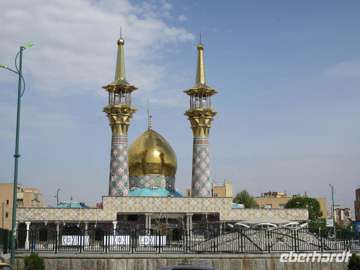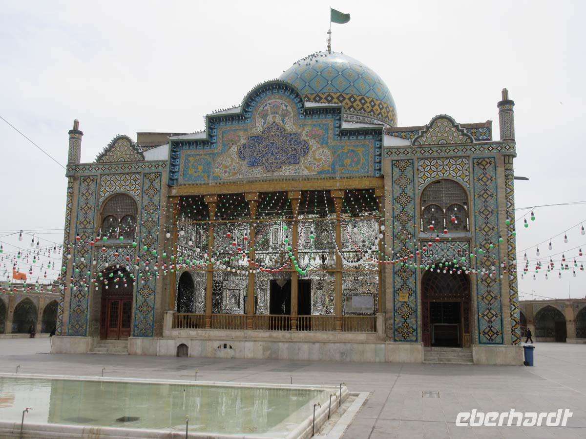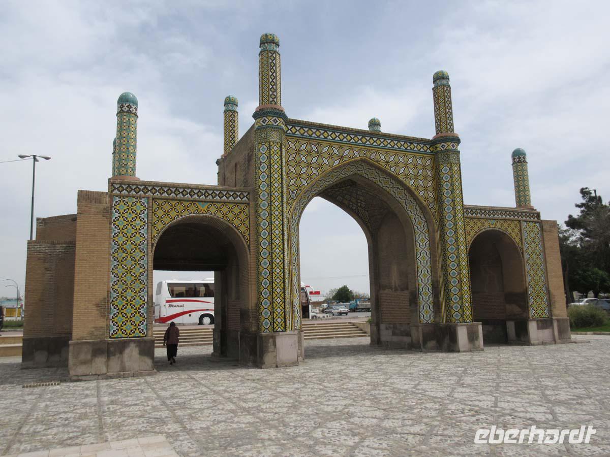 Die alte Stadt Qazwin ist unser nächstes Ziel. 250 n. Chr. soll der Ort durch den sassanidischen König Shapur I. gegründet worden sein. Nicht ganz so alt ist zunächst eines von zwei erhaltenen mittelalterlichen Stadttoren, vor dem wir einen Stop einlegen. Höhepunkt ist jedoch der Besuch des Immamzadeh Hoseyn. In dieser Anlage liegt der 820 in Qazwin verstorbene Hoseyn, Sohn des 8. Imam Reza begraben. Diese wichtige Pilgerstätte betreten Männer durch das rechte, Frauen durch das linke Tor. Diese müssen zudem vor dem Betreten einen Tschador anlegen.