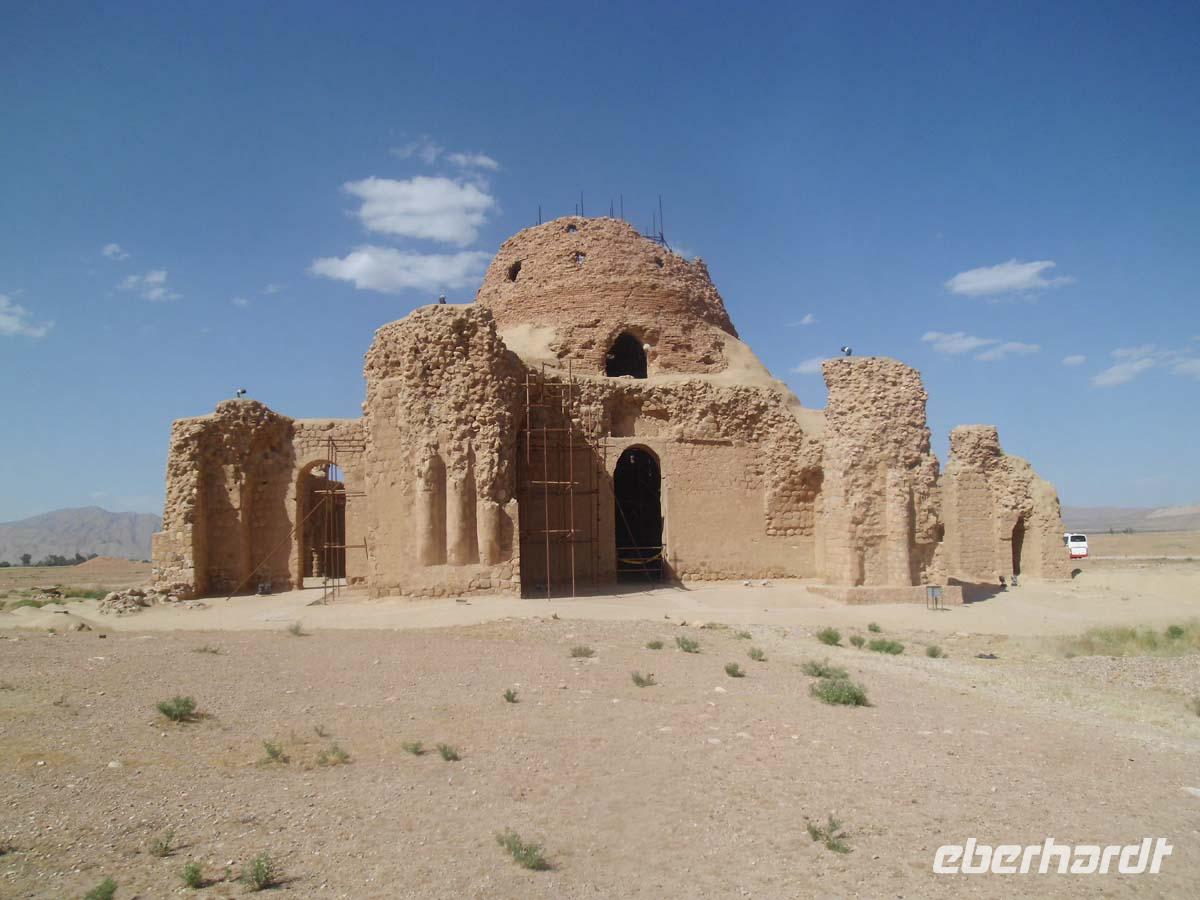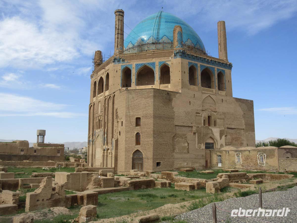 Ein Weltkulturerbe steht heute Vormittag auf dem Programm. Nach dem Frühstück verlassen wir Zandschan und begeben uns nach Soltaniye. An diesem Ort würde jeder vorbei fahren, stünde dort nicht das Mausoleum des Ilkanidenherrschers Oldjeitu aus dem Jahr 1314. Mit einer Kuppelhöhe von 51 m und einem Innendurchmesser von 25 m erreicht die Kuppel fast die Dimensionen der Hagia Sophia in Istanbul. Zur Zeit wird das Bauwerk saniert und ein großes Gerüst im Innern trübt den Blick. Dafür hat man vom oberen Umgang einen herrlichen Blick in die weite Landschaft.