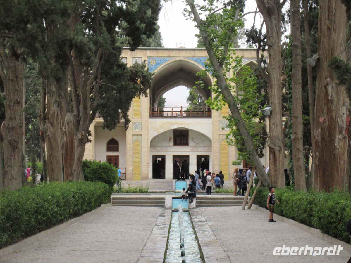Der Dowlatabad Garten, welchen wir anschließend besichtigen, wird von einem Pavillion mit einem mächtigen Windturm überragt. Mit einem Papierschnipsel führt uns David die Funktion vor Augen. In Windeseile ist der Zettel angesaugt. Warme Luft verlässt mit ihm das Gebäude, während durch einen anderen Schacht kühle Luft hineinströmt. Das ganze kostet keinen Strom und ist wesentlich leiser als moderne Klimaanlagen.