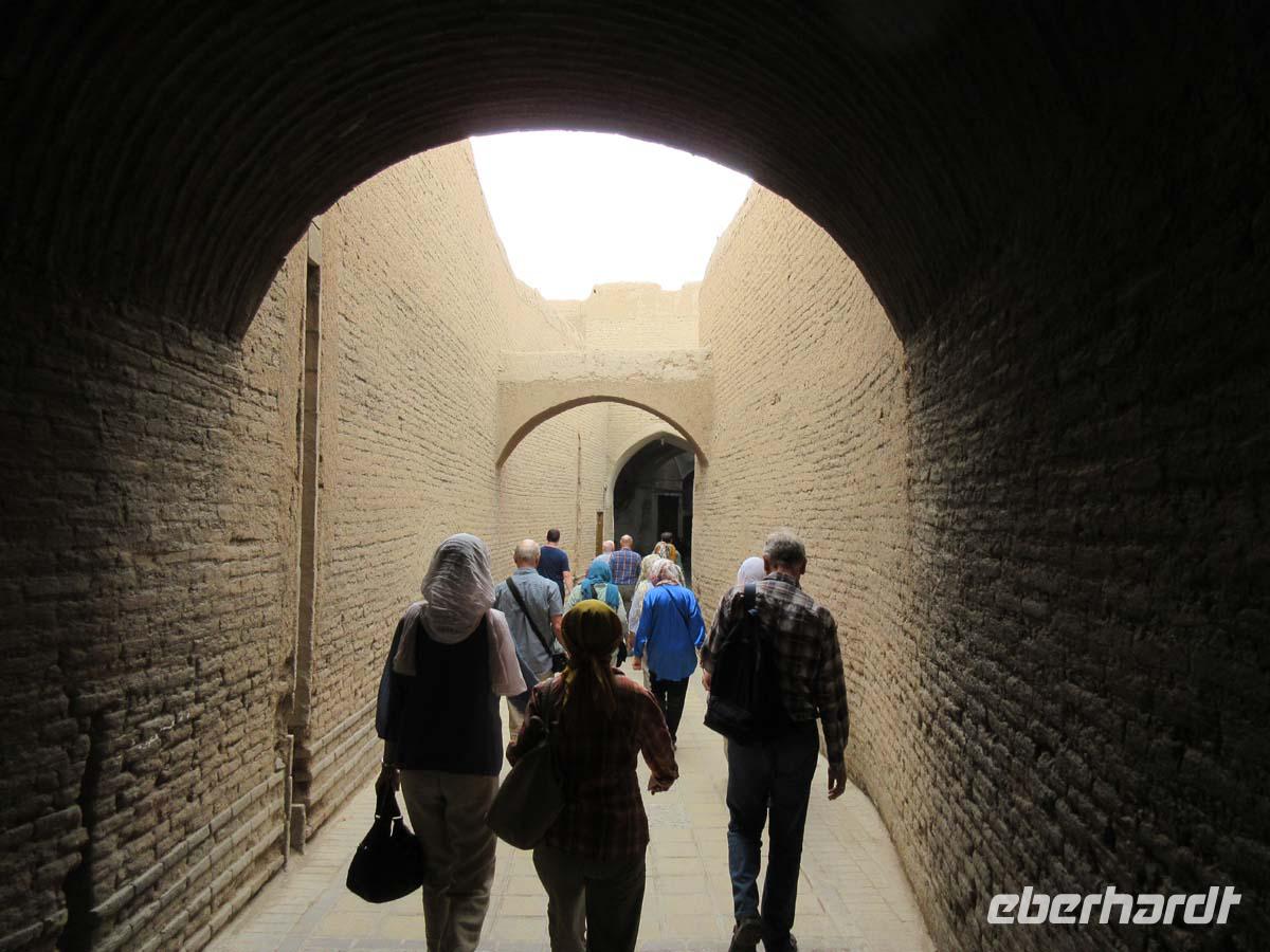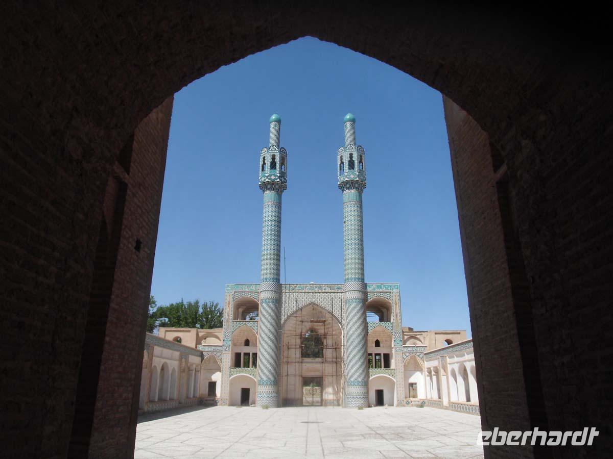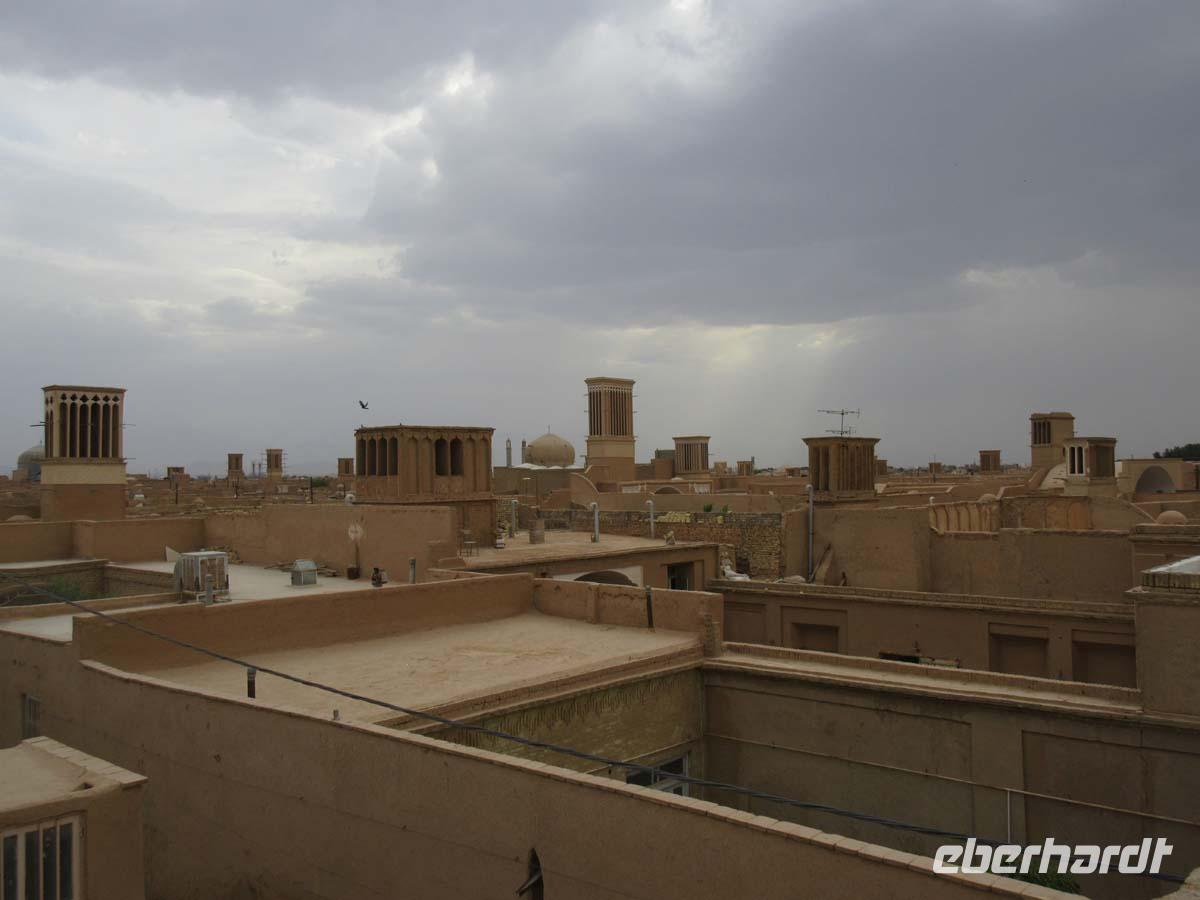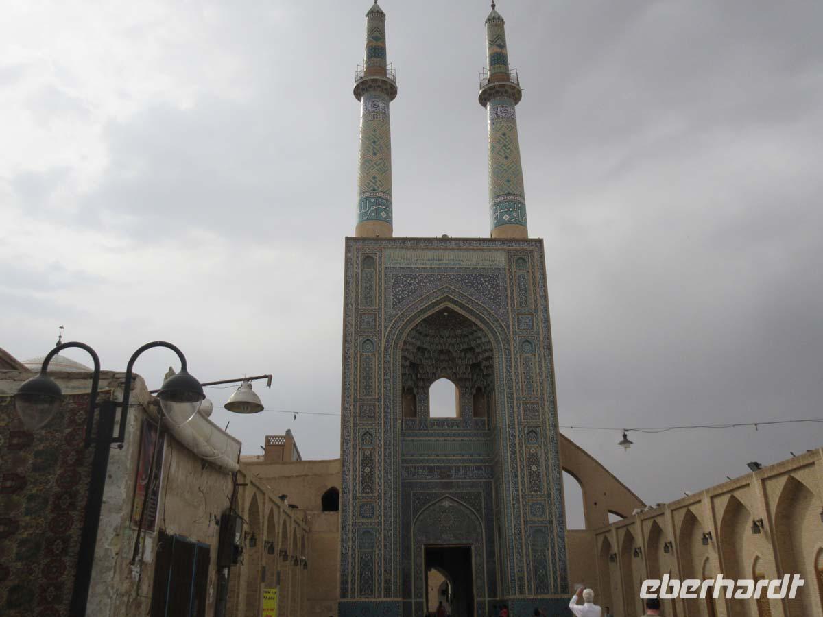 Der Freitagsmoschee aus dem 12. Jh., die im 13. Und 14. Jh. grundlegend erneuert wurde gilt unser erster Besuch. Beeindruckend ist der doppelstöckige Eingangsiwan mit seinem üppigen Fliesendekor. Danach führt uns David durch die engen Altstadtgassen zu einem Hotel, auf dessen Dach wir steigen können. Nun wird klar, warum man Yazd auch die Stadt der Windtürme nennt, die in sehr großer Anzahl die Silhouette der Altstadt bestimmen.