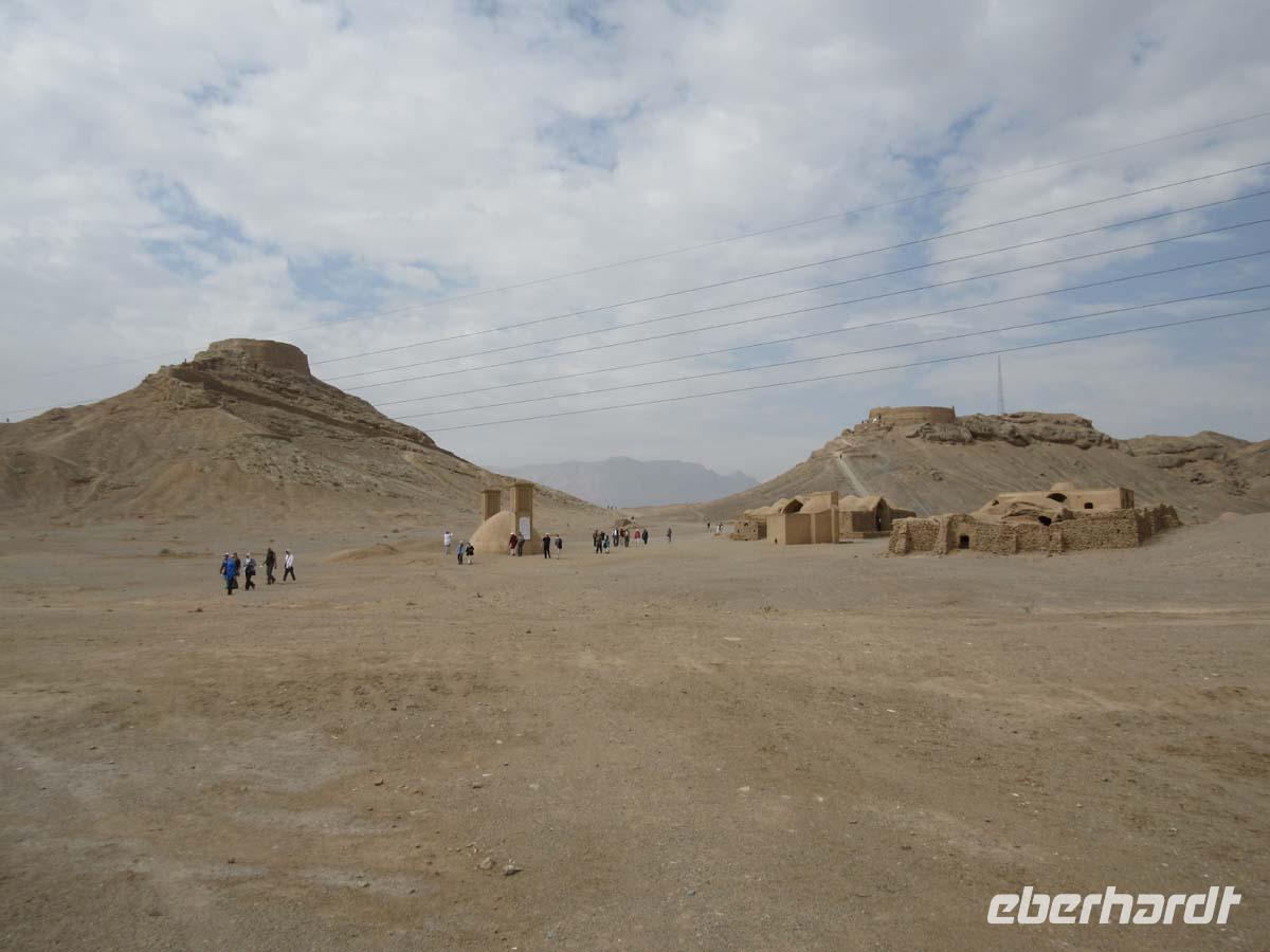 Den Vormittag verbringen wir noch in Yazd. Die Stadt ist ein Zentrum der Zoroastrier, also der Anhänger der Religion des Zarathustra. Die vier Elemente sind für sie heilig. Seit mehr als 1500 Jahren ist die Gemeinde hier ansässig. Zunächst besuchen wir einen Feuertempel über dessen Eingang mächtig das Symbol des Gottes Ahura Mazda prangt.