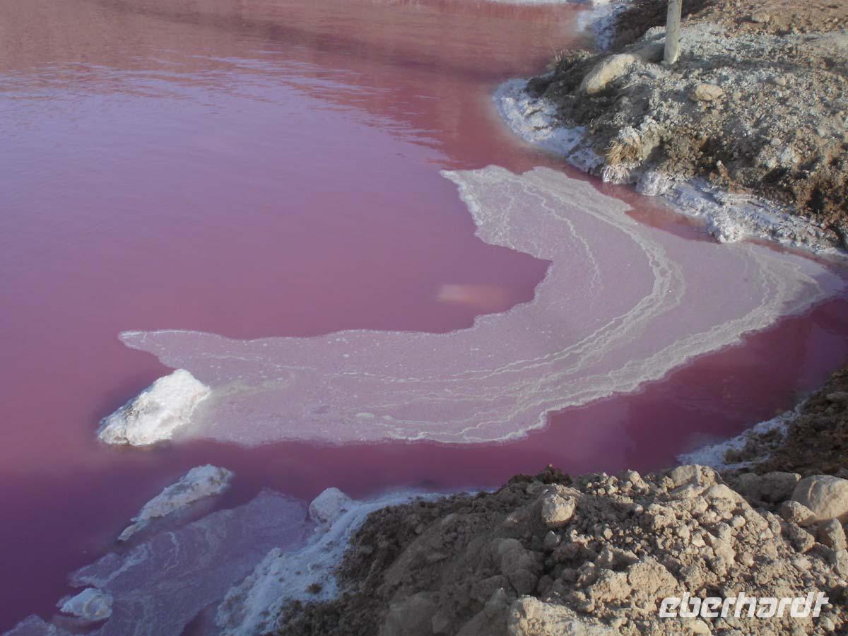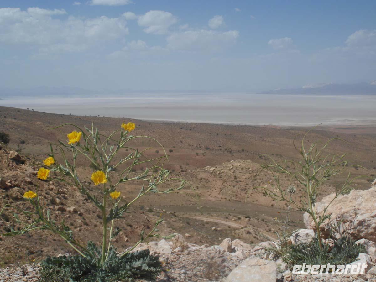 Heute haben wir mit weit über 500 km die längste Etappe der Reise vor uns. Es geht nach Shiraz, eine der heimlichen Hauptstädte Irans. Die Reise führt uns durch sehr trockene, wüstenartige Gegenden. Wir stoppen an zwei Salzseen, dem riesigen Bakhtegan Salzsee dun den Maharlu, der sich schon in der Nähe von Shiraz befindet. Durch Mineralien ist sein Wasser violett verfärbt. Eigentlich sind sie seit Jahren voll ausgetrocknet, aber dank der Gewitter der letzten Nächte hat sich tatsächlich, fast extra für uns eine Wasserfläche gebildet, auf der sich nun die gegenüber liegenden Berge spiegeln.
