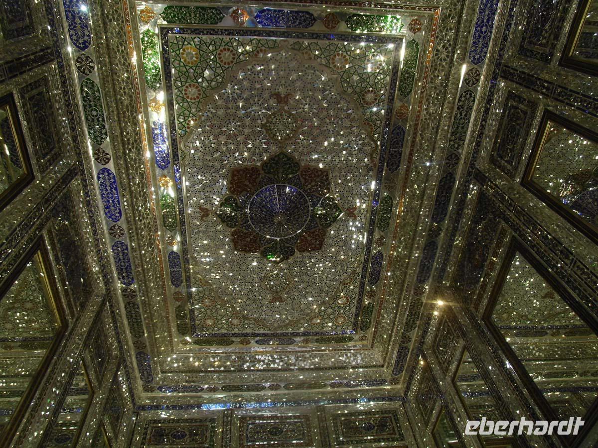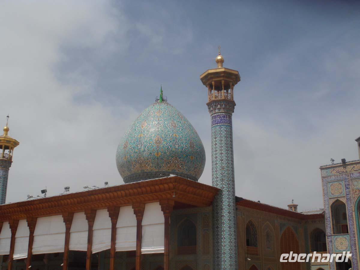 Nach dem Besuch eines Teehauses steht das Verweilen in einer Koranschule auf dem Programm, sowie nach dem Basarbesuch ein Gang zur gewaltigen Karim Khan Zitadelle mitten in der Stadt. Vorher besichtigten wir jedoch auch das Heiligtum von Shah Cheragh, welches auf das 12. Jh. zurück geht. Auch hier müssen Frauen Tschador tragen. Es herrscht ein reges Kommen und Gehen zum Mittagsgebet. Immer mehr Menschen füllen Moschee und Platz. Über Lautsprecher klingen religiöse Gesänge den Besuchern ans Ohr, die sich sehr melodisch und beruhigend anhören. Innen ist alles mit Spiegelmosaiken ausgestaltet. Zwar darf man aus Respekt den Schrein nicht fotografieren, aber allein die Räumlichkeiten rauben in Ihrer Pracht einem fast den Atem.