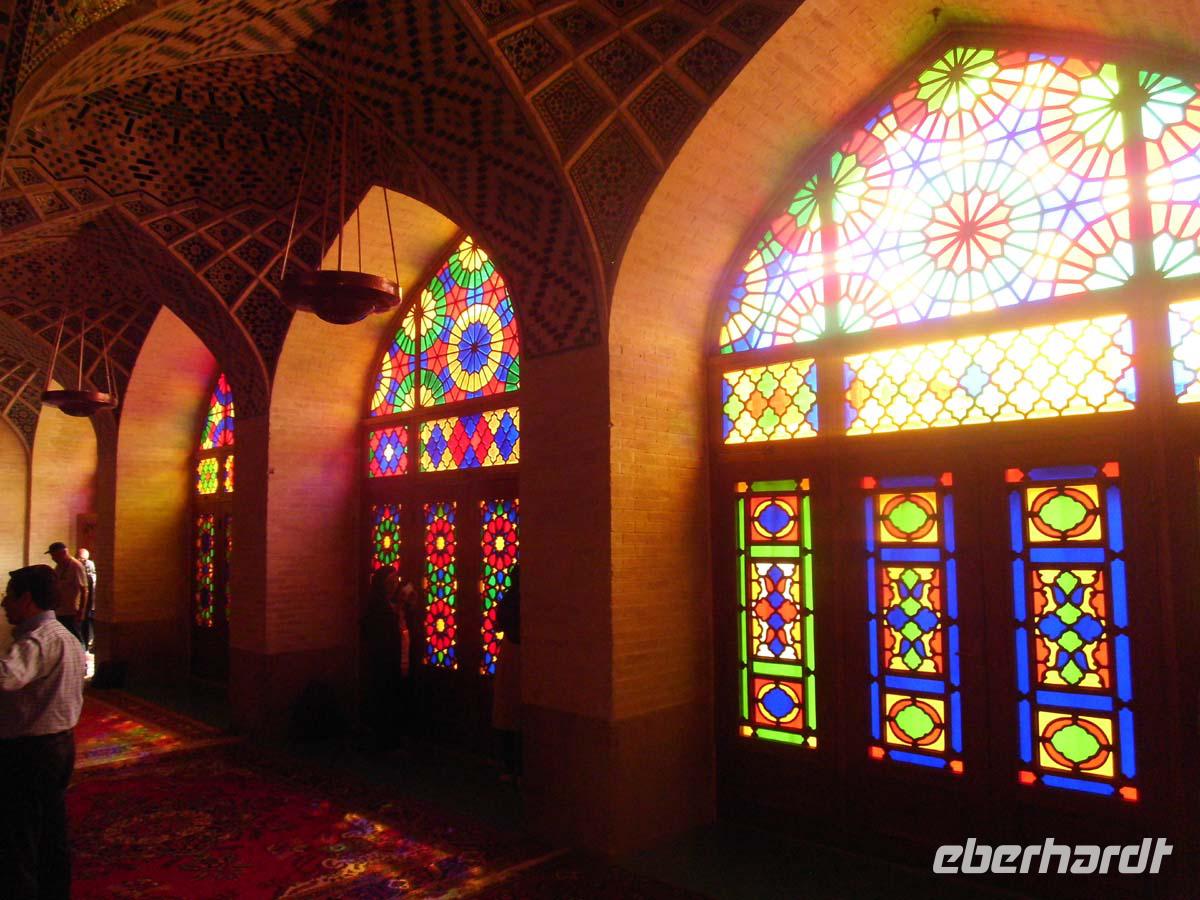 Doch zunächst besuchen wir zwei wunderschöne Dinge, nämlich den durch seine Blumenpracht und Mosaikverzierten Pavilions betörenden Naranjestan Garten der Famiklie Qavam aus dem 18. Jh. und dann die Nasir ol Molk Moschee. Diese sollte man auf jeden Fall am Vormittag besuchen, denn dann wird Licht durch glasierte Fenster in tausend Farben in den Raum geworfen.