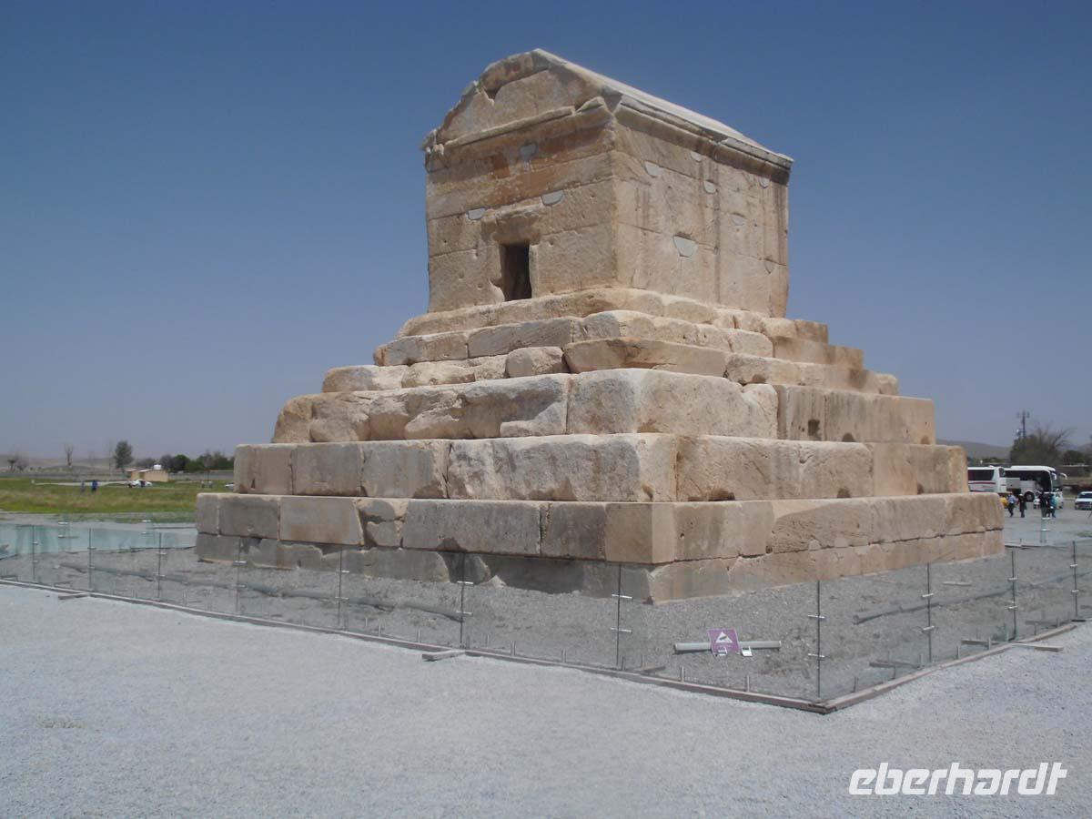 Den letzten Progammpunkt für heute bildet Pasargadae. An diesem Ort wurden im Jahre 550 v.Chr. die Meder von den Persern besiegt. Nach seinem Sieg begründete Kyros II. hier die erste achämenidisch-persische Königsresidenz, von der jedoch nur noch geringe ausgegrabene Rudimente vorhanden sind. Das Grabmal von Kyros II, welche auf einem Sockel von 6 Stufen steht ist das erste Gebäude, was man nach dem Erwerb der Eintrittskarten zu sehen bekommt. Es ist auch am besten erhalten. Erst nach Einbruch der Dunkelheit erreichen wir unser letztes Ziel der Reise: Isfahan.