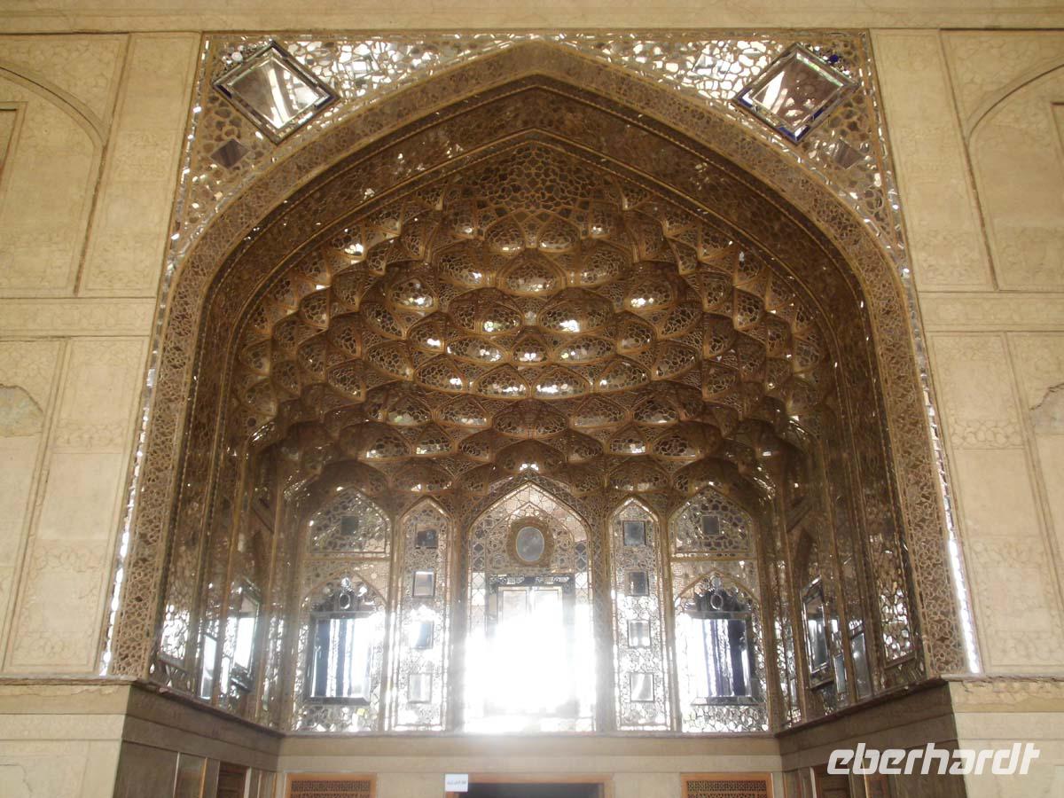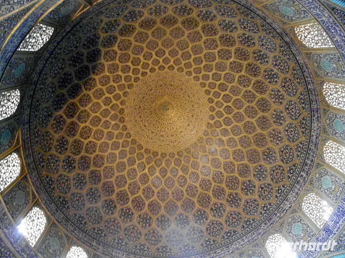 Zurück am Imamplatz gleich hinter dem Chehel Sotun Palast statten wir der wohl schönsten Moschee Isfahans einen Besuch ab, der Lotfollah Mosche. Prachtvoller als hier kann eine Fliesenverkleidung kaum sein. Gegenüber steht der Ali Qapu Palast von dessen Terrasse aus schon Abbas I. im 15 Jh. Polospiele auf dem Platz beobchtete. Unterm Dach ist ein Musikzimmer untergebracht, dessen durchbrochene Terrakottawände für eine ganz besondere Akustik sorgen. Sogar die Treppen sind gefliesst, sodass man gar nicht auf die schönen Muster treten möchte.