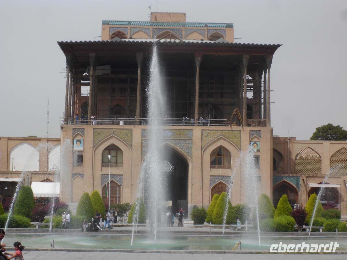 Unser Hotel liegt so zentral, dass es nur wenige Gehminuten zu Fuß bis zu unserem Ziel, dem Chetel Sotun Palast sind, der auch 40 Säulen Palast genannt wird. Ursprünglich wurde er unter Abbas I. in safawidischer Zeit errichtet. Das große Empfangsgebäude bildet mit den lang gestreckten Wasserbecken davor eine harmonische Einheit.