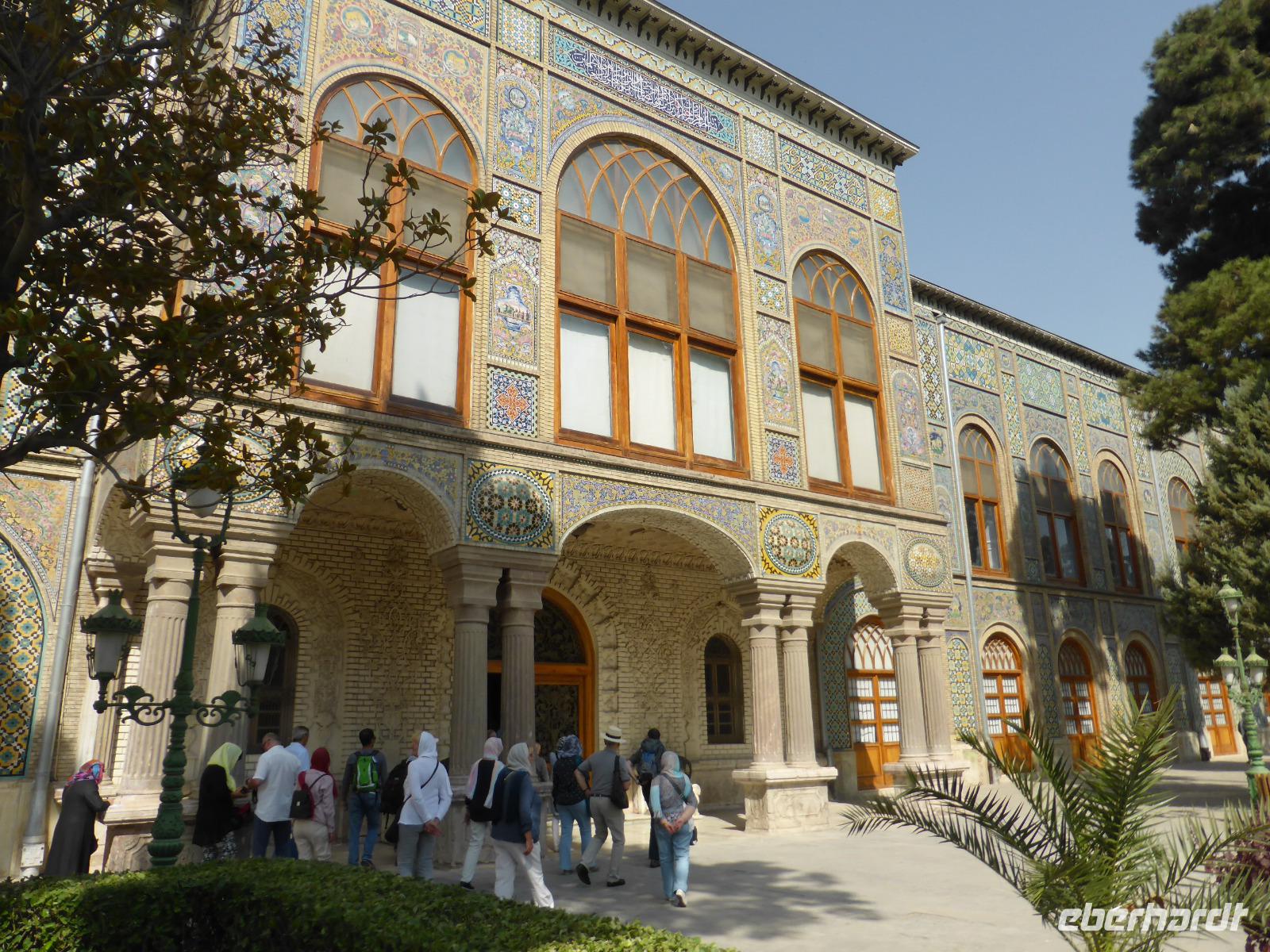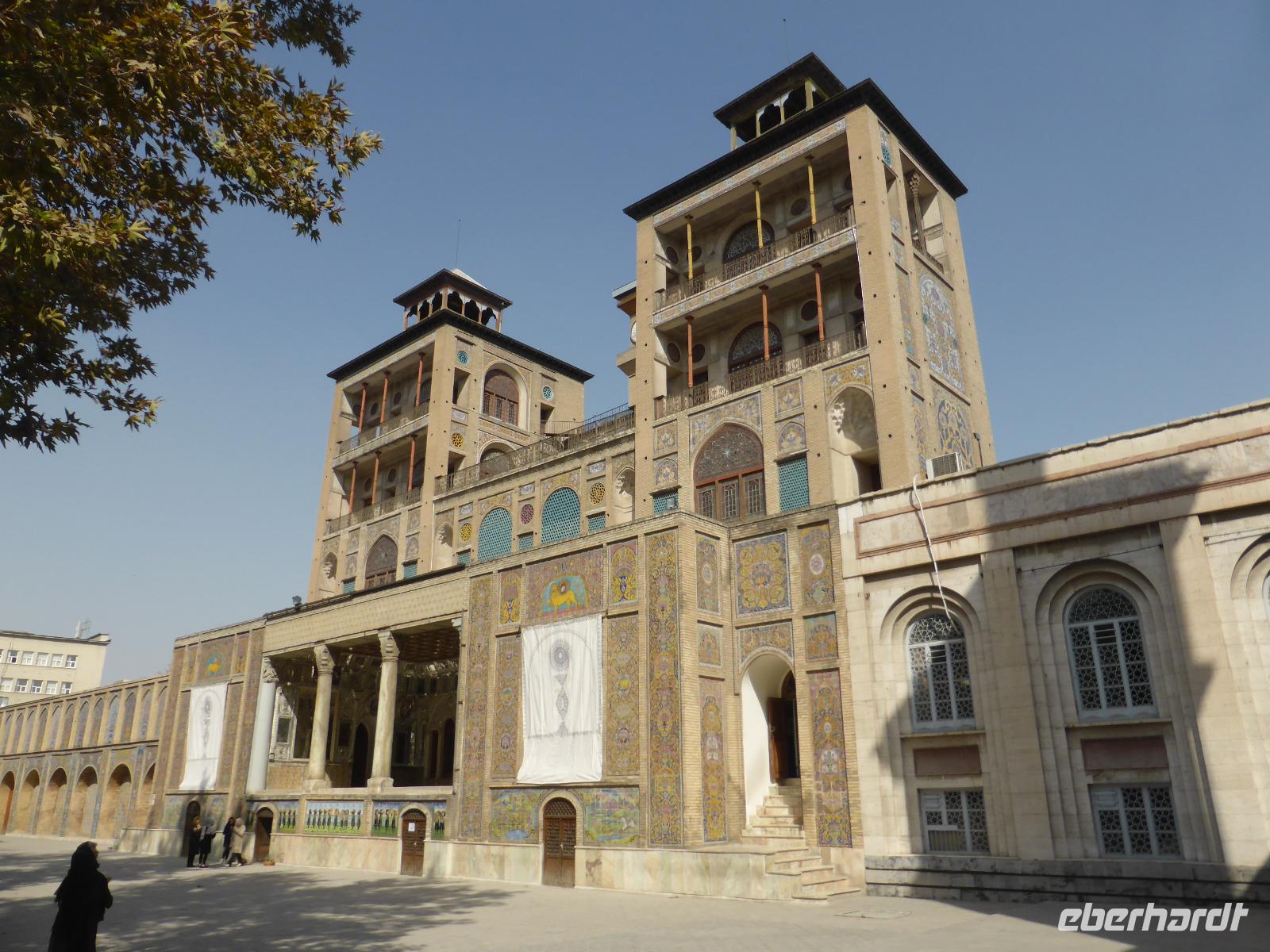 Nach einem späten Frühstück verstauten wir unsere Rucksäcke im Bus und liefen zum nahe gelegenen Teppich-Museum, in dem Teppiche aus den verschiedensten Regionen Irans ausgestellt sind. Von dort fuhren wir zum Golestan-Palast, dessen Baubeginn auf die Zeit Shah Abbas I. (1588-1629) zurück geht. Spätere Herrscher erweiterten die Anlage. Die letzten Krönungen der Pahlavi-Shahs fanden hier 1925 und 1967 statt. Besonders eindrucksvoll waren für uns der Marmorthron und die Residenz der qajarischen Könige im Empfangspalast (Emarat-e Salam). Vom Golestan-Palast ging es zum Juwelen-Museum, welches wir zusätzlich zum ausgeschriebenen Reiseprogramm besuchten. In ihm sahen wir Schätze unvorstellbaren Wertes, wie zum Beispiel die Kronjuwelen, hochkarätige Diamanten, den Sonnenthron, Repräsentationsschwerter und vieles mehr.