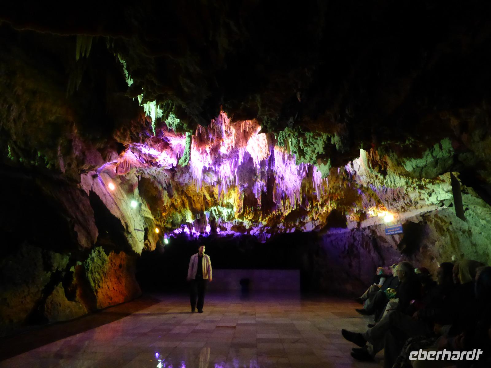 Nach dem Frühstück ging es von Zanjan zum Oljeitu-Mausoleum in Sultaniye, welches auf der Liste des UNESCO-Weltkulturerbes steht. Benannt ist das Mausoleum nach dem Ilkhaniden-Herrscher Oljeitu, der seine Residenz von Tabriz nach Sultaniyeh verlegte, zum Schiitentum übertrat und im Mausoleum ursprünglich die Gebeine der Imame Ali und Hoseyn beisetzen wollte. Die Grabanlage ist der größte Kuppelbau Irans und in der Dimension mit der Hagia Sophia in Istanbul vergleichbar. Mittlerweile sind die äußeren Rekonstruktionsarbeiten an der Kuppel beendet, so dass ihre türkisblaue Farbe schon von weitem den Weg weist. Nach der Besichtigung des Mausoleums fuhren wir nach Ali Sadr. Dort besichtigten wir einen Teil des gigantischen, ca. 136-190 Millionen Jahre alten Höhlensystems, von dem etwa 11 km² erforscht und 3,5 km für die Öffentlichkeit zugänglich sowie beleuchtet sind. Durch Zufall entdeckte ein Hirte, eine seiner Ziegen suchend, das Höhlensystem in den 1950er Jahren. Wir konnten es während einer Bootsfahrt erkunden. Zuerst bekam jeder von uns eine Schwimmweste. Dann stiegen wir in die Höhle hinab und liefen zur Bootsanlegestelle. Drei bis vier Plasteboote waren immer in Reihe zusammengebunden und im vordersten saßen die Führer und traten kräftig in die Pedalen. Später, wieder an Land, war ein Moment besonders eindrucksvoll. Wir saßen in einer Reihe auf Plastikstühlen in einer größeren Höhle und der Führer schaltete für 30 Sekunden das Licht aus. Es war stockdunkel und es herrschte eine unheimliche Stille. Nur das Aufschlagen der Wassertropfen war zu hören. So müssen sich die ersten Entdecker und Forscher gefühlt haben, als sie beim schwachen Schein ihrer Taschenlampen die Höhlen erkundeten. Von Ali Sadr fuhren wir zu unserem Hotel „Baba Taher" in Hamadan.