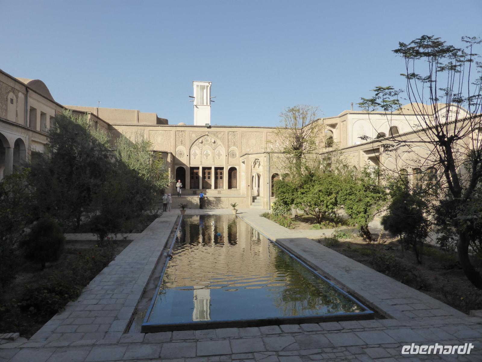 Von Hamadan aus fuhren wirauf der Autobahn in östliche Richtung nach Qom und von dort weiter nach Kashan. Am Nachmittag erreichten wir die Stadt und besuchten als erstes das Borujerdi-Haus. Wie überall im Orient sieht man von außen nicht, welche Pracht sich im Inneren verbirgt. Der Gebäudekomplex war und ist in einen öffentlichen, für Besucher zugänglichen Bereich und in einen privaten Bereich aufgeteilt. Im Innenhof spiegelt sich die Fassade in einem großen Wasserbassin. Nach diesem Besuch ging es zum Fin-Garten. Er ist vermutlich der älteste persische Garten und seine Existenz geht bis auf die achämenidische Zeit zurück. Im 17.Jh. ließ Shah Abbas I. die Anlage erneuern und erweitern. In diesem paradiesischen Garten hat sich auch eine Tragödie abgespielt. Auf Veranlassung des Shahs Nasseruddin wurde hier im Jahre 1852 der Premierminister Amir Kabir ermordet, da er sich als beliebter Politiker gegen den Ausverkauf Persiens eingesetzt hatte. Vom Fin-Garten fuhren wir anschließend zu unserem Hotel „Negarestan" und von dort fuhren wir nach einer Pause zum Abendessen.