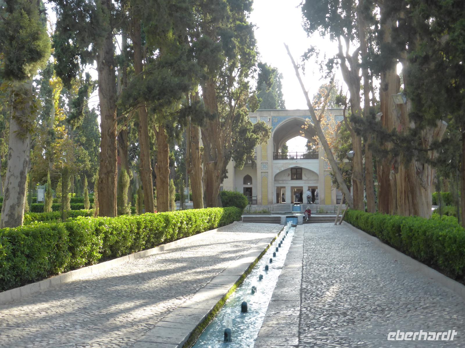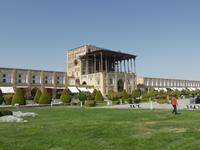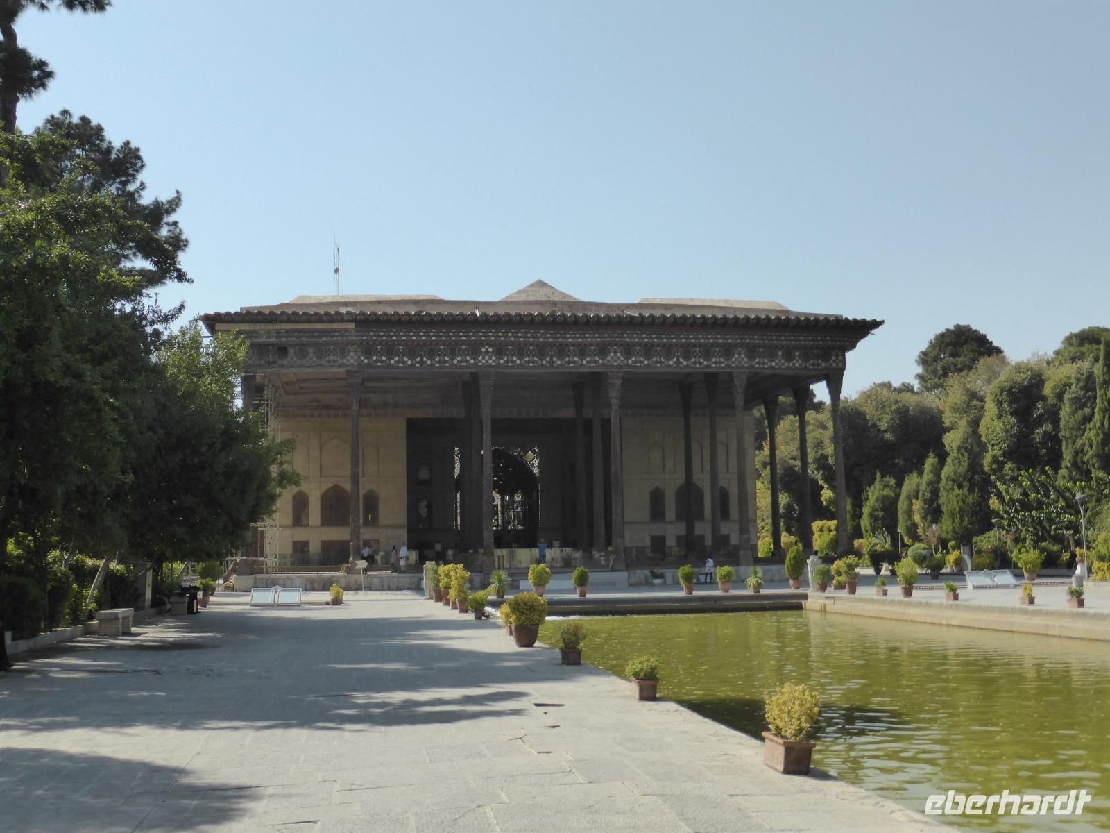 Nach der Besichtigung des Ali-Qupu-Palastes ging es zum Chehel-Sotun-Palast, einer großen Gartenanlage mit einem langgezogenen Wasserbecken, an dessen Ende sich wieder ein gewaltiger Palast erhebt, dessen Dach von zwanzig Säulen aus Zedernholz gestützt wird. Die Verdopplung der Säulen durch die Spiegelung im Wasserbecken gab dem Palast seinen Namen (40-Säulen-Palast). Der safawidische Shah Abbas I. ließ ihn im Jahre 1647 erbauen. Im Inneren sind die Wände mit Gemälden politischer Ereignisse des 16.-18. Jahrhunderts geschmückt. Nach dem Besuch des 40-Säulen-Palastes legten wir in einem Teehaus eine kleine Pause ein. Als nächstes besuchten wir einen Miniaturmaler und wieder am Imam-Platz angekommen, hatten wir Freizeit für den Besuch des Basars oder individuelle Erkundungen.