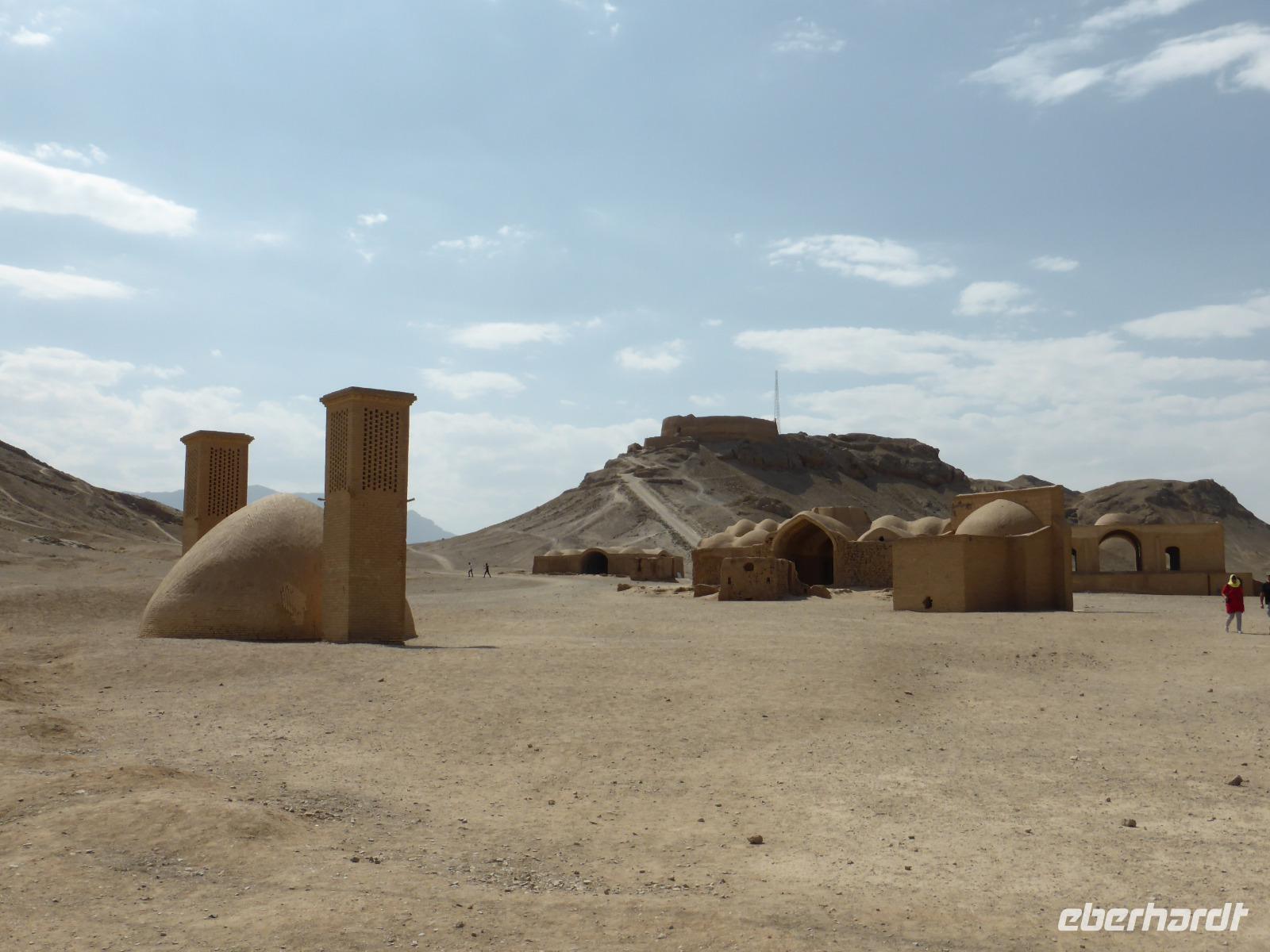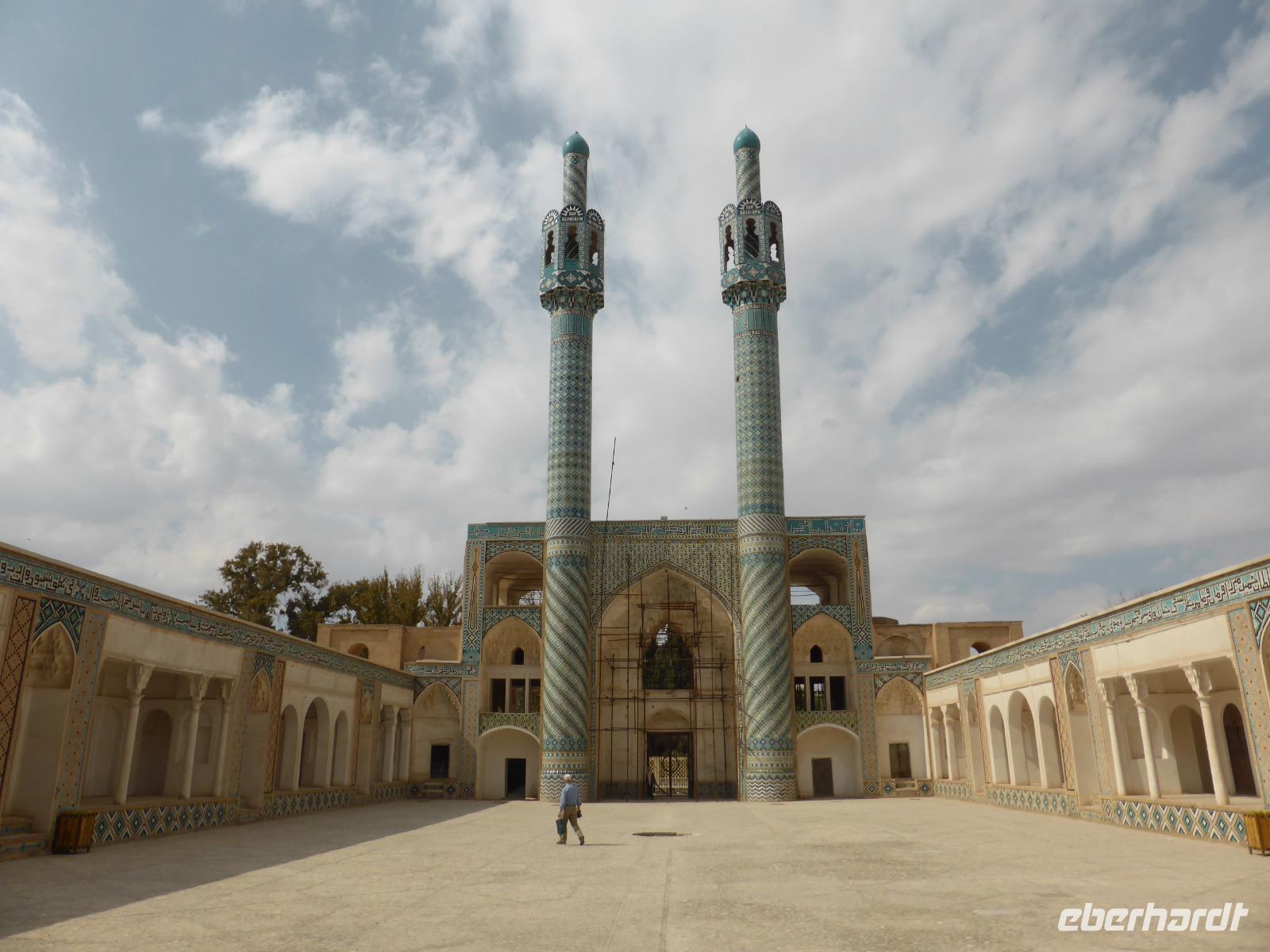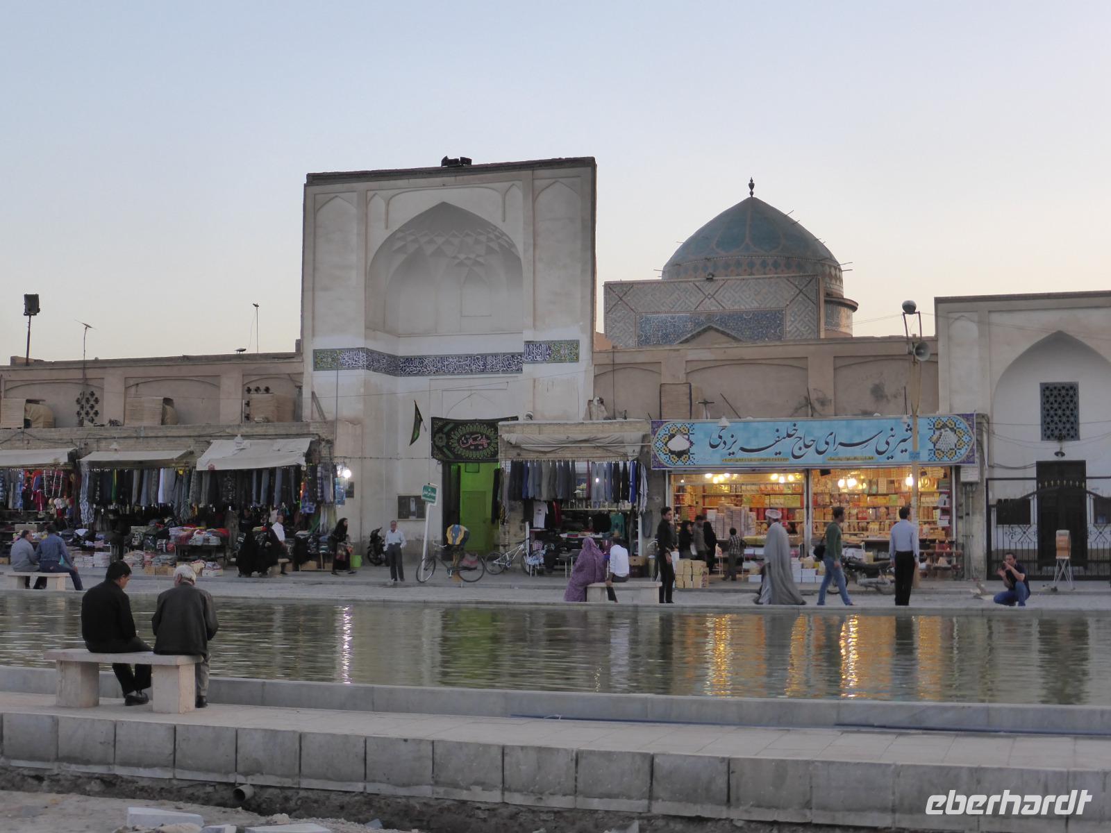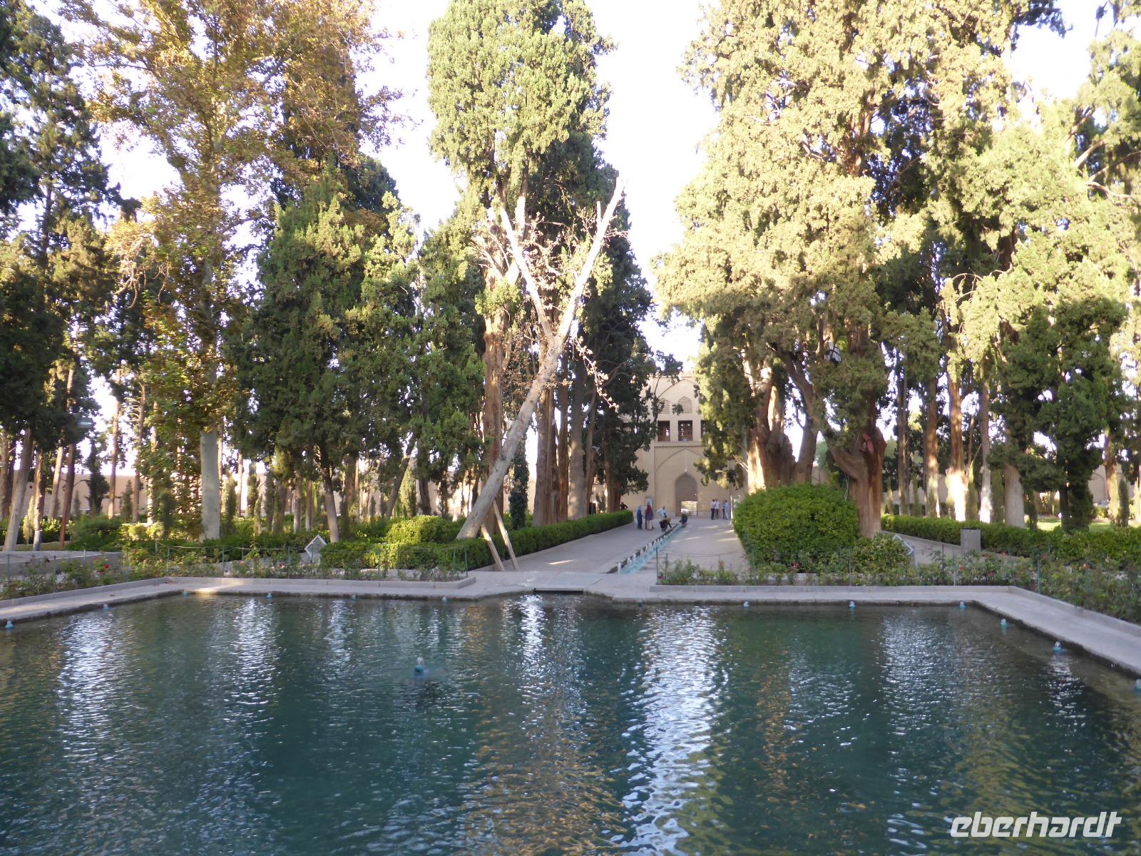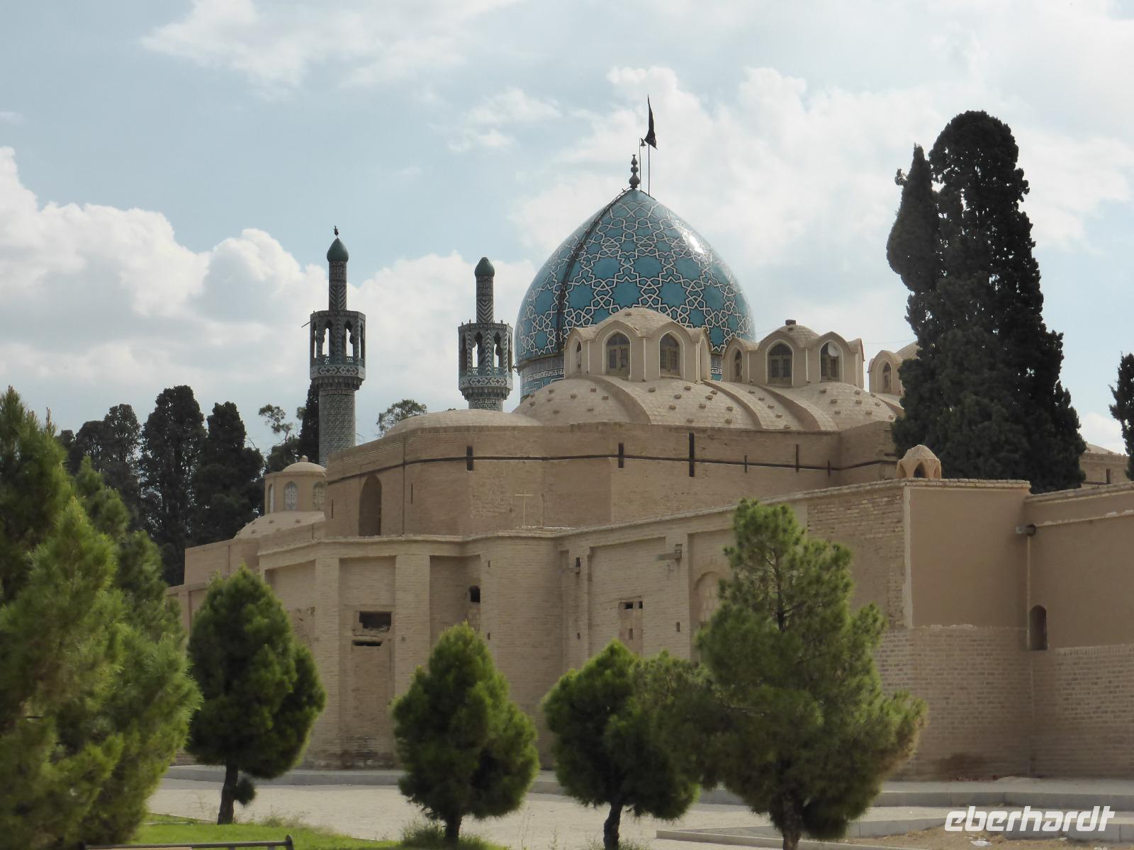 Nach dem Frühstück fuhren wir ins Kargos-Gebirge, zum kleinen Bergdorf Abyaneh, dessen rot-braune Lehmziegelhäuser dicht aneinander gedrängt am Berghang stehen. Die Einwohner sprechen einen Dialekt, welcher dem der sassanidischen Zeit ähnelt. Die Frauen tragen weiße, mit bunten Blumenmustern verzierte Kopftücher und die Männer Pluderhosen. Danach ging es zur Schnellstraße zurück und auf dieser weiter Richtung Süden. In Yazd angekommen besuchten wir als erstes den zoroastrischen Feuertempel, den Anhänger Zarathustras aus dem indischen Mumbay im Jahre 1940 ihren iranischen Glaubensbrüdern gestiftet hatten. Sein Feuer im Inneren stammt von einem anderen Ort und soll bereits seit 1500 Jahren brennen. Diese ewige ist das Symbol für die Anwesenheit Gottes, da Feuer, Wasser, Luft und Erde den Zoroastriern heilig sind. Vom Feuertempel fuhren wir ins Stadtzentrum zum Amir Chaqmaq Platz. Hier konnten wir den fantastischen, mit Minaretten bestückten Arkadenbau bei warmem Abendlicht bewundern. Auch nach Eintritt der Dunkelheit verlor er durch die effektvolle Beleuchtung nichts von seiner Faszination. Am Rand des Platzes steht ein Nakhl, ein riesiges Holzgerüst, welches vor dem Ashura-Trauerfest mit schwarzen Tüchern behängt wird. Die Männer tragen es während der Prozessionen auf ihren Schultern. Nach unserem Aufenthalt auf dem Amir Chaqmaq Platz fuhren wir zu unserer Hotelanlage „Moshir-al-Mamalek"-Garden, welche zu den schönsten Übernachtungsmöglichkeiten in Yazd und vielleicht auch im ganzen Land zählt. Die Zimmer gruppieren sich um eine parkähnliche Gartenanlage, in welcher flache Wasserbecken den Eindruck einer Oase inmitten einer Wüstenstadt unterstreichen.
