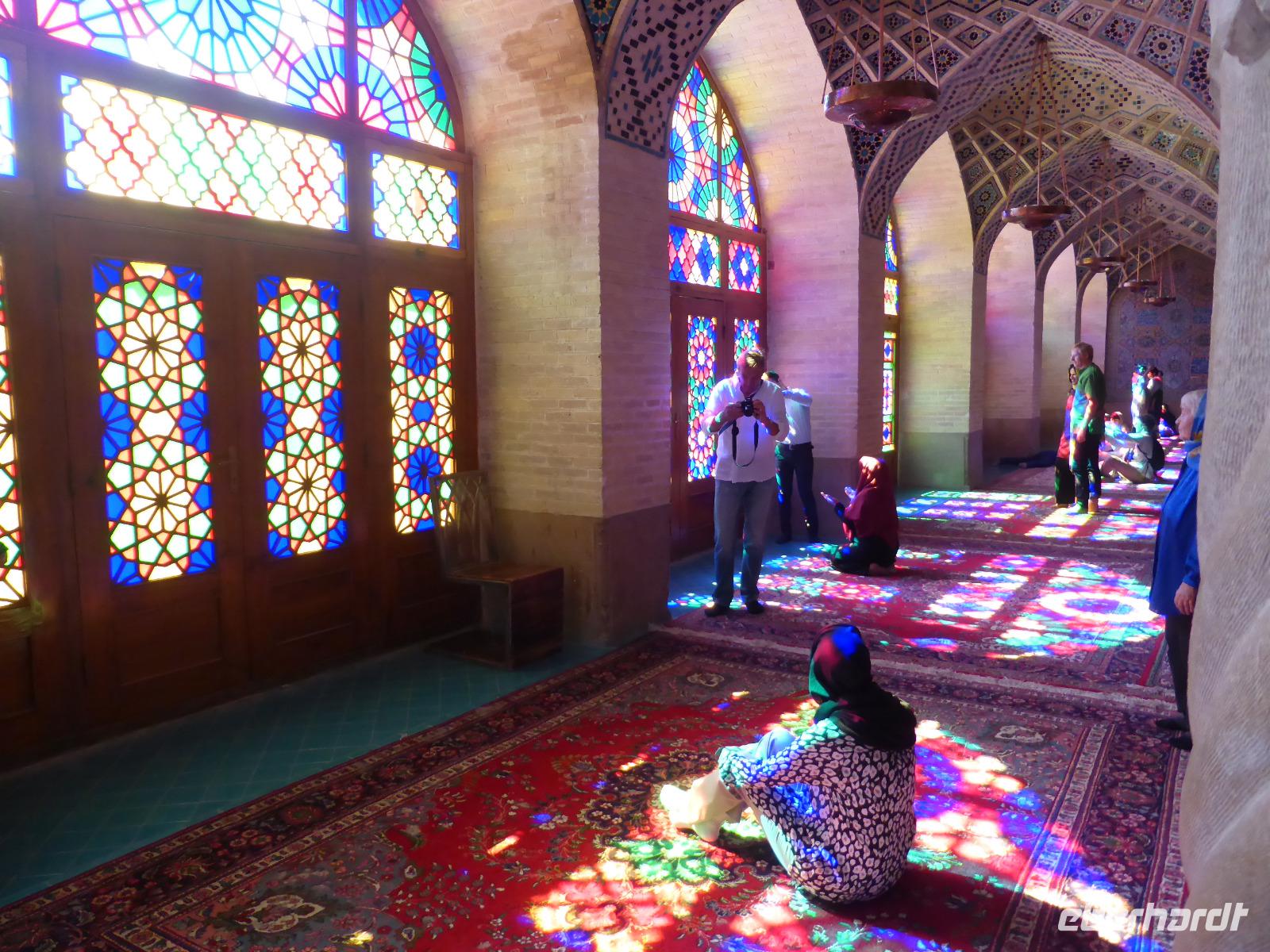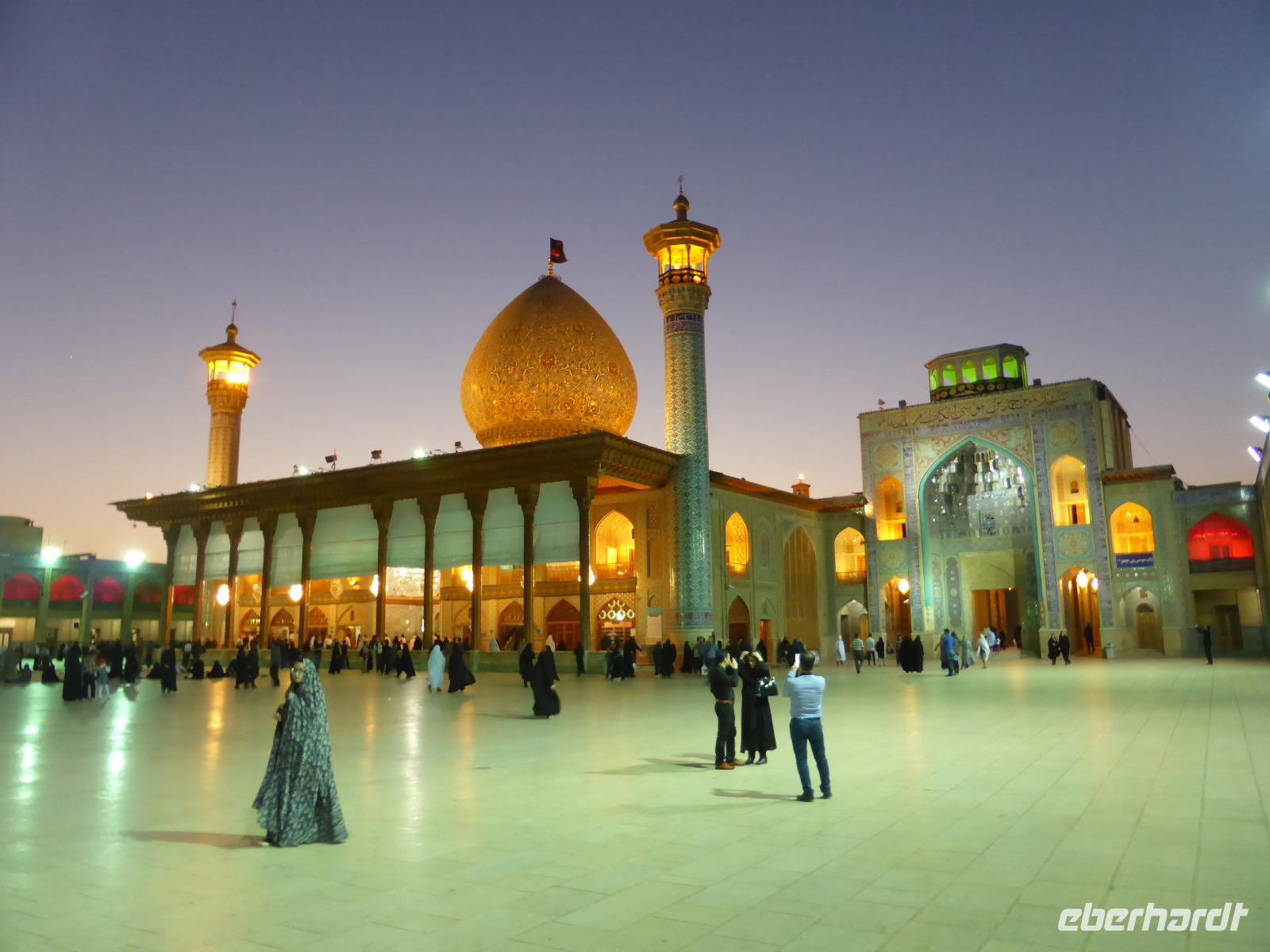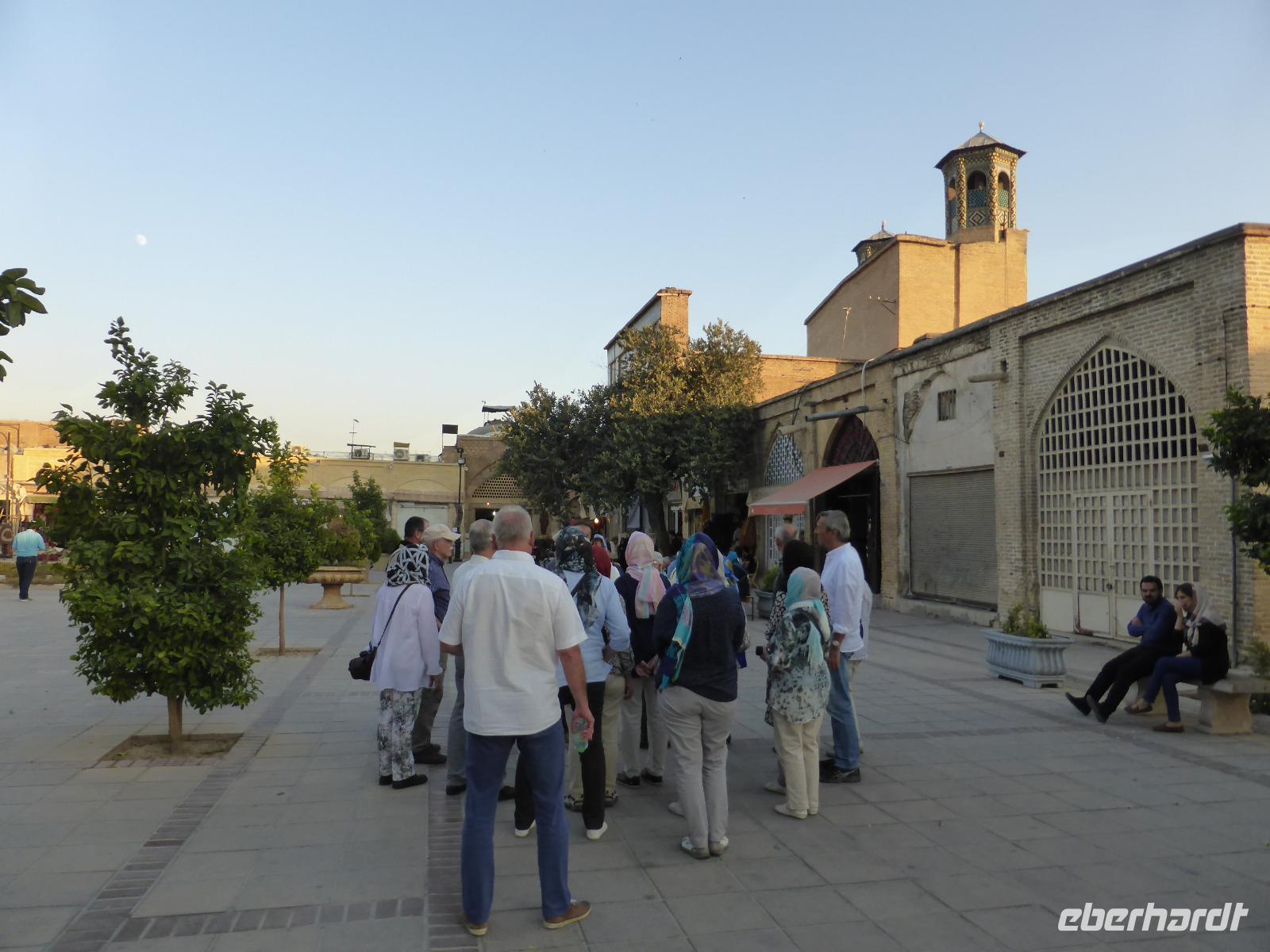 Shiraz ist zweifellos eine der schönsten Städte Persiens und wird aufgrund ihrer vielen Grünanlagen und Parks als die Stadt der Rosen und Nachtigallen bezeichnet. Wir besuchten zuerst die theologische Koranschule und im Anschluss die Nasir-al Molk-Moschee, deren farbiges Fensterglas das Innere der Moschee in verschiedenfarbige warme Töne taucht. In Shiraz liegen die Sehenswürdigkeiten dicht beieinander. Nach der Moschee besuchten wir den Najarestan-Garten, einen Verwaltungssitz vom Ende des 19.Jh., bestehend aus einer Palastanlage mit einem paradiesischen Garten. Anschließend fuhren wir zum Mausoleum des Dichters Saadi. Sein moderner Grabbau liegt am Ende einer schönen Gartenanlage. Saadi starb im Jahre 1292 in Shiraz. Sein bekanntestes Werk heißt „Golestan" (Rosengarten). Zum Abschluss der Besichtigungen hielten wir am Koran-Tor und fuhren von dort zur Pause zum Hotel zurück. Mit neuer Kraft ging es anschließend zum Mausoleum von Ali ebn-e Hamzeh (9.Jh.), dem Sohn des 7.Imams und Neffe Shah Cheraghs. Sein Schrein steht unter einer gewaltigen, mit Spiegelmosaiken verzierten Kuppel. Die Anlage zählt zu den schönsten ihrer Art. Der zweite Dichter aus Shiraz ist Hafiz. Zu seinem Grab fuhren wir im Anschluss. Unter einer auf acht Säulen ruhenden Kuppel liegt der Alabastergrabstein des 1389 verstorbenen Dichters. Hafiz besang die Liebe und den Wein, seit der Gründung der Islamischen Republik Iran im Jahre 1979 ist aber jeglicher Alkoholgenuss im Land verboten. Heute ist das Grabmal von Hafiz auch ein Ort für Verliebte, denn viele Iraner besuchen während ihrer Hochzeitsreise das Grab von Hafis und lesen Gedichte von ihm vor. Vom Mausoleum des Dichters fuhren wir zur Zitadelle ins Stadtzentrum. Dort stiegen wir aus und gingen durch den Vakil-Basar zum Shah Cheragh-Mausoleum. Hazrat-e Mir Seyyed Ahmad (Shah Cheragh) war ein Bruder des 8. Imams Reza und die Anlage ist das drittwichtigste Heiligtum der Schiiten im Iran. Obwohl die Anlage für Nicht-Muslime lange Zeit nicht zugänglich war, durften wir den Innenhof betreten. Unser Reiseleiter David hatte genau den richtigen Moment der Dämmerung abgepasst, welcher die Silhouette des Mausoleums in ein orangefarbenes Abendrot tauchte. Je dunkler es wurde, desto fulminanter war die Beleuchtung des Heiligtums. Es war unglaublich eindrucksvoll! Vom Heiligtum ging es dann zu Fuss zurück zum Vakil-Basar, wo wir Zeit zur freien Verfügung hatten, und anschließend zurück zum Hotel.