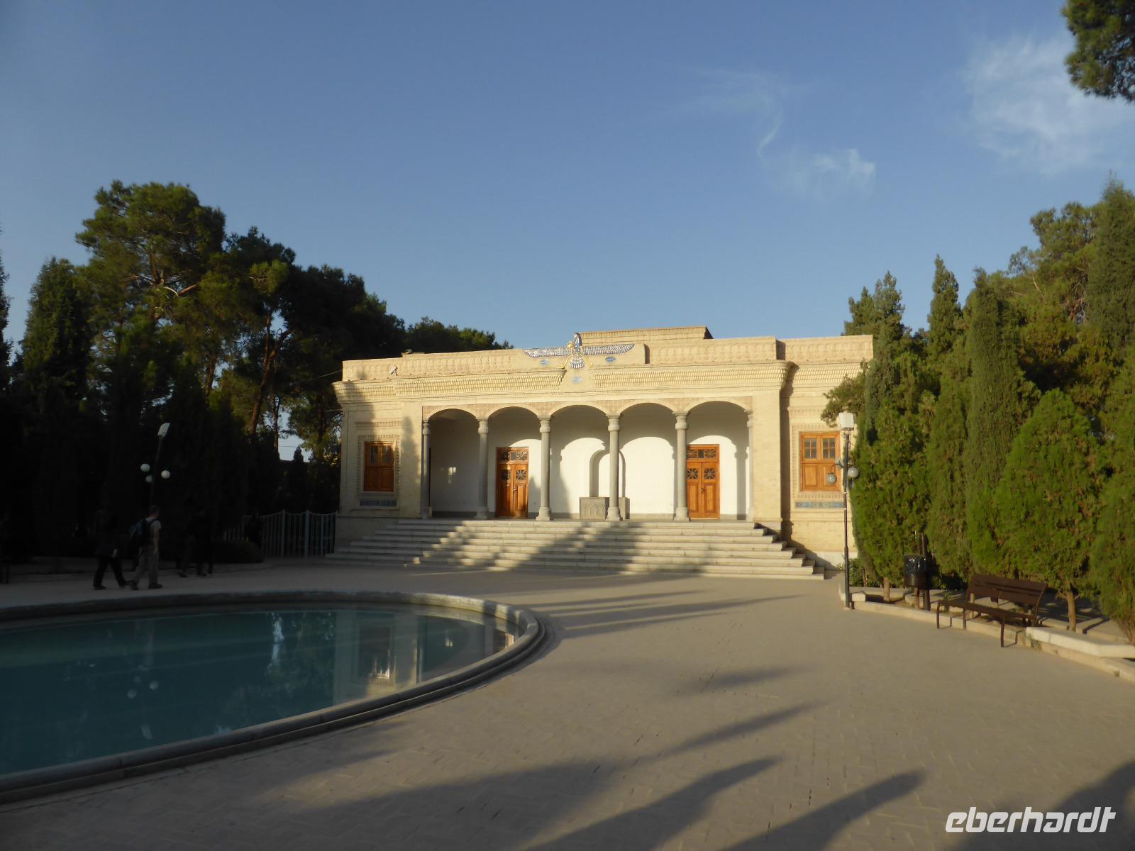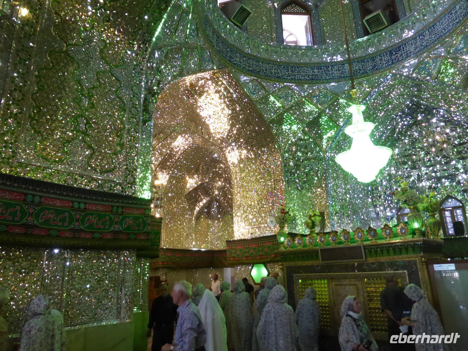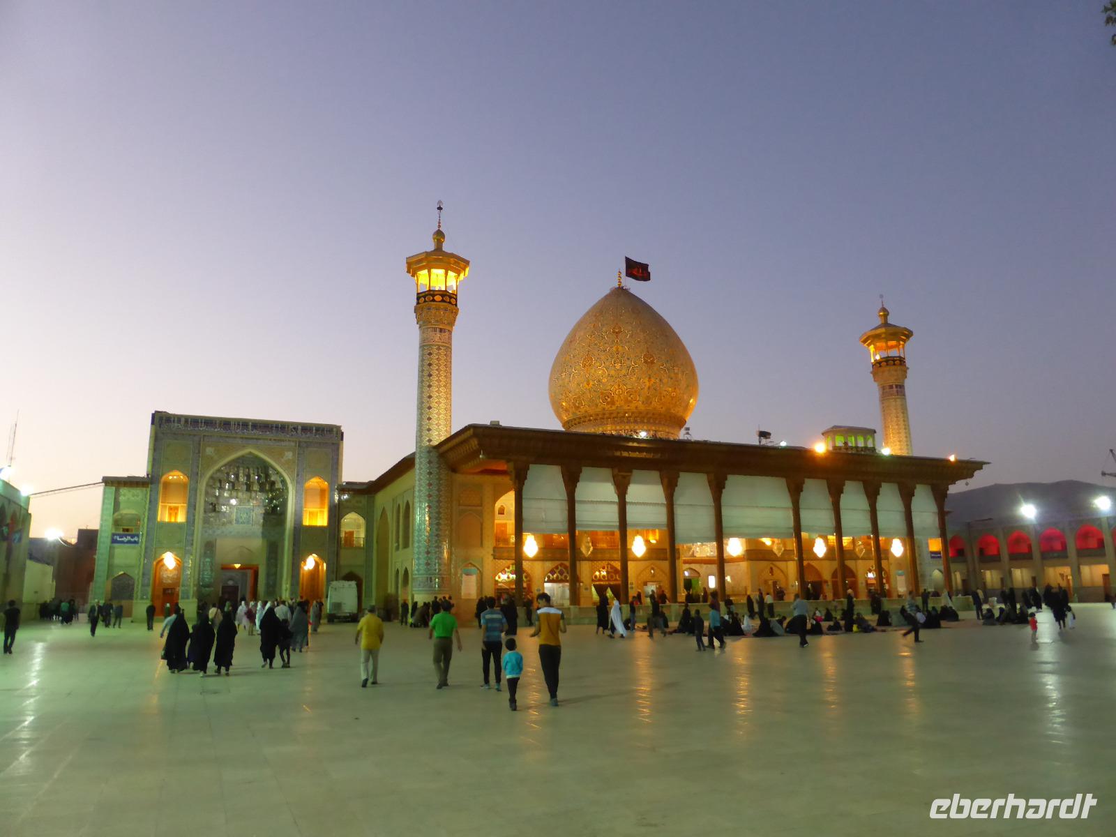 Shiraz ist zweifellos eine der schönsten Städte Persiens und wird aufgrund ihrer vielen Grünanlagen und Parks als die Stadt der Rosen und Nachtigallen bezeichnet. Wir besuchten zuerst die theologische Koranschule und im Anschluss die Nasir-al Molk-Moschee, deren farbiges Fensterglas das Innere der Moschee in verschiedenfarbige warme Töne taucht. In Shiraz liegen die Sehenswürdigkeiten dicht beieinander. Nach der Moschee besuchten wir den Najarestan-Garten, einen Verwaltungssitz vom Ende des 19.Jh., bestehend aus einer Palastanlage mit einem paradiesischen Garten. Anschließend fuhren wir zum Mausoleum des Dichters Saadi. Sein moderner Grabbau liegt am Ende einer schönen Gartenanlage. Saadi starb im Jahre 1292 in Shiraz. Sein bekanntestes Werk heißt „Golestan" (Rosengarten). Zum Abschluss der Besichtigungen hielten wir am Koran-Tor und fuhren von dort zur Pause zum Hotel zurück. Mit neuer Kraft ging es anschließend zum Mausoleum von Ali ebn-e Hamzeh (9.Jh.), dem Sohn des 7.Imams und Neffe Shah Cheraghs. Sein Schrein steht unter einer gewaltigen, mit Spiegelmosaiken verzierten Kuppel. Die Anlage zählt zu den schönsten ihrer Art. Der zweite Dichter aus Shiraz ist Hafiz. Zu seinem Grab fuhren wir im Anschluss. Unter einer auf acht Säulen ruhenden Kuppel liegt der Alabastergrabstein des 1389 verstorbenen Dichters. Hafiz besang die Liebe und den Wein, seit der Gründung der Islamischen Republik Iran im Jahre 1979 ist aber jeglicher Alkoholgenuss im Land verboten. Heute ist das Grabmal von Hafiz auch ein Ort für Verliebte, denn viele Iraner besuchen während ihrer Hochzeitsreise das Grab von Hafis und lesen Gedichte von ihm vor. Vom Mausoleum des Dichters fuhren wir zur Zitadelle ins Stadtzentrum. Dort stiegen wir aus und gingen durch den Vakil-Basar zum Shah Cheragh-Mausoleum. Hazrat-e Mir Seyyed Ahmad (Shah Cheragh) war ein Bruder des 8. Imams Reza und die Anlage ist das drittwichtigste Heiligtum der Schiiten im Iran. Obwohl die Anlage für Nicht-Muslime lange Zeit nicht zugänglich war, durften wir den Innenhof betreten. Unser Reiseleiter David hatte genau den richtigen Moment der Dämmerung abgepasst, welcher die Silhouette des Mausoleums in ein orangefarbenes Abendrot tauchte. Je dunkler es wurde, desto fulminanter war die Beleuchtung des Heiligtums. Es war unglaublich eindrucksvoll! Vom Heiligtum ging es dann zu Fuss zurück zum Vakil-Basar, wo wir Zeit zur freien Verfügung hatten, und anschließend zurück zum Hotel.