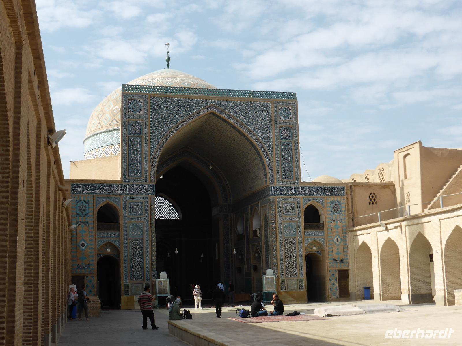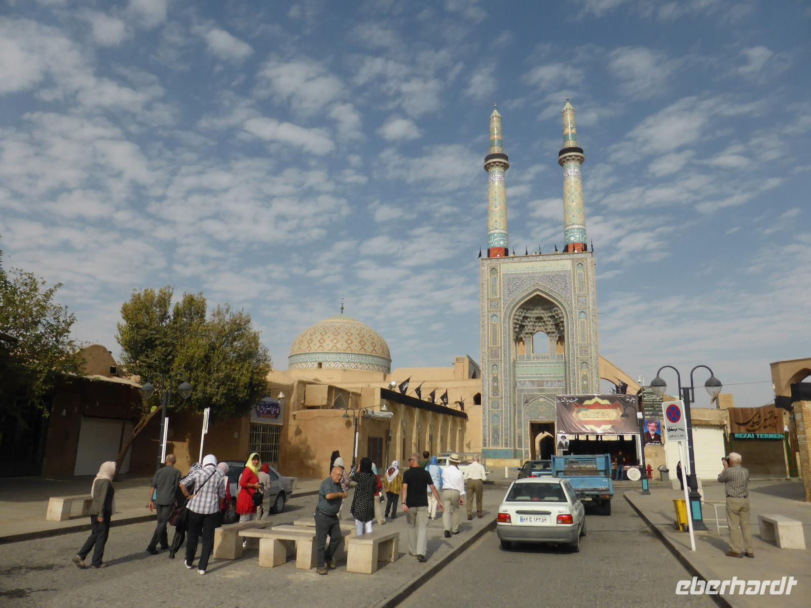 Der Morgen begann mit einem Spaziergang durch die Altstadt von Yazd zur Jame-Moschee, ein architektonisches Meisterwerk aus dem 14.Jh.. Besonders eindrucksvoll ist der Eingangs- Iwan, ein Portalbau mit Tonnengewölbe und einer offenen Seite, geschmückt mit einem blau-türkisen Fliesendekor. Gekrönt wird er von zwei ebenso dekorierten Minaretten. Nach diesem Besuch gingen wir durch die schmalen Gassen der Altstadt und sahen überall die Vorbereitungen für die abendlichen Ashura-Veranstaltungen. Die Innenhöfe waren mit Planen überspannt und alles war geschmückt mit schwarzen Tüchern und Fahnen. Gelbe und grüne Schriftzüge erinnerten an das Martyrium Husseins.
