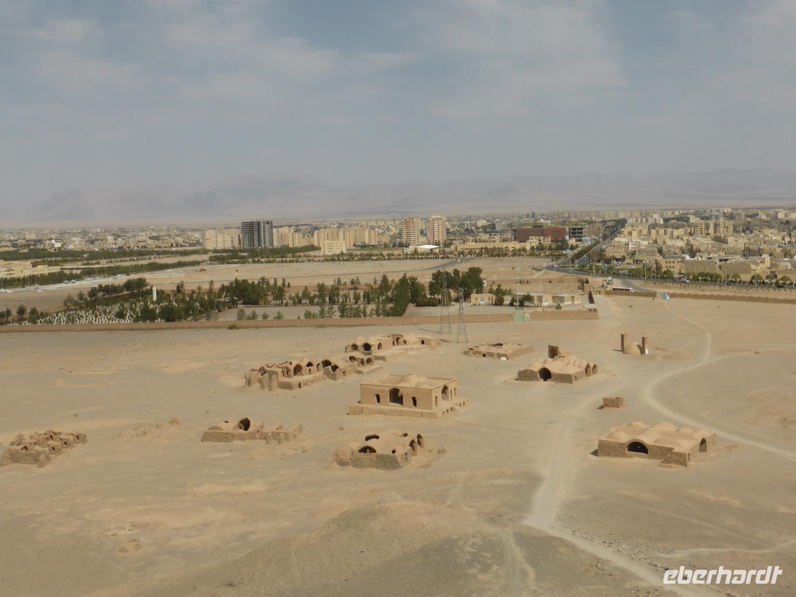 Vom Dach des Hotels „Kohan" bot sich uns ein fantastischer Blick über die Wüstenstadt mit ihren unzähligen Windtürmen und Kuppelbauten. Von der Altstadt fuhren wir anschließend zum Dolat-Abad-Garten, einem Pavillon mit dem höchsten Windturm des Iran und von dort zu den „Türmen des Schweigens". Gemeint sind damit zwei auf Bergkuppen errichtete, ummauerte Heiligtümer am Stadtrand von Yazd. Da die Erde, das Feuer und das Wasser den Anhängern Zarathustras heilig sind, dürfen auch ihre Verstorbenen damit nicht in Berührung kommen. Man brachte sie nach der rituellen Waschung auf die Plattformen der Türme und überließ sie dort den Geiern. Nach vierzig Tagen wurden die Knochen eingesammelt, gereinigt und in Öl gesalbten Krügen aufbewahrt. Von den Türmen ging es anschließend weiter in Richtung Kerman. Unterwegs sahen wir wie Maulwurfhügel aussehende Qanate, die seit Jahrhunderten die Wasserversorgung der Wüstenstädte über hunderte Kilometer sicherstellen. Viele dieser Anlagen werden auch heute noch genutzt, obwohl Wasserpumpen und moderne Wasserleitungen die historischen Anlagen immer mehr ersetzen. Am frühen Abend kamen wir in Kerman an und besuchten dort den Basar. Aufgrund der Moharram-Feierlichkeiten war ein Besuch nur an diesem Tag möglich. Danach ging es direkt zum