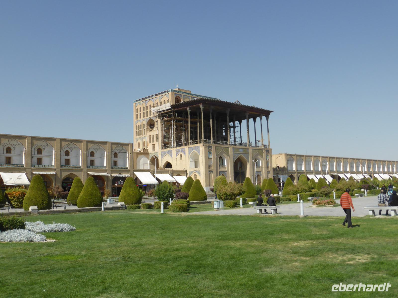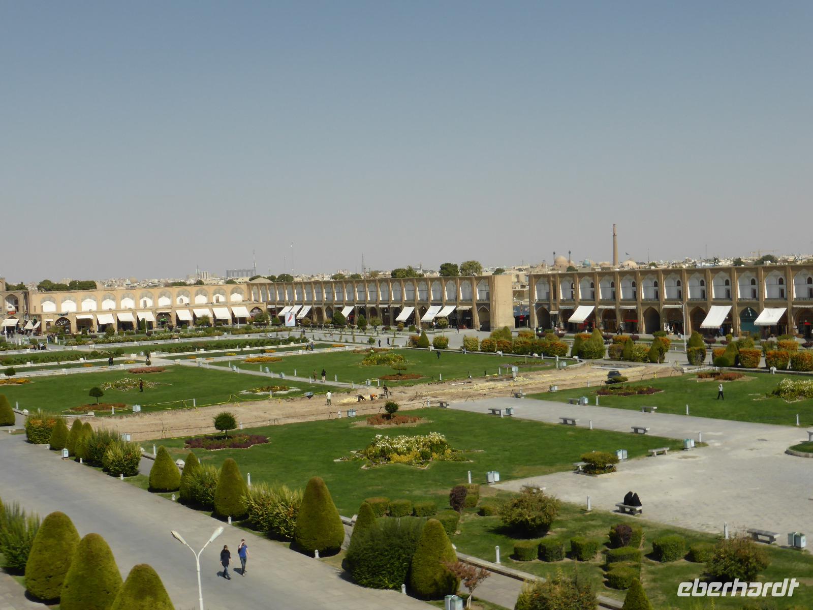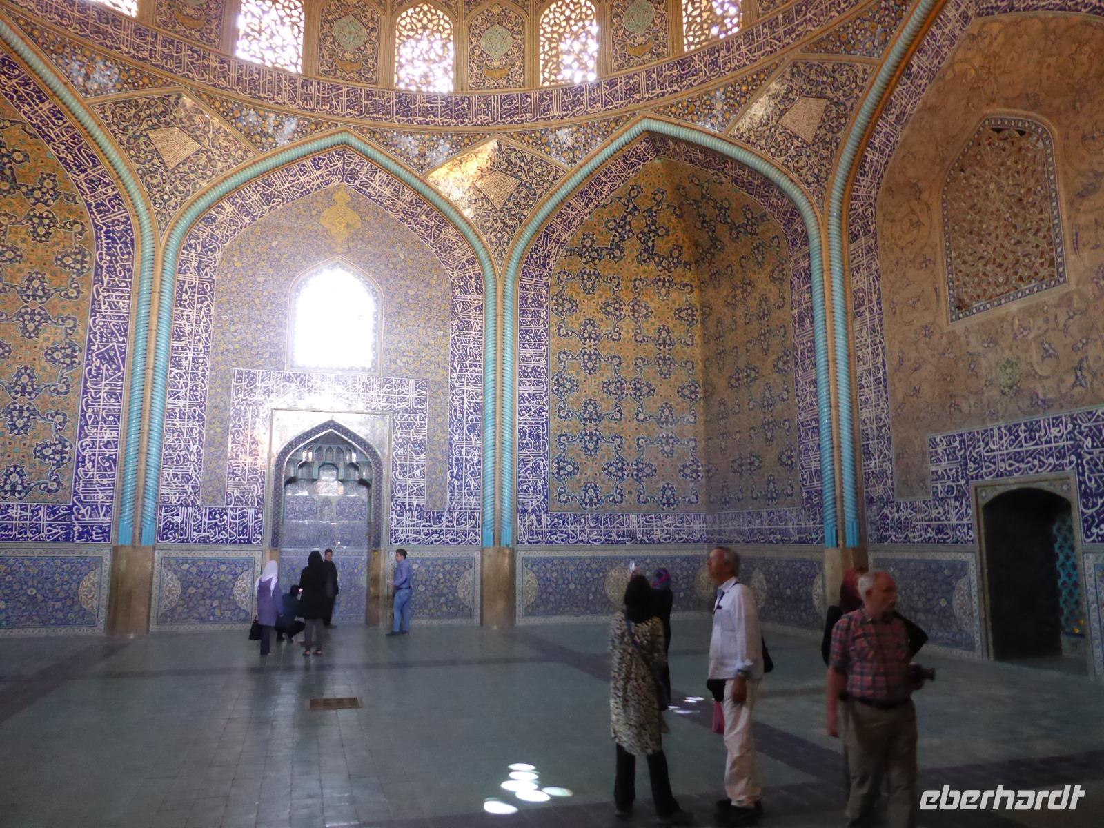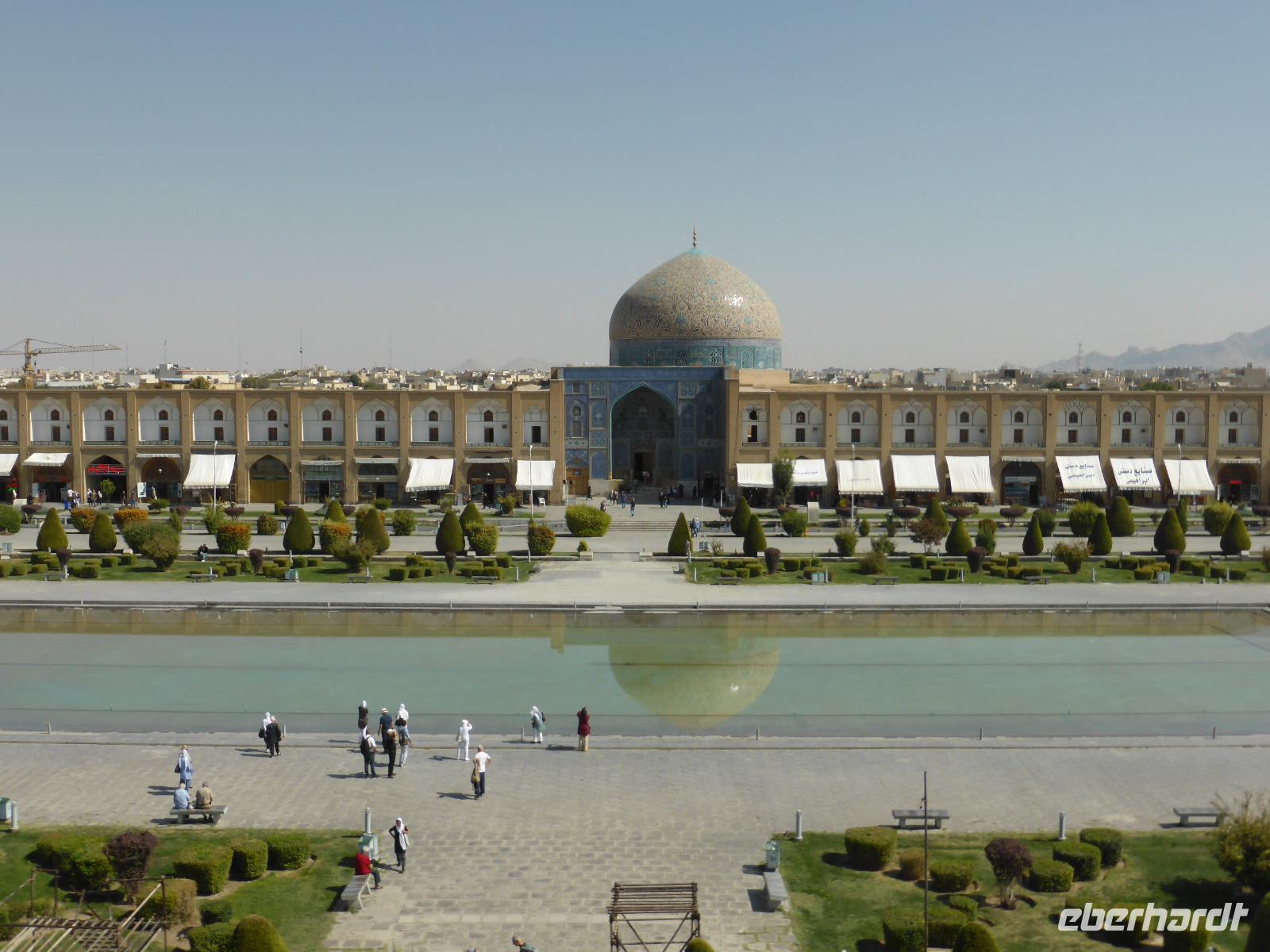 Nach dem Frühstück fuhren wir zum Imam-Platz, dem Abbild der Welt. Er zählt sicherlich zu den schönsten der Welt. An den Platz schließt sich die Imam- Moschee an, welche wir als nächstes besichtigten. Leider war im Innenhof ein riesiges Zelt aufgebaut, in dem anlässlich der Feiertage täglich Veranstaltungen stattfanden. Trotz der eingeschränkten Blickwinkel waren wir von der Architektur und Akustik, die mitten unter der großen Kuppel der Moschee in Kopfhöhe am besten ist, beeindruckt. Unser Reiseleiter David bat einen Gläubigen, ein Gebet auf arabisch vorzutragen. Wir waren vom seinem Gesang und der einmaligen Akustik fasziniert! Anschließend hatten wir noch etwas Zeit uns umzusehen. Ein Mullah reichte zur Begrüßung Bonbons und unterhielt sich mit uns über unsere Reiseerlebnisse und Eindrücke. Danach besuchten wir die Lotfullah-Moschee, die ehemalige Privatmoschee der safawidischen Königsfamilien. Sie wird auch Frauenmoschee genannt und ist in ihrer kunstfertigen Ausgestaltung kaum zu übertreffen. Gegenüber der Lotfullah-Moschee besuchten wir den Ali Qapu Palast. Von einer gewaltigen Veranda im 3. Stock kann man den gesamten Imam-Platz fantastisch überschauen. Leider stand uns aufgrund von Bauarbeiten nicht die gesamte Fläche zur Verfügung, aber selbst vom zugänglichen Teil gelangen uns einmalige Fotoaufnahmen. Wir konnten uns leicht in die Lage versetzen, wie das Königshaus von hier oben aus die Polo-Spiele unten auf dem großen Platz verfolgen konnte.