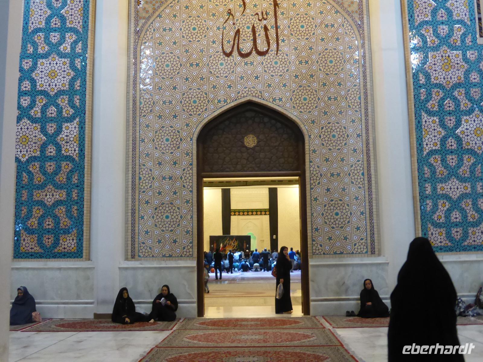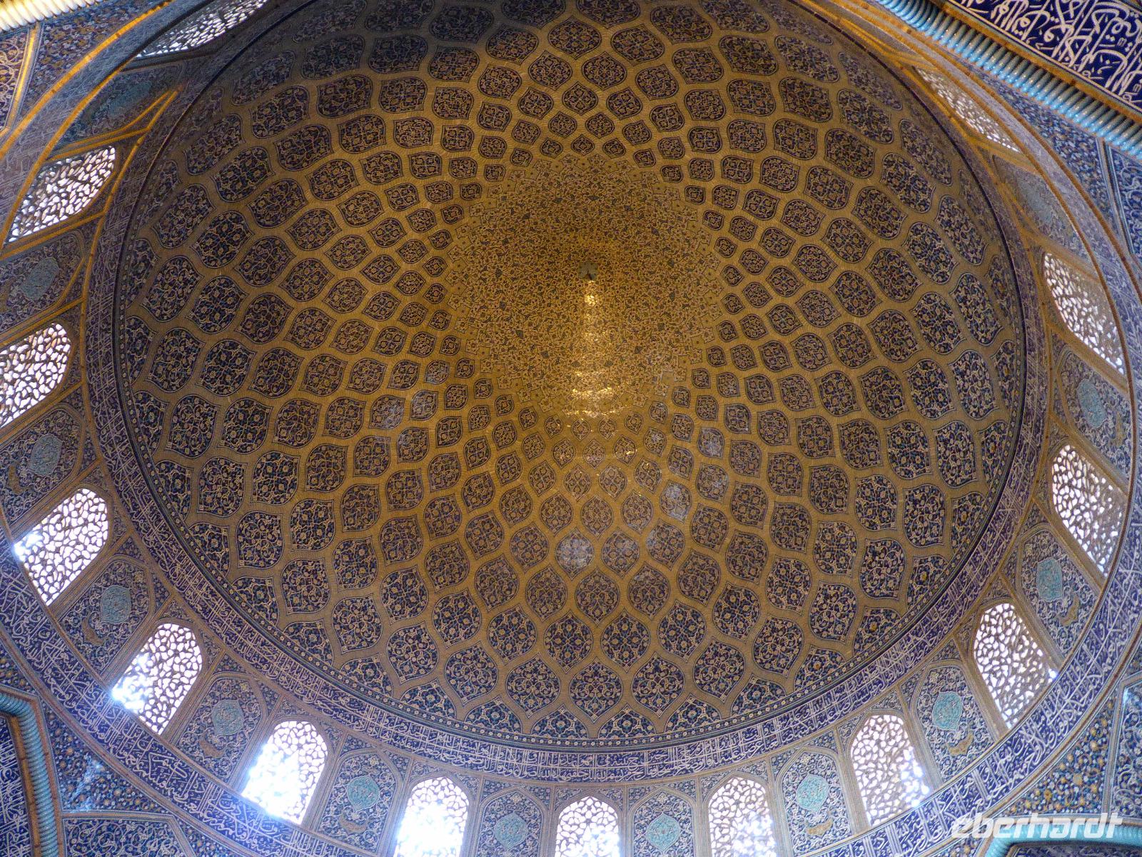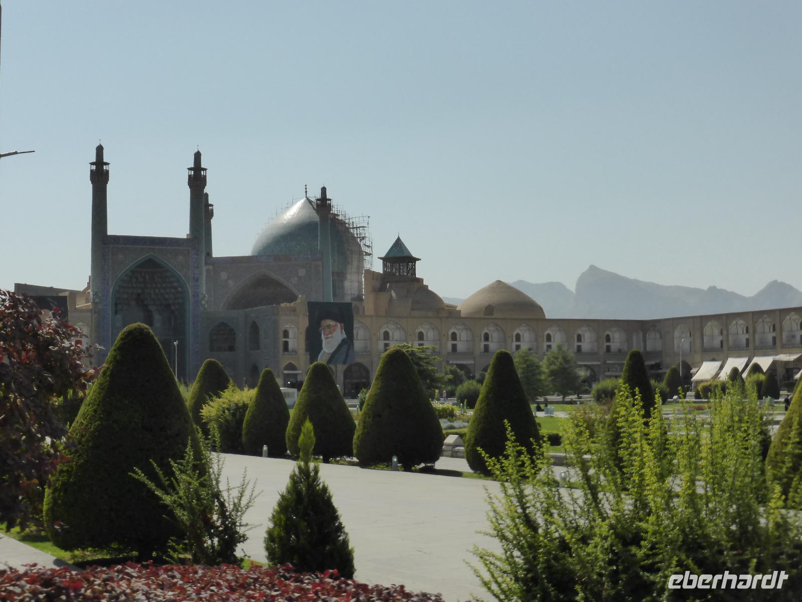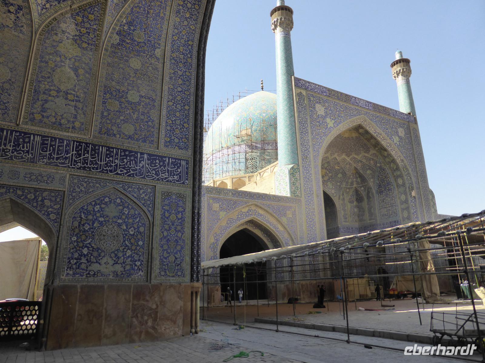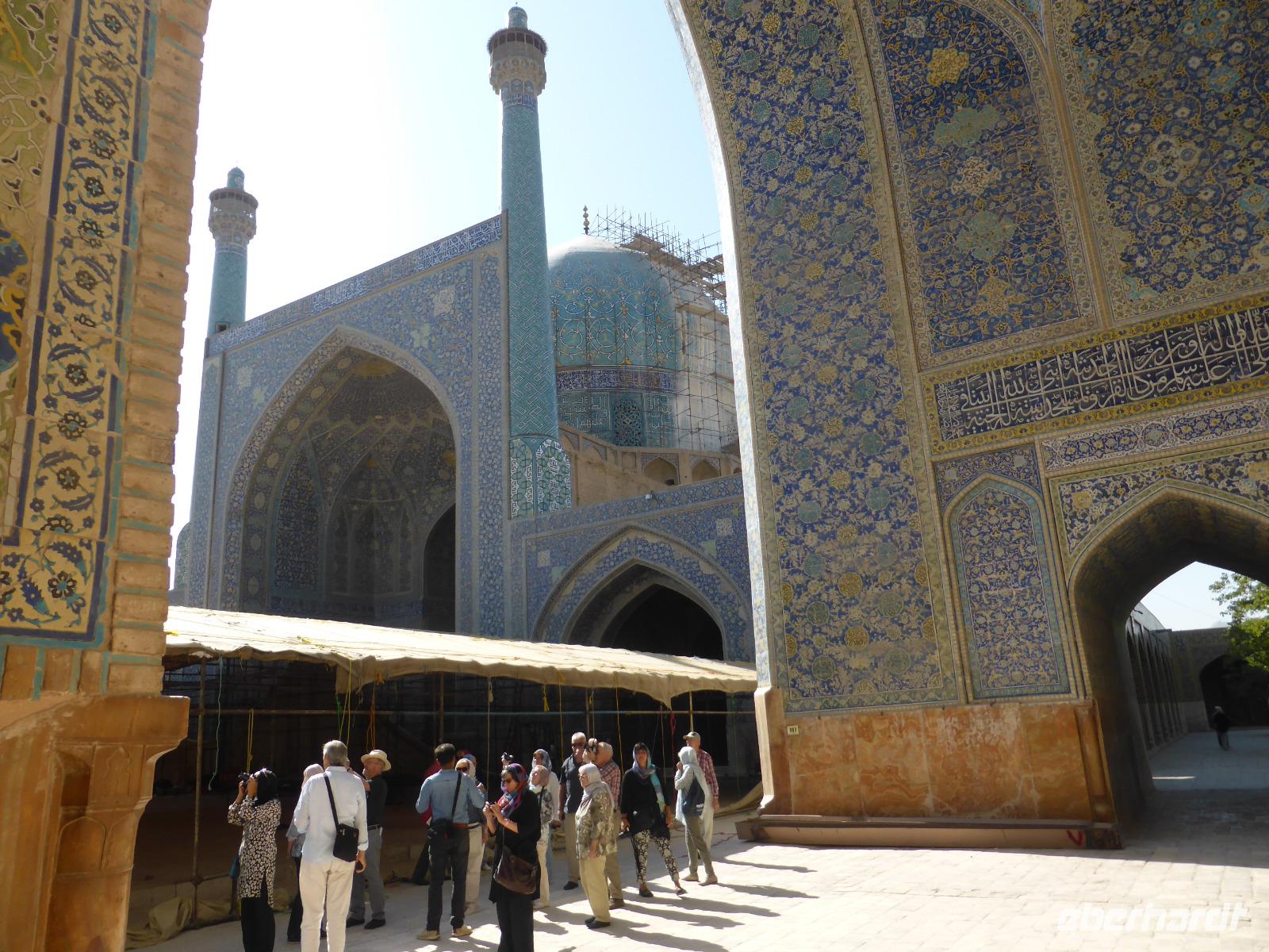 Nach dem Frühstück fuhren wir zum Imam-Platz, dem Abbild der Welt. Er zählt sicherlich zu den schönsten der Welt. An den Platz schließt sich die Imam- Moschee an, welche wir als nächstes besichtigten. Leider war im Innenhof ein riesiges Zelt aufgebaut, in dem anlässlich der Feiertage täglich Veranstaltungen stattfanden. Trotz der eingeschränkten Blickwinkel waren wir von der Architektur und Akustik, die mitten unter der großen Kuppel der Moschee in Kopfhöhe am besten ist, beeindruckt. Unser Reiseleiter David bat einen Gläubigen, ein Gebet auf arabisch vorzutragen. Wir waren vom seinem Gesang und der einmaligen Akustik fasziniert! Anschließend hatten wir noch etwas Zeit uns umzusehen. Ein Mullah reichte zur Begrüßung Bonbons und unterhielt sich mit uns über unsere Reiseerlebnisse und Eindrücke. Danach besuchten wir die Lotfullah-Moschee, die ehemalige Privatmoschee der safawidischen Königsfamilien. Sie wird auch Frauenmoschee genannt und ist in ihrer kunstfertigen Ausgestaltung kaum zu übertreffen. Gegenüber der Lotfullah-Moschee besuchten wir den Ali Qapu Palast. Von einer gewaltigen Veranda im 3. Stock kann man den gesamten Imam-Platz fantastisch überschauen. Leider stand uns aufgrund von Bauarbeiten nicht die gesamte Fläche zur Verfügung, aber selbst vom zugänglichen Teil gelangen uns einmalige Fotoaufnahmen. Wir konnten uns leicht in die Lage versetzen, wie das Königshaus von hier oben aus die Polo-Spiele unten auf dem großen Platz verfolgen konnte.
