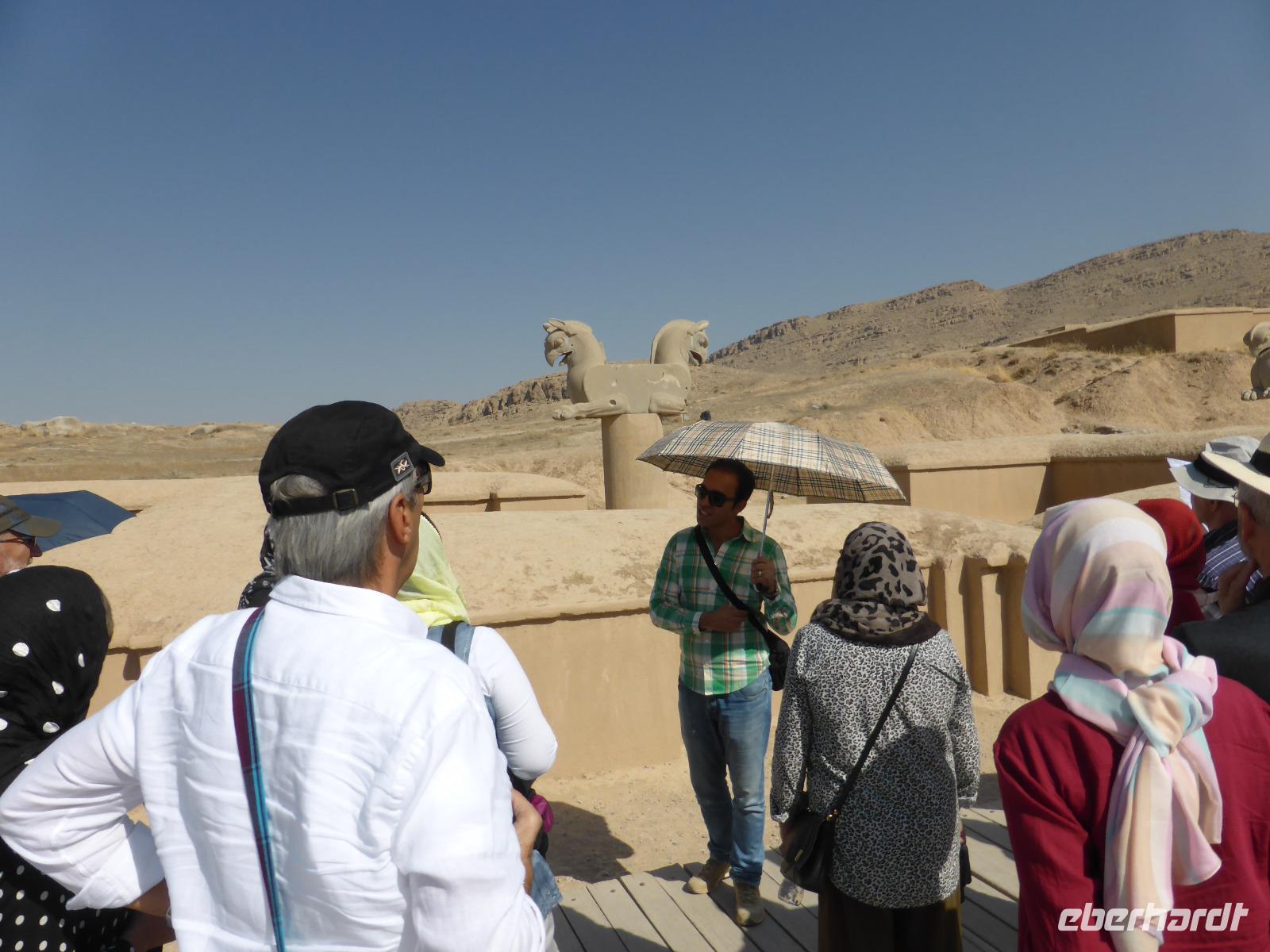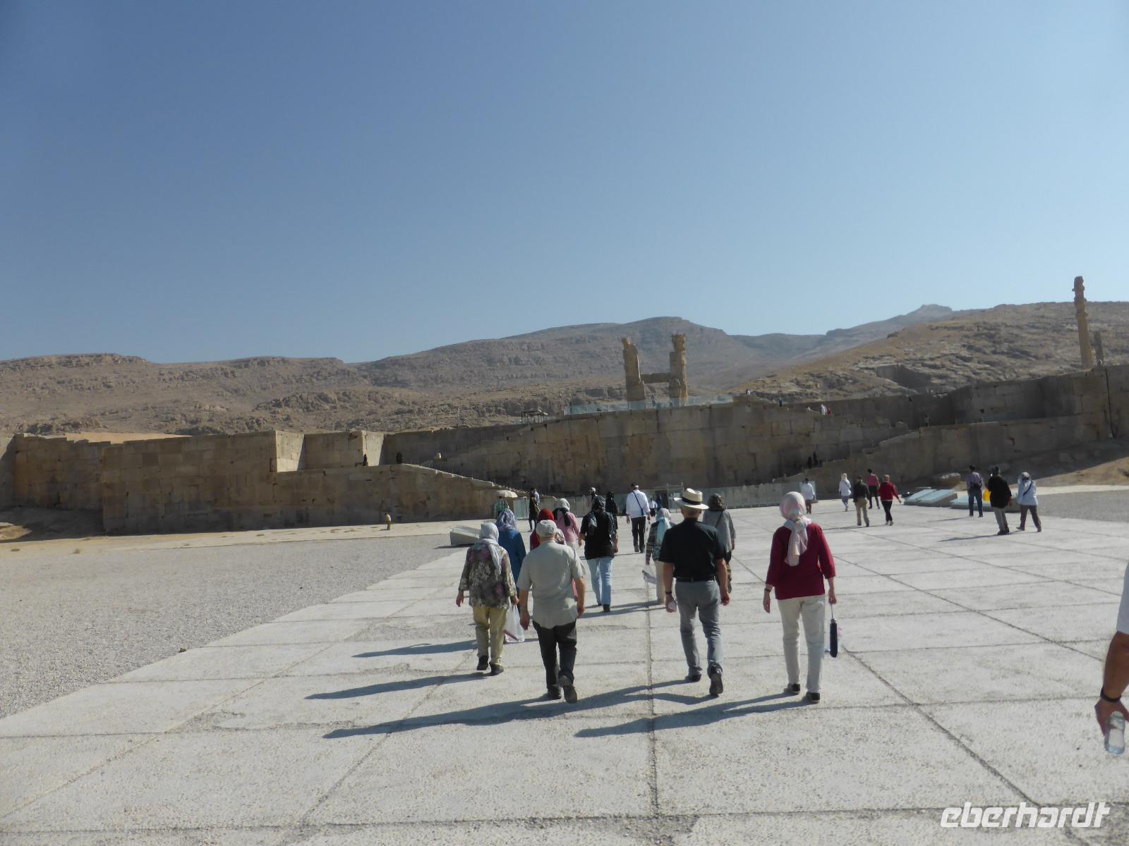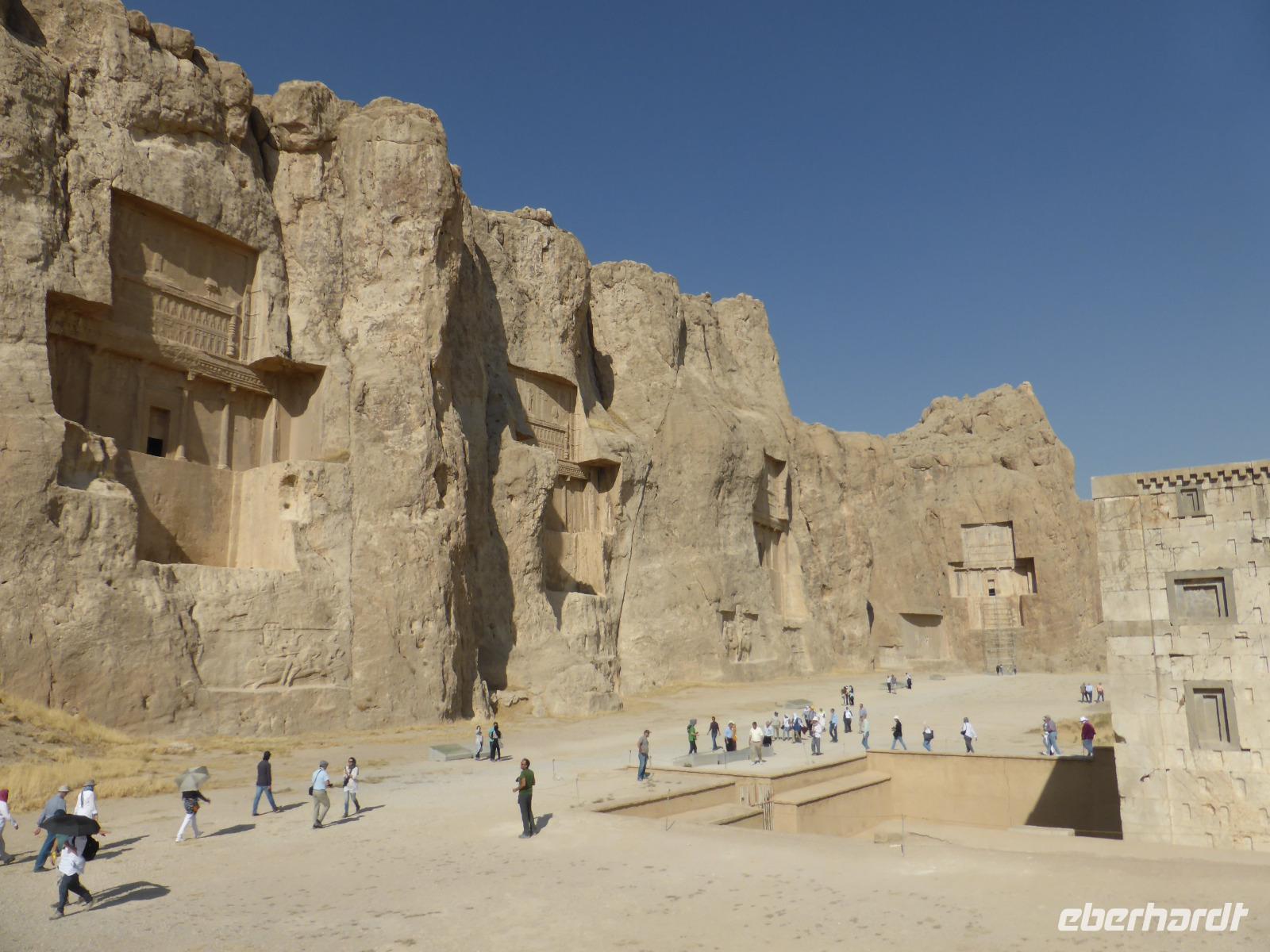 An diesem Tag erwartete uns der Höhepunkt der Reise, die Besichtigung von Persepolis. Die Repräsentationshauptstadt des achämenidisch- persischen Weltreichs, wurde von Darius I. um 518 v.Chr. gegründet und existierte bis zu ihrer Zerstörung durch das griechische Heer Alexanders des Großen im Jahre 331 v.Chr.. Sie diente vor allem auch der Ausrichtung der Neujahrsfeierlichkeiten, zu denen jedes Jahr Ende März, dem Jahresbeginn im persischen Sonnenkalender, Gesandtschaften aus allen Völkern des Reiches eintrafen und ihre Geschenke überreichten. Im Gelände befinden sich der Apadana-Audienzpalast, das Schatzhaus sowie die Paläste von Darius und Xerxes. Ein Blick vom Felsengrab Artaxerxes II. verdeutlichte uns die riesigen Ausmaße der Terrassenanlage. Nach der Besichtigung von Persepolis und einer notwendigen Mittagspause, fuhren wir in die nahe gelegene Nekropole Naqsh-e-Rostam. Die Felsgräber sind kreuzförmig aus dem Fels herausgearbeitet worden und in der Mitte mit einem Eingang zur Grabkammer versehen. Das einzige bisher eindeutig identifizierte Grab ist das Grab von Darius I., was eine Inschrift belegt.