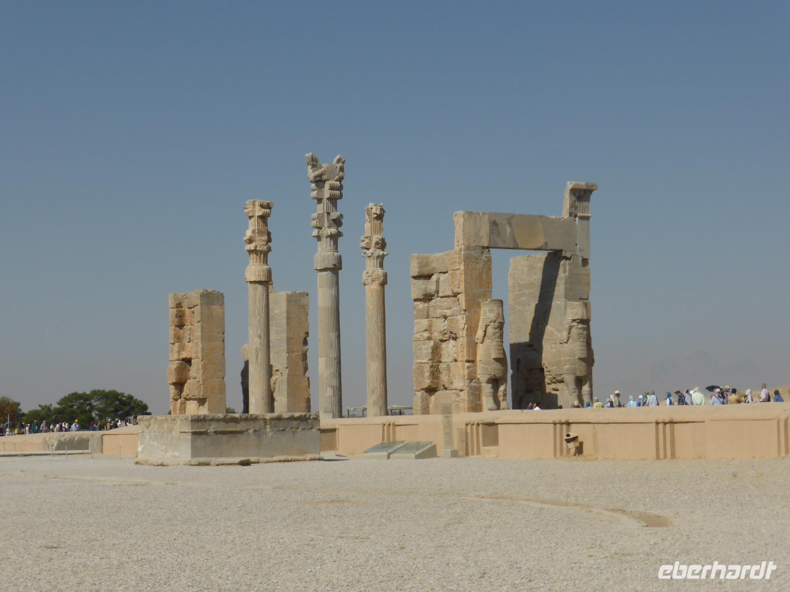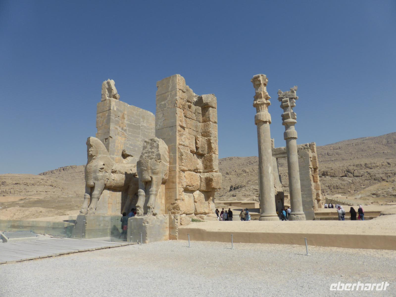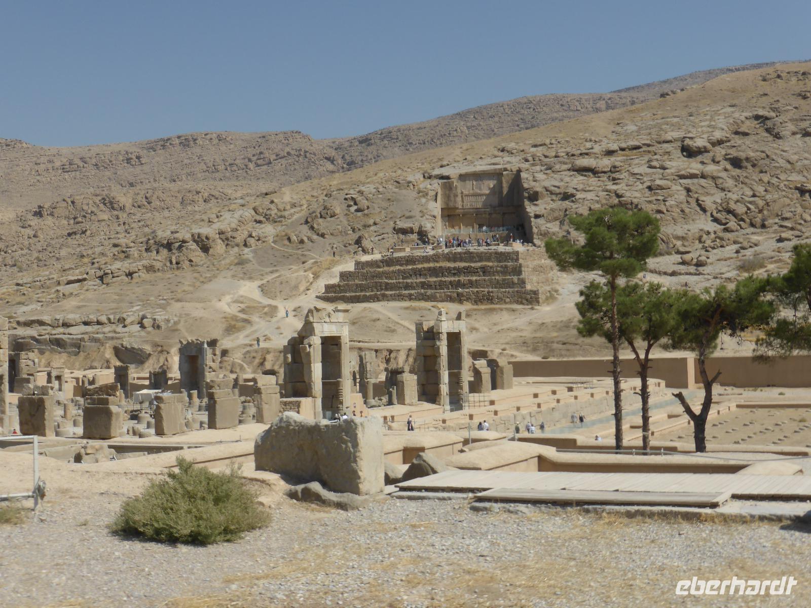 An diesem Tag erwartete uns der Höhepunkt der Reise, die Besichtigung von Persepolis. Die Repräsentationshauptstadt des achämenidisch- persischen Weltreichs, wurde von Darius I. um 518 v.Chr. gegründet und existierte bis zu ihrer Zerstörung durch das griechische Heer Alexanders des Großen im Jahre 331 v.Chr.. Sie diente vor allem auch der Ausrichtung der Neujahrsfeierlichkeiten, zu denen jedes Jahr Ende März, dem Jahresbeginn im persischen Sonnenkalender, Gesandtschaften aus allen Völkern des Reiches eintrafen und ihre Geschenke überreichten. Im Gelände befinden sich der Apadana-Audienzpalast, das Schatzhaus sowie die Paläste von Darius und Xerxes. Ein Blick vom Felsengrab Artaxerxes II. verdeutlichte uns die riesigen Ausmaße der Terrassenanlage. Nach der Besichtigung von Persepolis und einer notwendigen Mittagspause, fuhren wir in die nahe gelegene Nekropole Naqsh-e-Rostam. Die Felsgräber sind kreuzförmig aus dem Fels herausgearbeitet worden und in der Mitte mit einem Eingang zur Grabkammer versehen. Das einzige bisher eindeutig identifizierte Grab ist das Grab von Darius I., was eine Inschrift belegt.