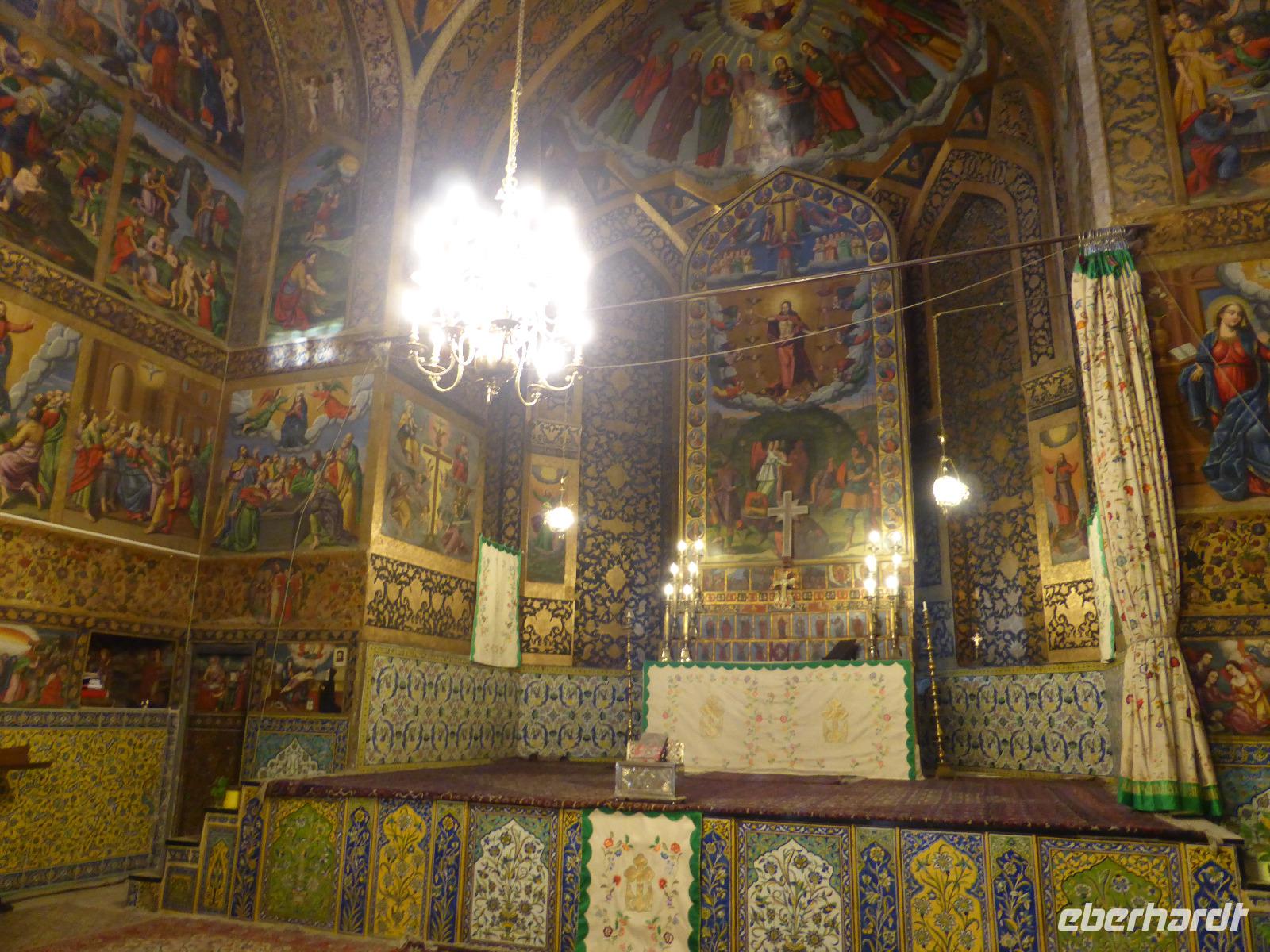 Nach der Freizeit fuhren wir zur Vank-Kathedrale ins Dscholfa-Viertel. Shah Abbas I. siedelte Anfang des 17. Jh. Armenier an, da er ihre Fertigkeiten als gute Handwerker und Künstler schätzte. Für die Ausübung ihres christlichen Glaubens räumte er ihnen weitgehende Privilegien ein. So war es den Armeniern möglich, im Jahre 1663 die Vank-Kathedrale fertig zu stellen. Sie ist bis heute die größte und bedeutendste Kirche in Djolfa, dem armenischen Viertel Isfahans. Im Inneren der Erlöser-Kirche, wie sie auch heißt, schockierten uns die Gemälde der Kreuzigung Christi, der Qualen der Hölle und des Jüngsten Gerichts aufgrund der dargestellten Gewalt und Grausamkeit. Von außen ist die Vank-Kathedrale nicht als solche zu erkennen, da sich ihr Kuppelbau mit persisch-byzantinischen Stilelementen weitgehend der Architektur der Moscheen angepasst hat. Interessant ist das dem Komplex angeschlossene Museum, welches die Geschichte der armenischen Christen bis hin zu ihrer Verfolgung im ersten Weltkrieg durch die Türken veranschaulicht.
