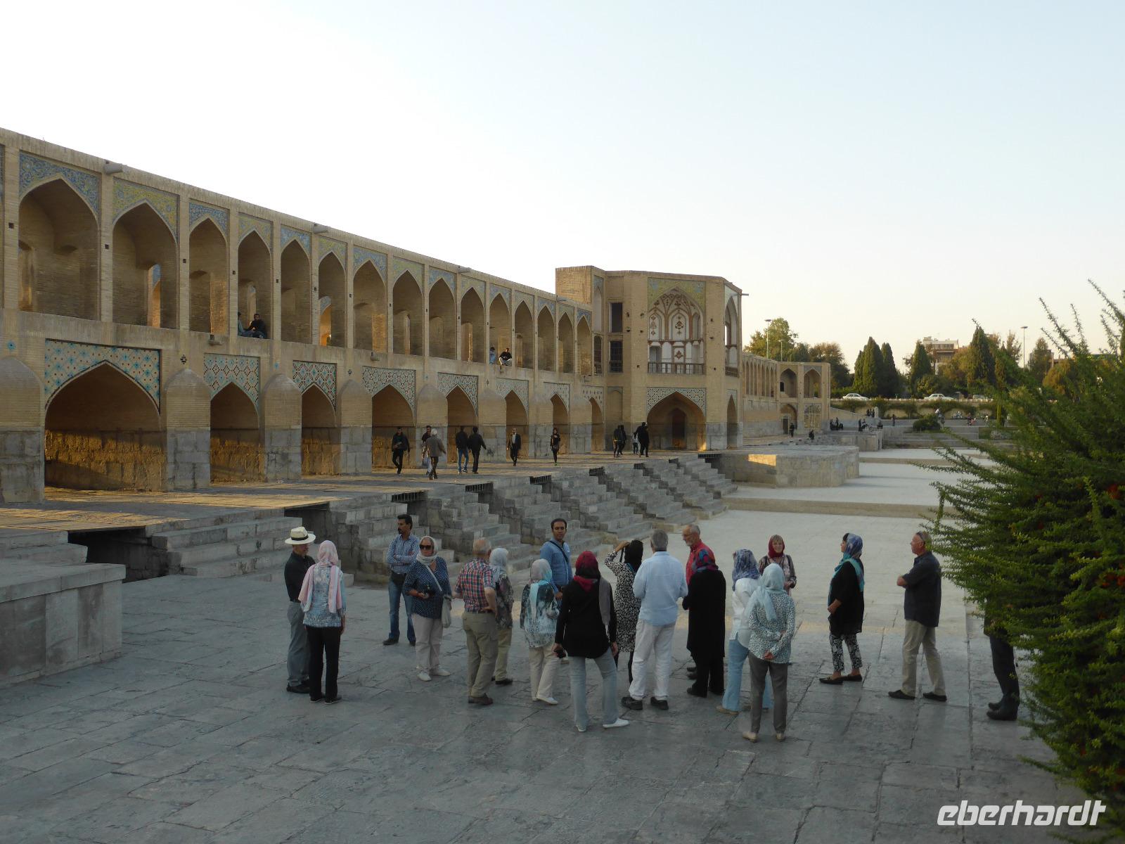 Den Abschluss unseres Besichtigungsprogramms an diesem Tag bildete die Fahrt zur Khaju-Brücke, einer der beliebtesten Treffpunkte in Isfahan. Leider steht die Brücke auf dem Trockenen, da das Wasser des Flusses in Wüstengebiete umgeleitet wird. David hatte wieder die perfekte Zeit für unseren Aufenthalt ausgesucht. Es dämmerte und langsam tauchte die Brücke in orangefarbenes Licht. Zum Abschluss gab es noch eine ziemlich lange Foto-Session mit unseren Fahrern, unserem Reiseleiter und Einheimischen Isfahanis. Von der Khaju-Brücke fuhren wir anschließend zum Hotel zurück. Unser Abschiedsessen nahmen wir im 11. Stock unseres Hotels im Drehrestaurant ein. Wir verabschiedeten unseren Reiseleiter David sowie unsere beiden Fahrer Moji und Gholam und bedankten uns für ihre tolle Arbeit und die vielen schönen Erlebnisse!